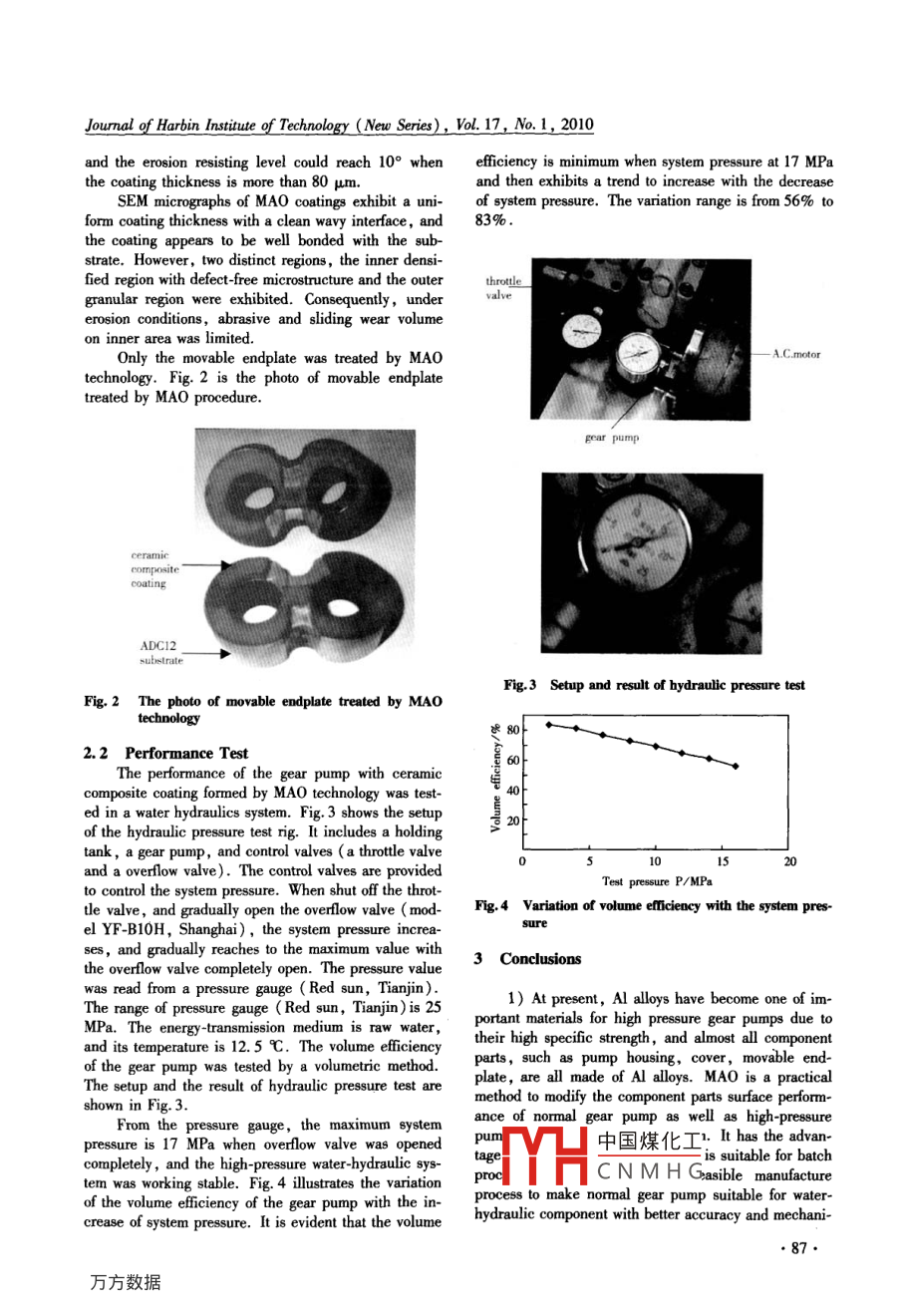 Joumnal of Harbin Institute of Technology (New Series), Vol 17, No.1, 2010Application of external gear pump in water-hydraulic systemBAI Hua白樺(School of Mechatronics Engineering, Harin Insitute of Technology . Habin 150001 ,China, baihua@ hit. edu. en)Abstract: The ceramic coating technology of microare oxidation ( MAO) was utilized to modify surface proper-ties of the movable endplate of a high pressure gear pump used in water-hydraulic system, which is made of alu-minium alloy. A coMPact ceramic layer of more than 130 μm was developed on the movable endplate with thehardness up to HV1000 by means of microare oxidation. A trial of tests conducted in a water power transmissionsystem show that the maximum outlet pressure of the gear pump with the movable endplate treated by microareoxidation, can reach 16 MPa. It is pointed out that the ceramic coating developed by microarc oxidation tech-nology on the surface of aluminium alay , is economical and feasible.Key words: microarc oxidation; ceramic coating; high-pressure gear pump; waler-hydraulic systemCLC number: TG174. 45Document code: AArticle ID: 1005-9113(2010)01 _0085-04With the increasing demand for an environmental-cal characteristics.ly-friendly fluid medium in the fluid power industries ,Since ceramics have good mechanical performancerecent advances in water hydraulics technology havewith high intensity and hardness,wear -resistance, cal-sparked renewed interest in the application of water,orific performance of anti-thermal shock and dynamicinstead of oil, as the energy -transmission medium. Wa- creep, and chemical performance of corrosion-resist-ter hydraulics technology, after being tucked away forance, anti-oxidation, they are becoming more and morealmost half a century, has been taken seriously". Wa-attractive and have been increasingly finding numerouster hydraulics is a technology which uses the tap-water applications in today ' s industry. The major advantagesas working pressure medium in hydraulic systems in-of using ceramics as friction pairs of water hydraulicsstead of mineral oil with the advantage of no pollution,components are among: (1 ) good performance of hard-hygienic,nonflammable, nontoxic, readily available ,ness , intensity and wear-resistance; (2) good tribolog-and cost-effective. At present, more and more reical performance of anti-adhesion, i. e. tribologicalsearchers are interested in modem water-hydraulics.pairs made of either ceramics/ ceramics, or ceramics/However, since the basic physicochemical charac-polymers, or ceramics/ metal,they exhibit excellentteristics of pure waler is quite different from the mineralperformance under abrasion and sliding wear modes;oil, water hydraulics system has the disadvantage ol(3) good performance of anti-cavitation, the ceramicssever errosion, high leakage, high friction and wealwith high hardness can resist cavitation formed by waterrate, cavitation, water hammer and heavy contamina-vapour and dissolved gases such as oxygen, chlorinetion on the water hydraulic components and system,and the others, and erosion formed by acoustic stream-etc, it is very difficult to develop the water hydraulicsing; (4) good performance of stability. Ceramic is ofcomponentsIn recent years, with the developmentssteady-state, it hardly has any measure transmutationof materials and machining technology, it is possible tounder the condition of high temperature. High assemblyproduce water hydraulics components which are madeprecision, closer tolerance on fit, and better surfaceof lubrication-free , anticorrosive materials to reduce in-performance of ceramic component can effectively re-temal leakage due to the low viscosity of water. To aduce leakage,improve the eficiency and prolong serv-void the pure water' s features of low viscousity, highice life.leakage, poor lubrication and erosion, components inHowever, the application of ceramic to water hy-water hydraulics should be made of corrosion-resistantdraulic components was limited by the ceramic manu-materials such as stainless steel, special bronze, sur- facturing process. The main influencing factor is thatface treated aluminum, polymers, and ceramics. Athe ceramic' s shaping and machining quality are poor.present, the typical approach is to select the new mate-中國煤化工luced by makingrials for water bydraulic components with good tribologi- mould_high temperature,YHCNMHGReceived 2008 -05 - 23.Sponsored by the National Natural Science Foundation of China( Grant No. 60772077).●85●Journal of Harbin Institute of Technology (New Series), Vol. 17, No. 1, 2010and then followed by mechanical machinings, so it isFig.1. The basic parameters of the pump include:hard to produce components with complex shape. Duemodule of gear (m) is 3; tooth number (Z) is 11;to ceramic' s hard and brittle feature, it is hard tonormal rated pressure is 16 MPa; pump output floe ratemanufacture such components by the usual mechanicalis 16 mL/r. Toothed gear and shaft are made ofprocessing equipment, and thus increases the manufac-20CrMnTi,clearance fit of H7/g6 betweenshaftture cost, its application is limited 21 .and bearing is chosen. Central distance of two toothedOn the basis of analyzing the tribological charac-gearisL = 33 +0.015 mm.teristics of ceramics in water surroundings, and sum-ming叩the special requirements for water hydraulicshousincomponents,a new ceramic coating technologyMAO ( Microarc oxidation) was chosen to modify thetoothedsurface properties of the movable endplate of high pres-gear. pumpsure gear pump which is made of aluminium( AI) al-casingloy. And the performance of the treated gear pump hasbeen tested.Movableendplate1 Experimental Details1.1 MAO TechnologyFig. 1 Configuration of the tested high-pressure gear pumpMicroare oxidation commonly called“plasma elec-trolytic oxidation ( PEO)”,“ microplasma oxidationADCI2 Al alloy with a nominal composition of( MPO)”and “anodic spark deposition ( ASD)”in9.6%一12% Si,1.5% 一