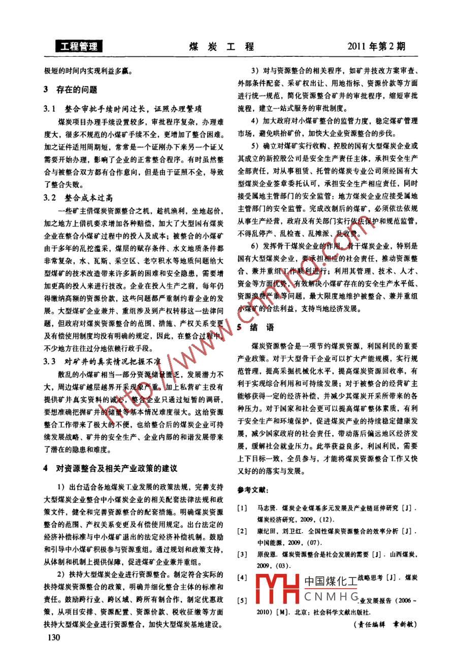 2011年第2期煤炭工程工程管理I對煤炭行業(yè)資源整合的建議王煒(中煤國際工程集團(tuán)南京設(shè)計院,江蘇南京210031)摘要: 近年來我國各個省(市、區(qū))地方政府,在改善煤炭工業(yè)結(jié)構(gòu),推進(jìn)煤炭資源整合、調(diào)整煤炭產(chǎn)業(yè)發(fā)展格局方面做了大量工作,取得了顯著成效,但煤炭企業(yè)“多、小、散”的粗放發(fā)展格局和“粗、低、亂”的管理模式仍未徹底改變。論文根據(jù)目前煤炭的產(chǎn)業(yè)格局,對煤炭行業(yè)資源整合的必要性、緊迫性進(jìn)行了闡述。介紹了煤炭資源整合的主要方法,分析了在煤炭資源整合過程中出現(xiàn)的問題,并在此基礎(chǔ)上提出了資源整合相關(guān)問題的政策與建議。關(guān)鍵詞:煤炭產(chǎn)業(yè);資源整合;產(chǎn)業(yè)政策;管理模式中圖分類號: F407.21文獻(xiàn)標(biāo)識碼: B文章編號: 1671 -0959(2011 )02 0129-02家提出了煤炭行業(yè)資源整合需引進(jìn)國有大型煤炭企業(yè),發(fā)1概述揮集團(tuán)管理、技術(shù)、裝備、隊伍、銷售等優(yōu)勢,通過資源煤炭資源整合是指以現(xiàn)有合法煤礦為基礎(chǔ),對兩處以整合、企業(yè)重組、租賃托管等方式,加速落后煤礦企業(yè)體上煤礦的井田合并或?qū)σ殃P(guān)閉煤礦的資源/儲量及其它零星制改革,調(diào)整優(yōu)化產(chǎn)業(yè)結(jié)構(gòu)、轉(zhuǎn)變經(jīng)濟(jì)增長方式、提高產(chǎn)邊角的空白資源/儲量合并,實(shí)現(xiàn)統(tǒng)一規(guī)劃,提升礦井生業(yè)集 中度和安全保障能力。產(chǎn)、技術(shù)、安全保障等綜合能力。實(shí)施煤炭資源整合和煤2資源整合主要方法礦兼并重組,是國家提升煤炭產(chǎn)業(yè)發(fā)展水平,實(shí)現(xiàn)結(jié)構(gòu)調(diào)整和轉(zhuǎn)型、安全生產(chǎn)、和諧發(fā)展的重要舉措。近年來,我1)依托大型骨千礦井,整合周邊小礦,形成大礦帶小國各個省(市區(qū))地方政府,在推進(jìn)煤炭資源整合,改善煤礦發(fā)展的新格局。 大型骨干煤炭企業(yè)有先進(jìn)的企業(yè)文化、炭產(chǎn)業(yè)發(fā)展格局方面做了大量工作,取得了明顯成效。但豐富的管理經(jīng)驗(yàn),在礦井建設(shè)、煤炭機(jī)械化開采、安全管煤炭T.業(yè)“多小散”的粗放發(fā)展格局和“粗、低、理、能源節(jié)約與利用等方面都具有顯著的優(yōu)勢,在建設(shè)大亂”的管理模式仍未徹底改變,大集團(tuán)大公司產(chǎn)業(yè)集中度礦 井的同時,對周邊的小煤礦進(jìn)行考察和整合,以形成大仍顯偏低。礦帶小礦的格局。大型礦井投人大、時間長,整合小型礦新型的煤炭工業(yè)管理模式替代傳統(tǒng)陳舊落后的模式,井可彌補(bǔ)這一不足,還能提早摸清地質(zhì)情況,鍛煉隊伍、要從思想上認(rèn)識到此舉措的必要性。傳統(tǒng)煤炭工業(yè)粗放發(fā)留住人才。同時依托大礦的技術(shù)和管理實(shí)力確保小礦生產(chǎn)展模式的長期延續(xù),資源浪費(fèi)和生態(tài)環(huán)境破壞,自然災(zāi)害安全,為地方政府解除后顧之憂。這是-一個一舉多贏的先和礦難事故頻頻發(fā)生,人們?yōu)榇烁冻隽顺林氐拇鷥r。煤炭進(jìn)管理模式。資源: 20%左右的回采率就意味著每采It煤要破壞和浪費(fèi)4t2)依托整合礦井技改擴(kuò)能,連片開發(fā),形成集群發(fā)展資源。在小煤礦遍地開花的地方,曾經(jīng)美麗的家園與河山,的局面。在周邊沒有大型骨干礦井的情況下,可以鼓勵大已被掠奪式的野蠻開采,糟蹋得千瘡百孔,滿目瘡痍。因型企業(yè)先整合一一個礦 井作為依托,技改擴(kuò)能,再通過重組,此,加大大型骨干礦井建設(shè),整合小煤礦,加大技改力度,并購,托管等形式整合周邊小礦,帶動周邊小礦的發(fā)展,規(guī)范礦井開采,迫在眉睫,勢在必行。最終形成連片開發(fā)、集群發(fā)展的局面。2005年以來國家出臺了各種相關(guān)政策,切實(shí)提高政府3)依托先進(jìn)理念,托管礦井,技術(shù)扶持,形成互利雙及企業(yè)對煤礦整頓關(guān)閉和煤炭資源整合工作重要性的認(rèn)識,贏局面。 大型煤炭國有企業(yè),除了大礦帶動小礦,技改整同時加大監(jiān)管力度,有序推進(jìn)了整合小煤礦工作的開展。合礦井外,還可以在雙方自愿的基礎(chǔ)上,經(jīng)協(xié)商達(dá)成合作煤炭資源整合作為一項復(fù)雜的系統(tǒng)T程,涉足十幾個省份,意向的,對煤礦進(jìn)行托管和技術(shù)扶持。托管的優(yōu)點(diǎn)是分擔(dān)關(guān)系到煤炭工業(yè)產(chǎn)業(yè)結(jié)構(gòu)的戰(zhàn)略性布局和可持續(xù)發(fā)展。國中國煤化工投人資金少,能在收稿日期: 2010-09-10TYHCNMHG作者簡介:王煒(1973-), 男,河南襄城人,工程師,1996 年畢業(yè)于河南大學(xué),現(xiàn)在中煤國際工程集團(tuán)南京設(shè)計院工程經(jīng)濟(jì)所從事概、預(yù)算工作。129工程管理煤炭工程2011年第2期極短的時間內(nèi)實(shí)現(xiàn)利益多贏。3)對與資源整合的相關(guān)程序,如礦井技改方案審查、外部條件配套、采礦權(quán)出讓、用地指標(biāo)、資源價款等方面3存在的問題進(jìn)行統(tǒng)- -規(guī)范, 簡化資源整合礦井的審批程序,編短審批3.1整合審批手續(xù)時間過長, 證照辦理繁瑣流程,建立一站式服務(wù)的審批制度。煤炭項目辦理手續(xù)設(shè)置較多,審批程序復(fù)雜,辦理難4)加大政府對小