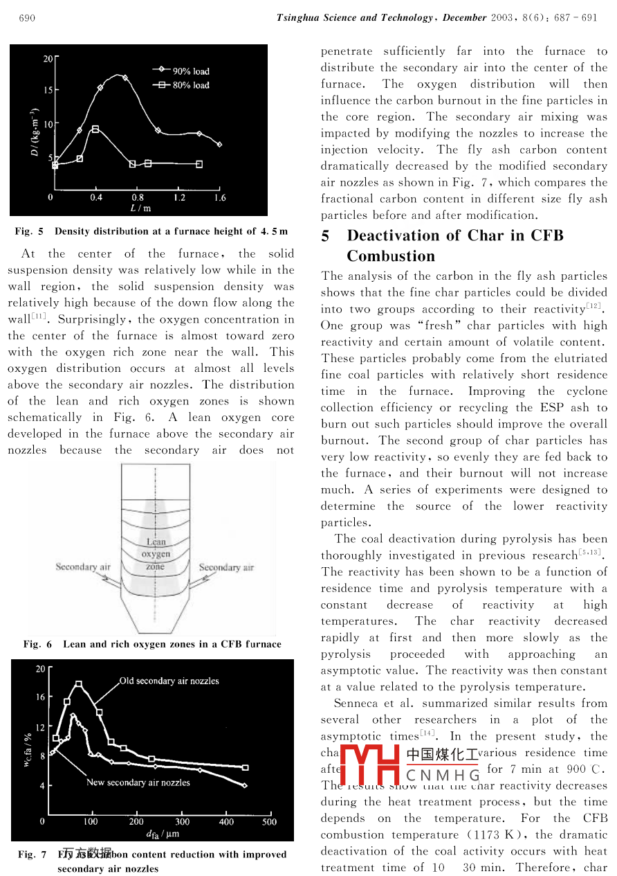 TSINGHUA SCIENCE AND TECHNOLOGYISSN1007-021408/21olume 8. Number 6. December 2003Unburned Carbon Loss in Fly Ash of cFB boilersBurning hard CoalU Junfu(呂俊復(fù)), WANG Qimin(王啟民), LI Yong(黎永)YUE Guangxi(岳光溪),YamY.Lee2, Baldur eliasson2,SHEN Jiezhong(沈解忠)3, YU Long(于龍1. Department of Thermal Engineering, Tsinghua University, Beijing 100084. China;2. Energy and Global Change Department, ABB Corporate Research Ltd, Switzerland3. Wuxi Boiler Works, Wuxi 214028, China;4. Harbin Boiler Works co. Ltd, Harbin 150040, ChinaAbstract: The unburned carbon loss in fly ash of circulating fluidized bed(CFB) boilers, most of which areburning active fuels such as lignite or peat, is normally very low. However, most CFB boilers in China usuallyburn hard coals such as anthracite and bituminous coal and coal wastes, so the carbon content in the fly ashfrom these boilers is higher than expected. This paper investigates the source of unburned carbon in the fly ashof CFB boilers burning hard coal through a series of field tests and laboratory investigations. The char behaviorduring combustion, including fragmentation and deactivation, which is related to the parent coal, has ant impact on the carbon burnout in Cb boilers. The research shows that char deactivation occursduring char burnout in fluidized bed combustion, especially for large particles of low rank coal. The unevenmixing of solids and air in the core region of the furnace also causes poor burnout of carbon in CFB fly ash. Anindex describing the volatile content (as dry ash free basis over the heating value is proposed to present theoal rank. The coal combustion efficiency is shown to be strongly connected with this coal index. Severalchanges in the CFB boiler design are suggested to reduce the unburned carbon loss in the fly ashKey words: circulating fluidized bed (CFB): unburned carbon loss; uneven mixing coal indexIntroductionChina. There are already more than eight hundredCFB boilers operating in China. Most smallAs a clean coal technology, circulating fluidized capacity CFB boilers (35-130 t/h steam capacitybed(CFB) technology has become a desirable and some large capacity CFB boilers (over 220 t/hchoice for both industrial boilers and power station steam output )are domestic technology while someboilers in China because of its flexible fuel large capacity CFB boilers are importedequivalents and low emission control costs. CFB technology. The combustion efficiency of CFBboiler development started in the early 1980s in boilers is reportedly very high. However,inChina, many CFB boilers burning hard coals, suchReceived:2002-04-25; revised:2002-07-03as anthracite and bituminous coal and coal wastesSupported by the National Key basic Research Speciahaund (No. 200026309), the Major Research Project of explthe Tenth-Five Plan (2001-2005) of China NoYHa中國煤化工 t in the fly ash thanNMHburned carbon IJU.avA aLut efficiency, so they are2001BA401A03),and Energy and Global Change less competitive than pulverized coal boilers in theDepartment, ABB Corporate Research LtdChinese boiler market. Furthermore, the highSwitzerlandcarbon content in the CFB fly ash limits the usage興共 To whom correspondence should be addressedEmal萬忘數(shù)據(jù) tsinghua.edu.cnof the fly ash as construction materials or as partialreplacement for cement.. Therefore, the carbonTel:86-10-62781559Tsinghua Science and Technology, December 2003, 8(6): 687-691content in the fly ash must be decreased to an basis, and Qar. net, p is the low grade heating valueacceptable level for the cement industryThe carbon content in the fly ash wcfa of theseThe carbon burnout in Chinese cfb boilers was cfb boileith the index i as sheinvestigated both in the laboratory and in the field Fig. 1. In addition, although the furnaceto identify the major factors affecting the formation temperature for anthracite combustion is higherof unburned carbon in the fly ashthan for the other coals, the carbon content in the1 Carbon Content in Fly Ash fromfly ash for anthracite is still the highest. Inaddition to these seven boilers. theCFB Boilers in Chinaexperience in China is that the low carbntentCFB boilers can be designed to burn almost any in fly ash from CFB boilers that burn anthracite iskind of solid fuel, which provides excellent fuel always suspectable. Even for some kinds offlexibility. But practical experience with Chinese bituminous, the carbon content in the fly ash isCFB boilers has shown that the carbon content in still relatively high, although the unburned carbonthe fly ash is not as low as expectedloss from the boiler is not very significant becauseData from seven selected chinese cfb boilersd from the highpresented in Tables 1 and 2. The feed coheating value bituminous coal. The lignite alwaysproperties are listed in Table 1, while the carbon burns out easily in the CFB boilers. The volatilitycontent in the fly ash and boiler operating index represents the ratio of easily burnt volatilesparameters are listed in Table 2.to combustible matter in the coal. The volatile2 Relation Between Coal Propertieslonger residence time to burn out in the CFBand Fly ash Carbon ContentThe carbon content in the fly ash is strongly 3 Cyclone Performancesrelated to the coal type. Coal in Boilers A and Glignite, coal in Boiler B is anthracite, C is low rank Fine char particles elutriated from the dense bedbituminous,D is lean coal, and coal in Boilers e are the major source of fly ash with high carbonand F is bituminous. An index I was defined to content. Most people believe that cyclonerelate the volatile content (as dry ash free basis )to performance is the key to improving carbonthe heating valueburnout. At low combustion temperatures, thecombustion rate is lower than that in pulverized(1)combustion boilers. Longer residence time iswhere wv, daf is the volatile content as dry ash freeTable 1 Properties of feed coal burned in seven Chinese CFB boilersboiler(MJ·kg)34.362.
