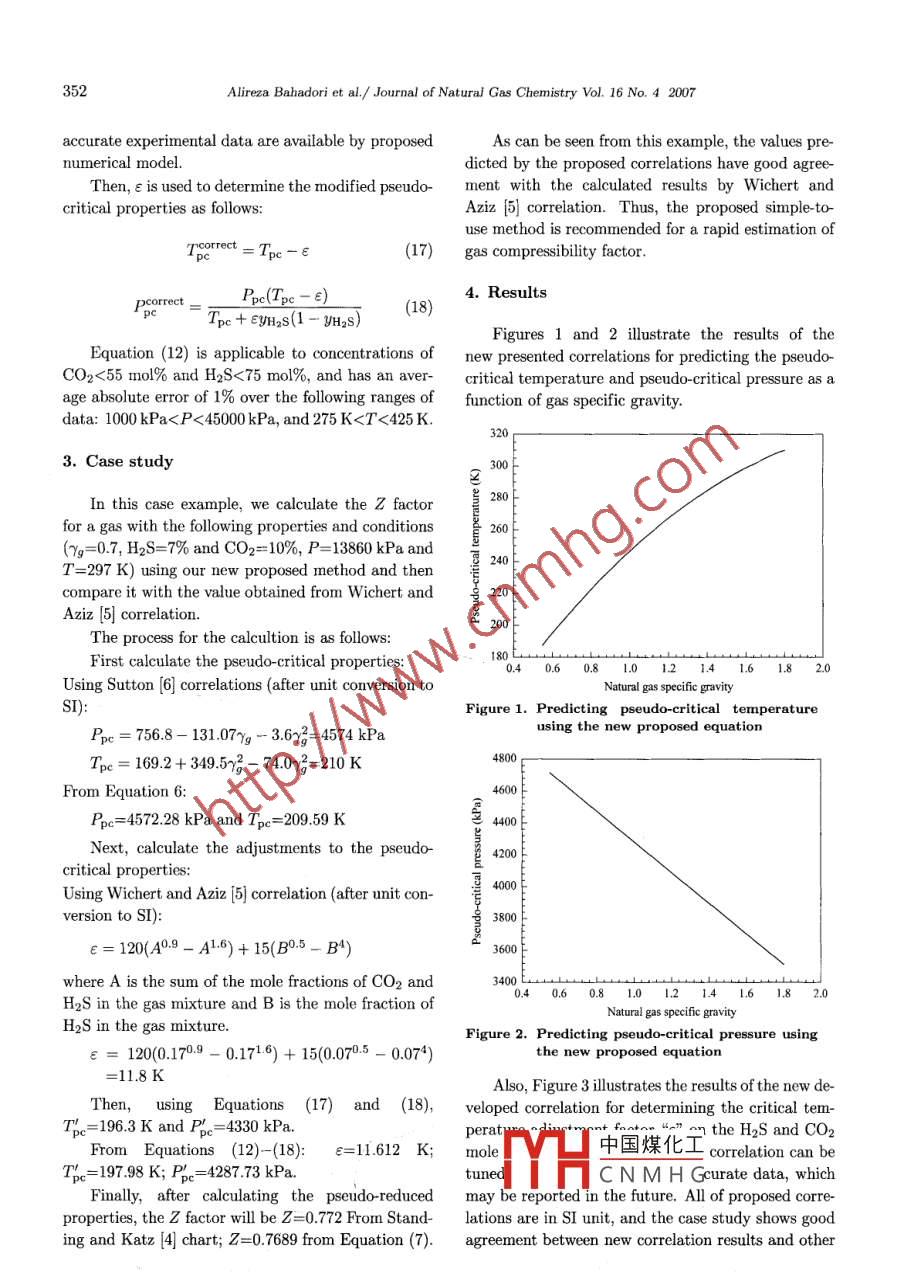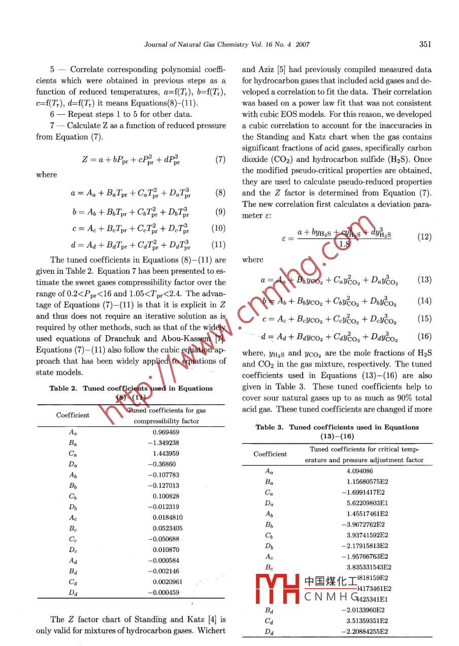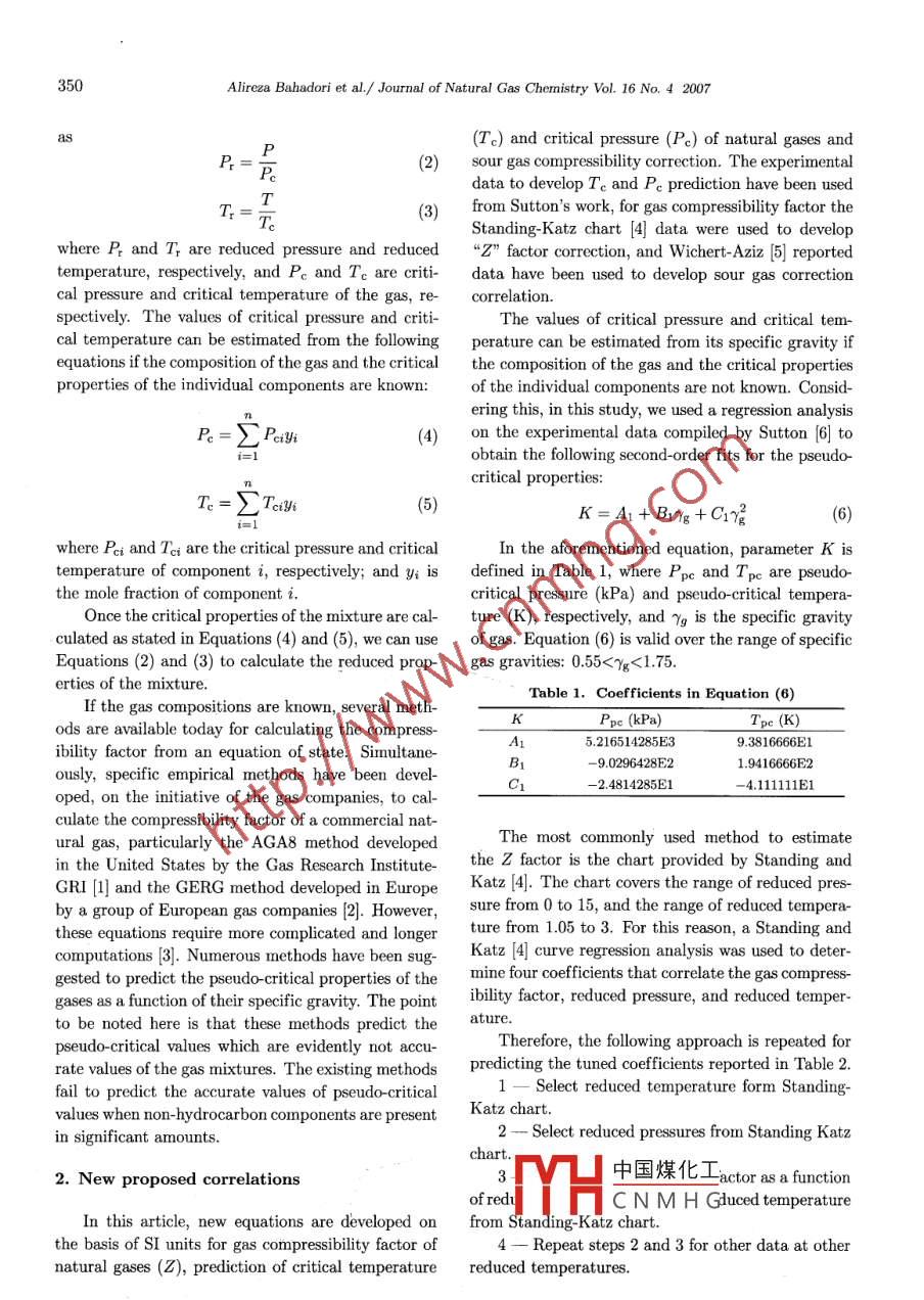 Availableonlineatwww.sciencedirect.com° SciencedirectJournal of Natural Gas Chemistry 16(2007)349-353CIENCE PRESSArticleRapidly Estimating Natural Gas Compressibility FactorAlireza Bahadori*, Saeid Mokhatab, Brian F. Towler31. Department of Chemical Engineering, Curtin University of Technology, GPO Bor 1987, Perth, WA 6845,Australia2. Process Technology Department, Tehran Raymand Consulting Engineers, Tehran, IranS. Chemical and Petroleum Engineering Department, University of wyoming, Laramie, WY, USAManuscript received June 5, 2007; revised July 17, 2007 1Abstract: Natural gases containing sour components exhibit different gas compressibility factor (ehavior than do sweet gases. Therefore, a new accurate method should be developed to account for thesedifferences. Several methods are available today for calculating the Z-factor from an equation of statHowever, these equations are more complex than the foregoing correlations, involving a large number ofparameters,which require more complicated and longer computations. The aim of this study is to developa simplified calculation method for a rapid estimating Z-factor for sour natural gases containing as muchs 90% total acid gas. In this article, two new correlations are first presented for calculating the pseudo-critical pressure and temperature of the gas mixture as a function of the gas specific gravity. Then, a simplecorrelation on the basis of the standard gas compressibility factor chart is introduced for a quick estimationof sweet gases compressibility factor as a function of reduced pressure and temperature. Finally, a newcorrective term related to the mole fractions of carbon dioxide and hydrogen sulfide is developedKey words: natural gas; compressibility factor; sour gas; critical pressure; critical temperature1. Introductionn is the number of kilomoles of the gas, and R is theThe volume of a real gas is usually less than thatThe gas deviation factor, Z, is close to 1 at lowof an ideal gas, and hence a real gas is said to be su- pressure and high temperature, which means that thepercompressible. The ratio of the real volume to the gas behaves as an ideal gas in these conditions.Atideal volume, which is a measure of the amount the standard or atmospheric conditions the gas Z factorgas deviates from perfect behavior, is called the su- is always approximately 1percompressibility factor, sometimes shortened to theThe most common sources of Z-factor valuescompressibility factor. It is also called the gasre experimental measurement, equations-of-stateation factor and is denoted by the symbol Zmethod and empirical correlations. Necessity arisesgas deviation factor is, by definition, the ratio of the when there is no available experimental data for thevolume actually occupied by a gas at a given pressure required composition, pressure, and temperature con-and temperature to the volume it would occupy if it ditions. Several different correlations are available forthis important parameter. The basic correlations useThe real gas equation of state is then written as the中國煤化工PV=ZRTLCNMHstates dictates th…1…3 uvained as a function ofwhere P is the pressure, V is the volume, T is the reduced pressure and reduced temperature The re-absolute temperature, Z is the compressibility factor, duced pressure and reduced temperature are definedCorresponding author. Tel: +61-8-9266-4685: Fax: +61-8-9266-2681: E-mail: alireza bahadori@student. curtin. edu. auAlireza Bahadori et al. Journal of Natural Gas Chemistry Vol. 16 No. 4 2007(Tc) and critical pressure(Pc) of natural gases andPI-P(2) sour gas compressibility correction. The experimentaldata to develop Te and Pc prediction have been usedT(3) from Sutton's work, for gas compressibility factor theStanding-Katz chart 4 data were used to developwhere P and T are reduced pressure and reduced Z"factor correction, and Wichert-Aziz 5] reportedcal pressure and critical temperature of the gas, re- correlation, n usedtemperature, respectively, and Pc and Tc are criti- data have been used to develop sour gas correctionspectively. The values of critical pressure and criti-The values of critical pressure and critical tem-cal temperature can be estimated from the following perature can be estimated from its specific gravity ifequations if the composition of the gas and the critical the composition of the gas and the critical propertiesproperties of the individual components are known: of the individual components are not known.Consid-ering this, in this study, we used a regression analysisPcPca(4) on the experimental data compiled by Sutton [6] toobtain the following second-order fits for the pseudo-K=A1+B178+C172where Pci and Tci are the critical pressure and criticalIn the aforementioned equation, parameter K istemperature of component i, respectively; and yi is defined in Table 1, where Ppc and Tpc are pseudothe mole fraction of component icritical pressure (kPa)and pseudo-critical temperaOnce the critical properties of the mixture are cal- ture(K), respectively, and 1g is the specific gravityculated as stated in Equations (4)and(5), we can use of gas. Equation(6) is valid over the range of specificEquations(2)and 3) to calculate the reduced prop- gas gravities: 0.55