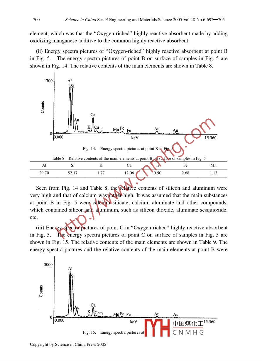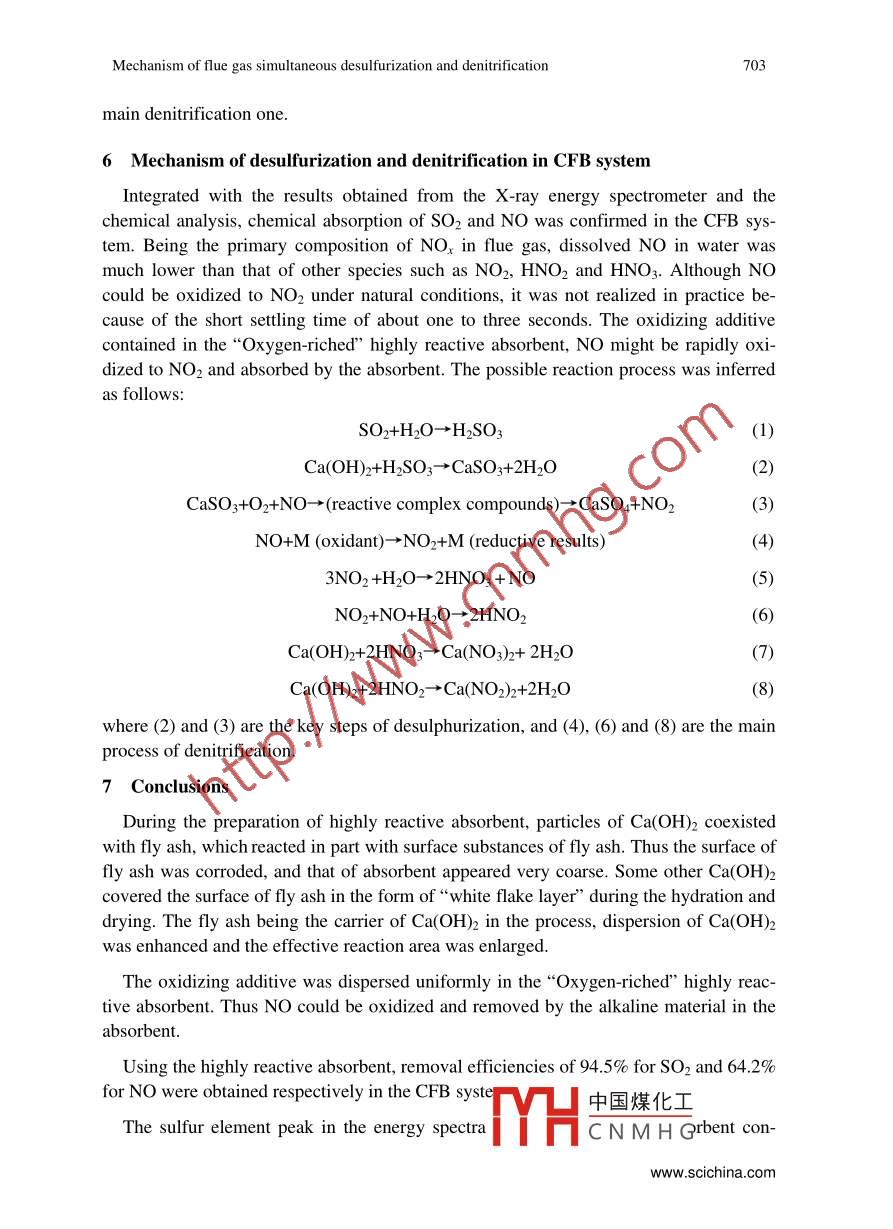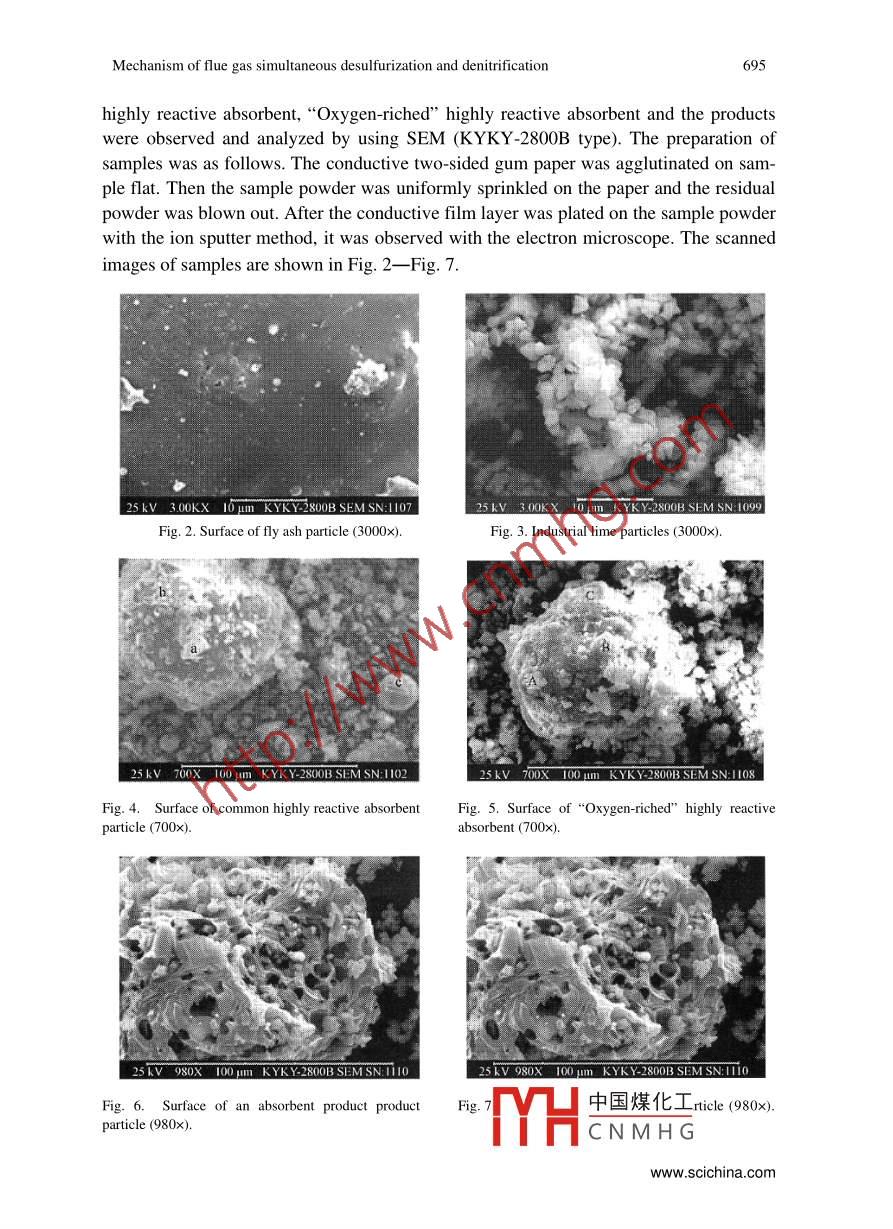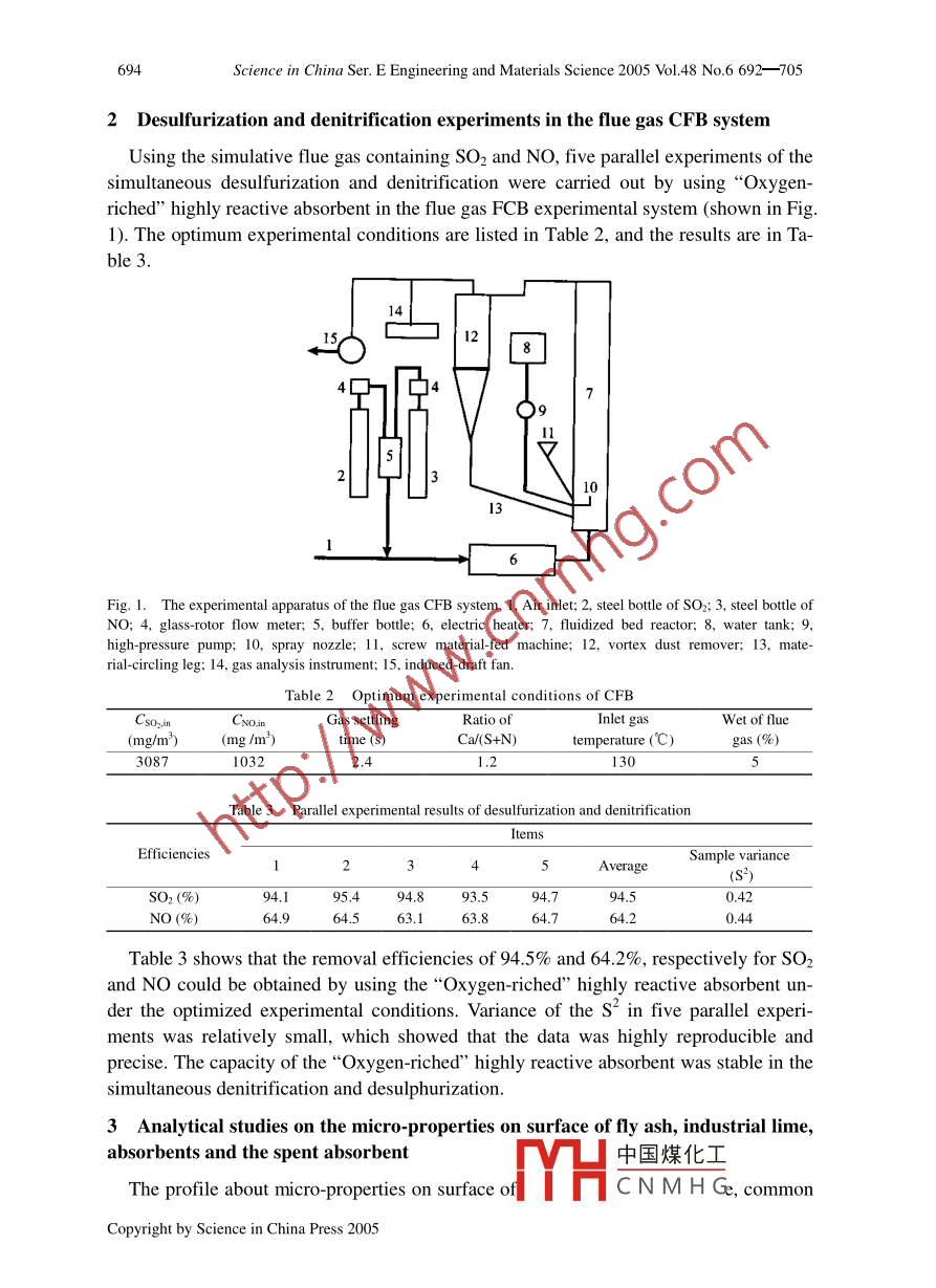 Science in China ser. E Engineering and Materials Science 2005 Vol 48 No 6 692--705Mechanism of flue gas simultaneous desulfuri-zation and denitrification using the highlyreactive absorbentXU Peiyao, MA Shuangchen, WANG Lidongliu FengSchool of Environmental Science Engineering, North China Electric Power University, Baoding 071003ChinaCorrespondenceshouldbeaddressedtoZhaoYi(email:zhaoy9515@163.com)Apri29,2005Abstract Fly ash, industry-grade lime and a few oxidizing manganese compoundadditive were used to prepare the Oxygen-riched highly reactive absorbent forsimultaneous desulfurization and denitrification. Experiments of simultaneousdesulfurization and denitrification were carried out using the highly reactive absorbentthe flue gas circulating fluidized bed(CFB)system. Removal efficiencies of 94.5% for SO2and 64.2% for No were obtained respectively. The scanning electron microscope (SEM)and accessory X-ray energy spectrometer were used to observe micro-properties of thesamples, including fly ash, common highly reactive absorbent, Oxygen-riched" highlyeactive absorbent and spent absorbent. The white flake layers were observed in theSEM images about surfaces of the common highly reactive absorbent and"Oxygen-riched one, and the particle surfaces of the spent absorbent were porous. The content ofcalcium on surface was higher than that of the average in the highly reactive absorbentThe manganese compound additive dispersed uniformly on the surfaces of the"Oxygenriched" highly reactive absorbent. There was a sulfur peak in the energy spectra picturesof the spent absorbent. The component of the spent absorbent was analyzed withchemical analysis methods, and the results indicated that more nitrogen speciesappeared in the absorbent except sulfur species, and so 2 and No were removed bychemical absorption according to the experimental results of X-ray energy spectrometerand the chemical analysis Sulfate being the main desulfurization products nitrite was themain denitrification ones during the process, in which no was oxidized rapidly to no 2 andsorbed by the chemical reactionKeywords: highly reactive absorbent, fly ash, simultaneous desulfurization and denitrification, micro-property, scanning electron microscope X-ray energy spectraDOI:10.1360/03ve0041Using slurry mixed by fly ash and alkaline m中國煤化工 industrialwaste gas had been reported in the 1970s, whichHCNMHGSCopyright by Science in China Press 2005Mechanism of flue gas simultaneous desulfurization and denitrification693then, there have been many reports about flue gas desulfurization using the reactive ab-sorbent prepared with flying ash. There are four kinds as follows:(1) Using slurry of flyash as absorbent/2-, which mainly utilize the property of fly ash for desulphurization,but the removal efficiency is not high. (2)Using fly ash and lime/slaked lime/asabsorbent. There have been a lot of reports about the preparation conditions of this kindof absorbent, such as digesting temperature, time, pressure ratio by weight of fly ash andcalcium hydroxide, and ratio of water and solid, etc. 6-9, 1. 15.(3)Using highly reactivesorbent. The additives, such as CaSO4 8-24, CaCl2 and other compounds9,areadded to the fly ash/ime to improve the desulfurization activity. Unfortunately, the men-tioned absorbents are only used for desulphurization, while simultaneous denitrificationcannot be realized. The Oxygen-riched"absorbent for simultaneous desulfurization anddenitrification was prepared by adding oxidative reagent to fly ash and lime. With theduct injection system and CFB as the working platform, the experiments about simultaneous removal of so2 and No in flue gas have been done by using the proposed absor-bent,which are reported in our papers 25-7. The"Oxygen-riched"absorbent is namedthe fourth kindThe present investigations of the former three kinds of absorbents showed that thesurface characteristic of the absorbents has a great effect on desulphurization. However,the surface characteristics of the fourth kind of absorbent and its reactions with so, andNO in the CFB system have not been reported. SEM and the accessory X-ray energyspectrometer were used to analyze micro-properties and contents of significant elements on the surface of the fly ash, the fly ash/lime absorbent, " Oxygen-riched"absorbent and reaction products in this paper. The chemical analysis methods weredopted to determine the compositions of the products of desulfurization and denitrification. Thus the detailed mechanism of desulfurization and denitrification in the CFB sys-tem was investigated1 Preparation of the"Oxygen-riched"highly reactive absorbentAccording to our previous experimental results/25, 26] and other research conclu-sions 3.12, the"Oxygen-riched"highly reactive absorbent was prepared from fly ashindustrial lime and oxidizing manganese compound additive. The preparation processwas as follows. The mixture including fly ash and industrial lime with the ratio of 3: 1 inweight, manganese compound and water, was stirred and digested in 363 K and driedafter six hours. Thus, the "Oxygen-riched" highly reactive absorbent was achieved.The fly ash used in the experiments came from Baoding Thermoelectricity Plant,whose compositions are shown in Table 1. The content of the effective calcia in the in-dustrial lime was 90.77%0, measured by the method of cane sugarTable 1 Contents of components in fly ashSioCao中國煤化工 OthersContent(%)46.65,2ILI3.3YHCNMHG 1.4Science in China Ser. E Engineering and Materials Science 2005 Vol 48 No 6 692--7052 Desulfurization and denitrification experiments in the flue gas CFB systemUsing the simulative flue gas containing SO2 and NO, five parallel experiments of thesimultaneous desulfurization and denitrification were carried out by using"Oxygen-riched"highly reactive absorbent in the flue gas FCB experimental system(shown in Fig1). The optimum experimental conditions are listed in Table 2, and the results are in Table 31412○921