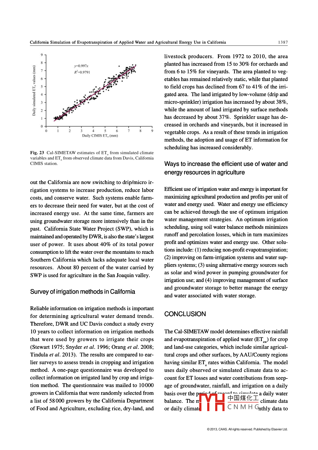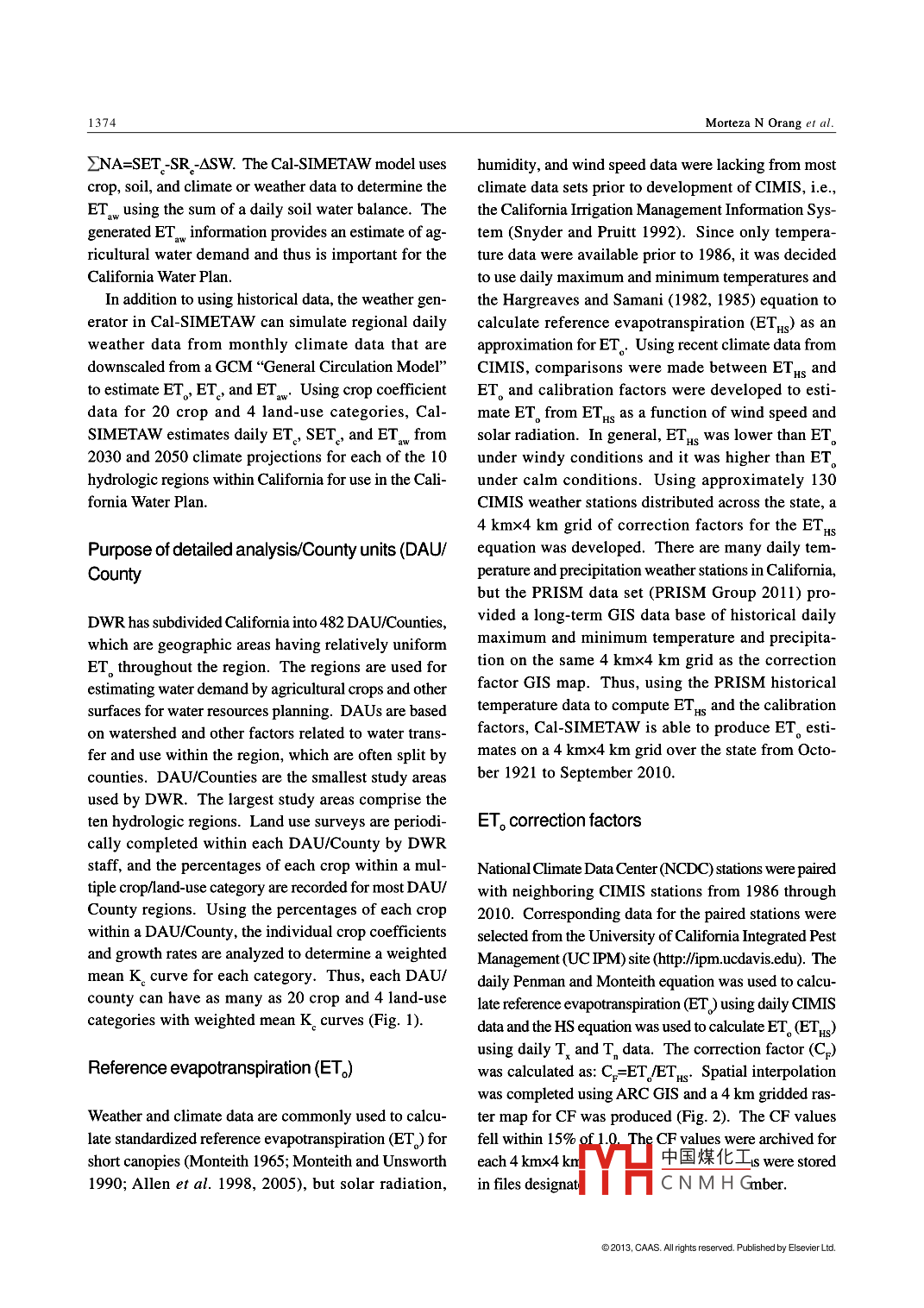 Available online at www.sciencedirect.comJournal of Integrative Agriculture2013, 12(8): 1371-1388心ScienceDirectAugust 2013RESEARCH ARTICLECalifornia Simulation of Evapotranspiration of Applied Water and AgriculturalEnergy Use in CaliforniaMorteza N Orang', Richard L Snyder2, Shu Geng23, Quinn J Hart, Sara Sarreshteh2, Matthias Falk2, DylanBeaudette, Scott HayesI and Simon Eching'2 Department of Land, Air and Water Resources, University of California, Davis, CA 95616, USA3 School of Environment and Energy, Shenzhen Graduate School, Peking University, Shenzhen 518055, P.R.ChinaAbstractThe Califormia Simulation of Evapotranspiration of Applied Water (CaI-SIMETAW) model is a new tool developed by theCalifornia Department of Water Resources and the University of California, Davis to perform daily soil water balance anddetermine crop evapotranspiration (ET), evapotranspiration of applied water (ETgw), and applied water (AW) for use inCalifornia water resources planning. ETw is a seasonal estimate of the water needed to irrigate a crop assuming 100%irrigation efficiency. The model accounts for soils, crop cofficients, rooting depths, seepage, etc. that influence crop waterbalance. It provides spatial soil and climate information and it uses historical crop and land-use category information toprovide seasonal water balance estimates by combinations of detailed analysis unit and county (DAU/County) over California.The result is a large data base of ET。and ET that will be used to update information in the new California Water Plan (CWP).The application uses the daily climate data, i.e., maximum (T) and minimum (T) temperature and precipitation (Pp), whichwere derived from monthly USDA-NRCS PRISM data (PRISM Group 2011) and daily US National Climate Data Center(NCDC) climate station data to cover California on a 4 kmx4 km change grid spacing. The application uses daily weather datato determine reference evapotranspiration (ET.), using the Hargreaves-Samani (HS) equation (Hargreaves and Samani 1982,1985). Because the HS equation is based on temperature only, ET。from the HS equation were compared with CIMIS ET。atthe same locations using available CIMIS data to determine correction factors to estimate CIMIS ET。from the HS ET。toaccount for spatial climate differences. Cal SIMETAW also employs near real-time reference evapotranspiration (ET.)information from Spatial CIMIS, which is a model that combines weather station data and remote sensing to provide a grid ofET. information. A second database containing the available soil water holding capacity and soil depth information for all ofCalifornia was also developed from the USDA-NRCS SSURGO database. The Cal-SIMETAW program also has the ability togenerate daily weather data from monthly mean values for use in studying climate change scenarios and their possibleimpacts on water demand in the state. The key objective of this project is to improve the accuracy of water use estimates forthe California Water Plan (CWP), which provides a comprehensive report on water supply, demand, and management inCalifornia. In this paper, we will discuss the model and how it determines ETw for use in water resources planning.Key words: soil water balance, crop water requirements, weather generator, water resource planning, crop coffcient, energy usetion of Evapotranspiration of Applied Water or Cal-INTRODUCTIONSIMETAW was specifically designed to provide the bestpossible information on agricultural water demand forThe daily soil water balance model California Simula-use in the California Water Plan, updated every five中國煤化工Received 17 October, 2012 Acepted 10 January, 2013YHCNMHGCorrespondence Morteza N Orang. Tel: +1-916-6537707, E-mail: morang @ water.ca gov⑥2013,CAAS. All nghts rseved. PulisedbylEseviertd.1372Morteza N Orang et al. .years to present the status and trends of California'swater requirement. It differs from irrigation efficiency,water- dependent natural resources; water supplies; andwhich includes the crop water requirements, water usedagricultural, urban, and environmental water demandsfor frost protection, and leaching requirements, i.e.,for a range of plausible future scenarios. Californiabeneficial uses, divided by AW over a cropping season.agriculture is a multibillion dollar industry, number oneA major goal of this project was to improve infor-producer in the nation, and largest consumer of water.mation on current and future water demand. Cal-The agricultural water demand is high and increasing SIMETAW was developed for water demand planningbecause water supplies are limited and competition forand it can help to plan for the effects of climate changethose supplies is growing. The main factors that areas well as for current climate conditions. Improve-causing increases in agricultural water demand are thements to the input information and data processing inpopulation growth and demand for food and fiber. At Cal-SIMETAW greatly enhances our ability to rapidlythe same time, the demand for urban and environmen-and accurately determine ETaw for 20 crop categoriestal water uses is increasing. The California Depart- and 4 land-use categories by each DAU/County withinment of Water Resources (DWR) and the University ofCalifornia. All of the ET w calculations are done on aCaliformia, Davis (UC Davis) are keenly aware of thedaily basis, so the estimation of effective seepage ofneed for good planning, and Cal-SIMETAW model wasgroundwater, effective rainfall and, hence, ETw isdeveloped to address the planning needs. The Cal-greatly improved over earlier methods. In addition, theSIMETAW computer application program was writtenuse of the widely adopted Penman-Monteith equationusing Microsoft C# for calculations and Oracle Spatialfor reference evapotranspiration (ET) and improved11g for data storage, as a tool to help DWR obtain ac-methodology to apply crop coefficients for estimatingcurate estimates of crop evapotranspiration (ET),crop evapotr