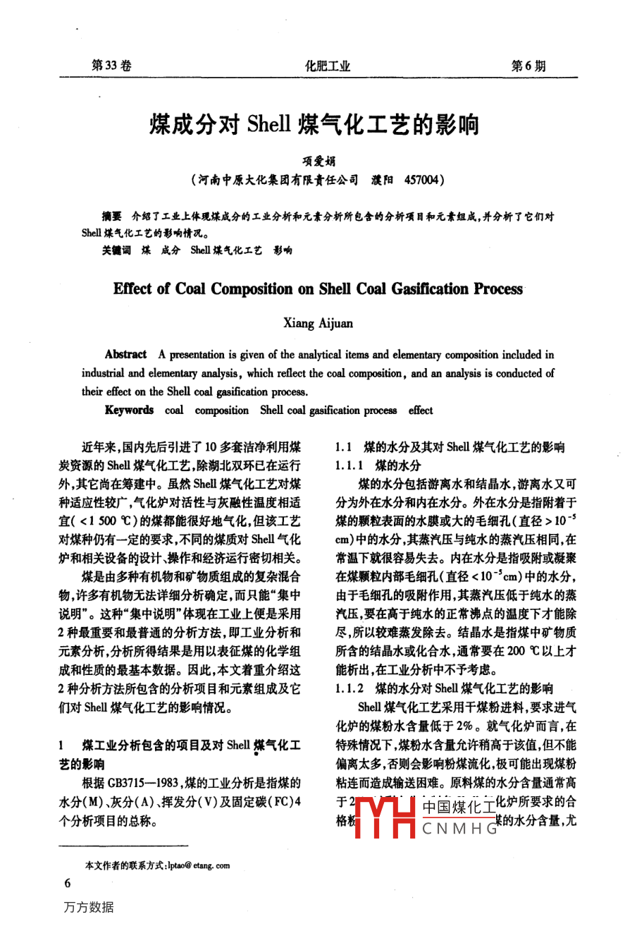 第33卷化肥工業(yè)第6期煤成分對(duì)Shell 煤氣化工藝的影響項(xiàng)愛娟(河南中原大化集團(tuán)有限責(zé)任公司濮陽457004)摘要介紹了 工業(yè)上體現(xiàn)煤成分的工業(yè)分析和元素分析所包含的分析項(xiàng)目和元素組成,并分析了它們對(duì)Shell 煤氣化工藝的影響情況。關(guān)鍵詞煤成分Shell煤氣化工藝影響Efect of Coal Composition on Shell Coal Gasification ProcessXiang AlijuanAbstract A presentation is given of the analytical items and elementary composition included inindustrial and elementary analysis , which reflect the coal composition, and an analysis is conducted oftheir effect on the Shell coal gasification process.Keywords coal composition Shell coal gasification process effect近年來,國內(nèi)先后引進(jìn)了10多套潔凈利用煤.1 煤的水分及其對(duì)Shell煤氣化工藝的影響炭資源的Shell煤氣化工藝,除湖北雙環(huán)已在運(yùn)行1.1.1 煤的水分外,其它尚在籌建中。雖然Shell煤氣化工藝對(duì)煤煤的水分包括游離水和結(jié)晶水,游離水又可種適應(yīng)性較廣,氣化爐對(duì)活性與灰融性溫度相適分為外在水分和內(nèi)在水分。外在水分是指附著于宜( <1 500 C)的煤都能很好地氣化,但該工藝煤的顆粒表面的水膜或大的毛細(xì)孔(直徑> 10-5對(duì)煤種仍有一定的要求 ,不同的煤質(zhì)對(duì)Shell氣化cm)中的水分,其蒸汽壓與純水的蒸汽壓相同,在爐和相關(guān)設(shè)備的設(shè)計(jì)操作和經(jīng)濟(jì)運(yùn)行密切相關(guān)。常溫下就很容易失去。內(nèi)在水分是指吸附或凝聚煤是由多種有機(jī)物和礦物質(zhì)組成的復(fù)雜混合在煤顆粒內(nèi)部毛細(xì)孔(直徑< 10-5 cm)中的水分,物,許多有機(jī)物無法詳細(xì)分析確定,而只能“集中由于毛細(xì)孔的吸附作用,其蒸汽壓低于純水的蒸說明"。這種“集中說明”體現(xiàn)在工業(yè)上便是采用汽壓,要在高于純水的正常沸點(diǎn)的溫度下才能除2種最重要和最普通的分析方法,即工業(yè)分析和盡,所以較難蒸發(fā)除去。結(jié)晶水是指煤中礦物質(zhì)元素分析,分析所得結(jié)果是用以表征煤的化學(xué)組所含的結(jié)晶水或化合水,通常要在200 C以上才成和性質(zhì)的最基本數(shù)據(jù)。因此,本文著重介紹這能析出,在工業(yè)分析中不予考慮。2種分析方法所包含的分析項(xiàng)目和元素組成及它1.1.2煤的水分對(duì) Shell煤氣化工藝的影響們對(duì)Shell煤氣化工藝的影響情況。Shell煤氣化工藝采用干煤粉進(jìn)料,要求進(jìn)氣化爐的煤粉水含量低于2%。就氣化爐而言,在1煤工業(yè)分析包含 的項(xiàng)目及對(duì)Shell煤氣化工特殊情況下,煤粉水含量允許稍高于該值,但不能藝的影響偏離太多,否則會(huì)影響粉煤流化,極可能出現(xiàn)煤粉根據(jù)CB3715-1983 ,煤的工業(yè)分析是指煤的粘連而造成輸送困難。原料煤的水分含量通常高水分(M)、灰分(A)、揮發(fā)分(V)及固定碳(FC)4中國煤化工化爐所要求的合個(gè)分析項(xiàng)目的總稱。某的水分含量,尤TYHCNMHG本文作者的聯(lián)系方式:lptao@ etang. com第33卷化肥工業(yè)第6期其是外在水分含量,直接影響煤的運(yùn)輸成本和制顯熱,使煤的熱效率降低。且煤中灰分含量越高,粉能耗。原煤運(yùn)輸成本越大,氣化煤耗、氧耗越高,氣化爐1.2煤的灰分 及其對(duì)Shell煤氣化工藝的影響和灰渣處理系統(tǒng)負(fù)荷越重,嚴(yán)重時(shí)會(huì)影響氣化爐1.2.1煤的灰分的正常運(yùn)行。煤灰中某些組分含量過高會(huì)影響煤煤的灰分是指煤的內(nèi)在礦物質(zhì)和外來礦物灰的熔融特性,造成氣化爐渣閥排渣不暢或堵塞。質(zhì),內(nèi)在礦物質(zhì)又分原生和次生礦物質(zhì)。原生礦Shell煤氣化爐采用水冷壁結(jié)構(gòu),利用煤氣化物質(zhì)是指原始成煤植物含有的礦物質(zhì),一般不超反應(yīng)初期熔融^飛灰在壁上形成固體渣層使膜式壁過1% ~2% ;次生礦物質(zhì)是指在成煤過程中進(jìn)入與爐膛隔離,以減少熱量損失,同時(shí)在故障期間熱煤層的礦物質(zhì),約在10%以下。外來礦物質(zhì)是指負(fù)荷變化大時(shí)首先造成固體渣層被熔化或者加采掘過程中混人煤中的矸石,約5% ~ 10% ,高的厚,從而保護(hù)爐壁免受損壞。如果煤中灰分含量在20%以上。太低,固體保護(hù)渣層形成不好,使氣化爐的熱損變(1)煤灰的化學(xué)組成大,冷煤氣效率降低,而且不利于爐壁的抗渣保煤灰主要由SiO2、AL2 O,、Fez O3、CaO、Mg0、護(hù),影響氣化爐使用壽命。TiO2、Na20、K20等酸性和堿性的化學(xué)組分組成,盡管Shell煤氣化工藝對(duì)煤灰含量要求不是-般酸性組分高于堿性組分,(Fe2O3 +CaO +很嚴(yán)格(煤灰含量可高達(dá)30%以上) ,中原大化集Mg0 + K,0 + Na20)/(SiO2 + AI203 + TiO2)的比團(tuán)有限責(zé)任公司根據(jù)預(yù)選煤的情況,其設(shè)備設(shè)計(jì)值稱為堿酸比。按無水基煤灰含量25. 5% (收到基23.5% )的煤(2)煤灰的熔融性及熔化后的粘性進(jìn)行設(shè)計(jì)。根據(jù)荷蘭DEMKOLEC電廠實(shí)際運(yùn)行由于煤灰是由許多化合物組成的混合物,沒經(jīng)驗(yàn),該工藝最優(yōu)化的煤灰含量為9% ~19%,當(dāng)有一個(gè)固定的熔點(diǎn),只有一個(gè)相當(dāng)寬的熔化溫度煤中灰分含量低于8%時(shí),中壓蒸汽量將會(huì)增加,范圍,煤灰成分在- -定溫度下能形成共熔體。也就表明膜式壁固體保護(hù)渣層極可能形成不理將煤灰與糊