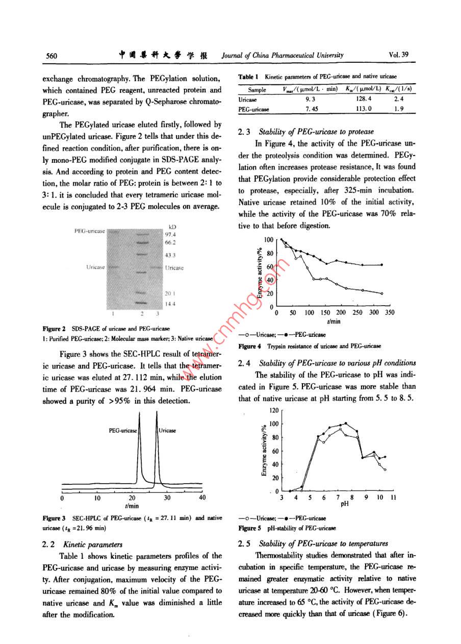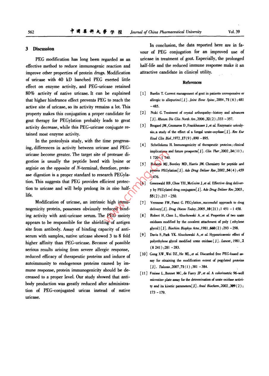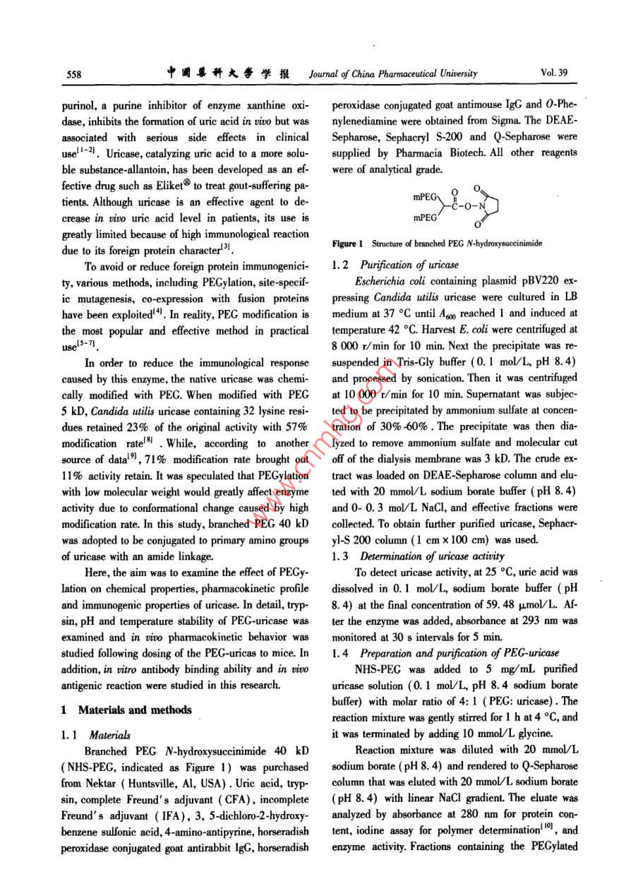 中國科大李學(xué)報 Journal of China Pharmaceutical University 2008,39(6) :557-562557 Research on PEG modification of uricase CAI Lei, GAO Xiang-dong, ZHU Shu, WANG Hua, YAO Wen-bing' Sche iversity, Narjing 210009, China th PEG reagent in order to decrease uricase immunogenici and increase its bility. Methods: The branched PEG of 40 kD was chosen to modify native uricase. The properties of the mod- and temperature, in vivo half-life time, as well as the immu- the midofied uricase were studied in mice. Results: of Candida utilis uricase resulted in higher tryp alf-life. PEG modified uricase retained 80% of d that half-life in serum of the intravenously injec- native uricase of 45 min. Higher plasma drug con- cent e. Furthermore, the binding affinity was ISA assay, and it was one-eighth that of native uricase. Final- d a delayed immunoresponse in mice following repeated adminis- trations. Conclus chemically modified form of uricase may serve as a potentially effectiv Key words uricase; PEGylation; immunogenicity; half-life CLC Number Q55 Document code A Article ID 1000-5048(2008)06-0557-06聚乙醇修飾尿酸酶的研究才蕾,高向東,朱姝,王華,姚文兵(中國藥科大學(xué)生命科學(xué)與技術(shù)學(xué)院,南京210009摘要目的:為了降低尿酸酶的免疫原性并提高其穩(wěn)定性,利用PEG修飾劑對尿酸酶進(jìn)行修飾,以期獲得性質(zhì)更優(yōu)的治療痛風(fēng)的藥物。方法:用相對分子質(zhì)量為40kD,活化基團(tuán)為羥基琥珀酰亞胺的PEG修飾劑對尿酸酶進(jìn)行修飾,并比較修飾前后在酶解穩(wěn)定性、pH穩(wěn)定性及溫度穩(wěn)定性方面的差異,以及PEG修飾對體內(nèi)半表期免疫原性的影響。結(jié)果:發(fā)現(xiàn)PEG修飾后尿酸酶的酶解穩(wěn)定性顯著提高,PEG化尿酸酶保留了原有尿酸酶80%的活性,體內(nèi)半表期從45min延長至696min。PEg化尿酸酶與抗體的結(jié)合能力為原型蛋白的1/8。體內(nèi)的免疫原性也明顯降低。結(jié)論:化學(xué)修飾后的尿酸酶可望成為潛在的治療痛風(fēng)的有效藥物。關(guān)鍵詞尿酸酶;PEG化修飾;免疫原性;半衰期 Gout is becoming more and more common be-product of purine metabolism, excessive uric acid usu- cause of the growing consumption of purine-rich foods ally precipitate and its low solubility in serum is re- such as meat and alcoholic beverages in consumers' sponsible for the formation of crystal at bone joints, regular diet. Because uric acid is execreted as the end thereby resulting in gout. As a widely used drug, allo- Received date 2008-03-27 Corresponding author Tel: 86-25-83271218 E-mail: wbyao@ epu. edu. cn FOUNDATION ITEM This study was supported by the National Natural Science Foundation No. 30672559. No. 30772679), the National High Technology Research and Development Program of China(863'pro- gram)(No. 2007AA02Z101), Program for New Century Excellent Talents in University NCET-04- 0506)and Jiangsu Province Six Talent Peak Project558中國科大學(xué)學(xué)報 Journal of China Pharmaceutical University Vol.39 purinol, a purine inhibitor of enzyme xanthine oxi- peroxidase conjugated goat antimouse IgG and 0-Phe- dase, inhibits the formation of uric acid in vivo but was nylenediamine were obtained from Sigma. The DEAE- associated with serious side effects in clinical Sepharose, Sephacryl S-200 and Q-Sepharose were Uricase, catalyzing uric acid to a more solu- supplied by Pharmacia Biotech. All other reagents ble su ed as an ef- were of analytical grade. g pa- crease in vivo uric acid level in patients, its use mPEG re Structure of branched PEG N-hydroxysuccinimide 2 Purification of uricase Escherichia coli containing plasmid pBV220 ex ing Candida utilis uricase were cultured in LB medium at 37 C until Ago reached 1 and induced at the temperature 42 C. Harvest E. coli were centrifuged at use 0 r/min for 10 min. Next the precipitate was re- ed in Tris-Gly buffer (0. mol/L, pH 8.4) by sonication. Then it was centrifuged 0 000/min for 10 min. Supernatant was subjec- sulfate at concen- was then dia- fate and molecular cut in and elu- m borate buffer (pH 8.4) s were acid was ffer (pH f 59. 48 umol/L. Af- 293 nm was o 5 mg/mL purified H8.4 sodium borate ).The Branched PEG N-h (NHS-PEG, indicated as Figure 1) was purcha to Q-Sepharose from Nektar Huntsville, Al, USA). Uric acid. complete F Cl gradient. The eluate was Freund's adjuvant (IFA), 3, 5-di be ulfonic acid, 4-a peroxidase conjugated goat antirabbit IgG,horseradish ng the PEGylated No.6 CAI Le et al: Research on PEG modification of uricase559 uricase were pooled and purified by exclusion chroma- rated and diluted for later activity determination. One- compartmental pharmacokinetic modeling was per- 1.5 Electrophoresis formed. SDS polyacrylamide gel electrophoresis was per- 1. 11 Antigenicity activity formed according to the method of Laemmli on a slab ELISA was performed to determine whether PEG- gel containing 12% w/) polyacrylamide running gel ylated uricase shields the protein from antibody bind- and 4% (w/) stacking gel. The protein bands were ing. 96-well microplates were coated overnight with stained with commasim brilliant blue. 100 uL of uricase or PEG-uricase. The wells were 1.6 Kinetic analysis blocked with 10% FBS in PBS followed by incubation Steady-state kinetic measurements were per- with rabbit anti-uricase serum. Binding ability was de- formed in 0. mol/L sodium borate (pH 8.4)at 25 tected with HRP-labeled goat anti-rabbit IgG and f the substrate uric OPD was utilized for colorimetric detection. The plates 0.000 125%, 0.000 25%, 0.000 5%, were measured at an absorbance of 492 nm. 0.001% and 0. 002% w/). The kinetic paramet The amount of the adsorbed protein on the well surface was tate data. Turnover plate coated with uricase or the PE50lof uric acid solution(59.48 umol/L)was added. Then 100 uL of detection e was d in 37 C