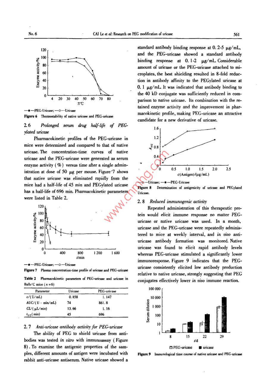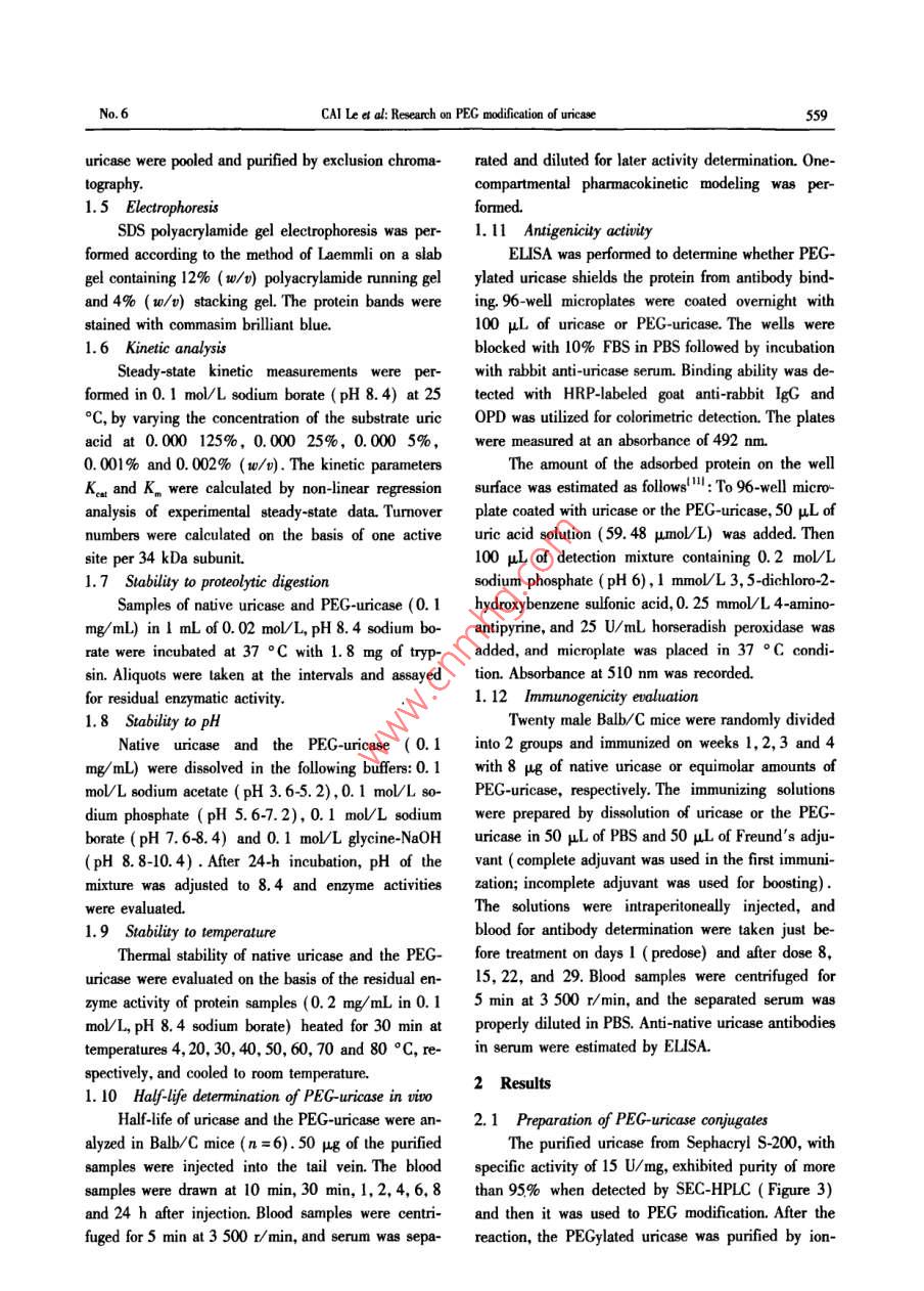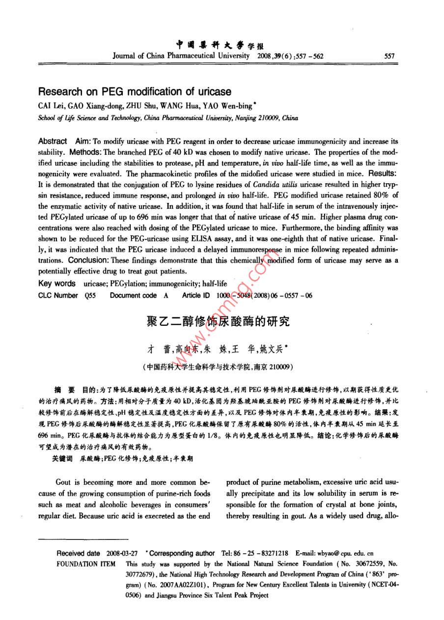 中國科大李學(xué)報 Journal of China Pharmaceutical University 2008,39(6) :557-562557 Research on PEG modification of uricase CAI Lei, GAO Xiang-dong, ZHU Shu, WANG Hua, YAO Wen-bing' Sche iversity, Narjing 210009, China th PEG reagent in order to decrease uricase immunogenici and increase its bility. Methods: The branched PEG of 40 kD was chosen to modify native uricase. The properties of the mod- and temperature, in vivo half-life time, as well as the immu- the midofied uricase were studied in mice. Results: of Candida utilis uricase resulted in higher tryp alf-life. PEG modified uricase retained 80% of d that half-life in serum of the intravenously injec- native uricase of 45 min. Higher plasma drug con- cent e. Furthermore, the binding affinity was ISA assay, and it was one-eighth that of native uricase. Final- d a delayed immunoresponse in mice following repeated adminis- trations. Conclus chemically modified form of uricase may serve as a potentially effectiv Key words uricase; PEGylation; immunogenicity; half-life CLC Number Q55 Document code A Article ID 1000-5048(2008)06-0557-06聚乙醇修飾尿酸酶的研究才蕾,高向東,朱姝,王華,姚文兵(中國藥科大學(xué)生命科學(xué)與技術(shù)學(xué)院,南京210009摘要目的:為了降低尿酸酶的免疫原性并提高其穩(wěn)定性,利用PEG修飾劑對尿酸酶進(jìn)行修飾,以期獲得性質(zhì)更優(yōu)的治療痛風(fēng)的藥物。方法:用相對分子質(zhì)量為40kD,活化基團(tuán)為羥基琥珀酰亞胺的PEG修飾劑對尿酸酶進(jìn)行修飾,并比較修飾前后在酶解穩(wěn)定性、pH穩(wěn)定性及溫度穩(wěn)定性方面的差異,以及PEG修飾對體內(nèi)半表期免疫原性的影響。結(jié)果:發(fā)現(xiàn)PEG修飾后尿酸酶的酶解穩(wěn)定性顯著提高,PEG化尿酸酶保留了原有尿酸酶80%的活性,體內(nèi)半表期從45min延長至696min。PEg化尿酸酶與抗體的結(jié)合能力為原型蛋白的1/8。體內(nèi)的免疫原性也明顯降低。結(jié)論:化學(xué)修飾后的尿酸酶可望成為潛在的治療痛風(fēng)的有效藥物。關(guān)鍵詞尿酸酶;PEG化修飾;免疫原性;半衰期 Gout is becoming more and more common be-product of purine metabolism, excessive uric acid usu- cause of the growing consumption of purine-rich foods ally precipitate and its low solubility in serum is re- such as meat and alcoholic beverages in consumers' sponsible for the formation of crystal at bone joints, regular diet. Because uric acid is execreted as the end thereby resulting in gout. As a widely used drug, allo- Received date 2008-03-27 Corresponding author Tel: 86-25-83271218 E-mail: wbyao@ epu. edu. cn FOUNDATION ITEM This study was supported by the National Natural Science Foundation No. 30672559. No. 30772679), the National High Technology Research and Development Program of China(863'pro- gram)(No. 2007AA02Z101), Program for New Century Excellent Talents in University NCET-04- 0506)and Jiangsu Province Six Talent Peak Project558中國科大學(xué)學(xué)報 Journal of China Pharmaceutical University Vol.39 purinol, a purine inhibitor of enzyme xanthine oxi- peroxidase conjugated goat antimouse IgG and 0-Phe- dase, inhibits the formation of uric acid in vivo but was nylenediamine were obtained from Sigma. The DEAE- associated with serious side effects in clinical Sepharose, Sephacryl S-200 and Q-Sepharose were Uricase, catalyzing uric acid to a more solu- supplied by Pharmacia Biotech. All other reagents ble su ed as an ef- were of analytical grade. g pa- crease in vivo uric acid level in patients, its use mPEG re Structure of branched PEG N-hydroxysuccinimide 2 Purification of uricase Escherichia coli containing plasmid pBV220 ex ing Candida utilis uricase were cultured in LB medium at 37 C until Ago reached 1 and induced at the temperature 42 C. Harvest E. coli were centrifuged at use 0 r/min for 10 min. Next the precipitate was re- ed in Tris-Gly buffer (0. mol/L, pH 8.4) by sonication. Then it was centrifuged 0 000/min for 10 min. Supernatant was subjec- sulfate at concen- was then dia- fate and molecular cut in and elu- m borate buffer (pH 8.4) s were acid was ffer (pH f 59. 48 umol/L. Af- 293 nm was o 5 mg/mL purified H8.4 sodium borate ).The Branched PEG N-h (NHS-PEG, indicated as Figure 1) was purcha to Q-Sepharose from Nektar Huntsville, Al, USA). Uric acid. complete F Cl gradient. The eluate was Freund's adjuvant (IFA), 3, 5-di be ulfonic acid, 4-a peroxidase conjugated goat antirabbit IgG,horseradish ng the PEGylated No.6 CAI Le et al: Research on PEG modification of uricase559 uricase were pooled and purified by exclusion chroma- rated and diluted for later activity determination. One- compartmental pharmacokinetic modeling was per- 1.5 Electrophoresis formed. SDS polyacrylamide gel electrophoresis was per- 1. 11 Antigenicity activity formed according to the method of Laemmli on a slab ELISA was performed to determine whether PEG- gel containing 12% w/) polyacrylamide running gel ylated uricase shields the protein from antibody bind- and 4% (w/) stacking gel. The protein bands were ing. 96-well microplates were coated overnight with stained with commasim brilliant blue. 100 uL of uricase or PEG-uricase. The wells were 1.6 Kinetic analysis blocked with 10% FBS in PBS followed by incubation Steady-state kinetic measurements were per- with rabbit anti-uricase serum. Binding ability was de- formed in 0. mol/L sodium borate (pH 8.4)at 25 tected with HRP-labeled goat anti-rabbit IgG and f the substrate uric OPD was utilized for colorimetric detection. The plates 0.000 125%, 0.000 25%, 0.000 5%, were measured at an absorbance of 492 nm. 0.001% and 0. 002% w/). The kinetic paramet The amount of the adsorbed protein on the well surface was tate data. Turnover plate coated with uricase or the PE50lof uric acid solution(59.48 umol/L)was added. Then 100 uL of detection e was d in 37 C