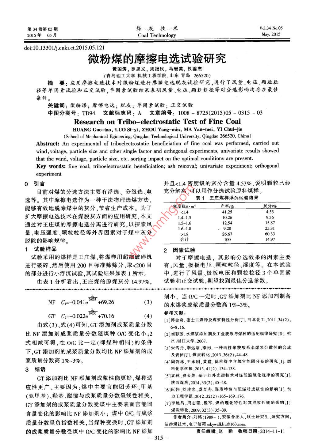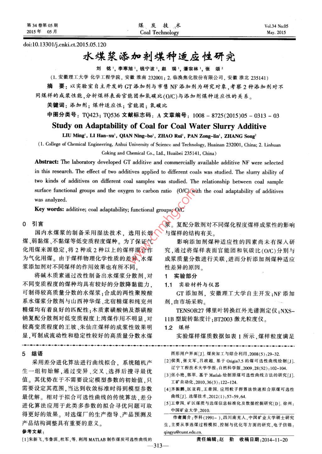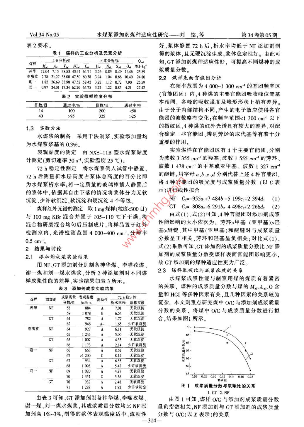 第34卷第05期煤炭技術(shù)2015年05月Coal TechnoloMay.2015doi:10.13301/ i. cnki.ct.2015.05.120水堞漿添加劑煤種適應(yīng)性研究劉銘',李寒旭,錢寧波',趙瑞',潘宗林1,張頌2(1.安徽理工大學(xué)化學(xué)工程學(xué)院,安徽淮南232001;2.臨渙焦化股份有限公司,安徽淮北235141)摘要:以實(shí)驗(yàn)室自主開發(fā)的G丌添加劑與市售NF添加劑為研究對象,考察2種添加劑對不同煤樣的成漿性能,分析煤樣表面官能團(tuán)和氧碳比(OC)與添加劑煤種適應(yīng)性的關(guān)系。關(guān)鍵詞:添加劑;煤種適應(yīng)性;官能團(tuán);氧碳比中圖分類號:TQ423;TQ536文獻(xiàn)標(biāo)志碼:A文章編號:1008-8725(2015)05-0313-03Study on Adaptability of Coal for Coal Water Slurry AdditiveLI Ming, LI Han-xu, QIAN Ning-bo, ZHAO Rui, PAN Zong-lin', ZHANG(1. College of Chemical Engineering, Anhui University of Science and Technology, Huainan 232001, China; 2.LinhuanCoking and Chemical Co, Ltd, Iluaibei 235141, China)Abstract: The laboratory developed GT additive and commercially available additive NF were selectedin this research. The effect of two additives applied to different coals was studied. The slurry ability oftwo kinds of additives on different coal samples was studied. The relationship between coal samplesurface functional groups and the oxygen to carbon ratio(O/C) with the coal adaptability of additivesKey words: additive; coal adaptability; functional groups; O/C0引言漿。復(fù)配分散劑對不同煤化程度煤樣成漿性的影響國內(nèi)水煤漿的制備采用濕法技術(shù),選用長煙與煤樣的結(jié)構(gòu)有關(guān)。煤、弱黏煤、不黏煤等低變質(zhì)程度煤種。為了保證氣影響添加劑煤種適應(yīng)性的因素尚未有深入研化用煤來源穩(wěn)定,將2種或2種以上的煤樣混合作究,通過將煤樣表面官能團(tuán)和氧碳比(OC)分別與為氣化用煤。由于煤樣物理化學(xué)性質(zhì)的差異,水煤成漿質(zhì)量分?jǐn)?shù)進(jìn)行關(guān)聯(lián),進(jìn)而分析添加劑煤種適應(yīng)漿添加劑對不同煤樣的作用效果也有所不同性差異的原因。將堿木質(zhì)素通過改性制備出水煤漿分散劑,對1實(shí)驗(yàn)部分不同變質(zhì)程度的煤種均具有較好的分散降黏能力,1.1實(shí)驗(yàn)材料與儀器可制得較高質(zhì)量分?jǐn)?shù)的水煤漿;合成的兩性聚羧酸GT添加劑,安徽理工大學(xué)自主開發(fā);NF添加系水煤漿分散劑與山西神華煤、北宿精煤和純兗州劑,由市場采購。精煤均有著良好的匹配性;木質(zhì)素磺酸鈉及萘磺酸TENSOR27傅里葉轉(zhuǎn)換紅外光譜測定儀;NXS-鈉復(fù)配分散劑對低變質(zhì)程度上灣煤作用不明顯,對1B型旋轉(zhuǎn)黏度計;BT2003激光粒度儀。較高變質(zhì)程度的王坡、朱仙莊煤樣的成漿性效果明12煤樣顯,可制成流動性和穩(wěn)定性較好的高質(zhì)量分?jǐn)?shù)水煤實(shí)驗(yàn)煤樣煤質(zhì)數(shù)據(jù)如表1所示,煤樣粒度滿足5結(jié)語圖形用戶界面[J].煤炭加工與綜合利用,2008(5):29-32采用差分進(jìn)化算法進(jìn)行曲線擬合,系統(tǒng)隨機(jī)產(chǎn)21候賽,張文軍,呂政超基于Ongm75的爆可選性曲線繪制生一組初始解,通過變異、交叉、選擇后搜尋最優(yōu)遼寧T程技術(shù)大學(xué)學(xué)報:自然科學(xué)版,2009,28(S2):102-104[3]張小艷,郭翠.基于Maab繪制原煤可選性曲線方法的研究[J.值。其優(yōu)勢在于不需要設(shè)定模型參數(shù)的初始值,只工礦自動化,2010,36(3):122-124需要設(shè)定其范圍,當(dāng)達(dá)到收斂標(biāo)準(zhǔn)時得到模型參數(shù)4]齊振鵬,匡亞莉,王章國應(yīng)用粒子群算法快速擬合原煤可選性最優(yōu)解。相對于擬合可選性曲線的傳統(tǒng)算法,差分曲線[J].選煤技術(shù),2012(1):57-59,64進(jìn)化算法應(yīng)用于此類多參數(shù)的擬合尋優(yōu)問題可取[5]王章國.礦區(qū)煤質(zhì)與選煤信息標(biāo)準(zhǔn)化及數(shù)據(jù)挖據(jù)研究[D]徐州:得更好的效果。對選煤廠的生產(chǎn)指導(dǎo)、產(chǎn)品預(yù)測及中國礦業(yè)大學(xué),2010.作者簡介:李科(1991-),四川南充人,中國礦業(yè)大學(xué)碩士研究產(chǎn)品結(jié)構(gòu)調(diào)整具有重要的意義。生,主要從事選煤過程模擬、控制與優(yōu)化等方面的研究,電子信箱參考文獻(xiàn):qingyu@cumt.edu.cn[1]朱新飛,韋魯濱,杜軍,等.利用 MATLAB制作煤炭可選性曲線的責(zé)任編輯:趙勤收稿日期:2014-11-20313Vol 34 No. 05水煤漿添加劑煤種適應(yīng)性研究—劉銘,等第34卷第05期表2要求。好,漿體靜置72h后,析水率均低于NF添加劑制表1煤樣的工業(yè)分析及元素分析得的漿體,且無硬沉淀生成,漿體穩(wěn)定性好。由此可煤樣工業(yè)分析元素分析%知,CT添加劑煤種適應(yīng)性好,可提高不同煤種的成神華1204715388340416471326089049146漿質(zhì)量分?jǐn)?shù)。李嘴孜27821.273800475060383941.040.66104024.802.2煤樣表面官能團(tuán)分析謝一1.822669339847.5258423.821.120727.902559劉一09724011734622065753221.220854212742在頻率范圍為4000~1300cm的基團(tuán)頻率區(qū)表2實(shí)驗(yàn)煤樣粒度分布(官能團(tuán)區(qū))內(nèi),4種煤的主要官能團(tuán)吸收峰位置基目數(shù)/日通過率%目數(shù)/目通過率%本相同,各峰的吸收強(qiáng)度及峰形形狀上稍有差異。由于分子內(nèi)部結(jié)構(gòu)不同,產(chǎn)生的電子效應(yīng)使得各官能團(tuán)的波數(shù)略有變化;在頻率范圍<1300cm-1以下13實(shí)驗(yàn)方法的指紋區(qū),4種煤的紅外光譜具有較大的差異,對配水煤