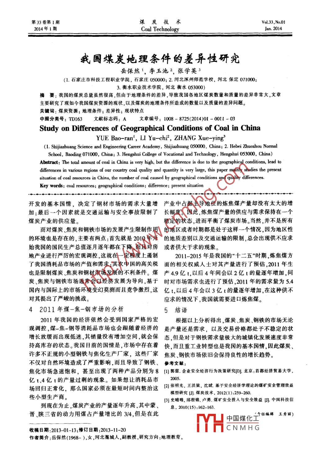 第33卷第1期煤炭技術(shù)Vvl.33,No.012014年1期Coal TechnologyJan. 2014.我國(guó)煤炭地理?xiàng)l件的差異性研究岳保然1,李玉池2,張學(xué)英3(1.石家莊市科技工程職業(yè)學(xué)院,石家莊050000; 2.河北涿州師范學(xué)校,河北保定071000;3.衡水職業(yè)技術(shù)學(xué)院,河北衡水053000)摘要:我國(guó)的煤炭總量雖然很高,但由于地理?xiàng)l件的差異,導(dǎo)致我國(guó)各地區(qū)煤炭數(shù)量和質(zhì)量的差異非常大,文章主要研究了現(xiàn)如今我國(guó)煤炭資源的現(xiàn)狀,以及煤炭的地理?xiàng)l件所造成的數(shù)量以及質(zhì)量的差異問題。關(guān)鍵詞:煤炭資源;地理?xiàng)l件;差異性;現(xiàn)狀特點(diǎn).中圖分類號(hào): TD163文獻(xiàn)標(biāo)志碼: A .文章編號(hào): 1008 - 8725<2014)01 -0011 - 03Study on Differences of Geographical Conditions of Coal in ChinaYUE Bao-ran', LI Yu-chir, ZHANG Xue -ying'(1. Shijjazhuang Science and Engineering Career Academy , Shijjazhuang 050000, China; 2. Hebei Zhuozhou NormalSchool, Baoding 071000, China; 3. Hengshui College of Vocational and Technology , Hengshui 053000 China)Abstract: The total amount of coal in China is very high, but the diference is due to the geographical conditions, lead lodifferences in various regions of our country coal quality and quantity is very large, this paper mainly studies the presentsituation of coal resources in China, the number of coal caused by geographical conditions and quality diferences.Key words: coal resources; geographical conditions; difference; present situation開發(fā)的基本國(guó)情,決定了鋼材市場(chǎng)的需求大量增產(chǎn)業(yè)中占據(jù)主導(dǎo)地位的煉焦煤產(chǎn)量卻沒有太大的增加;最后一個(gè)因素就是交通運(yùn)輸與安全事故限制了長(zhǎng)幅度。 因此,煉焦煤產(chǎn)量的供應(yīng)與需求保持在-個(gè)煤炭產(chǎn)業(yè)的供應(yīng)量。穩(wěn)定的狀態(tài),進(jìn)而平衡了煤炭市場(chǎng)。當(dāng)然,并不是所有而對(duì)煤炭、焦炭和鋼鐵市場(chǎng)的發(fā)展產(chǎn)生限制作用的地 區(qū)或者時(shí)期都是處于這樣一個(gè)情況,因?yàn)榈貐^(qū)性的環(huán)境也是存在的,主要有兩點(diǎn):首先就是2010年開的地質(zhì)差別以及交通運(yùn)輸?shù)南拗?總會(huì)出現(xiàn)供不應(yīng)求始我國(guó)的國(guó)民生產(chǎn)總值逐月逐年都在下降,而且對(duì)房或者供大于求 的現(xiàn)象。地產(chǎn)業(yè)進(jìn)行嚴(yán)厲的宏觀調(diào)控,這就在一定程度上遏制2011-2015年是我國(guó)的“十二五”時(shí)期,煉焦煤方了我國(guó)消耗品市場(chǎng)的產(chǎn)值和需求;其次中國(guó)的高關(guān)稅面的 相關(guān)權(quán)威人士對(duì)其產(chǎn)量進(jìn)行了預(yù)估,2011年生也是限制煤炭、焦炭和鋼材市場(chǎng)發(fā)展的不利條件。煤產(chǎn)4.9億t,以后4年間會(huì)以2億t的量逐年增加,同炭、焦炭與鋼鐵市場(chǎng)通常會(huì)以經(jīng)濟(jì)發(fā)展為導(dǎo)向,基于時(shí)對(duì)市場(chǎng)需求也進(jìn)行了預(yù)估,2011年的需求量為5.4國(guó)內(nèi)與國(guó)際上的市場(chǎng)環(huán)境變幻莫測(cè)而且競(jìng)爭(zhēng)激烈,這億t,以后4 年會(huì)以3億t的量逐年增加,在這種供不對(duì)其提出了嚴(yán)峻的挑戰(zhàn)。應(yīng)求的情況下,我國(guó)就需要進(jìn)口煉焦煤。4 2011年煤-焦-鋼市場(chǎng)的分析5結(jié)語(yǔ)2011年我國(guó)的經(jīng)濟(jì)依然會(huì)受到國(guó)家嚴(yán)格的宏根據(jù)以上分析得出,煤炭、焦炭、鋼鐵的市場(chǎng)無論觀調(diào)控,煤-焦-鋼等消耗品市場(chǎng)也會(huì)跟隨著經(jīng)濟(jì)的是產(chǎn) 量還是需求,以及交易價(jià)格都處于不穩(wěn)定的狀增長(zhǎng)放緩而出現(xiàn)低迷,其銷量沒有增加空間,就會(huì)保態(tài),但是對(duì)于鋼鐵需求量極大的城鎮(zhèn)化發(fā)展速度非常持高庫(kù)存的狀態(tài)。我國(guó)目前的國(guó)情是,市場(chǎng)中存在著快,而且重工業(yè)轉(zhuǎn)型也是我國(guó)的基本國(guó)情,因此煤炭、許多不正規(guī)的小型鋼鐵與焦化生產(chǎn)廠家,這些廠家焦炭、鋼鐵市場(chǎng)依舊會(huì)保持 良性的增長(zhǎng)趨勢(shì)。不僅對(duì)自然環(huán)境造成了嚴(yán)重影響,而且導(dǎo)致了鋼鐵、參考文獻(xiàn):焦化市場(chǎng)急速飽和,甚至出現(xiàn)了兩種產(chǎn)品分別為8 [1] 郭雷.企業(yè)安全經(jīng)濟(jì)行為決策研究[D].北京:首都經(jīng)濟(jì)貿(mào)易大學(xué),化億t、4億↑的產(chǎn)量過剩的現(xiàn)象。如果想讓消耗品市[2]張明光,王洪梁,沈斌基于安全經(jīng)濟(jì)學(xué)理論的煤礦安全管理效益場(chǎng)回歸正?;?那么國(guó)家必須在最短時(shí)間內(nèi)整治這模型研究u.煤炭技術(shù),2012(1):259 -260.些小型生產(chǎn)商。[3]史晴晴,邱程錦,盧勇.煤礦安全投入與安全效益[I. 中國(guó)科技信到現(xiàn)在為止,煤炭產(chǎn)業(yè)的產(chǎn)量逐年升高,其中蒙、息, 2010(15);162-163.晉、陜?nèi)〉膭?dòng)力用煤占產(chǎn)量增比的3/4,但是在此it任編樣 王秀麗)中國(guó)煤化工收稿日期:2013- 01-13;修訂日期:2013-11-20MHCNMHG作者簡(jiǎn)介:岳保然(1968- ),女,河北藁城人,副教授.研究方向:地理教育。.12.炭“技術(shù)第33卷區(qū)內(nèi)部來看,煤炭的分布也是很不協(xié)調(diào)的,以華東地0引言中國(guó)煤炭產(chǎn)業(yè)在國(guó)際上的地位是非常高的,我國(guó)區(qū)為例,工業(yè)主