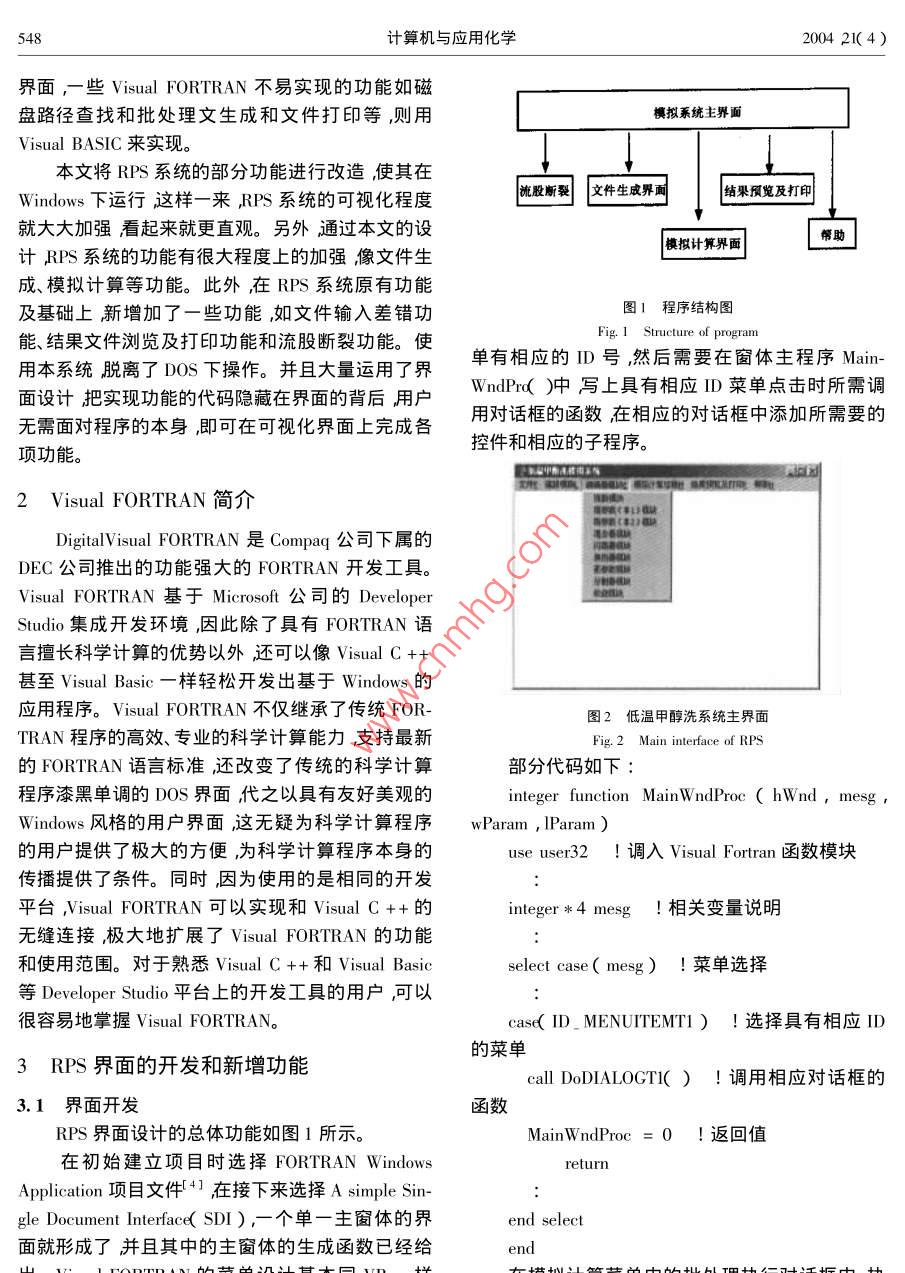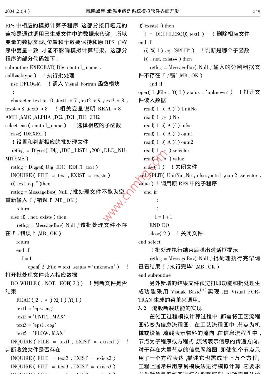 第21卷第4期計算機與應(yīng)用化學(xué)Vol. 21, No 42004年7月28日Computers and Applied ChemistryJuly 2004低溫甲醇洗系統(tǒng)模擬軟件界面開發(fā)陳曉峰,張述偉,曲平大連理工大學(xué)化工工藝系,遼寧,大連,116012)摘要:結(jié)合低溫甲醇洗模擬系統(tǒng)(RS〕旳功能用 Visual FORTRAN成功開發(fā)了低溫甲醇洗模擬系統(tǒng)軟件的界面。針對原RⅣS模擬系統(tǒng)中存在操作不方便專業(yè)性強不容易理解而且模擬計算過程復(fù)雜等問題對其進行改進本軟件新増了數(shù)據(jù)査錯、結(jié)果文件打印預(yù)覽和流股斷裂等功能軟件穩(wěn)定運行在 Windows系統(tǒng)下并對低溫甲醇洗進行模擬分析關(guān)鍵詞: Visual FORTRAN;低溫甲醇洗工藝;模擬;界面中圖分類號:TQO18文獻標(biāo)識碼:A文章編號:10014160(2004)4547551Interface designing of rectisol process simulatorCHEN XiaoFeng, ZHANG ShuWei and QU PingDepartment of Chemical Engineering Dalian University of Technology Dalian, 116012, Liaoning, ChinaAbstract: Novel simulation interfaces of RPS were developed with Visual FORTRAN language to improve some shortcoming of RPSsuch as inconvenient operations strong specialties, difficult comprehends, complicated algorithms in calculation process and so onThe software has a perfect wrong-checking function enhances functions of previewing and printing of the calculation results and adds anew algorithm of finding an optimal set of tear streams. The software can run stably based on windows system and simulate RectisolKey words: Visual FORTRAN, rectisol process simulation interfaceChen XF, Zhang SW and Qu P. Interface designing of rectisol process simulator. Computers and Applied Chemis-try,2004,21(4)547-5511前言單元設(shè)備的模擬。系統(tǒng)提供通用的輸入輸岀模塊,并采用菜單驅(qū)動方式,為用戶提供了人機界面但是低溫甲醇洗凈化法是一種原料氣凈化法通過如數(shù)據(jù)文件編輯部分結(jié)果文件瀏覽程序執(zhí)行等系此方法以制取合成氨使用的高純度氫。大連理工大學(xué)化工學(xué)院從1983年開始就從事低溫甲醇洗裝統(tǒng)功能部分不但麻煩而且容易岀錯不十分了解這個系統(tǒng)的人很難操縱系統(tǒng)。所以改造該系統(tǒng)的部分置模擬分析優(yōu)化研究工作于1993年成功地開發(fā)了功能就顯得很重要?!ǖ蜏丶状枷囱b置模擬系統(tǒng)(RPS: Rectisol processRPS軟件原是在DOS系統(tǒng)下開發(fā)的程序,在Simulator",以后又對此軟件不斷完善,形成了Windows系統(tǒng)下操作存在諸多不便本文擬將其改〃RPS95版”和RPS'96版”。軟件中熱力學(xué)模型造為 Windows下運行。在許多文獻中都是使用Ⅴi采用馬丁-候狀態(tài)方程和L-K狀態(tài)方程相結(jié)合, I Basic開發(fā)DOs程序的 Windows用戶界面231,部分氣液平衡數(shù)據(jù)采用浙江大學(xué)提供的實驗數(shù)據(jù)為了避免DOS應(yīng)用程序在 Windows下運行時出下通過回歸求得二元交互作用參數(shù)。用此軟件先后對的黑屏現(xiàn)象在接口連接的時候需要根據(jù)不同的子多套低溫甲醇洗裝置進行模擬分析提出了一系列程序生成相應(yīng)的DL文件由于RPS中需要的子程改進操作和對裝置進行改造的建議被廠家采用后,序很多而且有些還互相嵌套在接口連接的時候與取得較滿意結(jié)果。操作系統(tǒng)的兼容型不是很好經(jīng)常岀現(xiàn)內(nèi)存不可讀RPS的開發(fā)旨在為工程師提供一個能進行低溫或?qū)懼惖腻e誤提示。而Ⅴ isual FOrtraN兼容甲醇洗工藝流程模擬計算的有力工具山。RPS模擬 FORTRAN語言,并提供了 Windows風(fēng)格的界面設(shè)系統(tǒng)既可以進行甲醇洗全流程模擬也可以進行有關(guān)計所以本文采用Ⅴ isual FOrtraN來開發(fā)RPS的收稿日期:2003-1101;修回日期:20040225計算機與應(yīng)用化學(xué)200421(4)界面,一些 Visual FOrtran不易實現(xiàn)的功能如磁盤路徑查找和批處理文生成和文件打印等則用模擬系統(tǒng)主界面Ⅴ isual basic來實現(xiàn)本文將RPS系統(tǒng)的部分功能進行改造使其在Windows下運行這樣一來RS系統(tǒng)的可視化程度流股斷裂文件生成界面結(jié)果預(yù)覽及打印就大大加強看起來就更直觀。另外通過本文的設(shè)模擬計算界面幫計RPS系統(tǒng)的功能有很大程度上的加強像文件生成、模擬計算等功能。此外在RPS系統(tǒng)原有功能及基礎(chǔ)上新增加了一些功能,如文件輸入差錯功圖1程序結(jié)構(gòu)圖能、結(jié)果文件瀏覽及打印功能和流股斷裂功能。使Fig 1 Structure of program用本系統(tǒng)脫離了DOS下操作。并且大量運用了界單有相應(yīng)的ID號然后需要在窗體主程序Main面設(shè)計把實現(xiàn)功能的代碼隱藏在界面的背后用戶WndPrd)中寫上具有相應(yīng)I菜單點擊時所需調(diào)無需面對程序的本身即可在可視化界面上完成各用對話框的函數(shù)在相應(yīng)的對話框中添加所需要的項功能控件和相應(yīng)的子程序。甲PA君2Ⅴ isual fortran簡介DigitaⅤ isual Fortran是 Compac公司下屬的DEC公司推出的功能強大的 FORTRAN開發(fā)工具。Visual FORtRaN基于 Microsoft公司的 DeveloperStudio集成開發(fā)環(huán)境因此除了具有 FORTRAN語言擅長科學(xué)計算的優(yōu)勢以外還可以像Ⅴ isual c++甚至 Visual basic一樣輕松開發(fā)出基于 Windows的應(yīng)用程序。 Visual Fortran不僅繼承了傳統(tǒng)FOR圖2低溫甲醇洗系統(tǒng)主界面TRAN程序的高效專業(yè)的科學(xué)計算能力支持最新Fig 2 Main interface of RPS的 FORTRAN語言標(biā