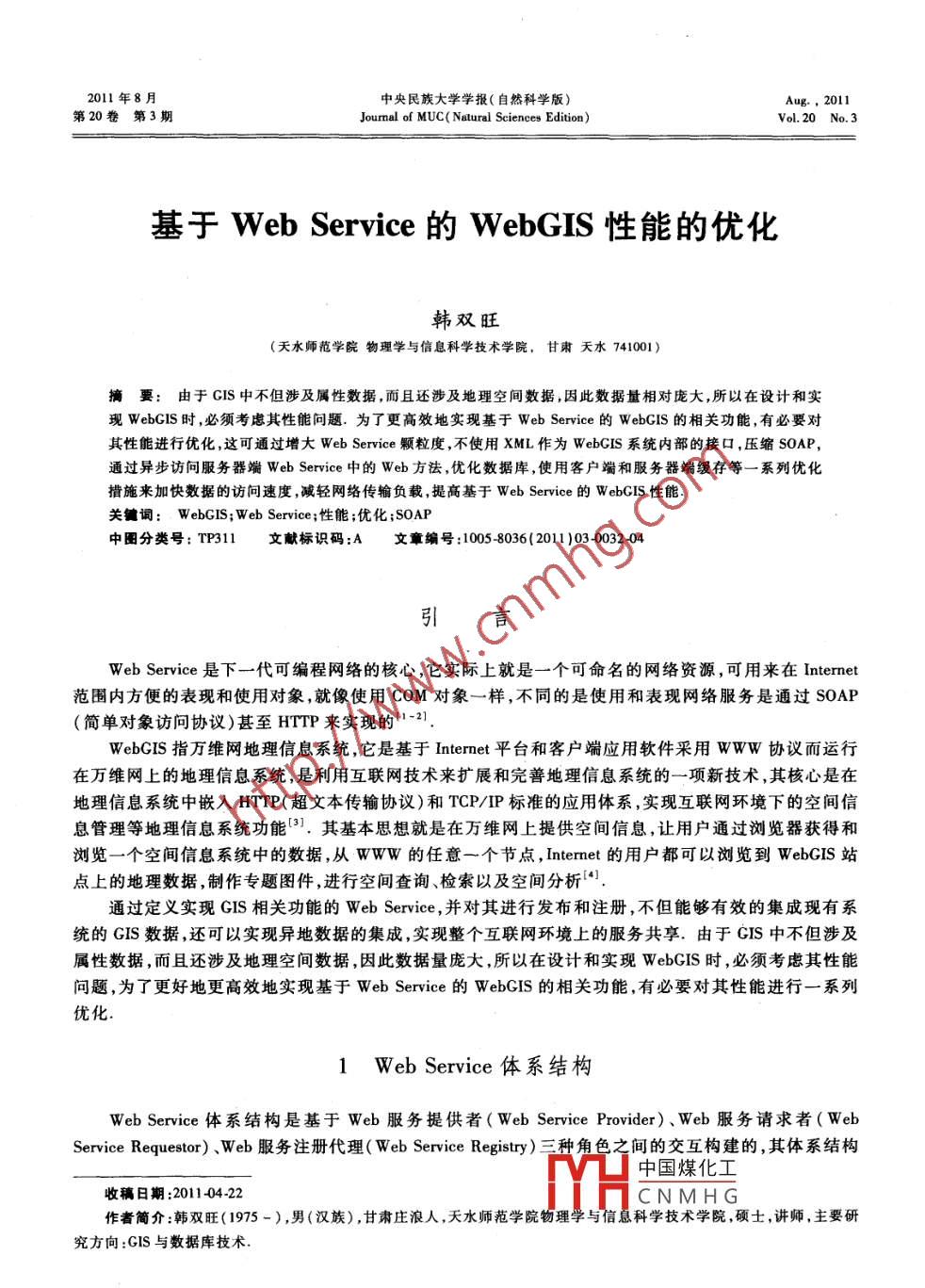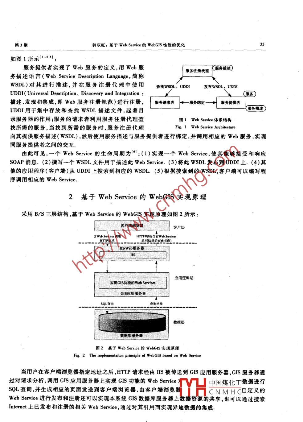 2011年8月中央民族大學(xué)學(xué)報(bào)(自然科學(xué)版)Aug.. 2011第20卷第3期Journal of MUC( Nalural Sciences Edition)Vol.20 No. 3基于WebService的WebGIS性能的優(yōu)化韓雙旺(天水師范學(xué)院物理學(xué)與信息科學(xué)技術(shù)學(xué)院,甘肅天水741001)摘要:由于CIS中不但涉及屬性數(shù)據(jù),而且還涉及地理空間數(shù)據(jù),因此數(shù)據(jù)址相對龐大,所以在設(shè)計(jì)和實(shí)現(xiàn)WebGIS時(shí),必須考慮其性能問題.為了更高效地實(shí)現(xiàn)基于Web Service 的WebGIS的相關(guān)功能,有必要對其性能進(jìn)行優(yōu)化,這可通過增大WebService顆粒度,不使用XML作為WebGIS系統(tǒng)內(nèi)部的接口,壓縮SOAP,通過異步訪問服務(wù)器端Web Service中的Web方法,優(yōu)化數(shù)據(jù)庫,使用客戶端和服務(wù)器端緩存等- -系列優(yōu)化措施來加快數(shù)據(jù)的訪問速度,臧輕網(wǎng)絡(luò)傳輸負(fù)載,提高基于WebService的WebCIS性能.關(guān)鍵詞: WebGIS; Web Service ;性能;優(yōu)化;SOAP中圈分類號: TP311文獻(xiàn)標(biāo)識碼:A .文章編號:1005 8036(2011 )03-0032-04引言Web Service是下一代可編程網(wǎng)絡(luò)的核心,它實(shí)際上就是一個(gè)可命名的網(wǎng)絡(luò)資源,可用來在Internet范圍內(nèi)方便的表現(xiàn)和使用對象,就像使用COM對象--樣,不同的是使用和表現(xiàn)網(wǎng)絡(luò)服務(wù)是通過SOAP(簡單對象訪問協(xié)議)甚至HTTP來實(shí)現(xiàn)的「1-21.WebGIS指萬維網(wǎng)地理信息系統(tǒng),它是基于Internet平臺和客戶端應(yīng)用軟件采用www協(xié)議而運(yùn)行在萬維網(wǎng)上的地理信息系統(tǒng),是利用互聯(lián)網(wǎng)技術(shù)來擴(kuò)展和完善地理信息系統(tǒng)的一項(xiàng)新技術(shù),其核心是在地理信息系統(tǒng)中嵌入HTTP(超文本傳輸協(xié)議)和TCP/IP標(biāo)準(zhǔn)的應(yīng)用體系,實(shí)現(xiàn)互聯(lián)網(wǎng)環(huán)境下的空間信息管理等地理信息系統(tǒng)功能["1.其基本思想就是在萬維網(wǎng)上提供空間信息,讓用戶通過瀏覽器獲得和瀏覽-一個(gè)空間信息系統(tǒng)中的數(shù)據(jù),從www的任意一個(gè)節(jié)點(diǎn),Internet的用戶都可以瀏覽到WebGIS站點(diǎn)上的地理數(shù)據(jù),制作專題圖件,進(jìn)行空間查詢、檢索以及空間分析[4].通過定義實(shí)現(xiàn)GIS相關(guān)功能的WebService,并對其進(jìn)行發(fā)布和注冊,不但能夠有效的集成現(xiàn)有系.統(tǒng)的GIS數(shù)據(jù),還可以實(shí)現(xiàn)異地?cái)?shù)據(jù)的集成,實(shí)現(xiàn)整個(gè)互聯(lián)網(wǎng)環(huán)境上的服務(wù)共享.由于GIS中不但涉及屬性數(shù)據(jù),而且還涉及地理空間數(shù)據(jù),因此數(shù)據(jù)量龐大,所以在設(shè)計(jì)和實(shí)現(xiàn)WebGIS時(shí),必須考慮其性能問題,為了更好地更高效地實(shí)現(xiàn)基于WebService的WebGIS的相關(guān)功能,有必要對其性能進(jìn)行一系列優(yōu)化.WebService體系結(jié)構(gòu)WebService體系結(jié)構(gòu)是基于Web服務(wù)提供者(WebServiceProvider)、Web服務(wù)請求者(WebServiceRequestor).Web服務(wù)注冊代理(webServiceRegistry)三種角色之間的交互構(gòu)建的,其體系結(jié)構(gòu)中國煤化工收稿日期:201104-22YHCNMH G作者簡介:韓雙旺(1975 -) ,男(漢族) ,甘肅莊浪人,天水師范學(xué)院物理學(xué)與信息科學(xué)技術(shù)學(xué)院,碩士,講師,主要研究方向:GIS與數(shù)據(jù)庫技術(shù).第3期韓雙旺:基于Web Serice的WebGIS性能的優(yōu)化33如圖1所示1-2,5):服務(wù)提供者實(shí)現(xiàn)了Web服務(wù)的定義,用Web服服務(wù)注冊代理1(服務(wù)播述)務(wù)描述語言( Web Service Description Language, 簡稱WSDL)對其進(jìn)行描述,并在服務(wù)注冊代理中使用查找WSDL, UDDI發(fā)布WSDL,UDDIUDDI( Universal Description, Discovery and Integration :(服務(wù))描述、發(fā)現(xiàn)和集成,即Web服務(wù)注冊規(guī)范)進(jìn)行注冊,服務(wù)謗求者4服務(wù)綁定一十服務(wù)提供者UDDI用于集中存放和查找WSDL描述文件,起著目服務(wù)描述)錄服務(wù)器的作用;服務(wù)的請求者利用服務(wù)注冊代理查圖1 web Serice體系結(jié)構(gòu)找所需的服務(wù),當(dāng)找到所需的服務(wù)時(shí),服務(wù)注冊代理Fig.1 Web Srice Architecture向其提供服務(wù)描述(WSDL),然后使用服務(wù)描述與服務(wù)提供者進(jìn)行綁定,并調(diào)用相應(yīng)的Web服務(wù),實(shí)現(xiàn):同服務(wù)提供者之間的交互.由此可見,一個(gè)Web Service的生命周期為6):(1)實(shí)現(xiàn)一個(gè)Web Service ,使其能夠接受和響應(yīng)SOAP消息. (2)撰寫一個(gè)WSDL文件用于描述此Web Service. (3) 將此WSDL發(fā)布到UDDI上. (4)其他的應(yīng)用程序(客戶端)從UDDI上搜索到相應(yīng)的WSDL. (5) 根據(jù)搜索到的WSDL,客戶端可以編寫程序調(diào)用相應(yīng)的WebService.2基于WebService的WebGIS實(shí)現(xiàn)原理采用B/S三層結(jié)構(gòu),基于Web Service的WebGIS實(shí)現(xiàn)原理如圖2所示:?客戶端河覽器客戶層.含Web Services調(diào)HHTTP響座(含有Web ServicesHTTP請來返國結(jié)果的Weh虹面)IIS/Web服務(wù)器11應(yīng)用邏輯層實(shí)現(xiàn)GIS功能的Web ServicesGIS應(yīng)用服務(wù)器SQL查詢查詢結(jié)果數(shù)據(jù)層數(shù)據(jù)庫服務(wù)器圖2基于 Web Service的WebGIS實(shí)現(xiàn)原理Fig.2 The implementaiton prineiple of WebGIS based on Web Service當(dāng)用戶在客戶端瀏覽器