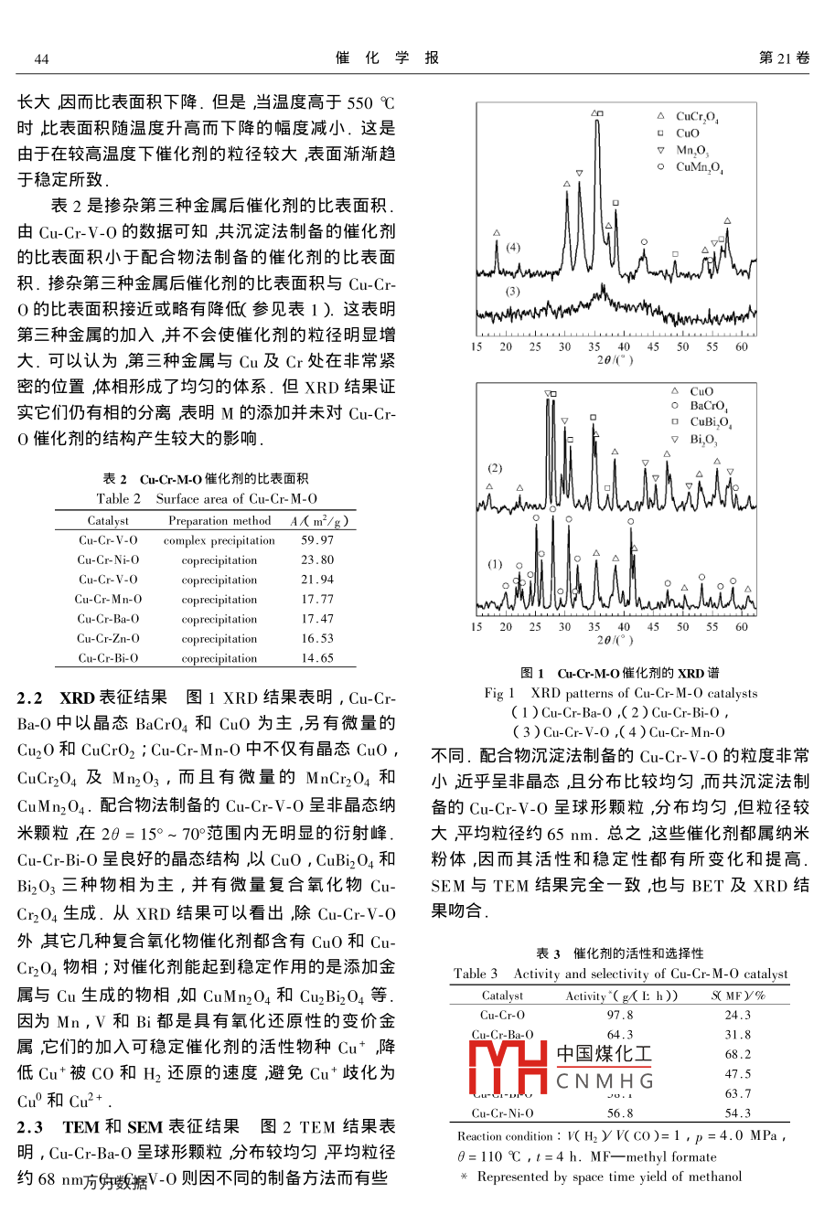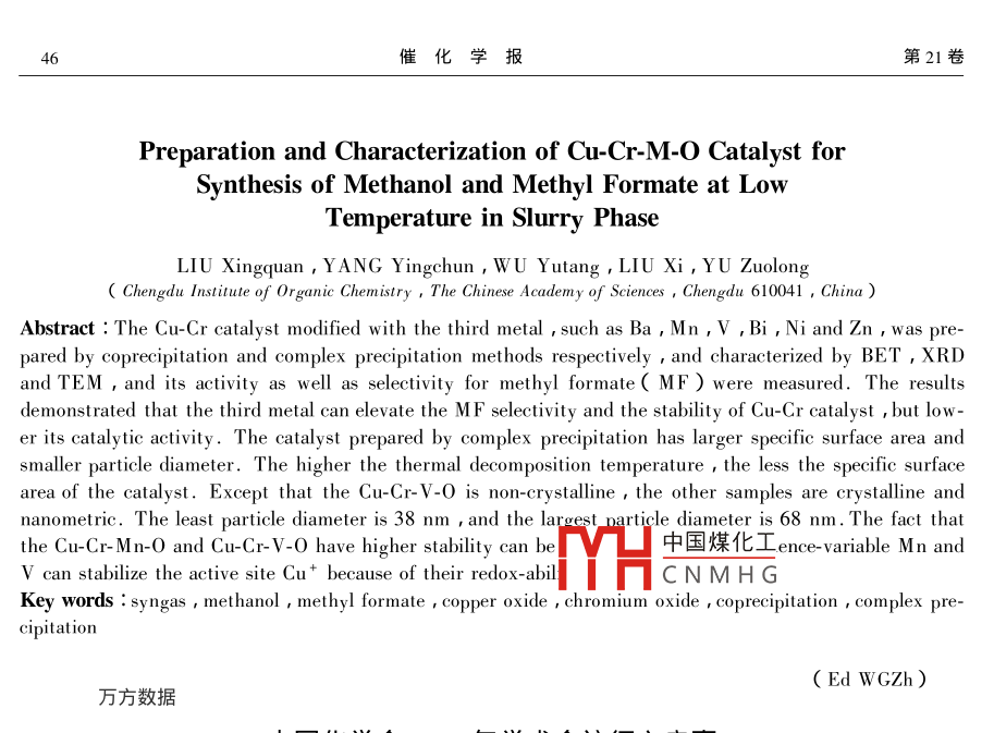 低溫液相合成甲醇及甲酸甲酯用Cu-Cr-M-O催化劑的制備與表征