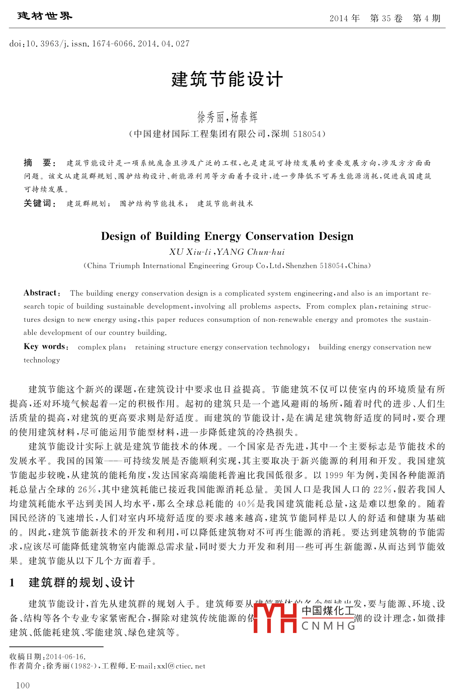 建材世界2014年第35卷第4期doi:10.3963/j.isn.1674-6066.2014.04.027建筑節(jié)能設(shè)計(jì)徐秀麗,楊春輝(中國(guó)建材國(guó)際工程集團(tuán)有限公司,深圳518054)摘要:建筑節(jié)能設(shè)計(jì)是一項(xiàng)系統(tǒng)龐雜且涉及廣泛的工程,也是建筑可持續(xù)發(fā)展的重要發(fā)展方向,涉及方方面面問(wèn)題。該文從建筑群規(guī)劃、國(guó)護(hù)結(jié)構(gòu)設(shè)計(jì)、新能源利用等方面著手設(shè)計(jì),進(jìn)一步降低不可再生能源消耗,促進(jìn)我囯建筑可持續(xù)發(fā)展。關(guān)鍵詞:建筑群規(guī)劃;圍護(hù)結(jié)構(gòu)節(jié)能技術(shù);建筑節(jié)能新技術(shù)Design of Building Energy Conservation DesignXU Xiu-liYANG Chunh(China Triumph International Engineering Group Co, Ltd, Shenzhen 518054, ChinaAbstract: The building energy conservation design is a complicated system engineering, and also is an important re-rch topic of building sustainable development, involving all problems aspects. From complex plan, retaining structures design to new energy using, this paper reduces consumption of non-renewable energy and promotes the sustaiable development of our country buildingKey words: complex plan: retaining structure energy conservation technology; building energy conservation new建筑節(jié)能這個(gè)新興的課題,在建筑設(shè)計(jì)中要求也日益提高。節(jié)能建筑不僅可以使室內(nèi)的環(huán)境質(zhì)量有所提高,還對(duì)環(huán)境氣候起著一定的積極作用。起初的建筑只是一個(gè)遮風(fēng)避雨的場(chǎng)所,隨著時(shí)代的進(jìn)步、人們生活質(zhì)量的提高,對(duì)建筑的更高要求則是舒適度。而建筑的節(jié)能設(shè)計(jì),是在滿(mǎn)足建筑物舒適度的同時(shí),要合理的使用建筑材料,盡可能運(yùn)用節(jié)能型材料,進(jìn)一步降低建筑的冷熱損失。建筑節(jié)能設(shè)計(jì)實(shí)際上就是建筑節(jié)能技術(shù)的體現(xiàn)。一個(gè)國(guó)家是否先進(jìn),其中一個(gè)主要標(biāo)志是節(jié)能技術(shù)的發(fā)展水平。我國(guó)的國(guó)策—可持續(xù)發(fā)展是否能順利實(shí)現(xiàn),其主要取決于新興能源的利用和開(kāi)發(fā)。我國(guó)建筑節(jié)能起步較晩,從建筑的能耗角度,發(fā)達(dá)國(guó)家髙端能耗普遍比我國(guó)低很多。以1999年為例,美國(guó)各種能源消耗總量占全球的26%,其中建筑耗能已接近我國(guó)能源消耗總量。美國(guó)人口是我國(guó)人口的22%,假若我國(guó)人均建筑耗能水平達(dá)到美國(guó)人均水平,那么全球總耗能的40%是我國(guó)建筑能耗總量,這是難以想象的。隨著國(guó)民經(jīng)濟(jì)的飛速增長(zhǎng),人們對(duì)室內(nèi)環(huán)境舒適度的要求越來(lái)越高,建筑節(jié)能同樣是以人的舒適和健康為基礎(chǔ)因此,建筑節(jié)能新技術(shù)的開(kāi)發(fā)和利用,可以降低建筑物對(duì)不可再生能源的消耗。要達(dá)到建筑物的節(jié)能需求,應(yīng)該盡可能降低建筑物室內(nèi)能源總需求量,同時(shí)要大力開(kāi)發(fā)和利用一些可再生新能源,從而達(dá)到節(jié)能效果。建筑節(jié)能從以下幾個(gè)方面著手1建筑群的規(guī)劃、設(shè)計(jì)建筑節(jié)能設(shè)計(jì),首先從建筑群的規(guī)劃入手。建筑師要從上今中發(fā),要與能源、環(huán)境、設(shè)備、結(jié)構(gòu)等各個(gè)專(zhuān)業(yè)專(zhuān)家緊密配合,摒除對(duì)建筑傳統(tǒng)能源的亻中國(guó)煤化工CNMHG潮的設(shè)計(jì)理念,如微排建筑、低能耗建筑、零能建筑、綠色建筑等收稿日期:2014-06-16作者簡(jiǎn)介:徐秀麗(1982-),工程師.E-mail:xxl(@chief.net100建材世界2014年第35卷第4期在過(guò)去的建筑規(guī)劃設(shè)計(jì)方案中,建筑師注重的只是建筑的容積率以及各建筑間的間距是否滿(mǎn)足日照要求,整個(gè)建筑群的空間形態(tài)以及建筑物與地理環(huán)境是否協(xié)調(diào),卻很少考慮建筑物是否節(jié)能,建筑材料是否使用環(huán)保材料。而節(jié)能環(huán)保意識(shí)只是在建筑單體的設(shè)計(jì)階段才被重視,這就出現(xiàn)了一些單體建筑很難解決的問(wèn)題在節(jié)能設(shè)計(jì)中,首先是合理選址、合理利用自然環(huán)境。根據(jù)建筑群體周?chē)臍夂驐l件,結(jié)合建筑物本體所在的氣候環(huán)境特點(diǎn),在設(shè)計(jì)過(guò)程中,要著重考慮利用地勢(shì)和周邊地理環(huán)境塑造出良好的建筑室內(nèi)微氣候這樣可以減少使用建筑材料?,F(xiàn)代眾多行業(yè)中,一些住宅投資方要求最大限度的利用土地,爭(zhēng)取更高的投資回報(bào),要求設(shè)計(jì)師把地塊按照最大的容積率布置整個(gè)用地,這種最大容積率布置會(huì)使住宅的舒適度降低,通風(fēng)不好,尤其是在夏季。住宅房間內(nèi)部聚積的熱量很難散失,只能采取措施降溫,極大的增加建筑物的耗能當(dāng)前的許多住宅為了建筑造型犧牲了內(nèi)部功能,窗戶(hù)面積開(kāi)的過(guò)大,增加了冷熱損失,嚴(yán)重影響了建筑物的通風(fēng)和隔熱。這些不良影響都是由于在設(shè)計(jì)中忽略了通風(fēng)所致設(shè)計(jì)建筑時(shí),整體建筑的體量和朝向是合理設(shè)計(jì)應(yīng)該把握的主要方向。合理的建筑體形不僅可以獲得良好的室內(nèi)微環(huán)境,還可以降低能耗。因此,我國(guó)標(biāo)準(zhǔn)規(guī)范也規(guī)定了建