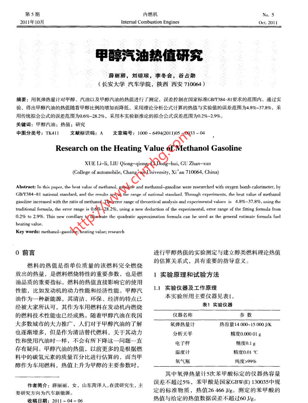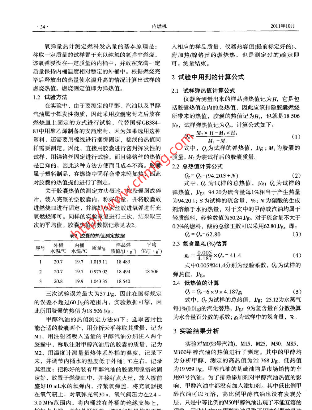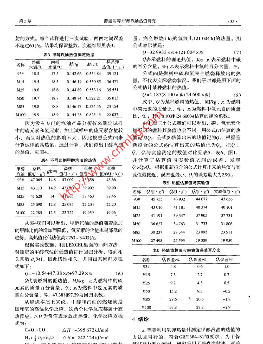 第5期內(nèi)燃機201 1年10月Intermal Combustion EnginesOct. 2011甲醇汽油熱值研究薛麗麗,劉瓊瓊,李冬會,谷占勛(長安大學(xué)汽車學(xué)院,陜西西安710064 )摘要:用氧彈熱量計對甲醇、汽油以及甲醇汽油的熱值進(jìn)行了測定,誤差控制在國家標(biāo)準(zhǔn)GB/T384 -81要求的范圍內(nèi)。通過實驗,得出甲醇汽油的熱值隨著甲醇比例的增加而降低。采用理論分析公式計算的熱值與實驗值的誤差范圍為4.8%~37.8%,采用傳統(tǒng)擬合公式的誤差范圍為0.6%- 28.2%,采用本實驗新推論的擬合公式誤差范圍為0.2%- -2.9%。關(guān)鍵詞:甲醇汽油;熱值;研究中圖分類號: TK411文獻(xiàn)標(biāo)識碼: A文章編號: 1000 - 6494(2011)05 - 0033 - 04Research on the Heating Value of Methanol GasolineXUE Li-li, LIU Qiong -qiong, LI Dong- -hui, GU Zhan-xun(College of automobile, Chang' an University, Xi 'an 710064, China)Abstract: In this paper, the heat value of methanol, gasoline and methanol-gasoline were researched with oxygen bomb calorimeter, byGB/T384 -81 national standard, and the results are in the range of national standard. Through experiments, the heat value of methanolgasoline increased with the ratio of methanol. The error range of theoretical analysis and experimental valucs is 4.8%~37.8%, using thetraditional formula, the error range is 0.6%~28.2%, using a new deduction of the experimental, error range of the fiing formula from0.2% to 2.9%. This new corollary to ilustrate the quadratic approximation formula can be used as the general estimate fornula fuelheating value.Key words: methanol-gasoline; heating value; research0前言進(jìn)行甲醇熱值的實驗測定與建立醇類燃料理論熱值燃料的熱值是指單位質(zhì)量的該燃料完全燃燒的估算關(guān)系式,具有重要的指導(dǎo)意義。放出的熱量,是燃料燃燒特性的重要參數(shù),也是燃1實驗原理和試驗方法油品質(zhì)的重要指標(biāo)。燃料的熱值直接影響它的使用1.1 實驗儀器及工作原理性能,比如發(fā)動機的動力性能和經(jīng)濟性能。甲醇汽油作為一種新能源,其清潔、環(huán)保、經(jīng)濟的特點已本實驗所用主要儀器見表1。表1實驗儀器經(jīng)被大家所認(rèn)可,其作為車用燃料在發(fā)動機內(nèi)燃燒的燃料技術(shù)性能也已經(jīng)成熟。隨著甲醇汽油在我國儀器名稱參數(shù)大多數(shù)城市的大力推廣,人們對于甲醇汽油的了解氧彈熱量計熱容量14000~15000 JK也逐漸增多,但是作為清潔替代燃料,關(guān)于其動力分析天平精度0.001 g性和使用汽油時一樣,不會有所下降這一-問題- - 直電子秤精度0.1g .存有疑問。甲醇汽油的熱值,以前更多的是根據(jù)燃溫度計精度0.01 C料中的碳?xì)湓氐馁|(zhì)量百分比進(jìn)行估算的,而當(dāng)甲氧氣瓶純度>99%醇作為車用燃料,熱值上升為甲醇的主要參數(shù)時,其中氧彈熱量計5次苯甲酸標(biāo)定的儀器熱容量作者簡介:薛麗麗,女,山東菏澤人,在讀研究生,主誤差不超過5%,苯甲酸是國家GBW(E) 130035中規(guī)定的標(biāo)準(zhǔn)物質(zhì),熱值26466J/g。測定的苯甲酸的要研究方向為汽車新能源。熱值與給定的熱值數(shù)據(jù)誤差不超過60 J/g。收稿日期: 2011-04- 06.內(nèi)燃機2011年10月氧彈量熱計測定燃料發(fā)熱量的基本原理是:入相應(yīng)的樣品質(zhì)量、儀器熱容值(提前標(biāo)定好的)、稱取一定質(zhì)量的試樣置于充以純氧的氧彈中燃燒,附加熱(鎳鉻絲的燃燒熱,也是測定過的)確定即該氧彈浸沒在一定質(zhì)量的內(nèi)桶中,并放在充滿-一定可。測量結(jié)束。質(zhì)量保持內(nèi)桶溫度相對穩(wěn)定的外桶中。根據(jù)燃燒完畢后釋放出的熱量使水溫升高的情況計算出試樣的2試驗中用到的計算公式燃燒熱值。燃燒測定值即為彈熱值。2.1試樣彈熱值計算 公式1.2 試驗方法儀器所測量出來的樣品彈熱值記為H,它是包在實驗中,由于要測定的甲醇、汽油以及甲醇括膠囊熱值在內(nèi)的總熱值,因此應(yīng)該扣除膠囊燃燒汽油屬于揮發(fā)性物質(zhì),因此采用膠囊密封之后放在所帶來的熱值,膠囊的熱值記為H,也就是18 506燃燒皿上固定的方式進(jìn)行試驗,代替國標(biāo)CB384-J/g,試樣彈熱值記為Qo,計算公式如下:81中用聚乙烯制備的安瓿密封,因為如果選用這種o_= M.XH-M.XH(1)塑料,還需要用棉線進(jìn)行捆綁固定,棉線的熱值同M2 -M樣需要測定。因此,直接用膠囊進(jìn)行密封揮發(fā)性的式中,Q2為試樣的彈熱值,J/g ; M,為膠囊的試樣,用鎳鉻絲固定進(jìn)行試驗,而且鎳鉻絲的熱值質(zhì)量, M2為裝試樣后的膠囊質(zhì)量。是已知的,因此這種方法方便而且成本不高。膠囊2.2總熱值計算公式屬于塑料制品,在燃燒中同樣會帶來附加熱,因此Qz= l-(94.20S +N)(2)對膠囊的熱值提前進(jìn)行了測定。式中,Q2為試樣的總熱值,J/g; Q。為試樣的關(guān)于膠囊熱值的測定方法概述:把膠囊掰成碎彈熱值,J/g; 94.20為硫含 量每1%相當(dāng)于產(chǎn)生熱量片,裝人完整的空膠囊內(nèi),稱好質(zhì)量,并將膠囊放為94.20J; S為試樣的硫含量,%; N為硝酸的生成進(jìn)燃燒皿進(jìn)行固定,并綁好點火絲放進(jìn)氧彈進(jìn)行充劑溶解于水的熱量,對于文中的甲醇或汽油均屬于氧燃燒即可。同樣的實驗重復(fù)進(jìn)行三次,結(jié)果取三輕質(zhì)燃料,經(jīng)驗數(shù)值為50.24 Jlg。對于硫含量不大于次的平均值。膠囊熱值的數(shù)據(jù)記錄見表2。0.2%的燃料,酸的總修正數(shù)可以采用62.80J/g,即:表2膠囊的熱值測定數(shù)據(jù)Qz= Q