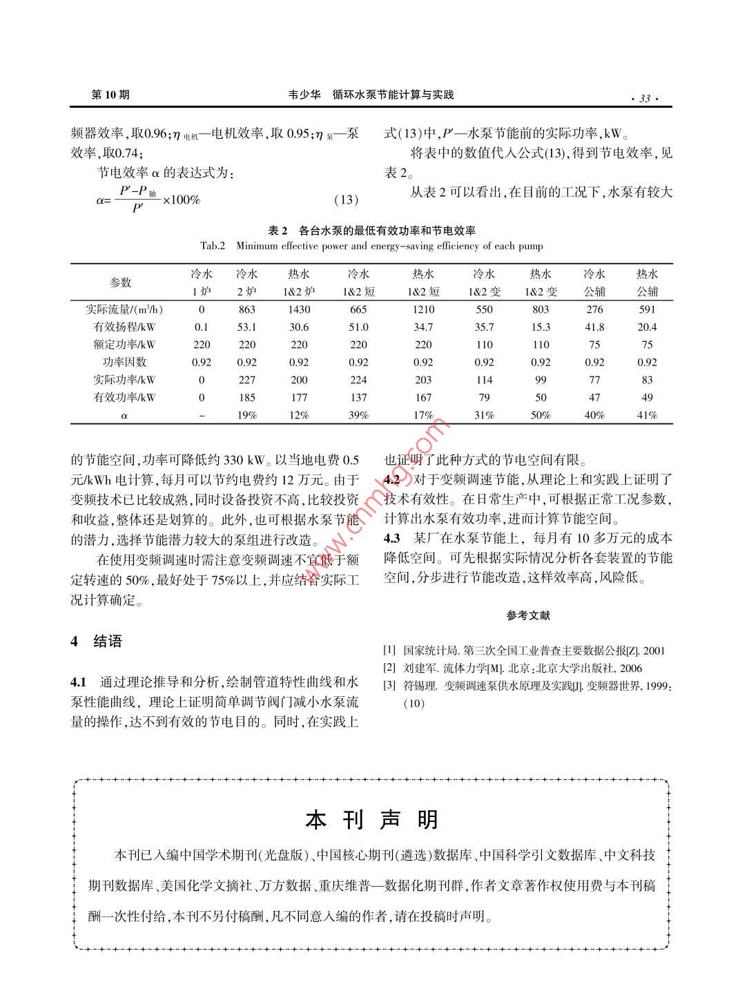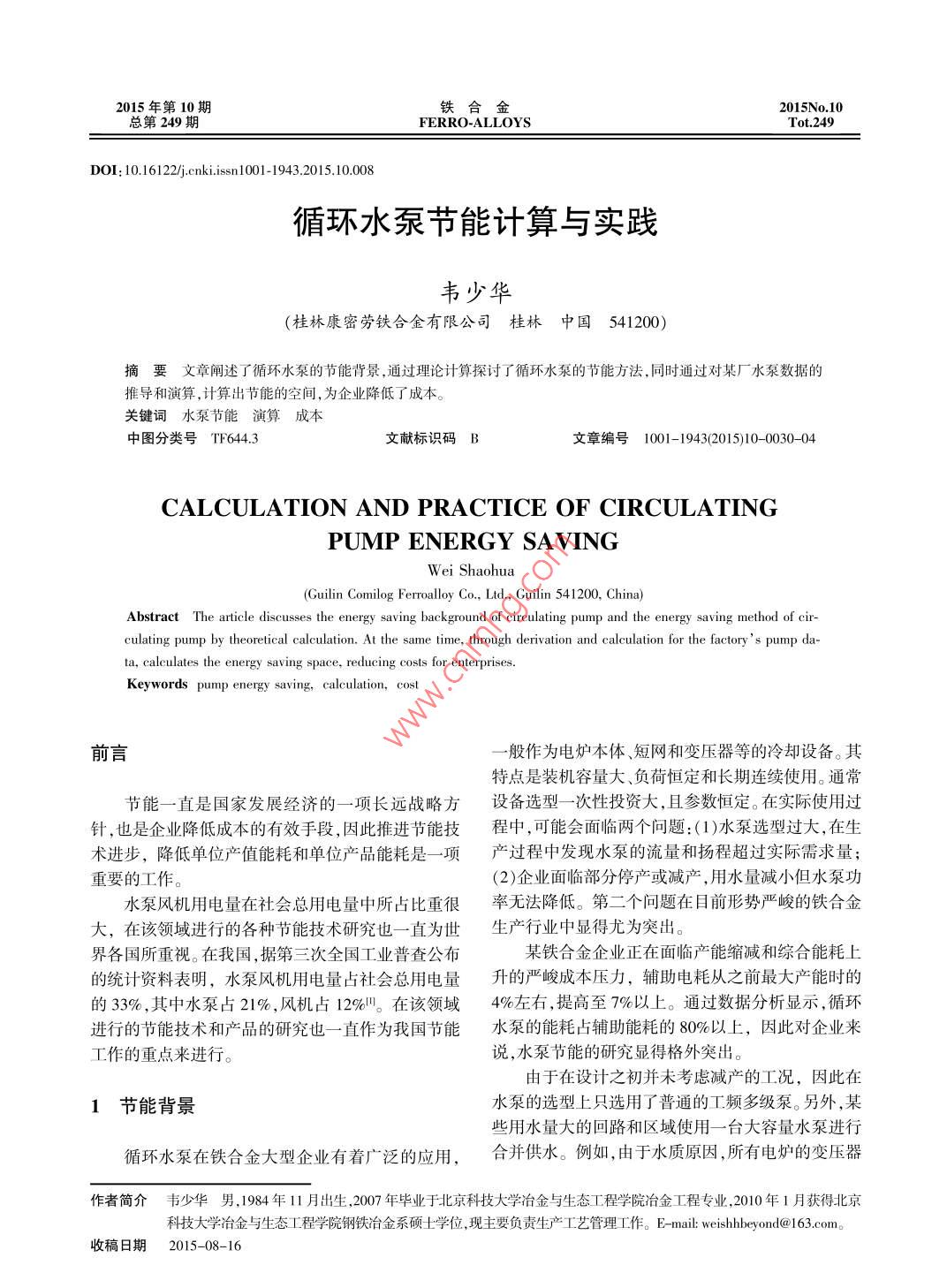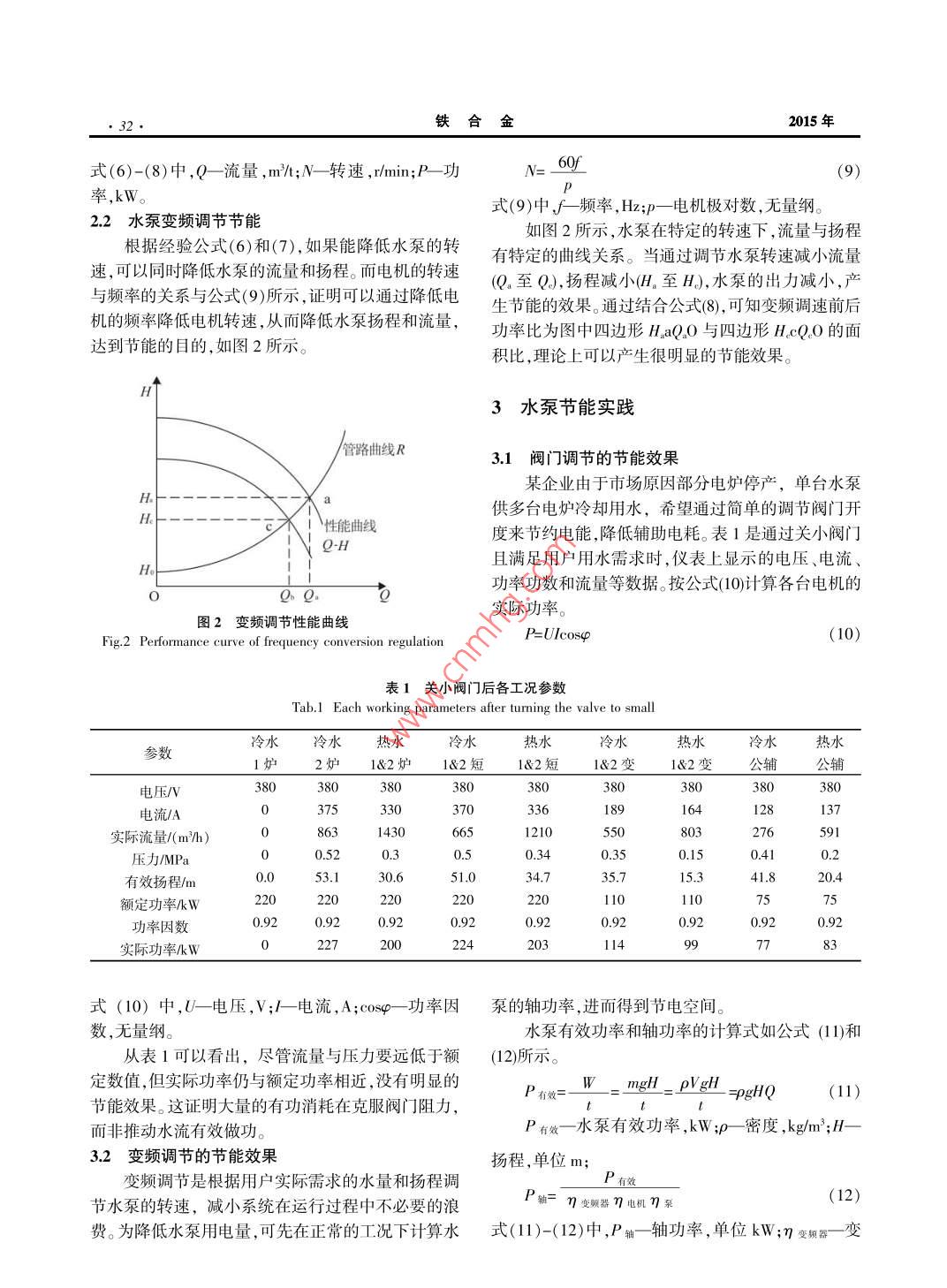 2015年第10期鐵合金015No.10總第249期FERRO-ALLOYSTot. 249DOI:10.16122/ cnkiissn1001-1943.2015.10.008循環(huán)水泵節(jié)能計(jì)算與實(shí)踐韋少華(桂林康密勞鐵合金有限公司桂林中國(guó)541200)摘要文章闡述了循環(huán)水泵的節(jié)能背景,通過(guò)理論計(jì)算探討了循環(huán)水泵的節(jié)能方法,同時(shí)通過(guò)對(duì)某廠(chǎng)水泵數(shù)據(jù)的推導(dǎo)和演算,計(jì)算出節(jié)能的空間,為企業(yè)降低了成本關(guān)鍵詞水泵節(jié)能演算成本中圖分類(lèi)號(hào)TF644.3文獻(xiàn)標(biāo)識(shí)碼B文章編號(hào)1001-1943(2015)10-003004CALCULATION AND PRACTICE OF CIRCULATINGPUMP ENERGY SAVINGWei shaohuaAbstract The article discusses the energy saving background of circulating pump and the energy saving method of cir-culating pump by theoretical calculation. At the same time, through derivation and calculation for the factorys pump daa, calculates the energy saving space, reducing costs for enterprisesKeywords pump energy saving, calculation, cost前言一般作為電爐本體、短網(wǎng)和變壓器等的冷卻設(shè)備。其特點(diǎn)是裝機(jī)容量大、負(fù)荷恒定和長(zhǎng)期連續(xù)使用。通常節(jié)能一直是國(guó)家發(fā)展經(jīng)濟(jì)的一項(xiàng)長(zhǎng)遠(yuǎn)戰(zhàn)略方設(shè)備選型一次性投資大,且參數(shù)恒定。在實(shí)際使用過(guò)針,也是企業(yè)降低成本的有效手段,因此推進(jìn)節(jié)能技程中,可能會(huì)面臨兩個(gè)問(wèn)題:(1)水泵選型過(guò)大,在生術(shù)進(jìn)步,降低單位產(chǎn)值能耗和單位產(chǎn)品能耗是一項(xiàng)產(chǎn)過(guò)程中發(fā)現(xiàn)水泵的流量和揚(yáng)程超過(guò)實(shí)際需求量;重要的工作。(2)企業(yè)面臨部分停產(chǎn)或減產(chǎn),用水量減小但水泵功水泵風(fēng)機(jī)用電量在社會(huì)總用電量中所占比重很率無(wú)法降低。第二個(gè)問(wèn)題在目前形勢(shì)嚴(yán)峻的鐵合金大,在該領(lǐng)域進(jìn)行的各種節(jié)能技術(shù)研究也一直為世生產(chǎn)行業(yè)中顯得尤為突出。界各國(guó)所重視。在我國(guó),據(jù)第三次全國(guó)工業(yè)普查公布某鐵合金企業(yè)正在面臨產(chǎn)能縮減和綜合能耗上的統(tǒng)計(jì)資料表明,水泵風(fēng)機(jī)用電量占社會(huì)總用電量升的嚴(yán)峻成本壓力,輔助電耗從之前最大產(chǎn)能時(shí)的的3%,其中水泵占21%,風(fēng)機(jī)占12%。在該領(lǐng)域左右,提高至7%以上。通過(guò)數(shù)據(jù)分析顯示,循環(huán)進(jìn)行的節(jié)能技術(shù)和產(chǎn)品的研究也一直作為我國(guó)節(jié)能水泵的能耗占輔助能耗的80%以上,因此對(duì)企業(yè)來(lái)工作的重點(diǎn)來(lái)進(jìn)行。說(shuō),水泵節(jié)能的研究顯得格外突出由于在設(shè)計(jì)之初并未考慮減產(chǎn)的工況,因此在1節(jié)能背景水泵的選型上只選用了普通的工頻多級(jí)泵。另外,某些用水量大的回路和區(qū)域使用一臺(tái)大容量水泵進(jìn)行循環(huán)水泵在鐵合金大型企業(yè)有著廣泛的應(yīng)用,合并供水。例如,由于水質(zhì)原因,所有電爐的變壓器作者簡(jiǎn)介韋少華男,1984年11月出生,2007年畢業(yè)于北京科技大學(xué)治金與生態(tài)工程學(xué)院冶金工程專(zhuān)業(yè),2010年1月獲得北京科技大學(xué)冶金與生態(tài)工程學(xué)院鋼鐵冶金系碩土學(xué)位,現(xiàn)主要負(fù)責(zé)生產(chǎn)工藝管理工作eishhbeyond@163.com收稿日期2015-08-16第10期韋少華循環(huán)水泵節(jié)能計(jì)算與實(shí)踐共用一個(gè)循環(huán)回路。當(dāng)一臺(tái)電爐停產(chǎn)時(shí),變壓器冷卻有關(guān);一局部阻力系數(shù),與局部管道變化的劇烈程水仍然在不斷循環(huán),這就無(wú)形中造成了電能的浪費(fèi),度有關(guān);l-管長(zhǎng),m;d-管徑,m;t-速度,ms;g重增加了成本。力加速度,ms變化管道上閥門(mén)開(kāi)度時(shí),相當(dāng)于對(duì)管道在局部2水泵節(jié)能方法和原理進(jìn)行變徑調(diào)節(jié)。對(duì)于管道變徑,局部水頭損失的經(jīng)驗(yàn)公式可表示為公式(4)在水泵運(yùn)行過(guò)程中,無(wú)論采取何種節(jié)能措施和H=0.5·(1-22)方案,首要的任務(wù)是保證用戶(hù)的工藝要求。水泵的主要工藝要求包括壓力流量和溫度等。通過(guò)實(shí)際運(yùn)行式(4)中,Ar入口管徑截面積,m2;Ax出口管徑截過(guò)程中的數(shù)據(jù)累積和工況,對(duì)比設(shè)計(jì)時(shí)的工藝和設(shè)面積,m備參數(shù),找到適合的節(jié)能方法和空間。聯(lián)立公式(1)-(4)得公式(5),水泵將電能轉(zhuǎn)換成水的動(dòng)能和勢(shì)能,即壓力和Ha=Ho+a+0.5·(1流量。因此調(diào)節(jié)合適的揚(yáng)程和流量是節(jié)能技術(shù)的途徑。為降低水泵流量,可以采取兩種方式:(1)強(qiáng)制關(guān)=+(A-1(5)A小水泵出口閥門(mén),通過(guò)閥門(mén)調(diào)節(jié)流量;(2)通過(guò)變頻按公式(5),在管徑不變時(shí),流量Q與流量成正技術(shù),調(diào)節(jié)水泵的電機(jī)轉(zhuǎn)速。比,因此揚(yáng)程與流量的關(guān)系如圖1中管路曲線(xiàn)R所2.1閥門(mén)操作調(diào)節(jié)節(jié)能示。當(dāng)關(guān)小閥門(mén)時(shí),即A1>A2時(shí),按公式(5),管路曲線(xiàn)減小閥門(mén)開(kāi)度可以改變管道內(nèi)的阻力,從而調(diào)由R變?yōu)镽'。管道曲線(xiàn)R和R與水泵的性能曲線(xiàn)節(jié)水流量。水泵供