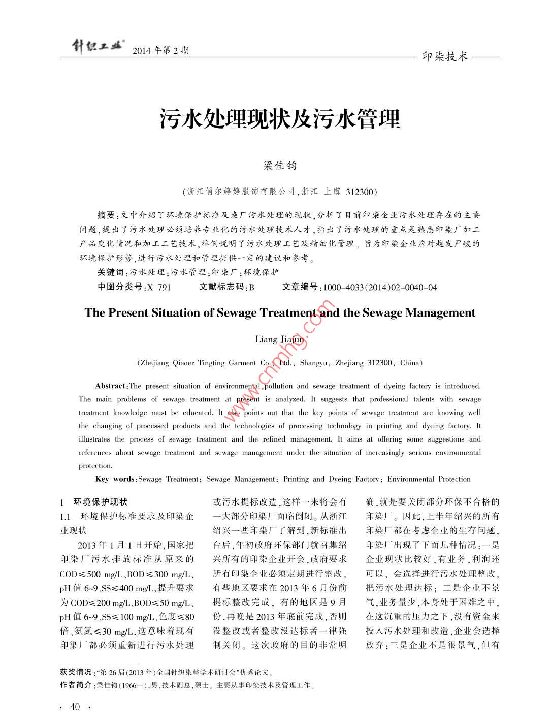 針工盛2014年第2期印染技術污水處理現(xiàn)狀及污水管理梁佳鈞浙江俏爾婷婷服飾有限公司,浙江上虞312300摘要:文中介紹了環(huán)境保護標準及染廠污水處理的現(xiàn)狀,分析了目前印染企業(yè)污水處理存在的主要題,提出了污水處理必須培養(yǎng)專業(yè)化的污水處理技術人才,指出了污水處理的重點是熟悉印染廠加工產(chǎn)品變化情況和加工工藝技術,舉例說明了污水處理工藝及精細化管理。旨為印染企業(yè)應對越發(fā)嚴峻的環(huán)境保護形勢,進行污水處理和管理提供一定的建議和參考。關鍵詞:污水處理;污水管理:印染廠:環(huán)境保護中圖分類號:X791文獻標志碼:B文章編號:1000-4033(2014)02-0040-04The Present Situation of Sewage Treatment and the sewage managementLiang jiajun(Zhejiang Qiaoer Tingting Garment Co, Ltd, Shangyu, Zhejiang 312300, ChAbstract: The present situation of environmental pollution and sewage treatment of dyeing factory is introducedThe main problems of sewage treatment at present is analyzed. It suggests that professional talents with sewagetreatment knowledge must be educated. It also points out that the key points of sewage treatment are knowing wellthe changing of processed products and the technologies of processing technology in printing and dyeing factory. Itllustrates the process of sewage treatment and the refined management. It aims at offering some suggestions andreferences about sewage treatment and sewage management under the situation of increasingly serious environmentalKey words Sewage Treatment; Sewage Management; Printing and Dyeing Factory; Environmental Protection1環(huán)境保護現(xiàn)狀或污水提標改造,這樣一來將會有確,就是要關閉部分環(huán)保不合格的1.1環(huán)境保護標準要求及印染企大部分印染廠面臨倒閉。從浙江印染廠。因此,上半年紹興的所有業(yè)現(xiàn)狀紹興一些印染廠了解到,新標準出印染廠都在考慮企業(yè)的生存問題2013年1月1日開始,國家把臺后,年初政府環(huán)保部門就召集紹印染廠出現(xiàn)了下面幾種情況:一是印染廠污水排放標準從原來的興所有的印染企業(yè)開會,政府要求企業(yè)現(xiàn)狀比較好,有業(yè)務,利潤還COD≤500mg/L、BOD≤300mg/L、所有印染企業(yè)必須定期進行整改,可以,會選擇進行污水處理整改,pH值6-9SS≤400mgL,提升要求有些地區(qū)要求在2013年6月份前把污水處理達標;二是企業(yè)不景為COD≤200mg、BOD≤50mg、提標整改完成,有的地區(qū)是9月氣,業(yè)務量少,本身處于困難之中pH值6-9SS≤100mg、色度≤80份,再晚是2013年底前完成,否則在這沉重的壓力之下,沒有資金來倍、氨氮≤30mg/L,這意味著現(xiàn)有沒整改或者整改沒達標者一律強投入污水處理和改造,企業(yè)會選擇印染廠都必須重新進行污水處理制關閉。這次政府的目的非常明放棄;三是企業(yè)不是很景氣,但有獲獎情況:“第26屆(2013年)全國針織染整學術研討會”優(yōu)秀論文作者簡介:梁佳鈞(1966-),男,技術副總,碩士。主要從事印染技術及管理工作印染技術2014年第2期針您盛業(yè)務,企業(yè)老板對印染這個行業(yè)已點,一般會到300mg左右,少加具體的染色工藝技術,了解所用的失去了信心,于是會選擇轉(zhuǎn)讓或轉(zhuǎn)點藥劑COD就會有可能超標。也染料、助劑結(jié)構和成分,要知道染行就是說,目前許多染廠的污水處理色產(chǎn)生的污水中有些什么物質(zhì),以從國內(nèi)現(xiàn)狀來看,印染廠的形不是很穩(wěn)定,有時會達標,有時會及這些物質(zhì)的性能。只有這樣,才勢越來越嚴峻,生存環(huán)境越來越超標,所以環(huán)保部門和城市污水處能有針對性地尋找好的方法來處差,所以有些企業(yè)不得不考慮染廠理總站會比較忙,經(jīng)常會來抽查取理污水,來降低污水處理成本。遷移,走二三十年前日本的路,就樣,安裝在線檢測,查到超標就通印染廠每天加工的產(chǎn)品會不是把印染廠轉(zhuǎn)移到東南亞國家知整改或者罰款。但是一般來說樣,所用的染料和助劑就會不個國家經(jīng)濟發(fā)展到一定程度,會從按照提標前的排放標準,大部分印樣,對污水處理的工藝設計就會不產(chǎn)品輸出轉(zhuǎn)向資本輸出,這是中國染廠都能過得去樣,而目前大部分染廠污水處理經(jīng)濟大步跨躍的結(jié)果,也說明中國目前的印染廠大都有所謂的的工藝基本上是一樣的,所以會出經(jīng)濟發(fā)展到一定程度后,人們關心污水處理廠,但大都是沒有正規(guī)污現(xiàn)有時候的污水處理不好的情況。的是社會問題和環(huán)境問題水處理的管理,沒有合理污水處理比如,印花廠會用到大量印花漿糊1.2染廠污水處理現(xiàn)狀流程。印染廠有好的印染技術人和尿素,這些漿糊的濃度比較高,以前,大部分印染廠用水是地員,但都缺乏專業(yè)的污水處理技術污水的COD就會比較高,所用的下水、水庫水或河水,現(xiàn)在這些水人員。漿糊料不一樣,污水產(chǎn)生的COD都被政府控制,不讓隨便使用。印2污水治理措施也會不一樣,尿素的加入雖然給生染廠只能用自來水,而自來水的價環(huán)境與污水處理不只是產(chǎn)生化池中的細菌提供了營養(yǎng),但也增格越來越高,每噸3~6元不等,排污水的企業(yè)一個單位的事,而是需加氨氮含量,還要考慮如何處理氨污收費又要3-4元,所以染廠用水要政府、社會、各行業(yè)共同來關注,氮量。又如,染廠加工的產(chǎn)品如果費用非常高,染色成本也水漲船起來做好。為此,針對污水處理