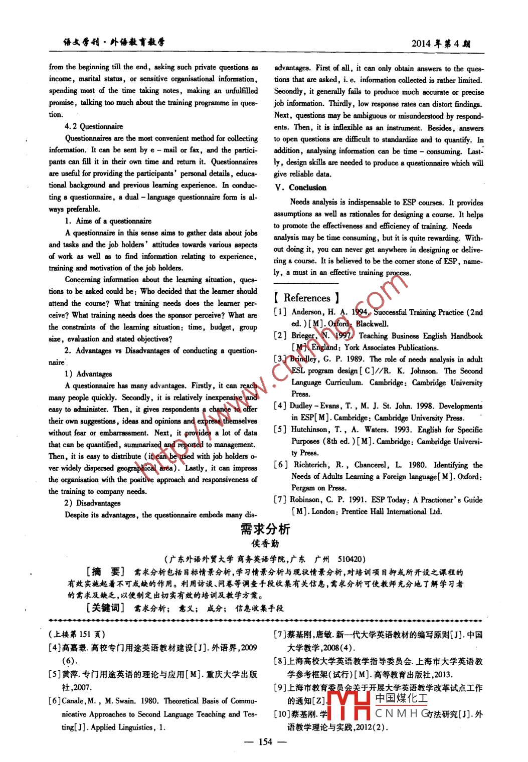 語文學(xué)利●外語教育赦學(xué)2014年第4期Needs Analysis0 Hou Xiangqin(Cuangdong University of Foreign Sudies , Guangzhou, Guangdong, 510420)[ Abstract] Needs analysis, involving target situation analyeis, leaming situation analysis and preent situationanalysis, plays an indispensible role in the succes of a training program. Conducted in terms of instuments such 8 inter-view, questionnaire, needs analysis can help us to idenify the needs and wants of the trainces and provide sugstions andguidelines accordingly for the training.[Key words]needs analysis,signifcance, elements, data olleting means[中圖分類號] H319[文獻(xiàn)標(biāo)識碼] A [ 文章編號] 1672-8610(2014)04-0152-03sities, wants and lacks. Dudley - Evans & St John state thatL IntroductionNeeds Analysis is the process of the identifing the wbo,needs analysis in ESP encompases the fllowing: Profesionaldetermining the what and deigning the bow of a traininginformation about the learmers - - target situation analysis and ob-jective needs; Personal inforation about the leamer: wants,course. It is erucial to ESP courses.Broadly speaking, two diferent types of needs analysis aremeans , subjective needs; Their curent 8kills and language ube:involved before designing a course: leamer analysis vs task anal-present situation analysis.Between TSA and PSA there is lacks.ysis The former is based on information about the leamers;2.1 Types of needs(that is: For what purpoes are tbe leamers leaming the lan-1. Target needs: objective, perceived, product - orientedguage) ; while the ltter is to specify and categorize the languageTarget needs is kind of an umbrella temm, under which arekills required to carry out real - world communication tasks,and tbus to etblih the comicaive pupoe for which the leamen' necsitis, lacks and wants.ecessities belong to the type of need determined by the delearmer wishes to achieve.The process of cllcting and interpreing data on the leam-mands of the target situatin ( the destination) , that is, what theens' likely use of the target language has been a idisensable leamer has to know in order 0o fumction efectively in the targetfeature of ESP.situation. For example, a businessman may need meeting skillsBrieger (1997) suggeats that noeds analysis for busines to call a meig. To make an eective metig, he may need toEnglish will et out to identify the range of general and specialitdevelop communication skills needed for chairing and participat-language knowledge required, together with general and profes-ing in metigs. Or he may need language knowledge such a8 in-sional communication skills.terrupting, clarifying, agreeing or disagreeing.Lacks refers to the gap between the target proficiency andI. An Overview of Learners' NeedsAccording to Robinson (1991), needs refer to students'the existing proficiency of the leamers (the starting point). Bstudy or job requirements, namely, what tbey have to be able todeciding lacks, you need to know what the leamner knows alread-do at the end of their language course. This is goal - onientedy, so that you ca then decide which of the necessities the leamnerdefnition of needs. Needs can be seen as obijectives. They canlacks.Wants indicates the leamer's view a to what their needsbe regarded as“what the leamer needs to do to actually acquireare or their aspirations for achieving a certain goal in the future.the language.”This is process - oriented definition of needs.2. Leaming needs: subjective, felt, process - orientedBrindley (1989) describes needs in terms of bijective andLeamers' needs are subjective, felt and process - oriented.subjective needs. The formner refers to needs of leamersmation: their use of language in real - life communication situa-In this sense, the trainer should knowing how to get from thetions, their curent language proficiency and language difcul-starting point to the destination and defie the leaming purposeties. The latter refers to the cognitive and afective needs of theboth for job - experienced leamer and pre - experienced leamer.learmer in the leaming situaion, factors such as personality,On the other hand, the trainer should know information a-confidence, atitude, expectations concening leaming English.bout the leamer factors ffecting the leamer' s response to train-Whereas Hutchinson & Waters (1993) see needs as neces-ing, moivation中國煤化工[基金項目]本文系2013年度全國高校外語教學(xué)科研項目(粵-0013 -B)“商務(wù)英語多MYHCN M H G成果之一。[作者簡介]侯香勤,女,廣東外語外貿(mào)大學(xué)商務(wù)英語學(xué)院講師,硬士,研究方向:語言學(xué)與應(yīng)用語言學(xué)、商務(wù)英語教學(xué)。-152-TEACHING RESEARCHHou Xiangqin / Needs Analysis2. 2 Importance and signifcance of needs analysisground?)The basic purpose of needs analysis is to collect informationWbere will the training course take place? ( In company orconcemning leamers’needs, wants 8 well as the expectations ofoutside it?)the learmers for whom you are going to design or/ and deliver &Wben will the training course take place? (How long willcourse. Needs analysis highlights such informnation and providethe course last? How often will it take place?)you guidelines and prepare you well in establishing aims and ob-3.3 Present Situation Analysis (PSA)jectives of the course in course design and materials writing.Present Situation Analysis (PSA) focuses on such quetionsTraining needs analysis is the diagnostic part of the wholeas: What are the students' capabilities now? What difculies dotraining proces. ( Anderson, 1994) It helps to do the fllowing:the students have in studying English? What are the features ofproviding necessary information on participants ( careful thoughtthe setting for the ESP course? Namely, PSA attempts to estimateabout the learmers helps determine the starting point of the coursethe learmers' strength and weakness in language skills and leam-and helps