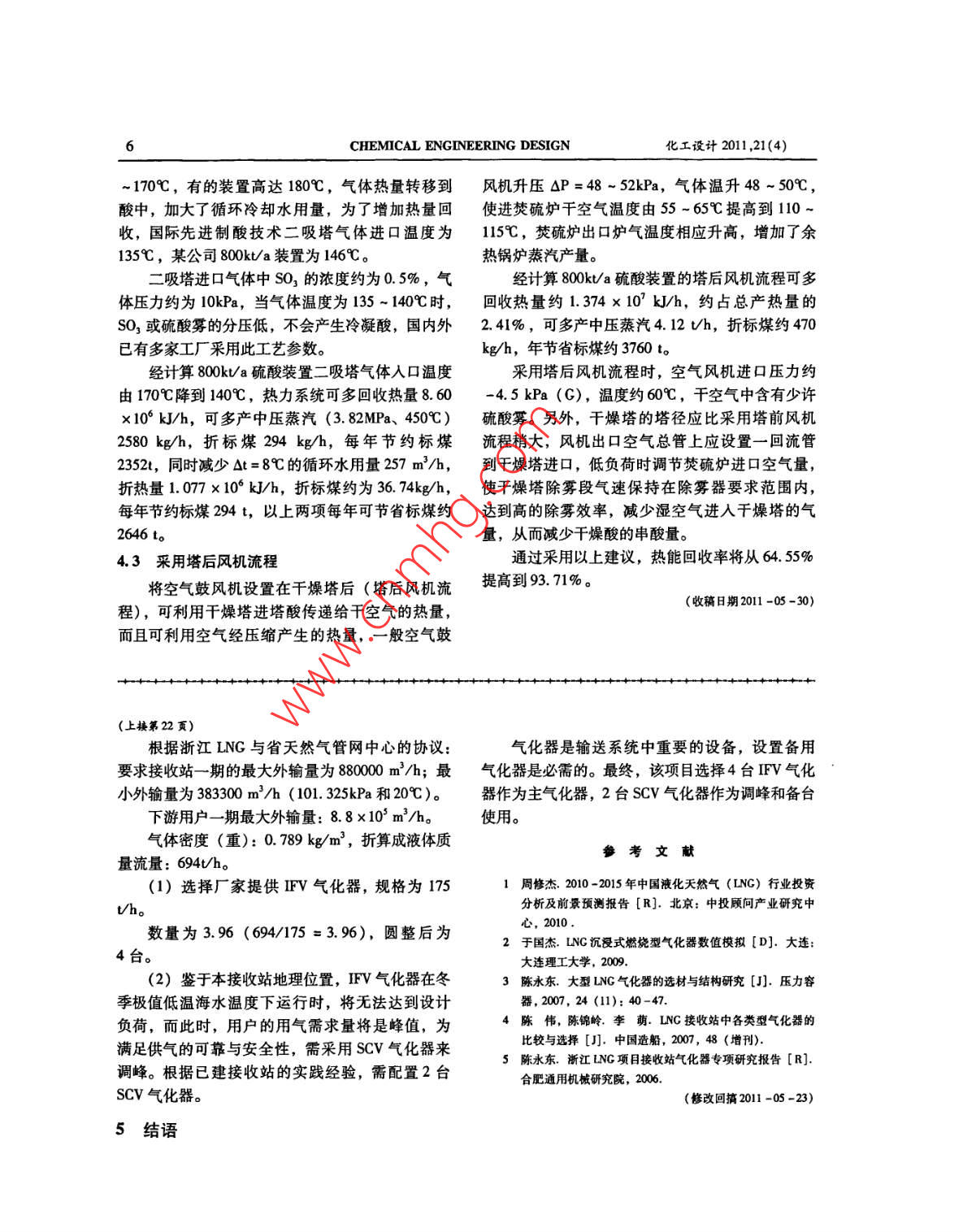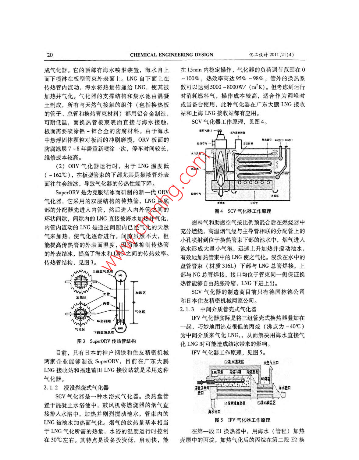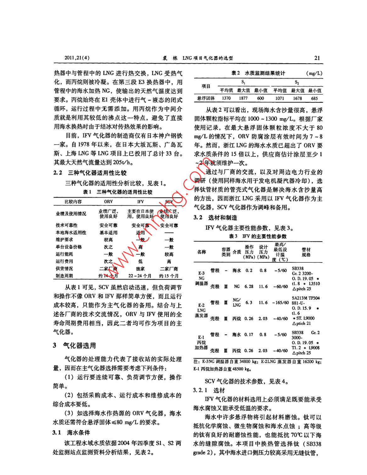 2011,21(4)裘棟LNC項目氣化器的選型LNG項目氣化器的選型裘棟中海浙江寧波液化天然氣有限公司寧波 315800摘要介紹液化天然氣 (LNG)接收站在國內(nèi)發(fā)展的現(xiàn)狀,比較接收站三種常用的氣化器,并結(jié)合實際確定項目氣化器類型與臺數(shù)。關(guān)鍵詞LNG 接收站氣化器選型分析投資費用,同時培養(yǎng)國內(nèi)自己的LNG建設(shè)隊伍。1概述該項目由中國成達工程有限公司負責(zé)設(shè)計,浙江LNG接收站是接收海上LNG運輸?shù)慕K端站場,LNG項目公司負責(zé)對設(shè)備的設(shè)計和采辦,國內(nèi)施在站內(nèi)將LNG接收、儲存、氣化、外輸至下游工單位負責(zé)建設(shè)和安裝。用戶氣化器是接收站工藝流程中最關(guān)鍵的設(shè)備之通過40多年的發(fā)展,全球已投用LNG接收站一,而且價格高、制造周期長。為做好氣化器的77座。我國除廣東大鵬、福建莆田和上海等3座選型,早在2005年起就啟動了市場調(diào)研、與國內(nèi)已投人使用外,在建的LNG接收站還有不少,浙設(shè)計單位及國外制造商的技術(shù)交流活動。江LNG項目就是其中之一一。浙江LNG項目一期建設(shè)規(guī)模3000kv/a,包括2三種氣化器比較建設(shè)- - 座停靠(0.8~2.66) x 10'm3 LNG運輸船的2.1氣化器類型接卸碼頭、三座1.6x10'm'混凝土全容罐以及配.目前,世界上LNG接收站常用的氣化器有三套的工藝、公用等設(shè)施。項目于2010年12月開工種:開架式氣化器( Open Rack Vaporator, 簡稱建設(shè),預(yù)計到2012年10月投入使用。浙江接收站ORV);浸沒燃燒式氣化器(Submerged Combustion的工藝流程,見圖1。Vaporator, 簡稱SCV);中間介質(zhì)管殼式氣化器( Intermediate Fluid Vaporator,簡稱IFV)。2.1.1開架式氣化器ORV氣化器是以海水為熱源的氣化器,其工作原理,見圖2。無然___上都總管m換空換熱管來圖1 浙江LNG工藝流程示意圖接收站工藝流程:LNG運輸船到達卸船碼頭..后,經(jīng)卸料臂輸送至LNG儲罐,然后用低壓泵從罐內(nèi)抽出,經(jīng)再冷凝器輸送至高壓泵,經(jīng)增壓后輸一個瓶整管來單元圖2 ORV 氣化器工作原理送至氣化器。在氣化器內(nèi),LNG氣化并升至常溫,最后經(jīng)計量和調(diào)壓后輸送至管網(wǎng)。(1)氣化器的基本單元是傳熱管,由若干傳熱浙江LNG接收站項目建設(shè)模式除儲罐采用管組成板狀排列,兩端與集氣管或集液管焊接形.EPC模式外,還采用E+P+C的方式,意在節(jié)省成一個板型管束單元,再由若干個這樣的單元組*裘棟:工程師。1991年畢業(yè)于石油大學(xué)(華東)礦場機械專業(yè)。先后從事化纖設(shè)備和液化天然氣接收站設(shè)備的管理工作。聯(lián)系電話: (0574) 86010045, E- mail: qiudong@ cnooe. com. cn。2011 ,21(4)裘棟LNG項目氣化器的選型21熱器中與管程中的LNG進行熱交換,LNG受熱氣表2水質(zhì)監(jiān)測結(jié)果統(tǒng)計(mg/L)化,而丙烷則被冷凝。在第三段E3換熱器中,用目平均值最大值最小值平均值 最大值最小值S管程中的海水加熱NG,使輸出的天然氣溫度達到要求。丙烷始終在E1殼體中進行氣-液態(tài)的閉式懸浮固體1370 187760010循環(huán),運行過程中無需添加。用丙烷作為中間介從表2可以看出,現(xiàn)場海水含沙量很高,懸浮質(zhì)就是利用其較低的沸點這一特點,避免了直接固體顆粒指標(biāo)平均在1000 ~ 1300 mg/L。根據(jù)廠家用海水換熱時由于結(jié)冰對傳熱效果的影響。使用記錄,在最大懸浮固體顆粒濃度不大于80目前,IFV氣化器的制造商僅有日本神戶鋼鐵mg/L的情況下,ORV防腐涂層有效時間為7 ~8一家。自1978年以來,在日本大坂瓦斯、廣島瓦年。然而,浙江LNG的海水水質(zhì)已超出了ORV要斯、上海LNG等LNC項目上已投用了總計33臺。求水質(zhì)條件的 15倍以上,供應(yīng)商估計涂層至少1其最大天然氣流量達到205th。~2年就須維護- -次。2.2三種氣化器適用性比較通過與廠商的交流,以及對周邊電力行業(yè)的三種氣化器的適用性分析比較,見表1。調(diào)研(使用同樣海水用于發(fā)電機凝汽器冷卻),選擇鈦管材質(zhì)的管殼式氣化器是解決海水含沙量高表1三種氣化器的適 用性比較比較內(nèi)容ORVFV_的方法,因而浙江LNG采用以IFV氣化器作為主氣化器,SCV 氣化器作為調(diào)峰和備用。業(yè)績及使用情況業(yè)績廣泛,主要在日本使業(yè)績廣泛,使用良好用,使用良好使用良好3.2選材和制造技術(shù)可靠性安全可靠安全可靠安 全可靠IFV氣化器主要性能參數(shù),見表3。本地海水適用性基本適用表3 IFV 的主要性能參數(shù)維護要求較高般單臺設(shè)備價格次之高運行能耗一般名稱器介質(zhì)壓力任萬最低沒修材(MPa) (MPa)度(C)運行費用供貨情況二家廠商22-24個月約15個月獨家E3管程-海水0.2 0.8 -5/60 .SB338制造周期.約14個月調(diào)溫器. t1.8*L3510從表1可見,SCV雖然啟動迅速,但負荷調(diào)節(jié)”殼程皿NG 6.28 11.6 -60/60O pitch 25和操作不像ORV和IFV那樣簡單方便,而且運行SA213M TP304成本較高,只能作為主氣化器的備用。結(jié)合與上E-2管程mLING 6.3 11.6 -165/600.D.15.9 *述各廠商的技術(shù)交流情況,ORV與IFV使用的全蒸發(fā)器”殼程皿丙燒0.262.03-40/60 *ST.L9000 .t1.6壽命周期費用相當(dāng),因此二者均可作為項目的主△ptich 21氣化器。E-1管程-海水0.17 0.8 -5/60 S888丙烷.0. D. 19.053氣化器選用加熱器殼程I丙烷0.26 2.03-40/60T1.2 * L9008△pitch 25氣化器的處理能力代表了接收站的實際處理注: E-3NG 調(diào)溫器自重34800 kg; 