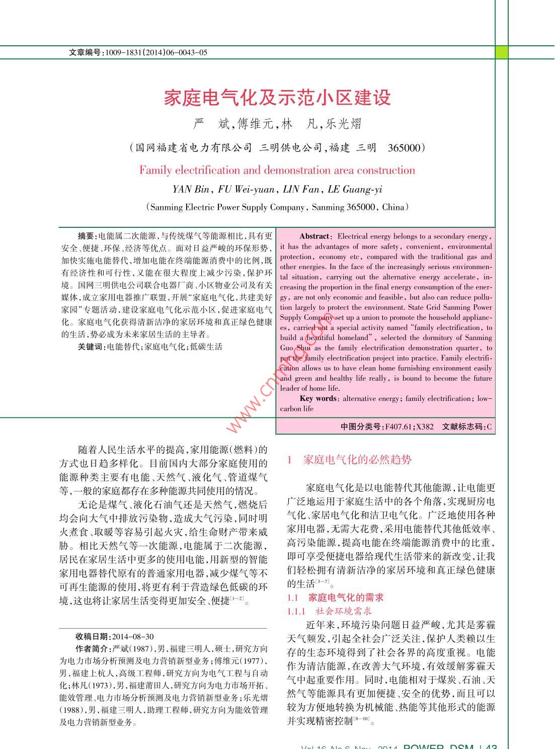 文章編號(hào):1009- 1831(2014)06-0043-05家庭電氣化及示范小區(qū)建設(shè)嚴(yán)斌,傅維元,林凡,樂(lè)光熠(國(guó)網(wǎng)福建省電力有限公司三明供電公司,福建三明365000)Family electrification and demonstration area constructionYAN Bin, FU Wei-yuan, LIN Fan, LE Guang-yi( Sanming Electric Power Supply Company, Sanming 365000, China )摘要:電能屬二次能源,與傳統(tǒng)煤氣等能源相比,具有更Abstract: Eectrical energy belongs to a secondary energy ,安全、便捷、環(huán)保、經(jīng)濟(jì)等優(yōu)點(diǎn)。面對(duì)8益嚴(yán)峻的環(huán)保形勢(shì),it has the advantages of more safety, convenient, environmental加快實(shí)施電能替代,增加電能在終端能源消費(fèi)中的比例,既protection, economy etc, compared with the traditional gas an有經(jīng)濟(jì)性和可行性,又能在很大程度上減少污染,保護(hù)環(huán)other energies. In the face of the increasingly serious environmen-境。國(guó)網(wǎng)三明供電公司聯(lián)合電器廠商、小區(qū)物業(yè)公司及有關(guān)tal situation, carrying out the alternative energy accelerate, in-creasing the proportion in the final energy consumption of the ener-媒體,成立家用電器推廣聯(lián)盟,開(kāi)展家庭電氣化,共建美好gy, are not only economic and feasible, but also can reduce pollu-家園”專題活動(dòng),建設(shè)家庭電氣化示范小區(qū),促進(jìn)家庭電氣tion lrgely to protet the enironmen. State Grid Sanming Power化。家庭電氣化獲得清新潔凈的家居環(huán)境和真正綠色健康Supply Company set up a union to promote the household appliane-es, carried out a special activity named "family electrification, to的生活,勢(shì)必成為未來(lái)家居生活的主導(dǎo)者。build a beautiful homeland”, seleeted the dormitory of Sanming關(guān)鍵詞:電能替代;家庭電氣化;低碳生活Guo Shui as the family electrification demonstration quarter, toput the family electrification project into practice. Family electrifi-cation allows us to have clean home furnishing environment easilyand green and healthy life really, is bound to become the futureleader of home life.Key words: alternative energy ; family electrification; lowcarbon life中圖分類號(hào):F407.61;X382文獻(xiàn)標(biāo)志碼:C隨著人民生活水平的提高,家用能源(燃料)的方式也日趨多樣化。目前國(guó)內(nèi)大部分家庭使用的1家庭電氣化的必然趨勢(shì)能源種類主要有電能、天然氣、液化氣、管道煤氣等,一般的家庭都存在多種能源共同使用的情況。家庭電氣化是以電能替代其他能源,讓電能更無(wú)論是煤氣、液化石油氣還是天然氣,燃燒后廣泛地運(yùn)用于家庭生活中的各個(gè)角落,實(shí)現(xiàn)廚房電均會(huì)向大氣中排放污染物,造成大氣污染,同時(shí)明氣化、家居電氣化和潔衛(wèi)電氣化。廣泛地使用各種火煮食、取暖等容易引起火災(zāi),給生命財(cái)產(chǎn)帶來(lái)威家用電器,無(wú)需大花費(fèi),采用電能替代其他低效率、脅。相比天然氣等一次能源,電能屬于二次能源,高污染能源,提高電能在終端能源消費(fèi)中的比重,居民在家居生活中更多的使用電能,用新型的智能即可享受便捷電器給現(xiàn)代生活帶來(lái)的新改變,讓我家用電器替代原有的普通家用電器,減少煤氣等不們輕松擁有清新潔凈的家居環(huán)境和真正綠色健康可再生能源的使用,將更有利于營(yíng)造綠色低碳的環(huán)1.1家庭電氣化的需求境,這也將讓家居生活變得更加安全、便捷中21。1.1.1 社會(huì)環(huán)境需求近年來(lái),環(huán)境污染問(wèn)題日益嚴(yán)峻,尤其是霧霾收稿日期:2014-08-30作者簡(jiǎn)介:嚴(yán)斌( 1987),男,福建三明人,碩土,研究方向天氣頻發(fā),引起全社會(huì)廣泛關(guān)注,保護(hù)人類賴以生為電力市場(chǎng)分析預(yù)測(cè)及電力營(yíng)銷新型業(yè)務(wù);傅維元(1977),存的生態(tài)環(huán)境得到了社會(huì)各界的高度重視。電能.男,福建上杭人,高級(jí)工程師,研究方向?yàn)殡姎夤こ膛c自動(dòng)作為清潔能源,在改善大氣環(huán)境,有效緩解霧霾天化;林凡(1973),男,福建莆田人,研究方向?yàn)殡娏κ袌?chǎng)開(kāi)拓、氣中起重要作用。同時(shí),電能相對(duì)于煤炭、石油、天能效管理、電力市場(chǎng)分析預(yù)測(cè)及電力營(yíng)銷新型業(yè)務(wù);樂(lè)光熠然氣等能源具有更加便捷、安全的優(yōu)勢(shì),而且可以(1988),男,福建三明人,助理工程師,研究方向?yàn)槟苄Ч芾磔^為方便地轉(zhuǎn)換為機(jī)械能、熱能等其他形式的能源及電力營(yíng)銷新型業(yè)務(wù)。并實(shí)現(xiàn)精密控制8- -10。1.1.2客戶需求日溫暖,潔衛(wèi)有了新的詮釋。隨著科學(xué)技術(shù)與社會(huì)經(jīng)濟(jì)的飛速發(fā)展,人民生(2)安全活水平不斷提高,人們對(duì)住宅的各項(xiàng)使用功能的要在科技日新月異的今天,家庭用電再也不會(huì)出求也不斷提高,住宅用電設(shè)備也越來(lái)越多,人們對(duì)現(xiàn)觸電身亡的事情了,每家每戶的用電都是經(jīng)過(guò)多家庭生活質(zhì)量的要求已不僅僅為可以煮飯、燒水即重安全保護(hù)的。煮食沒(méi)有了明火,更安全可靠,在可,更高的要求為如何把飯煮得更好、更安全,把水所用的飲食、洗漱用水等加熱能源中,最安全清潔燒得更快更便捷,如何讓家里環(huán)境衛(wèi)生更干凈、更的電能已經(jīng)成為新時(shí)尚家居生活的首選。舒適。(3)能源價(jià)格低隨著能源價(jià)格