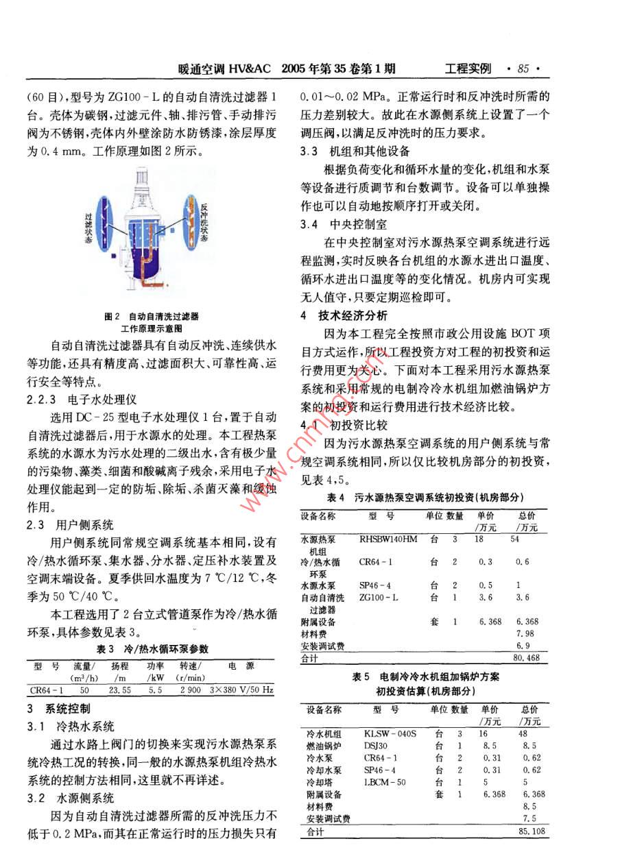 暖通空調(diào)H&AC2005年第35卷第1期83工程實(shí)例污水源熱泵空調(diào)系統(tǒng)在污水處理廠的應(yīng)用國(guó)中愛(ài)華(天津)市政環(huán)境工程有限公司周文忠☆摘要該項(xiàng)目以二級(jí)出水作為污水源熱泵系統(tǒng)的熱源/熱匯。介紹了系統(tǒng)流程、水源側(cè)系統(tǒng)、用戶側(cè)系統(tǒng)及系統(tǒng)的控制等。對(duì)該方案與電制冷加燃油鍋爐方案的經(jīng)濟(jì)性進(jìn)行了比較,結(jié)果顯示該方案的初投資比后者低6%左右;運(yùn)行費(fèi)用夏季基本相當(dāng),冬季大約低67%。關(guān)鍵詞污水源熱泵污水處理BOT經(jīng)濟(jì)性Application of sewage source heat pumpsystems to a sewage treatment plantBy Zhou Wenzhong★Abstract The project adopts the secondary effluent as the heat source/sink of the heat pump systerresents the system flow process, the systems in water source and user sides, and the system controlCompares this system with the electric refrigeration plus oil-fired boiler scheme in economics. The resultsshow that the initial cost of the project is less than the second scheme by 6%: the operating expense is aboutequal in summer and is less by 67% in winterKeywords sewage source heat pump, sewage treatment, build-operate-transfer(BOT), economicsInterChina Aihua Municipal Environmental Engineering Co, Ltd, Tianjin, China污水源熱泵系統(tǒng)利用污水中的能量,以污水作的企業(yè)來(lái)投資、建設(shè)、運(yùn)營(yíng)、維護(hù)等。特許權(quán)期限為熱源/熱匯,通過(guò)熱泵機(jī)組將低品位水中難以直內(nèi),項(xiàng)目公司向用戶收取費(fèi)用,來(lái)抵償投資和經(jīng)接利用的能源提取出來(lái),供冬季供暖夏季制冷使?fàn)I成本,并獲得合理回報(bào),政府則擁有對(duì)項(xiàng)目的用。按照其使用的污水的處理狀態(tài)可分為以未處監(jiān)督權(quán)、調(diào)控權(quán)。特許期滿,項(xiàng)目公司把基礎(chǔ)設(shè)理過(guò)的污水作為熱源熱匯和以二級(jí)出水或中水作施無(wú)償移交給政府為熱源/熱匯的污水源熱泵系統(tǒng)。本項(xiàng)目中應(yīng)用的本BOT項(xiàng)目運(yùn)營(yíng)期為20年,與一般工程項(xiàng)目是以二級(jí)出水為熱源/熱匯的污水源熱泵系統(tǒng)不同,BOT項(xiàng)目更要綜合考慮初投資和運(yùn)行費(fèi)用,1工程概況既要節(jié)約初投資,又要考慮以后運(yùn)行費(fèi)用的節(jié)約本工程為秦皇島海港區(qū)污水處理廠,平均日處1.2水源情況理水量為12萬(wàn)t,污水處理達(dá)到二級(jí)排放標(biāo)準(zhǔn)。本本項(xiàng)目利用污水中的冷熱能,采用二級(jí)出水(接工程采用國(guó)際上市政基礎(chǔ)設(shè)施建設(shè)較常用的BOT觸池水)的溫差作為輸入能供集中空調(diào)系統(tǒng)使用( build-operate-transfer)模式。二級(jí)出水量約為5000t/h,有足夠的溫差能供機(jī)組1.1市政基礎(chǔ)設(shè)施BOT模式簡(jiǎn)介BOT模式,即建設(shè)-運(yùn)營(yíng)-移交,是城市市政☆周文忠,男,1973年3月生,工學(xué)碩士,工程師公用事業(yè)特許經(jīng)營(yíng)制度的一種典型形式。政府300060天津市河西區(qū)衛(wèi)津南路21號(hào)新金龍大廈北樓4層通過(guò)簽訂特許權(quán)協(xié)議,將應(yīng)由政府投資經(jīng)營(yíng)的市(022)23376168-215E-mail:wzhzhou@hotmail.com政公用基礎(chǔ)設(shè)施如城市供水、污水處理、集中供收稿日期:2003-09-24一次修回:2003-10-29熱、燃?xì)?、垃圾處理等設(shè)施,授予通過(guò)招投標(biāo)選中二次修回:2004-11-2584·工程實(shí)例暖通空調(diào)HV&AC2005年第35卷第1期提取利用。二級(jí)出水水質(zhì):懸浮物30mg/L,5日生a)二級(jí)出水冬季溫度較低,再經(jīng)過(guò)一次換熱化耗氧量30mg/L,鉻測(cè)定化學(xué)耗氧量60mg/L,氨會(huì)使水溫進(jìn)一步降低,這樣就有可能不滿足水源熱氮25mg/L,總磷1mg/IL,冬季水溫不低于10℃,泵機(jī)組的進(jìn)水溫度要求,而造成蒸發(fā)器凍結(jié)其他季節(jié)可達(dá)25℃左右。b)經(jīng)過(guò)對(duì)二級(jí)出水水質(zhì)的分析,二級(jí)出水經(jīng)1.3冷/熱負(fù)荷過(guò)處理進(jìn)入板式換熱器是完全可以的。本工程中秦皇島地區(qū)集中供暖期152天,供暖期室外設(shè)在潛水泵的四周(抽水區(qū)域)加設(shè)40目的過(guò)濾框架計(jì)溫度-12℃。廠內(nèi)建筑物面積總計(jì)3038.78m2,網(wǎng),對(duì)懸浮物進(jìn)行第一次過(guò)濾,在進(jìn)入機(jī)組前又進(jìn)供熱面積2698.42m2,供冷面積1604.23m2。供行了60目過(guò)濾,這樣完全能保證機(jī)組不受懸浮物熱總負(fù)荷約為337.8kW,供冷總負(fù)荷約為260.6的影響,安全有效地運(yùn)行。kW,具體負(fù)荷分布見(jiàn)表1。供冷主要集中在廠前區(qū)2.1制冷機(jī)組選型的生活辦公用房和生產(chǎn)區(qū)的部分值班操作室儀表配根據(jù)冷熱負(fù)荷及工程需要,本工程選用3臺(tái)半電間等有較高要求的地點(diǎn),釆用風(fēng)機(jī)盤(pán)管系統(tǒng)。生封閉螺桿式水源熱泵機(jī)組,單臺(tái)額定制冷量為產(chǎn)性廠房車間只考慮散熱器供暖,供暖溫度按防凍141kW,制熱量為161kW,電機(jī)功率為30.1kW。溫度(t=5℃)考慮。該機(jī)組釆用高性能半封閉螺桿壓縮機(jī)和不銹鋼釬表1污水處理廠冷熱負(fù)荷焊板式換熱器等優(yōu)化設(shè)計(jì),并采用模塊化設(shè)計(jì),機(jī)建筑面積供暖面積供冷面積熱負(fù)荷冷負(fù)荷組體積小,結(jié)構(gòu)緊湊,并可方便地增加容量