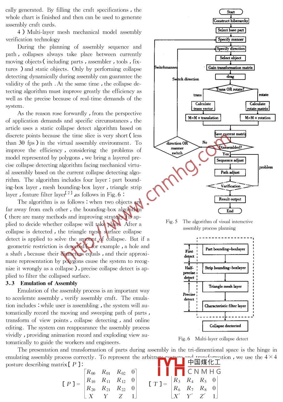 Research on Three Dimensional Computer Assistance AssemblyProcess Design SystemHOU Wenjun ,YAN Yaoqi ,DUAN Wenjia SUN Hanxu( Automation School , Bijing University of Posts & Telecommunications ,Beijing 100876 China E-mail :Wenjunh21 13@263. net )Abstract : The computer aided process planning rwill certainly play a significant role in the success of enterprise infon matiom-izatiom. 3-dimensional design will promote Tri -dimensional process planning . This article analysis nowadays situation and prob-lems of assembly process planning , gives a 3-dimensional computer aided process planning system ( 3D- VAPP ) , and researches onthe product in formation extraction , assembly sequence and path planning in visual interactive assembly process design , dynamicemulation of assembly and process verification , assembly animation outputs and automatic ex ploding view generation,interactivecraft filling and crafi knorcledge management , etc. It also gives a muli-laser collision detect and multi perspectire automaticcamera switching algorithm. Experiments were cdone to validate the feasibility of such technology and algorithm,which establishedthe foundation of tri-dimensional computer aided process planning .Key words : assemblycraft ; information extraction ; collision detect ; craft plan ; components position and posture1 IntroductionAs an important part of enterprise informationization , Computer- Aided -Process Planning( CAPP ) willcertainly playing a significant role in the success of enterprise informationization. A great strength has been putin the research of CAPP system and so far developed many experimental or commercial products. But in general ,there are still plenty of problems in the direction of research and development. From the application perspective ,the interests archived contrast sharply with the investment. For a long time , the aim of CAPP system has beendeveloping a totally automatic system but an assistant system , to take place of traditional manual process plan-ning , which is much unilateral. It took too much attention on automation,which induces long developing cycle ,high costs , bad flexibility. And on the other hand , most of current CAPP systems are still two dimension ,which cannot refer design information. With the popularization of 3D CAD software , such system will not beable to satisfy the requirements of enterprise informationization. As a result , the tri-dimensional designing basedCAPP system with fine human interface is the only solutiorfLarge enterprises whose main business are manufacture and assemble , always focus on the process and se-quence in the whole assembling of their products but the detailed parameters of one particular process ,becausetheir products are so complicated that require high assembly quality and long time. During the process planning,it needs a large amount of data , including blueprint , model , technical specification , ready craft files and commonfiles. Because of the characteristics of assembly process planning , a process planning system dealing with thewhole process of it is badly needed. Nowadays research reflects such characteristics :.1. Too much research has been put on virtual assembly , while few researches were put on the combinationof assembly knowledge and virtual assembly. Such systems can describe sequence and posture , but doing nothingwith process specifications during the corresponding assembly.2. Many such systems are isolated assembly presentation or verifying systems , which cannot finely integratethe for -ground CAD platforms and back ground Product Data Management Systems( PDM ), and so,cannotshare information among them.3. Such systems always use immersion virtual reality environments . such environments may be not suitablefor virtual assembly systems , because there are many literal inputs and out- puts. It is hard for the immersionvirtual reality environments to deal with such information and thus it is not practical. .4. Many systems require expensive hardware which partl|中國(guó)煤化工2 The Architecture of 3-Dimensional ComputerYHC N M H Gcess Planning2.1 System FunctionThis article researches on applying VR technology on assembly sequence planning. This is the project forshanghai jiansheluqiao co. ltd , the 3-Dimensional Computer Aided Assembly Process Planning system( 3D-- 108方數(shù)據(jù)VAPP ). The system constructs the virtual assembly system by using OPEN INVENTOR , Visual C+ + 6.0and Access as database , its function is as follows in Fig. 1.InformatinextractonStructure analysisAsembl:DisassemblyL sequence plan」Assembly sequece adjustmenRecord assembly pathI Asembly pauhprocessModty assembly pathplan_planningC Addcraf seeificaionProcess planC Modify craft specificationTidimensi-Environment gettingonal CAPPTexture eitingsystem廠VirtualAssembly erulationemulation andollapse detectionverficationSinge stereo displayStereo displayDesktop stereo display_Animation recordExploding viewReport fom generate[ Report manage ]Report printAssemblyCraft knowledge consutresouroe andKnowledgeCraft knowledge modifiyenancecraft flemainteCraft knowlodge addmanagementCraft fleCaf ie Tok衛(wèi)manageCraft file outputFig. 1 System module and architectureThe system extends the tri-dimensional data stream from the CAD area to the process planning area. Withthe mechanism of combining knowledge based assistant decision and fine human interface , the user can performvisual analysis and designing,assembly sequence and path planning , dynamic reverse emulating and craft verifi-cation , and so , manage the assembly craft files and knowledge in a scientific way.The system includes mainly four modules : information- extraction , interactive assembly process planning ,virtual assembly emulation and verification , assembly process resources and files management.2.2 Key System TechnologyThe key technology of the 3D-V APP system mainly includes : information extraction of product model ,as-sembly sequence and path plan