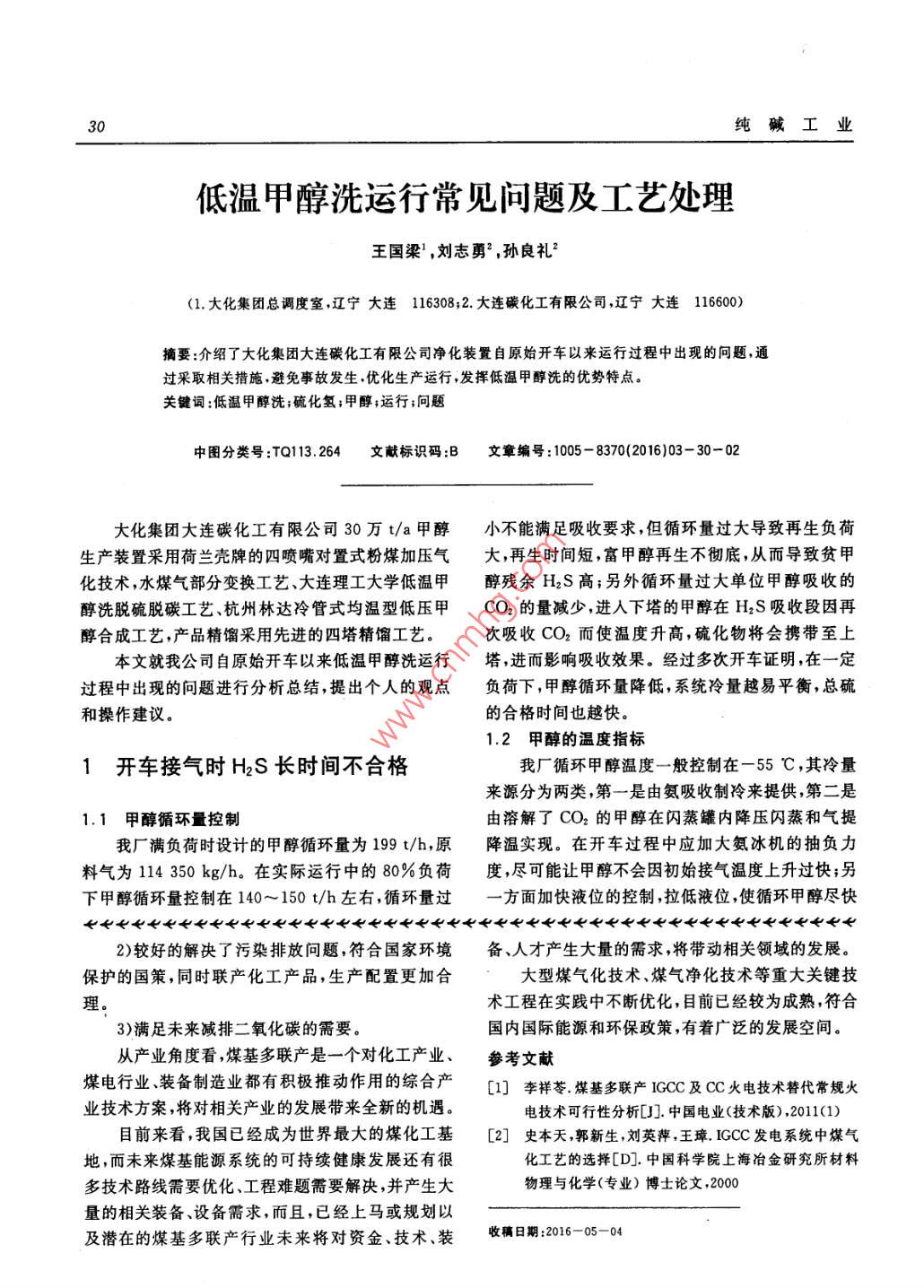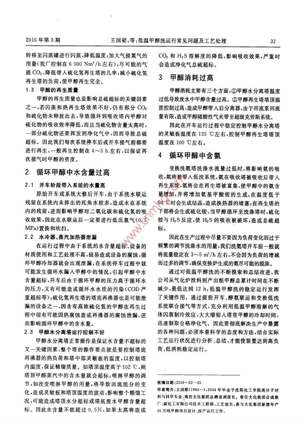 純堿工業(yè)低溫甲醇洗運(yùn)行常見問題及工藝處理王國梁,劉志勇2孫良禮2(1.大化集團(tuán)總調(diào)度室,遼寧大連116308;2.大連碳化工有限公司,遼寧大連116600摘要:介紹了大化集團(tuán)大連碳化工有限公司凈化裝置自原始開車以來運(yùn)行過程中出現(xiàn)的問題,通過采取相關(guān)措施避免事故發(fā)生,優(yōu)化生產(chǎn)運(yùn)行,發(fā)揮低溫甲醇洗的優(yōu)勢特點(diǎn)。關(guān)鍵詞:低溫甲醇洗;硫化氫;甲醇;運(yùn)行;問題中圖分類號:TQ113.264文獻(xiàn)標(biāo)識碼B文章編號:1005-8370(2016)03-30-02大化集團(tuán)大連碳化工有限公司30萬t/a甲醇小不能滿足吸收要求,但循環(huán)量過大導(dǎo)致再生負(fù)荷生產(chǎn)裝置采用荷蘭殼牌的四噴嘴對置式粉煤加壓氣大,再生時間短富甲醇再生不徹底,從而導(dǎo)致貧甲化技術(shù),水煤氣部分變換工藝、大連理工大學(xué)低溫甲醇?xì)堄郒2S高;另外循環(huán)量過大單位甲醇吸收的醇洗脫硫脫碳工藝、杭州林達(dá)冷管式均溫型低壓甲CO2的量減少,進(jìn)入下塔的甲醇在H2S吸收段因再醇合成工藝,產(chǎn)品精餾采用先進(jìn)的四塔精餾工藝次吸收CO2而使溫度升高,硫化物將會攜帶至上本文就我公司自原始開車以來低溫甲醇洗運(yùn)行塔,進(jìn)而影響吸收效果。經(jīng)過多次開車證明,在一定過程中出現(xiàn)的問題進(jìn)行分析總結(jié),提出個人的觀點(diǎn)負(fù)荷下,甲醇循環(huán)量降低,系統(tǒng)冷量越易平衡,總硫和操作建議的合格時間也越快1.2甲醇的溫度指標(biāo)1開車接氣時H2S長時間不合格我廠循環(huán)甲醇溫度一般控制在-55℃C,其冷量來源分為兩類,第一是由氨吸收制冷來提供,第二是1.1甲醇循環(huán)量控制由溶解了CO2的甲醇在閃蒸罐內(nèi)降壓閃蒸和氣提我廠滿負(fù)荷時設(shè)計(jì)的甲醇循環(huán)量為199t/h,原降溫實(shí)現(xiàn)。在開車過程中應(yīng)加大氨冰機(jī)的抽負(fù)力料氣為114350kg/h。在實(shí)際運(yùn)行中的80%負(fù)荷度,盡可能讓甲醇不會因初始接氣溫度上升過快;另下甲醇循環(huán)量控制在140~150t/h左右,循環(huán)量過方面加快液位的控制,拉低液位,使循環(huán)甲醇盡快七“““““““““““長2)較好的解決了污染排放問題,符合國家環(huán)境備、人才產(chǎn)生大量的需求將帶動相關(guān)領(lǐng)域的發(fā)展。保護(hù)的國策,同時聯(lián)產(chǎn)化工產(chǎn)品,生產(chǎn)配置更加合大型煤氣化技術(shù)、煤氣凈化技術(shù)等重大關(guān)鍵技理術(shù)工程在實(shí)踐中不斷優(yōu)化,目前已經(jīng)較為成熟,符合3)滿足未來減排二氧化碳的需要。國內(nèi)國際能源和環(huán)保政策,有著廣泛的發(fā)展空間。從產(chǎn)業(yè)角度看煤基多聯(lián)產(chǎn)是一個對化工產(chǎn)業(yè)、參考文獻(xiàn)煤電行業(yè)、裝備制造業(yè)都有積極推動作用的綜合產(chǎn)[1]李樣苓煤基多聯(lián)產(chǎn)IGC及CC火電技術(shù)替代常規(guī)火業(yè)技術(shù)方案,將對相關(guān)產(chǎn)業(yè)的發(fā)展帶來全新的機(jī)遇。電技術(shù)可行性分析[].中國電業(yè)(技術(shù)版),2011(1)目前來看,我國已經(jīng)成為世界最大的煤化工基[2]史本天郭新生,劉英萍,王璋GCC發(fā)電系統(tǒng)中煤氣地,而未來煤基能源系統(tǒng)的可持續(xù)健康發(fā)展還有很化工藝的選擇[D].中國科學(xué)院上海冶金研究所材料多技術(shù)路線需要優(yōu)化、工程難題需要解決,并產(chǎn)生大物理與化學(xué)(專業(yè))博士論文,2000量的相關(guān)裝備、設(shè)備需求,而且,已經(jīng)上馬或規(guī)劃以及潛在的煤基多聯(lián)產(chǎn)行業(yè)未來將對資金、技術(shù)、裝收稿日期:06-05-042016年第3期王國梁,等:低溫甲醇洗運(yùn)行常見問題及工藝處理轉(zhuǎn)移至閃蒸罐進(jìn)行閃蒸,降低溫度;加大氣提氮?dú)獾腃O2和H2S溶解度的降低,影響吸收效果,嚴(yán)重時用量(我廠控制在6000Nm3/h左右),盡可能的氣會造成凈化氣總硫超標(biāo)。提CO2,降低帶入硫化氫再生塔的幾率減小硫化氫再生塔的負(fù)荷,使甲醇再生完全。3甲醇消耗過高1.3甲醇的再生質(zhì)量甲醇消耗主要有三個方面:①甲醇水分離塔溫度甲醇的再生質(zhì)量也是影響總硫超標(biāo)的關(guān)鍵因素過低導(dǎo)致廢水中甲醇含量過高。②甲醇再生塔塔頂溫之一,若閃蒸和熱再生塔效果不好,仍有部分CO2度控制過高造成甲醇帶入后分離器,由于回流泵回流和硫化物未釋放出去,導(dǎo)致循環(huán)到吸收塔內(nèi)甲醇對量有限造成甲醇隨酸性氣夾帶至超級克勞斯系統(tǒng)。硫化物的吸收效率降低,而且當(dāng)硫化物含量太高時,因此在開車運(yùn)行過程中穩(wěn)定控制甲醇水分離塔一部分硫化物還要揮發(fā)到凈化氣中,因而導(dǎo)致總硫的靈敏板溫度在135℃左右,控制甲醇再生塔塔頂超標(biāo)。因此我們每次系統(tǒng)停車后或開車接氣前都要溫度在100℃左右。進(jìn)行再生,一般再生控制在4~5b左右,以保證再4循環(huán)甲醇中含氨次接氣時甲醇的貧度。2循環(huán)甲醇中水含量過高變換洗氨塔洗滌水流量過低時,將影響氨的吸收,氨將被帶入低洗系統(tǒng),氨在吸收塔被吸收后帶入2.1開車階段帶入系統(tǒng)的水量高再生系統(tǒng)氨將會在再生塔被富集使甲醇中的氨含原始開車或系統(tǒng)大修后開車,由于系統(tǒng)水聯(lián)運(yùn)量增加,