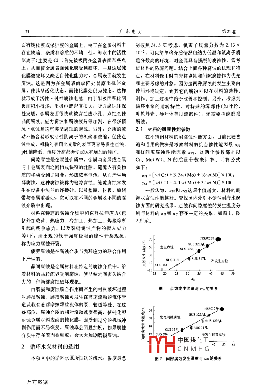 第21卷第12期廣東電力Vol. 21 No. 12208年12月GUANGDONG ELECTRIC POWERDec.2008文章編號:1007-290X(2008)120073-04華能海門電廠循環(huán)水泵材料的選用朱德勇',姜華偉2,髙建強(1.華能國際電力股份有限公司廣東分公司,廣東汕頭515071;2.華北電力大學動力系,河北保定071003)摘要:華能海門電廠規(guī)劃建設的超趯臨界燃煤發(fā)電機組采用以海水為抽謎介質的循環(huán)水泵。針對海水對金屬設備所具有的強腐蝕性,為保障水泵的可靠性和使用壽命,對海水的腐蝕特點以及各種耐海水腐蝕材料的特性進行了深入的研究、分析,認為海門電廠新建杌組中與海水接觸部位的循環(huán)水泵零件應采用雙相不銹鋼材料,并推薦采用0r22NiMo3N雙相不銹鋼,該材料的抗點蝕性能因數為36,抗間隙腐蝕性能因數為42,能夠滿足海門電廠循環(huán)水泵對耐海水腐蝕性能的要求。關鍵詞:循環(huán)水泵;材料;海水;腐蝕;雙相不銹鋼中圖分類號:TK265文獻標志碼:BSelection of Circulating Water Pump Materials inHuaneng Haimen Power PlantZHU De-yong, JIANG Hua-wei, GAO Jian-qiang(1. Huaneng Power International, Inc. Guangdong Branch. Shantou, Guangdong 515071, China; 2. Dept. of Power,North China Electric Power Univ, Baoding, Hebei 071003, ChinaAbstract: Several ultra-supercritical coal-fired power generating units are to be built in Huaneng Haimen Power Plant. Thecirculating water pumps use seawater as the medium. Because of the high corrosion of seawater to metal equipments, inrder to ensure the reliability and service life of the circulating water pumps, a deep research into the corrosion characteristicof seawater and the seawater corrosion resistance of materials is done in this paper. After the research, duplex stainless steelsare considered to be used as the materials of circulating water pump parts which are contacted with seawater. The use ofoOCr22Ni5Mo3N duplex stainless steel is recommended, whose pitting resistance factor is 36 and the gap corrosion resistancefactor is 42, meeting the demand of seawater corrosion resistance of circulating water pumps in Huaneng Haimen PowerKey words: circulating water pump; material; seawater; corrosion; duplex stainless steel華能海門電廠位于汕頭市潮陽區(qū)海門鎮(zhèn)東南角合理選擇耐海水腐蝕的材料,是循環(huán)水泵設計的首洪洞村,廠址位于塘邊灣西側海岸,電廠總規(guī)劃建要關鍵點。要做到這點,就必須對海水的腐蝕特點設6×1036MW國產超超臨界燃煤發(fā)電機組,以及各種耐海水腐蝕材料的特性進行深人的研究分期工程先建設1號、2號機組,安裝2×1036MW析,并結合實際的使用經驗,才能取得比較良好的國產超超臨界燃煤發(fā)電機組,循環(huán)冷卻水系統(tǒng)采用結果。單元制直流供水系統(tǒng)從環(huán)保的需要出發(fā),華能海門電廠循環(huán)水泵抽1海水腐蝕的機理與特點送的介質為原海水。由于海水是含鹽量很高的強電海水腐蝕一般有以下幾種:點蝕、間隙腐蝕、解質溶液,對金屬設備具有嚴重的腐蝕性因此,應凵中國煤化工陽磨摜腐蝕,這些如何針對華能海門電廠循環(huán)水泵的實際使用情況,腐叫CNMHG同時又相互影響。點蝕又稱坑蝕和小孔腐蝕。點蝕主要發(fā)生在表收稿日期:20080708廣東電力第21卷面有鈍化膜或保護膜的金屬上。由于在金屬材料中劣按照31.3℃考慮,氯離子質量分數為2.13存在缺陷、雜質和溶質的不均一性,海水中的活性10-2,可以簡單將介質情況歸結為低溫和氯離子質陰離子(主要是Cl)首先被吸附在金屬表面某些點量分數高的環(huán)境,對金屬具有強烈的腐蝕性,需考上,從而使金屬表面鈍化膜受到破壞。一旦這層鈍慮材料的防腐問題。結合上面各種腐蝕的機理和特化膜被破壞又缺乏自鈍化能力時,金屬表面就發(fā)生點,在材料選用時首先將點蝕和間隙腐蝕作為優(yōu)先腐蝕。這是因為在金屬表面缺陷處易露出機體金和主要考慮的對象,因為這兩種腐蝕的發(fā)生主要由屬,使其呈活化狀態(tài),而鈍化膜處仍為鈍態(tài),這樣使用環(huán)境決定,而其它的腐蝕可以在材料的選擇、就形成了活性ˉ鈍性腐蝕電池,由于陽極面積比陰制作、加工過程中給予改善和控制。另外,考慮到極面積小得多,陽極電流密度很大,所以腐蝕往深循環(huán)水泵的運轉特性,對特殊的零部件(如葉輪、處發(fā)展,金屬表面很快就被腐蝕成小孔。點蝕會使葉輪外殼、導葉體等過流部件),還需要考慮磨損晶間腐蝕、應力腐蝕和腐蝕疲勞等加劇,在很多情腐蝕。況下點蝕是這些類型腐蝕的起源。另外,介質的流2.1材料的耐腐性能參數動不暢容易形成活性陰離子的積聚和濃縮,促使點在不銹鋼材料的耐腐蝕性能方面,目前比較普蝕生成。粗糙的表面比光滑的表面更容易發(fā)生點蝕。遍和通用的做法是考察材料的抗點蝕性能因數aPpH值降低、溫度升高都會使點蝕有增加的傾向。和抗間隙腐蝕性能因數ad。這兩個參數都是以間隙腐蝕是在腐蝕介質中,金屬與金屬或金屬Cr、Mo(W)、N的質量分數來計算。計算公式與非金屬表面之間構成狹窄的縫隙,縫隙內有關物如下:質的移動受到了阻滯,形成濃差電池,從而產生局ap=[w(Cr)+3.3w(Mo)+16(N)]×100部腐蝕,這種腐蝕被稱為縫隙腐蝕。縫隙腐蝕常發(fā)ac=[w(Cr)+4.1wMo)+27ν(N)]×100.生在設備中法蘭的連接處,以及墊圈、襯板、纏繞一般認為,a門和ac這兩個值越大,材料的耐帶與金屬重疊處,它可以在不同的金屬及不同的腐海水腐蝕性能越好。查找國內外對不銹鋼耐海水腐蝕介質中出現(xiàn)。蝕方面的研究成