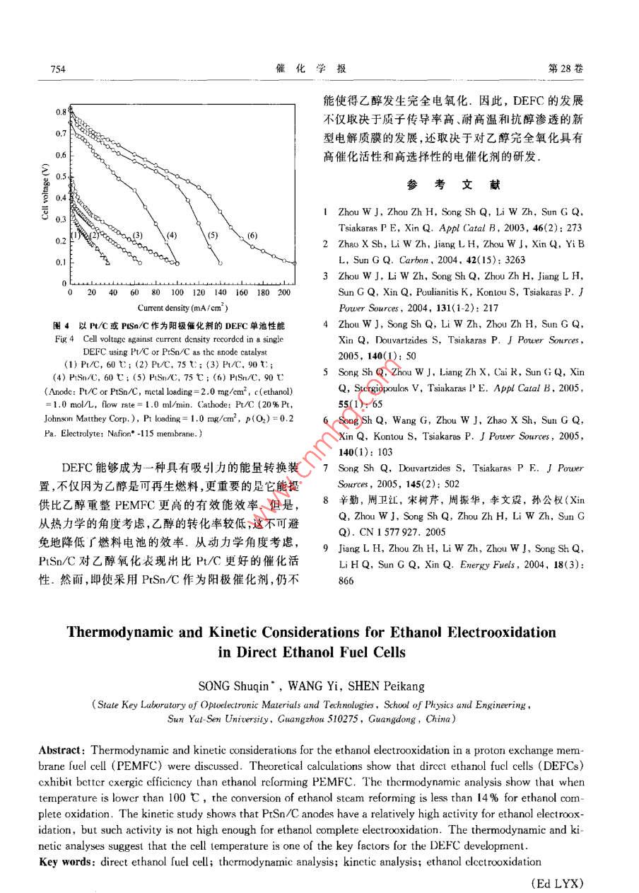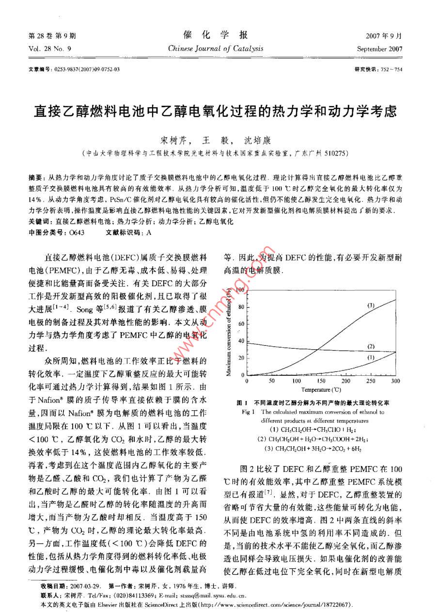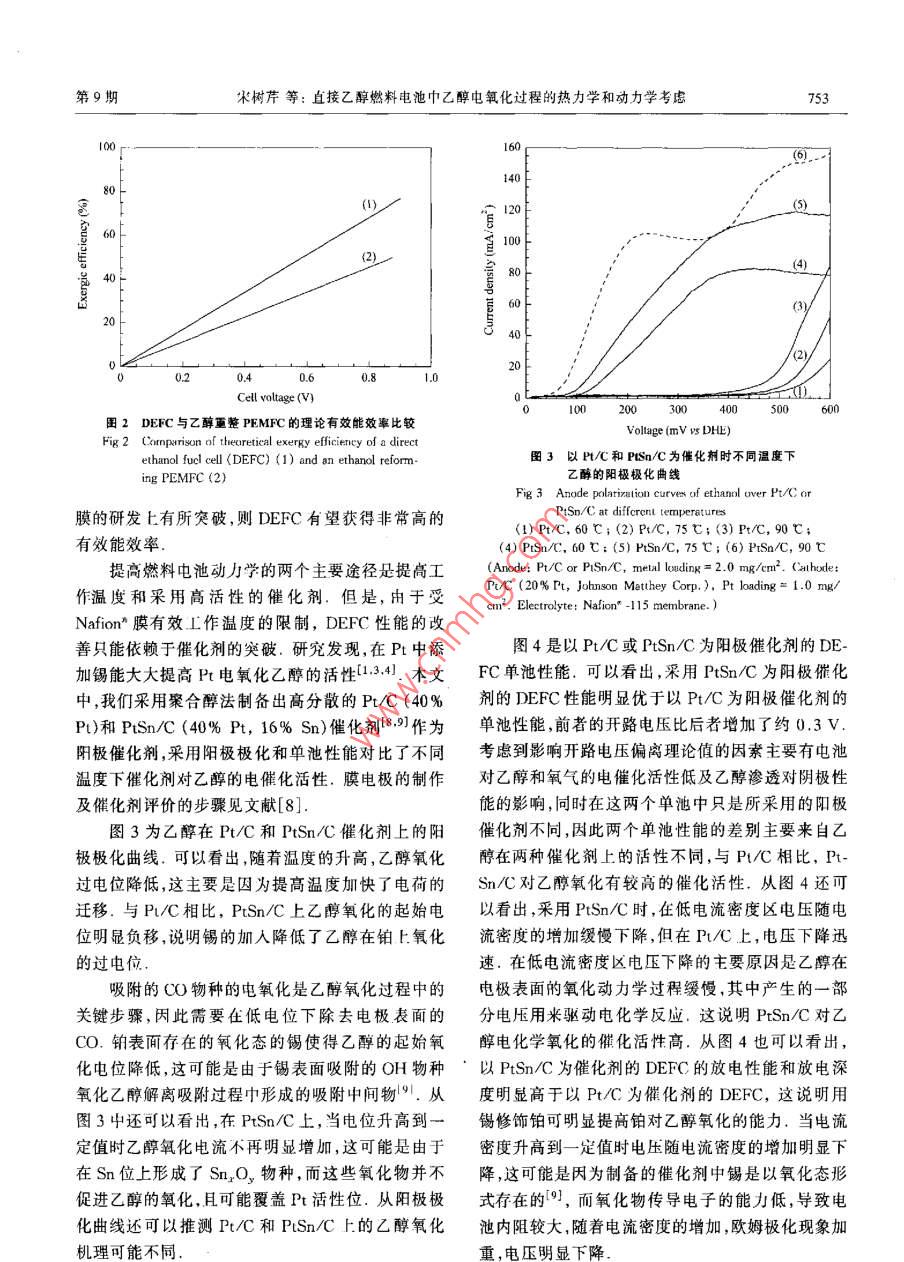 第28卷第9期催化學(xué)報2007年9月Vol. 28 No. 9Chinese Journal of catalystSeptember 2007文覃編號:02539837(2007)09075203研究快訊:752~754直接乙醇燃料電池中乙醇電氧化過程的熱力學(xué)和動力學(xué)考慮宋樹芹,王毅,沈培康(中山大學(xué)物理科學(xué)與工程技術(shù)學(xué)院光電材料與技術(shù)國家重點實驗室,廣東廣州510275)摘要:從熱力學(xué)和動力學(xué)角度討論了質(zhì)子交換膜燃料電池中的乙醇電氧化過程.理論計算得出育接乙醇燃料電池比乙牌重整質(zhì)子交換膜燃料電池具有較高的有效能效率,從熱力學(xué)分析可知,溫度低于100℃時乙醇完全氧化的最大轉(zhuǎn)化率僅為14%從動力學(xué)角度考慮,PSmC催化劑對乙醇電氧化具有較高的催化話性但仍不能使乙醇發(fā)生完全電氧化熱力學(xué)和力學(xué)分析表明操作溫度是影響直接乙醇燃料電池性能的關(guān)鍵因素,它對開發(fā)新型催化劑和電解質(zhì)膜材料提出了新的要求關(guān)鍵詞:直接乙醇燃料電池;熱力學(xué)分析;動力學(xué)分析;乙醇電氧化中圖分類號:0643文獻(xiàn)標(biāo)識碼:A直接乙醇燃料電池(DEFC)屬質(zhì)子交換膜燃料等.因此,為提高DEFC的性能,有必要開發(fā)新型耐電池( PEMFC),由于乙醇無毒、成本低、易得、處理高溫的電解質(zhì)膜便捷和比能量高而備受關(guān)注.有關(guān)DEFC的大部分L作是開發(fā)新型高效的陽極催化劑,且已取得了很10大進(jìn)展1-41.Song等56報道了有關(guān)乙醇滲透、膜電極的制備過程及其對單池性能的影響.本文從動86力學(xué)與熱力學(xué)角度考慮了 PEMFC中乙醉的電氧化14過程眾所周知,燃料電池的工作效率正比于燃料的轉(zhuǎn)化效率,一定溫度下乙醇重整反應(yīng)的最大可能轉(zhuǎn)0化率可通過熱力學(xué)計算得到,結(jié)果如圖1所示.由200250perature(℃于 Nafion膜的質(zhì)子傳導(dǎo)率直接依賴于膜的含水圖1不同溫度時乙醇分解為不同產(chǎn)物的最大理論轉(zhuǎn)化率量,因而以 Nafion·膜為電解質(zhì)的燃料電池的工作Fig 1 The calculaled maximum conversion of ethanol to溫度局限在100℃以下.從圖1可以看出,當(dāng)溫度different produets at different temperatures(1) CH, CELOH→CH2CIO|H2;<100℃,乙醇氧化為CO2和水時,乙醇的最大轉(zhuǎn)(2)CH, CH,OH+H2O-CH3COOH+2H2:換效率低于14%,這使燃料電池的工作效率較低(3)CH, CH, OH 3H2o--2C0,+再者,考慮到在這個溫度范圍內(nèi)乙醇氧化的主要產(chǎn)圖2比較了DEFC和乙醇重整 PEMFC在100物是乙醛、乙酸和CO2,我們也計算了產(chǎn)物為乙醒℃時的有效能效率,其中乙醇重整 PEMFC系統(tǒng)模和乙酸時乙醇的最大可能轉(zhuǎn)化率。由圖1可以看型已有報道7.顯然,對于DEFC,乙醇重整裝置的出,當(dāng)產(chǎn)物是乙醛時乙醇的轉(zhuǎn)化率隨溫度的升高而省略可節(jié)省大量的有效能這些能量可轉(zhuǎn)化為電能,增大,而當(dāng)產(chǎn)物為乙酸時卻相反,當(dāng)溫度高于150從而使DEFC的效率增高圖2中兩條直線的斜率℃,產(chǎn)物為CO2時,乙醇的理論最大轉(zhuǎn)化率最高.不同是由電池系統(tǒng)中氫的利用率不同造成的.但另一方畝,工作溫度低(<100℃)會降低DEC的是,當(dāng)前的技術(shù)水平不能使乙醇完全氧化,而乙醇滲性能包括從熱力學(xué)角度得到的燃料轉(zhuǎn)化率低、電極透也同樣會導(dǎo)致電壓損失.如果電催化劑的改善能動力學(xué)過程緩慢、電催化劑中毒以及催化劑載量高使乙醇在低過電位下完全氧化,同時在新型電解質(zhì)收稿日期:200703-29.第一作者:宋樹芹,女,1976年生,博士,講師聯(lián)系人:宋樹芹.Te/Fax:(020)84113369;Fmil;ssyg@mail.sysu.edu本文的英文電子版由Elsevier出版社在Scienceliret上出版(htp://www.sciencedirect.aom/cience/journal/8722067)第9期木樹芹等:直接乙醇燃料電池中乙醇電氧化過程的熱力學(xué)和動力學(xué)考慮753圖2DEFC與乙醇重整 PEMFC的理論有效能效率比較Voltage(mv vs DHEFig 2 Comprison of thearetical exergy efficieney of a directthanol fucl cell (DEFC)(1)and an ethanol refon圖3以PC和PSn/C為催化劑時不同溫度下ing PEMFC (2)醇的陽極極化曲線Fig 3 Anode polarization curves of ethanol uver Pt/C or膜的研發(fā)上有所突破,則DEFC有望獲得非常高的PiSn/C at diffcrcnt temperatures(1)Pt/C,60℃;(2)PtC,75℃;(3)PtC,90℃有效能效率(4)PtSn/C,60℃;(5)PSnC,75℃;(6) PISn/c,90℃提高燃料電池動力學(xué)的兩個主要途徑是提高工(Aok: Pt/C or Pisn/C, metal londing=2.0mgm2 CaI hode:作溫度和采用高活性的催化劑.但是,由于受Pu/C(20%rt, Johnson Matthey Corp ) Pt loading =1.0 mgcm.Electrolyte: Nafion"-115 membraneNafion膜有效工作溫度的限制,DEFC性能的改善只能依賴于催化劑的突破.研究發(fā)現(xiàn),在Pt中添圖4是以PtC或PSn/C為陽極催化劑的DE加錫能大大提高Pt電氧化乙醇的活性.41.本文FC單池性能.可以看出,采用PSnC為陽極催化中,我們采用聚合醇法制備出高分散的Pt/C(40%劑的DEFC性能明顯優(yōu)于以PtC為陽極催化劑的P()和PSnC(40%Pt,16%Sn)催化劑89作為單池性能,前者的開路電壓比后者增加了約0.3V陽極催化劑,采用陽極極化和單池性能對比了不同考慮到影響開路電壓偏離理論值的因素主要有電池溫度下催化劑對乙醇的電催化活性.膜電極的制作對乙醇和氧氣的電催化活性低及乙醇滲透對陰極性及催化劑評價的步驟見文獻(xiàn)[8]能的影響,同時在這兩個單池中只是所采用的陽極圖3為乙醇在PtC和 PtSn/C催化劑上的陽催化劑不同,因此兩個單池性能的差別主要來自