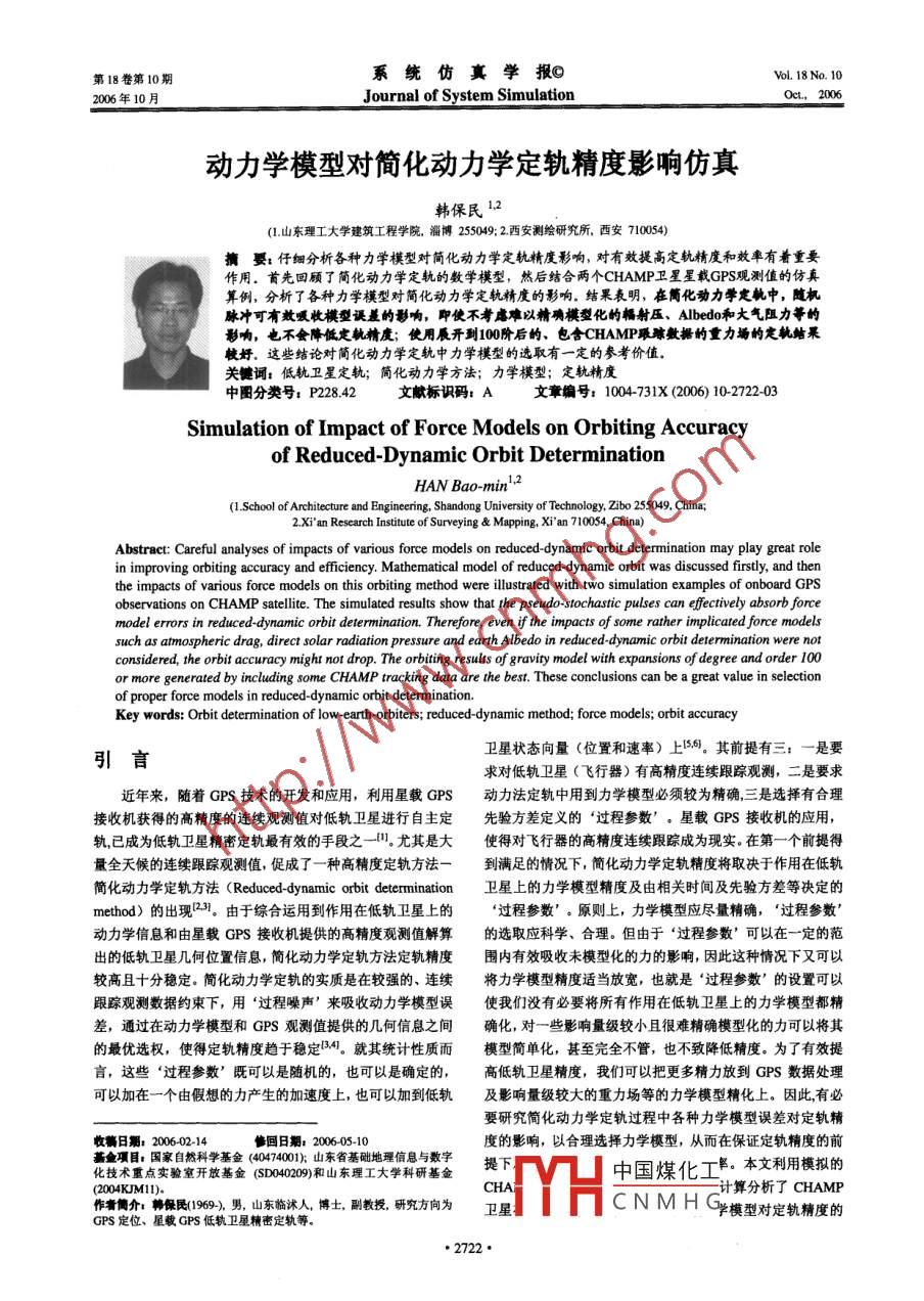 第18卷第10期系統(tǒng)仿真學報Vol. 18 No. 102006年10月Journal of System Simulation動力學模型對簡化動力學定軌精度影響仿真韓保民12山東理工大學建筑工程學院,淄博25049:2西安測繪研究所,西安710054)擴嬰:仔細分析各種力學模型對簡化動力學定軌精度彩響,對有效提高定軌精度和效率有著重要作用。黃先回顧了簡化動力學定軌的數(shù)學模型,然后結合兩個 CHAMP衛(wèi)星星載GPS觀測值的仿真算例,分析了各種力學模型對簡化動力學定軌精度的影響。結果表明,在簡化動力學定軌中,隨機脈沖可有效吸收模型誕羞的影響,即使不考慮難以精確模型化的幅射壓、 Albedo和大氣阻力等的彩響,也不會降低定軌瀚度;使用辰開到100階后的,包含 CHAMP跟琳數(shù)據(jù)的重力場的定軌結果楗妤。這些結論對簡化動力學定軌中力學模型的選取有一定的參考價值關健詞:低軌衛(wèi)星定軌;簡化動力學方法;力學模型;定軌精度中圖分類號:P22842文獻標識碼:A文章編號:1004731X(2006)10272203Simulation of Impact of Force Models on Orbiting Accuracyof Reduced-Dynamic Orbit DeterminationHAN Bao-min 2(1. School of Architecture and Engineering, Shandong University of Technology, Zibo 255049, China;2.Xi'an Research Institute of Surveying Mapping, Xi'an 710054, China)Abstract: Careful analyses of impacts of various force models on reduced-dynamic orbit determination may play great rolein improving orbiting accuracy and efficiency. Mathematical model of reduced-dynamic orbit was discussed firstly, and thenthe impacts of various force models on this orbiting method were illustrated with two simulation examples of onboard GPSobservations on CHAMP satellite. The simulated results show that the pseudo-stochastic pulses can effectively absorb forcemodel errors in reduced-dynamic orbit determination. Therefore, even if the impacts of some rather implicated force modelssuch as atmospheric drag, direct solar radiation pressure and earth Albedo in reduced-dynamic orbit determination were notconsidered, the orbit accuracy might not drop. The orbiting results of gravity model with expansions of degree and order 100or more generated by including some CHAMP tracking data are the best. These conclusions can be a great value in selectionof proper force models in reduced-dynamic orbit determinationey words: Orbit determination of low-earth-orbiters; reduced-dynamic method; force models; orbit accuracy衛(wèi)星狀態(tài)向量(位置和速率)上56。其前提有三:一是要求對低軌衛(wèi)星(飛行器)有高精度連續(xù)跟蹤觀測,二是要求近年來,隨著GPS技術的開發(fā)和應用,利用星載GPS動力法定軌中用到力學模型必須較為精確三是選擇有合理接收機獲得的高精度的連續(xù)觀測值對低軌衛(wèi)星進行自主定先驗方差定義的“過程參數(shù)’。星載GPS接收機的應用軌已成為低軌衛(wèi)星精密定軌最有效的手段之一。尤其是大使得對飛行器的高精度連續(xù)跟蹤成為現(xiàn)實。在第一個前提得量全天候的連續(xù)跟蹤觀測值,促成了一種高精度定軌方法一到滿足的情況下,簡化動力學定軌精度將取決于作用在低軌簡化動力學定軌方法( Reduced- dynamic orbit determination衛(wèi)星上的力學模型精度及由相關時間及先驗方差等決定的method)的出現(xiàn)3。由于綜合運用到作用在低軌衛(wèi)星上的過程參數(shù)’。原則上,力學模型應盡量精確,‘過程參數(shù)動力學信息和由星載GPs接收機提供的高精度觀測值解算的選取應科學、合理。但由于“過程參數(shù)’可以在一定的范出的低軌衛(wèi)星幾何位置信息,簡化動力學定軌方法定軌精度圍內(nèi)有效吸收未模型化的力的影響,因此這種情況下又可以較高且十分穩(wěn)定。簡化動力學定軌的實質(zhì)是在較強的、連續(xù)將力學模型精度適當放寬,也就是‘過程參數(shù)’的設置可以跟蹤觀測數(shù)據(jù)約束下,用“過程噪聲’來吸收動力學模型誤使我們沒有必要將所有作用在低軌衛(wèi)星上的力學模型都精差,通過在動力學模型和GPS觀測值提供的幾何信息之間確化,對一些影響量級較小且很難精確模型化的力可以將其的最優(yōu)選權,使得定軌精度趨于穩(wěn)定B4。就其統(tǒng)計性質(zhì)而模型簡單化,甚至完全不管,也不致降低精度。為了有效提言,這些‘過程參數(shù)’既可以是隨機的,也可以是確定的,高低軌衛(wèi)星精度,我們可以把更多精力放到GPS數(shù)據(jù)處理可以加在一個由假想的力產(chǎn)生的加速度上,也可以加到低軌及影響量級較大的重力場等的力學模型精化上。因此有必要研究簡化動力學定軌過程中各種力學模型誤差對定軌精收稿日期:20060214修國日期度的影響,以合理選擇力學模型,從而在保證定軌精度的前化技術重點安驗室開放基金(x和理工大字學料研基提下中國煤化工解。本文利用模擬的作著介聊9)男山東臨球人博士,副教授研究方向為cAYH計算分析了 CHAMPGPS定位、星載GPS低軌衛(wèi)星精密定軌等。CNMHGY模型對定軌精度的2722·第18卷第10期Vol. 18 No. 102006年10月韓保民:動力學模型對簡化動力學定軌精度影響仿真Oct, 200影響以及定軌所能達到的精度得出了一些有益的結論對于間相關的、由先驗標準差定義的偽隨機脈沖(或過程噪聲)進一步研究簡化動力學定軌中各種力學模型的選擇,有效提來吸收模型誤差的影響隨機脈沖變化的大小由下列偽觀測高定軌精度,有一定的參考價值。方程定義向1簡化動力法定軌的數(shù)學模型11動力學定軌模型其權為:w=G/o(bv因此標量速度的變