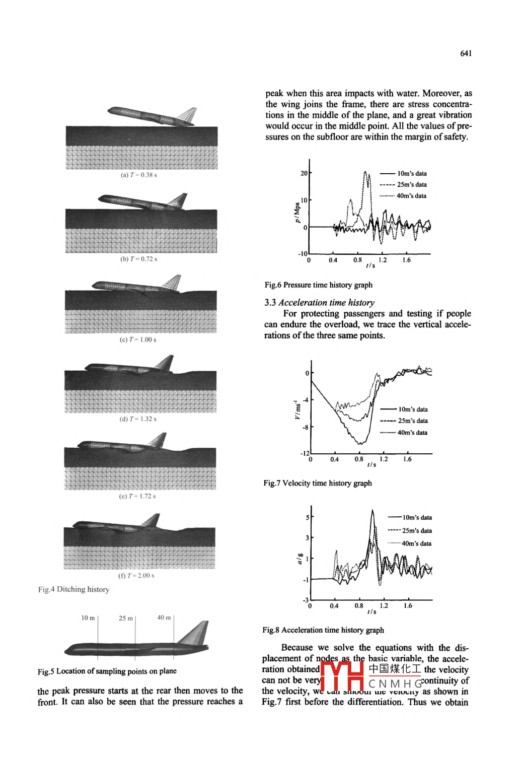 637Available online at www.sciencedirect.comScienceDirecttTTDtJoumal of HydrodynamicsEL SEVIER201 1 ,23(5):637-642www.sciencedirect.com/DOt: 10.1016/S1001-6058(10)60159-Xscienceljounal/10016058SIMULATION OF FLUID-SOLID INTERACTION ON WATER DITCHINGOF AN AIRPLANE BY ALE METHODHUA Cheng, FANG ChaoDepartment of Mechanics and Engineering Science, Fudan University, Shanghai 200433, China,E-mai: huacheng@fudan.edu.cnCHENG JinSchool of Mathematical Sciences, Fudan University, Shanghai 200433, China(Received March 21, 2011, Revised May 8, 2011)Abstract: Ditching is considered as one of the important aspects of safety performances of airplanes. It is related primarily with thefluid-solid interaction, whose studies mainly depend on experiments at the present time. Numerical and analytical methods forfluid- solid interaction by using 3-D full scale airplane' s model will reduce the dependence on the expensive model tests. Numericalstudies can be used to estimate the safety of ditching and provide a reference for the crashworthiness design. This article proposes a3-D dynamical structural model aftere real shapnape 'in airplane and an Arbitrary Lagrange-Euler (ALE) fluid-field model, tosimulate the fluid-solid interactions caused by low speed ditching. The simulation is based on interaction computational methods,within LS-DYNA nonlinear finite-element code. The results of pressure distributions and accelerating time histories of the airplane'ssubfloor are discussed in the context of the safety of ditching, and the simulation results and the analytical methods are verified.Key words: dithing, fluid structure interaction, Arbitrary Lagrange Euler (ALE), finite element methodIntroductiontheretically, experimentally or numerically. VonDitching means that a plane has no altermativeKarman (1929) developed the first theory for this pro-but to land on water surface such as sea or lake, inblem. This pioneering work uses the concept of addedview of the safety of crews and passengers. There aremass for investigation of impact loads on a seaplanesome cases of successful ditching, also some cases ofduring ditching. The majority of the subsequent theo-crashes. Airline companies have strict rules for di-retical work in the early period was based on Vontching". According to structural dynamics, an air-Karman's concept. The experimental techriques rela-plane should be in very low speed when ditching, theted with the problem were mainly developed bdeformation of an airplane can be approximately con-NASA since the late 1950s. Boeing airplanes weresidered as elastic-plastic, and it is feasible to simulatetested and the operating specifications of ditchingan airplane's ditching by using numerical analysiswere developed at that time. Recently, the numericalmethods such as finite element analysis.analysis is widely used in this respect.Unlike a ground impact, a large area of the air-Seddon and Moatamedil2l reviewed the studies ofplane's outer skin contacts with water in ditching.water entry and impact between 1929 and 2003, and itThusthe fluid-solid interaction and someis pointed out that the numerical analysis should be .mechanical problems should be primarily addressed.considered as a main choice, and accurate numericalThe problem of water entry and impact can be studiedmodels of fluid-solid jinteraction may replace expen-sive and time-consuming full-scaled tests. Brooks andAnderson'B] first used the finite element software, LS-* Project supported by the Shanghai Key Basic ResearchDYNA, to investigate the water entrv of spacecraft.Program of China (Grant No. 07JC14001).The simulation中國(guó)煤化工comparisonBiography: HUA Cheng (1963-), Male, Pb. D, Associatewith the full-HC N M H Gsponse afterProfessor30 ms-40 ms isut vcty atisiavwiy uause the fieldof fluid was calculated as a kind of solids in this soft-638with the development of ArbitraryKaren and Yvonnel3] used this program to analyze theLagrange-Euler (ALE)41 finite element method, Tuttvertical drop of a fuselage section, and the simulationand Taylor59 used an updated software to simulate theresults were compared with experimental tests, with awater landing characteristics of space vehicles, wheregood agreement.the fluid-field was defined by ALE elements. A com-In this article, we use this ALE solver in LS-parison between test data and numerical analysisDYNA for the part of the fluid-field.shows the value of using the finite element methodsIn the ALE description, the material derivativefor simulating the water entry and impact. Further-can be described as'more, numerical analysis of water impact was used foroptimal designs. Li et al.!6l used a cylinder model andaf(X,1)_ af(x,1)af(x,t)a similar method, to simulate the shell structure dro-(1)0tpping into water, and a comparison between simula-tion and experiment was made. Based on a numericalwhere x is the ALE coordinate, X is the Lagra-model, they optimized the material and the structure toenhance the safety of the, structure and to save thengian coordinate, x is the Eulerian coordinate.experiment time. Sun et al!T used a V-shaped plate inThe relative velocity c; =u, -v is introducedthe experiment to simulate a 2-D elastic wedge, theto simplify the equation, where u; is the velocity ofresponse of the structures in the water entry processthe material and v; is the velocity of the referentialwas dynamically measured, and the influences ofsome parameters were analyzed. Gong et al.o studiedcoordinate. Thus when x=X; or x=x, the ALEthe water entry of a wedge by the SPH method, anddescription becomes the Lagrange description or thewith an improved non-reflection boundary treatment.Euler description.Wei et al.9I studied the high-speed water entry impactThe goveming equations are as follows:of an underwater vehicle by the ALE method using(I) The equation for conservation of massMSC Dytran software, where the underwater vehiclewas treated as a rigid body, and different impact con-ap(x,t)__o 24_. apditions were considere