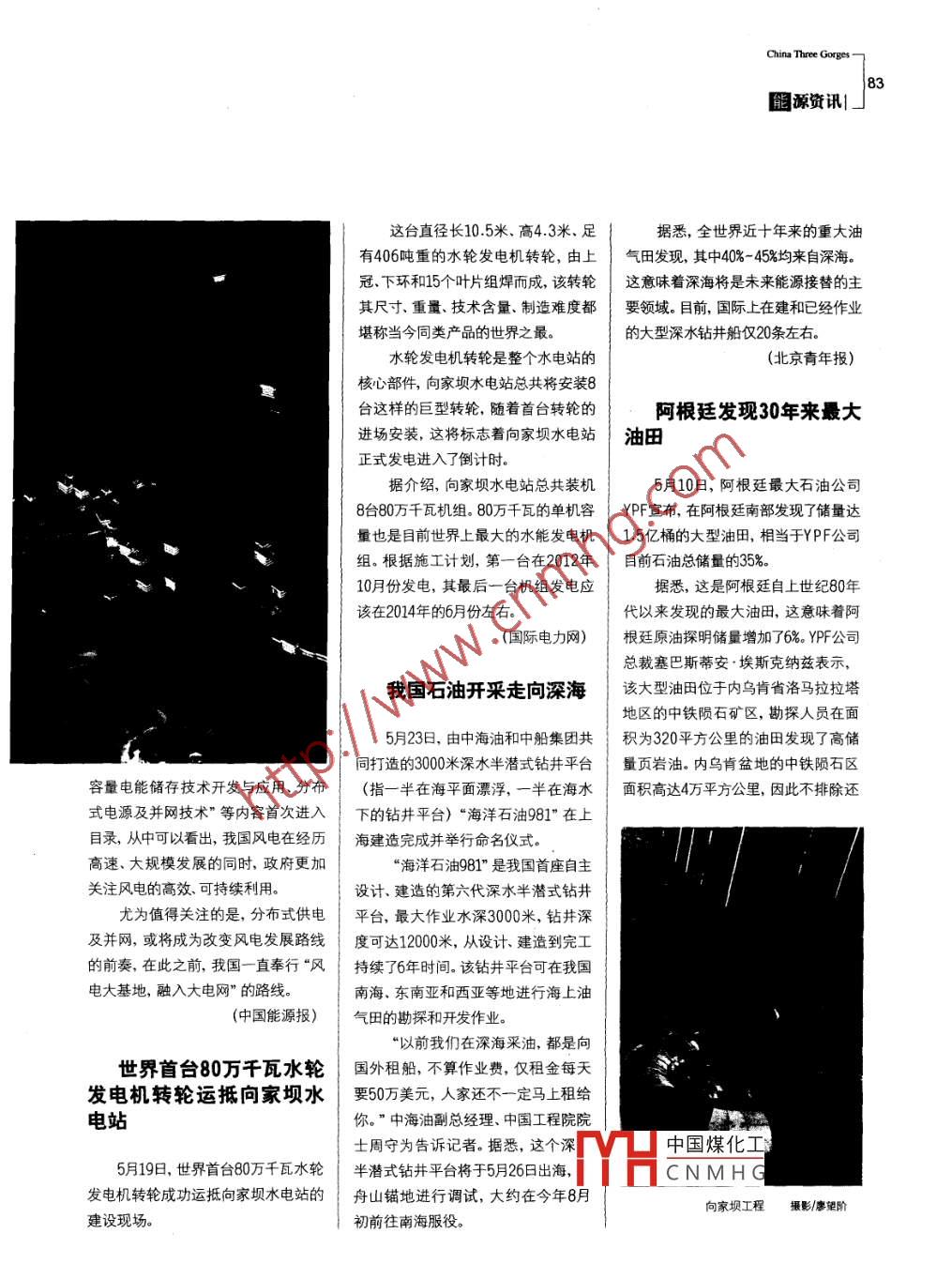 China Three Gorges83髓源資訊|這臺(tái)直徑長(zhǎng)10.5米.高4.3米.足據(jù)悉,全世界近十年來(lái)的重大油有406噸重的水輪發(fā)電機(jī)轉(zhuǎn)輪,由上氣田發(fā)現(xiàn),其中40%~ 45%均來(lái)自深海。冠、下環(huán)和15個(gè)葉片組焊而成,該轉(zhuǎn)輪這意味著深海將是未來(lái)能源接替的主其尺寸重量、技術(shù)含量、制造難度都要領(lǐng)域。目前,國(guó)際上在建和已經(jīng)作業(yè)堪稱(chēng)當(dāng)今同類(lèi)產(chǎn)品的世界之最。的大型深水鉆井船僅20條左右。水輪發(fā)電機(jī)轉(zhuǎn)輪是整個(gè)水電站的(北京青年報(bào))核心部件,向家壩水電站總共將安裝8臺(tái)這樣的巨型轉(zhuǎn)輪,隨著首臺(tái)轉(zhuǎn)輪的阿根廷發(fā)現(xiàn)30年來(lái)最大進(jìn)場(chǎng)安裝,這將標(biāo)志著向家壩水電站油田正式發(fā)電進(jìn)入了倒計(jì)時(shí)。據(jù)介紹,向家壩水電站總共裝機(jī)5月10日,阿根廷最大石油公司8臺(tái)80萬(wàn)千瓦機(jī)組。80萬(wàn)千瓦的單機(jī)容YPF宣布,在阿根廷南部發(fā)現(xiàn)了儲(chǔ)量達(dá)量也是目前世界上最大的水能發(fā)電機(jī)1.5億桶的大型油田,相當(dāng)于YPF公司組。根據(jù)施工計(jì)劃,第一臺(tái)在2012年目前石油總儲(chǔ)量的35%。10月份發(fā)電,其最后-臺(tái)機(jī)組發(fā)電應(yīng)據(jù)悉,這是阿根廷自上世紀(jì)80年該在2014年的6月份左右。代以來(lái)發(fā)現(xiàn)的最大油田,這意味著阿(國(guó)際電力網(wǎng))根廷原油探明儲(chǔ)量增加了6%。YPF公司.總裁塞巴斯蒂安.埃斯克納茲表示,我國(guó)石油開(kāi)采走向深海該大型油田位于內(nèi)烏肯省洛馬拉拉塔地區(qū)的中鐵隕石礦區(qū),勘探人員在面5月23日,由中海油和中船集團(tuán)共積為320平方公里的油田發(fā)現(xiàn)了高儲(chǔ)同打造的3000米深水半潛式鉆井平臺(tái)量頁(yè)巖油。內(nèi)烏肯盆地的中鐵隕石區(qū)容量電能儲(chǔ)存技術(shù)開(kāi)發(fā)與應(yīng)用、分布(指一半在海平面漂浮,一半在海水面積高達(dá)4萬(wàn)平方公里,因此不排除還式電源及并網(wǎng)技術(shù)”等內(nèi)容首次進(jìn)入下的鉆井平臺(tái))“海洋石油981"在上目錄,從中可以看出,我國(guó)風(fēng)電在經(jīng)歷海建造完成并舉行命名儀式。高速、大規(guī)模發(fā)展的同時(shí),政府更加“海洋石油981”是我國(guó)首座自主關(guān)注風(fēng)電的高效、可持續(xù)利用。設(shè)計(jì).建造的第六代深水半潛式鉆井尤為值得關(guān)注的是,分布式供電平臺(tái),最大作業(yè)水深3000米,鉆井深及并網(wǎng),或?qū)⒊蔀楦淖冿L(fēng)電發(fā)展路線度可達(dá)12000米,從設(shè)計(jì)、建造到完工的前奏,在此之前,我國(guó)一-直奉行“風(fēng)持續(xù)了6年時(shí)間。該鉆井平臺(tái)可在我國(guó)電大基地,融入大電網(wǎng)”的路線。南海、東南亞和西亞等地進(jìn)行海上油(中國(guó)能源報(bào))氣田的勘探和開(kāi)發(fā)作業(yè)?!耙郧拔覀?cè)谏詈2捎?都是向世界首臺(tái)80萬(wàn)千瓦水輪國(guó)外租船, 不算作業(yè)費(fèi),僅租金每天發(fā)電機(jī)轉(zhuǎn)輪運(yùn)抵向家壩水要50萬(wàn)美元,人家還不一定馬上租給電站你。”中海油副總經(jīng)理、中國(guó)工程院院士周守為告訴記者。據(jù)悉,這個(gè)深中國(guó)煤化工5月19日,世界首臺(tái)80萬(wàn)千瓦水輪半潛式鉆井平臺(tái)將于5月26日出海,MHCNMHG發(fā)電機(jī)轉(zhuǎn)輪成功運(yùn)抵向家壩水電站的舟山錨地進(jìn)行調(diào)試,大約在今年8月向家壩工程攝影/廖望階建設(shè)現(xiàn)場(chǎng)。初前往南海服役。