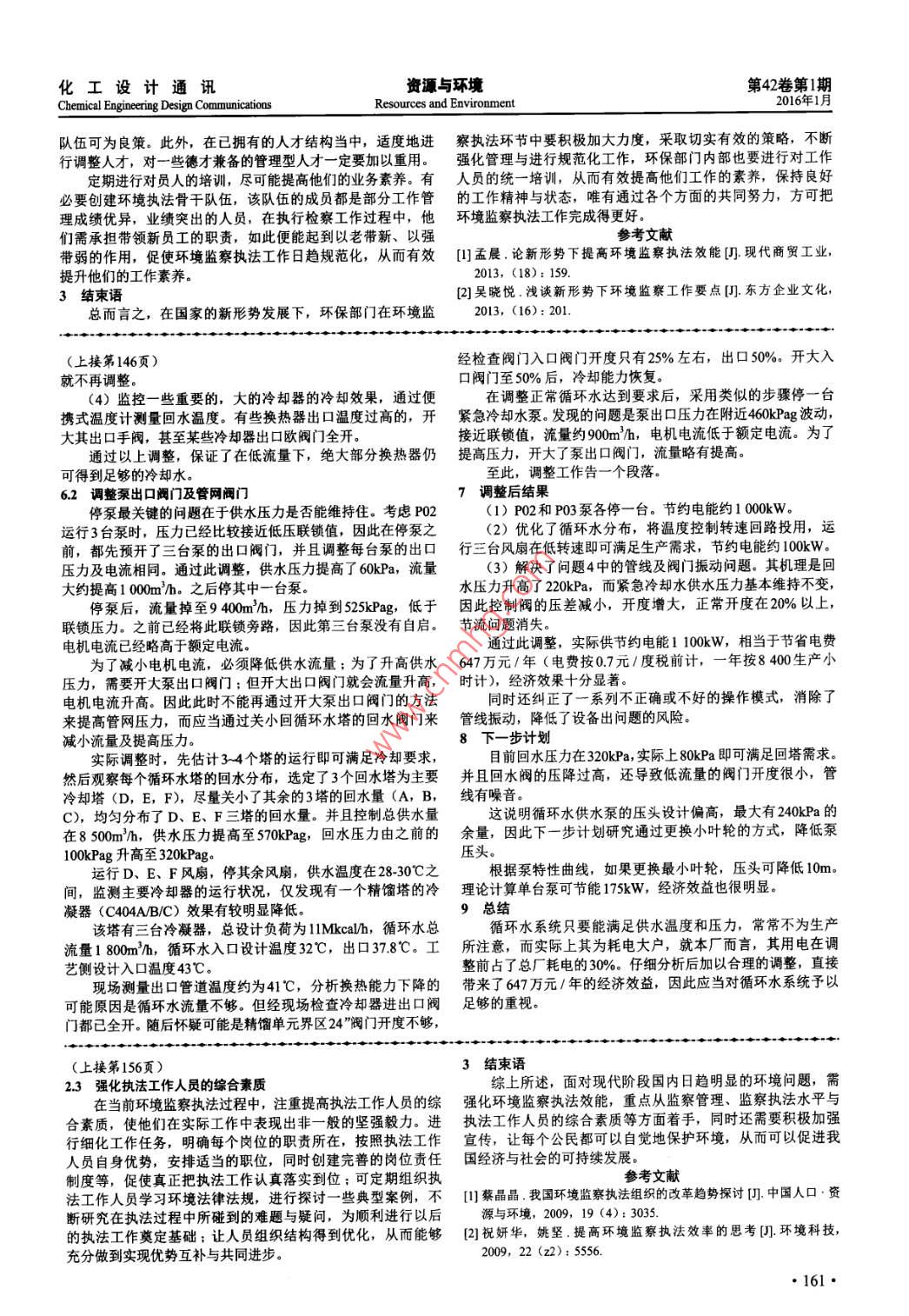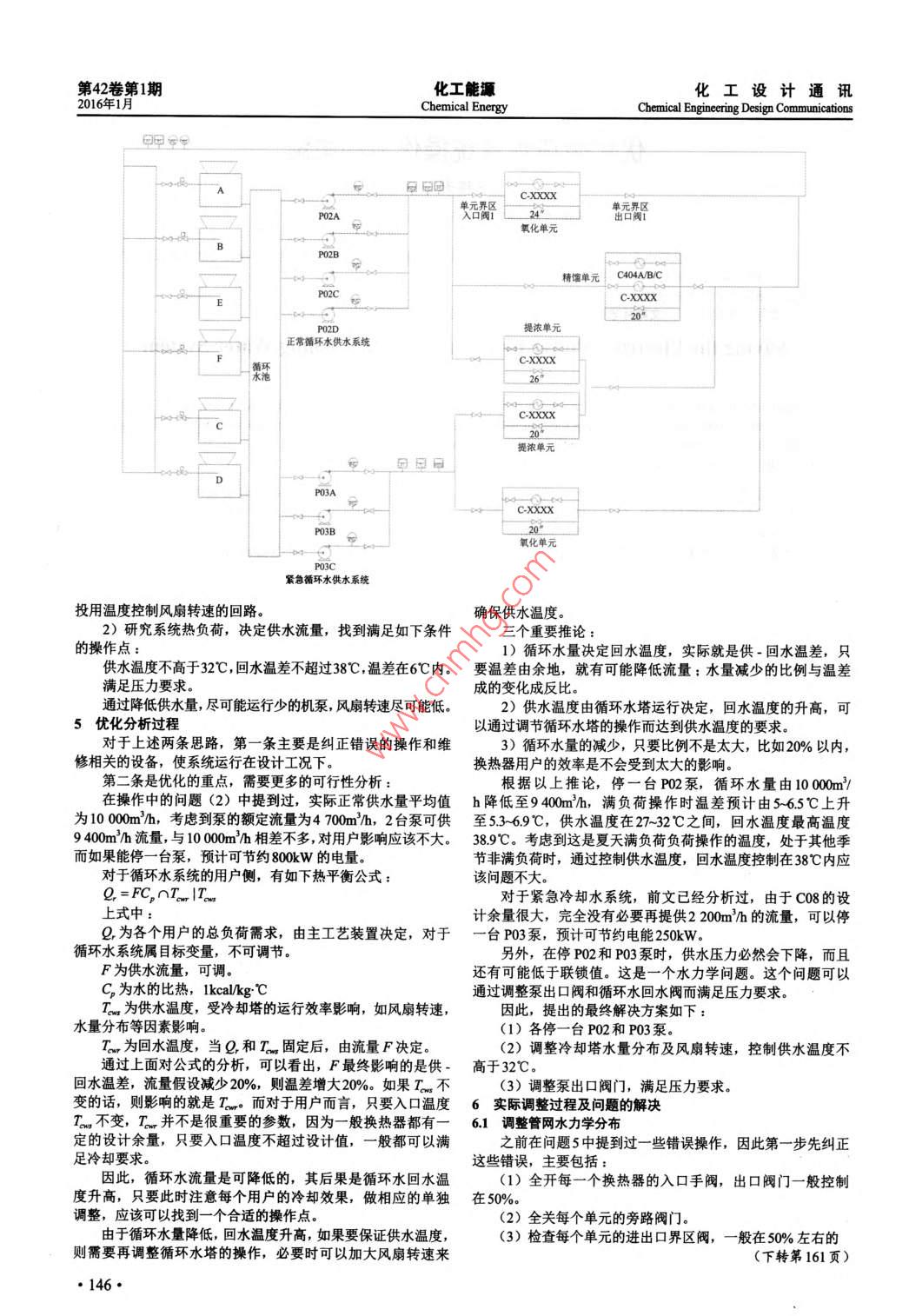化工設計化工能源第42卷第1期Chemical Engineering Design CommunicationsChemical Energy2016年1月優(yōu)化循環(huán)水系統(tǒng)操作節(jié)約電能陳瑞利(西薩化工上海有限公司,上海201507)摘要:分析了某廠的循環(huán)水系統(tǒng)運狀態(tài),分析了運行中發(fā)現(xiàn)的問題,提出解決方案;更進一步通過熱平衡及水力學分析,優(yōu)化操作,取得了647萬元/a的經(jīng)濟效益。關鍵詞:循環(huán)水;優(yōu)化;節(jié)能中圖分類號:TQ0854文獻標志碼:A文章編號:10036490(2016)01-014503Saving the Electrical Power by Optimizing the Cooling Water SystemChen rui-liAbstract: Studied the performance of cooling water system of a plant, pointed out the control problem and proposed theimprovement plans: furthermore by analyzing the heat balance and hydraulic performance of the system, optimized the operation6. 47MRMB/year electrical power cost was saved after the optimizationKey words: cooling water system; optimization energy saving循環(huán)水系統(tǒng)是化工廠最常見的冷卻系統(tǒng),其特點是流量2)泵出口手閥開度過小。由于此閥門為30”蝶閥,開關高,一般在數(shù)千至上萬立方每小時,循環(huán)水供水泵及冷卻水塔比較困難,操作工一般將出口閥開的很小,導致此手閥的壓風扇的功率在兆瓦級。合理的根據(jù)裝置負荷、氣候情況、冷降損失很大,對比泵出口壓力和總管壓力,此閥門的壓降為卻器的效率調(diào)整循環(huán)水系統(tǒng)的運行可以取得顯著的節(jié)電效果。150kPa。由于總管上有一個530kPa的低壓聯(lián)鎖,為了保持壓力本文以某工廠的循環(huán)水系統(tǒng)優(yōu)化實例說明了如何通過合3臺泵必須要開啟,否則壓力就不夠。三臺泵總共供水量只有理調(diào)節(jié)達到節(jié)電效果。9500-10500m3h,平均每臺泵供水只有3200-3500m/h1循環(huán)水系統(tǒng)介紹3)由于設計余量,加之開車初期,裝置負荷不高,即便本工廠循環(huán)水系統(tǒng)的主流程框圖參考下圖,系統(tǒng)包括了在3天的100%負荷測試的時間里,循環(huán)水塔的負荷也只有最如下主要設備高73 Mical/h,供水溫度在27-32℃,回水溫度在32~37℃之間,1)正常循環(huán)水供水泵P02AD,每臺泵的額定流量為4700溫差在565℃之間m3/h,功率950kW,按設計3開1備。4)緊急冷卻水的正常用戶只有3臺,其中2臺不大,總2)緊急循環(huán)水供水泵P03A~C,每臺泵的設計流量為1400設計流量只有20m3/h,而另有一臺冷卻器,C08,其設計負m3h,功率325kW。按設計2開1備。此泵與柴油發(fā)電機連接,荷為178 Mical/h,冷卻水設計流量為2200m3/h。但根據(jù)實際在外界供電停供狀態(tài)下仍可供水運行數(shù)據(jù)來看,此換熱器的設計面積遠大于實際需求,導致3)6臺冷卻水塔AF及循環(huán)水池,其中C~F為變頻風機;循環(huán)水平均流量在40m/h即可滿足換熱要求,這意味著緊急A、B塔為緊急冷卻塔,風機固定轉速,并與柴油發(fā)電機連接,冷卻水量只要600m/h就可滿足需求。在停電時風扇仍可運行順便提一下,此處有低循環(huán)水量引起管道閥門震動問題4)若干冷卻水用戶級相關閥門、管道、儀表等C08是通過控制循環(huán)水流量來控制換熱量,而控制閥是按照正冷卻塔的設計條件如下常流量2200m/h而設計的,由于現(xiàn)在平均流量只有400m/h正常循環(huán)水量11200m3h,供水壓力>530kPa,當壓力低并且流量實在200-600m/h間波動,閥門也相應在10%-20%于此值時,備用泵自啟;緊急循環(huán)水流量為2400m/h,供水間波動。當閥門開度在10%左右時,由于閥門節(jié)流,導致此壓力>450kPa,當壓力低于此值時,備用泵自啟。供水溫度閥門及相關管線劇烈振動,噪音巨大。長期如此運行,必然32℃,總回水溫度38℃。用戶負荷94 Mical/h引起管道及閥門的損壞。2運行工況5)每個冷卻水用戶單元末端,都有一個從供水至回水的此工廠為2015年初投產(chǎn)的新工廠。在初始運行的第一年,旁路閥,每一臺換熱器進出口都有蝶閥,但出口未安裝任何工程師主要精力放在了主工藝裝置,循環(huán)水系統(tǒng)的運行主要溫度變送器或就地表。在開車投產(chǎn)階段,有些旁路閥完全處依靠操作工的個人經(jīng)驗。操作工為了維持壓力在53kPa以上,于開的狀態(tài),有些換熱器入囗閥沒有全開,有些換熱器出口通常運行3臺P02泵,供水量在9500-10500m/h;緊急冷卻閥全開。這些問題都導致了不必要的循環(huán)量,浪費供水泵的水運行2臺P03泵,流量20002400m3/h,循環(huán)水塔風機運行能耗。3-4臺??傠姾脑?3MW左右。供水溫度滿足冷卻器要求。6)循環(huán)水回塔的分布不均,有的多有的少,而風機轉速3運行中的問題的控制并沒有根據(jù)水量分布來控制,導致冷卻效果不高盡管供水溫度及流量滿足了冷卻用戶的要求,但實際上7)設計冷卻水供水溫度控制風扇轉速,以達到節(jié)能效果,系統(tǒng)并未恰當控制在最佳點,主要存在的問題如下:但實際上,由于風扇本身機械及操作習慣問題,自開車來,1)三臺P02泵的出口手閥開度大小不一,導致3臺泵的風機轉速由操作工手動設置,一般也不會去調(diào)此轉速,因此負荷分布不均,根據(jù)泵出口壓力及功率判斷,有的泵在接近供水溫度總低于實際需求。甚至可能低于最小流量狀態(tài)下運行。長期運行可能會損壞泵4優(yōu)化思路體解決以上問題并找到最優(yōu)點主要通過兩條路徑:1)糾正不正確的操作,包括通過調(diào)整泵出口手閥,平均收稿日期:201601-20分配泵運行負荷,保證其運行在最小流量之上;維修風機,保