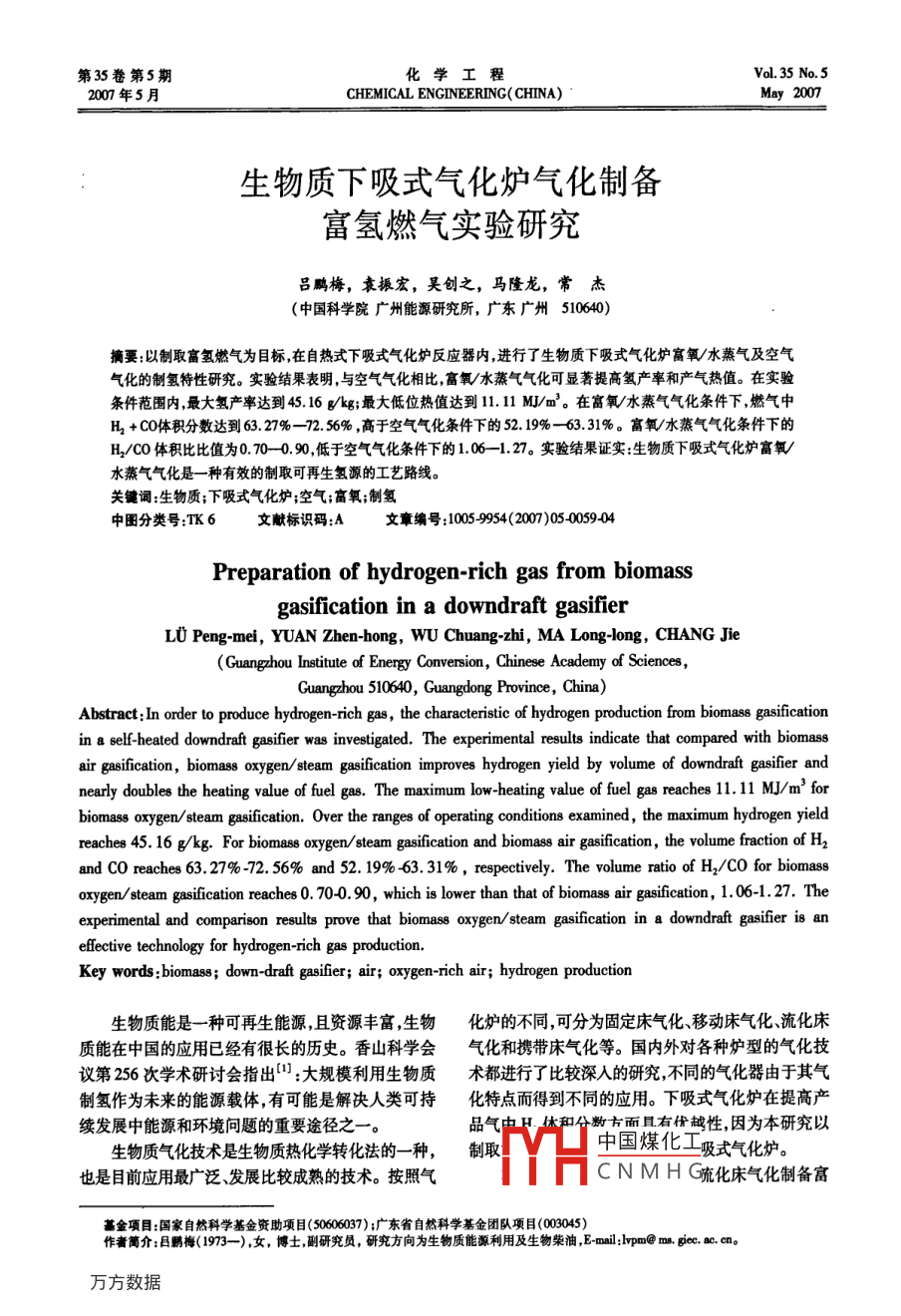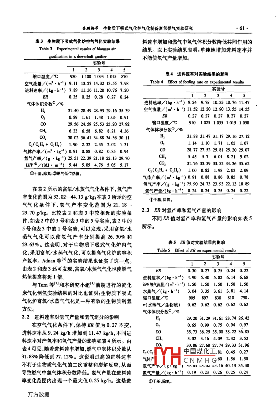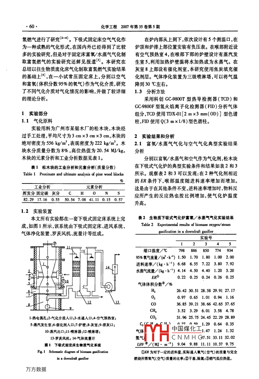 第35卷第5期化學(xué)工程Vol. 35 No.52007年5月.CHEMICAL ENGINEERING( CHINA)May 2007生物質(zhì)下吸式氣化爐氣化制備富氫燃?xì)鈱?shí)驗(yàn)研究.呂鵬梅,袁振宏,吳創(chuàng)之,馬隆龍,常杰(中國(guó)科學(xué)院廣州能源研究所,廣東廣州510640)摘要:以制取富氫燃?xì)鉃槟繕?biāo),在自熱式下吸式氣化爐反應(yīng)器內(nèi),進(jìn)行了生物質(zhì)下吸式氣化爐富氧/水蒸氣及空氣氣化的制氫特性研究。實(shí)驗(yàn)結(jié)果表明,與空氣氣化相比,富氧/水蒸氣氣化可顯著提高氫產(chǎn)率和產(chǎn)氣熱值。在實(shí)驗(yàn)條件范圍內(nèi),最大氫產(chǎn)率達(dá)到45.16 g/kg;最大低位熱值達(dá)到11.11 MJ/m'。在富氧/水蒸氣氣化條件下,燃?xì)庵蠬 +CO體積分?jǐn)?shù)達(dá)到63.27%- -72. 56% ,高于空氣氣化條件下的52.19%- 63.31%。 富氧/水蒸氣氣化條件下的H/CO體積比比值為0.70--0.90,低于空氣氣化條件下的1.06- -1.27。 實(shí)驗(yàn)結(jié)果證實(shí):生物質(zhì)下吸式氣化爐富氧/水蒸氣氣化是- -種有效的制取可再生氫源的工藝路線。關(guān)鍵詞:生物質(zhì);下吸式氣化爐;空氣;高氧;制氫中圖分類號(hào):TK 6文獻(xiàn)標(biāo)識(shí)碼:A文章編號(hào):10059954(2007)05-0059-04Preparation of hydrogen-rich gas from biomassgasification in a downdraft gasifierL0 Peng-mei, YUAN Zhen-hong, WU Chuang zhi, MA Long-long, CHANG Jie(Guanghou Institute of Energy Conversion, Chinese Acadeny of Sciences,Guangzhou 510640, Guangdong Province, China)Abstract: In order to produce bhydrogen-rich gas , the characterstic of hydrogen production from bioma8s gasificationin a self-heated downdraft gasifier was investigated. The experimental results indicate that compared with biomassair gasifcation, biomass oxygen/steam gasification improves hydrogen yield by volume of downdraft gasifer andnearly doubles the heating value of fuel gas. The maximum low-heating value of fuel gas reaches 11.11 MJ/m' forbiomass oxygen/ steam gifiction. Over the ranges of operaing conditions examined, the maximum hydrogen yieldreaches 45. 16 g/kg. For biomaes oxygen/steam gasification and biomass air gasification, the volume fraction of H2and CO reaches 63. 27% -72. 56% and 52. 19% -63. 31% , respectively. The volume ratio of H2/CO for biomassoxygen/ steam gasification reaches 0.70-0.90, which is lower than that of biomass air gasification, 1.06-1.27. Theexperimental and comparison results prove that biomass oxygen/steam gasification in a downdraft gasifier is aneffective technology for hydrogen-rich gas production.Key words :biomass; down. draft gasifer; air; oxygen- rich air; hydrogen production生物質(zhì)能是-種可再生能源,且資源豐富,生物化爐的不同,可分為固定床氣化、移動(dòng)床氣化、流化床質(zhì)能在中國(guó)的應(yīng)用已經(jīng)有很長(zhǎng)的歷史。香山科學(xué)會(huì)氣化和攜帶 床氣化等。國(guó)內(nèi)外對(duì)各種爐型的氣化技議第256次學(xué)術(shù)研討會(huì)指出'" :大規(guī)模利用生物質(zhì)術(shù)都進(jìn)行了比較深人的研究,不同的氣化器由于其氣制氫作為未來(lái)的能源載體,有可能是解決人類可持化特點(diǎn)而得到不同的應(yīng)用。下吸式氣化爐在提高產(chǎn)續(xù)發(fā)展中能源和環(huán)境問(wèn)題的重要途徑之一。.品氣中H休和分?jǐn)?shù)方面具有優(yōu)越性,因?yàn)楸狙芯恳陨镔|(zhì)氣化技術(shù)是生物質(zhì)熱化學(xué)轉(zhuǎn)化法的-種,制取中國(guó)煤化工吸式氣化爐。也是目前應(yīng)用最廣泛、發(fā)展比較成熟的技術(shù)。按照氣TYHCNMHG疏化床氣化制備富基金項(xiàng)目:國(guó)家自然科學(xué)基金資助項(xiàng)目(50606037);廣東省自然科學(xué)基金團(tuán)隊(duì)項(xiàng)目(003045)作者籬介:呂鵬梅(1973-),女,博士,副研究員,研究方向?yàn)樯镔|(zhì)能源利用及生物柴油,E-mail:lrpm@ m. gic. ac. cn。60●化學(xué)工程2007 年第35卷第5期氫燃?xì)膺M(jìn)行了研究[2 4。下吸式固定床空氣氣化作在爐內(nèi)部從上到下,依次設(shè)計(jì)有5個(gè)測(cè)溫口,在為一種成熟的氣化形式,在國(guó)內(nèi)外已經(jīng)得到了比較爐頂和爐排上部位置安裝有負(fù)壓表。在喉部附近設(shè)多的實(shí)驗(yàn)研究,但是對(duì)于固定床富氧水蒸氣氣化制有空氣預(yù)熱室4,在喉部下部的爐壁設(shè)計(jì)有蒸汽發(fā)取富氫燃?xì)獾膶?shí)驗(yàn)研究還鮮見報(bào)道”]。本研究在生室5,利用加熱爐壁溫將水加熱成為水蒸氣。在總結(jié)以往生物質(zhì)流化床氣化制取富氫燃?xì)鈱?shí)驗(yàn)結(jié)果灰室8上部設(shè)有催化劑室,本研究使用焦炭填充催的基礎(chǔ)上[4] ,在一小試常壓固定床上,分別以空氣化劑層。氣體凈化裝置為三級(jí)噴淋塔,可以將氣溫和富氧(體積分?jǐn)?shù)95%的氧氣)作為氣化介質(zhì),研究降到30 C左右。了不同氣化介質(zhì)對(duì)氣化情況的影響,并做了較詳細(xì)1.3 分析方法的理論分析。采用科創(chuàng)GC-9800T型熱導(dǎo)檢測(cè)器(TCD)和GC-9800F型氫火焰離子化檢測(cè)器(FID)分析氣體1實(shí)驗(yàn)部分組分,TCD使用TDX01[2 mx3 mm( OD)]型色譜1.1 氣化原料柱,FID使用Q(3 m x 1/8)型色譜柱。實(shí)驗(yàn)用料為廣州市某鋸木廠的松木塊,木塊經(jīng)過(guò)手工處理,平均尺寸為3 cm x3 cm x3 cm,木塊的2實(shí)驗(yàn)結(jié)果和分析絕對(duì)密度為556 kg/m3 ,表觀密度為222 kg/m'。木2.1 富氧/水蒸氣氣化與空氣氣化典型實(shí)驗(yàn)結(jié)果塊水分質(zhì)量分?jǐn)?shù)為8% ,高位熱值為20. 54 M]/kg。分析木塊