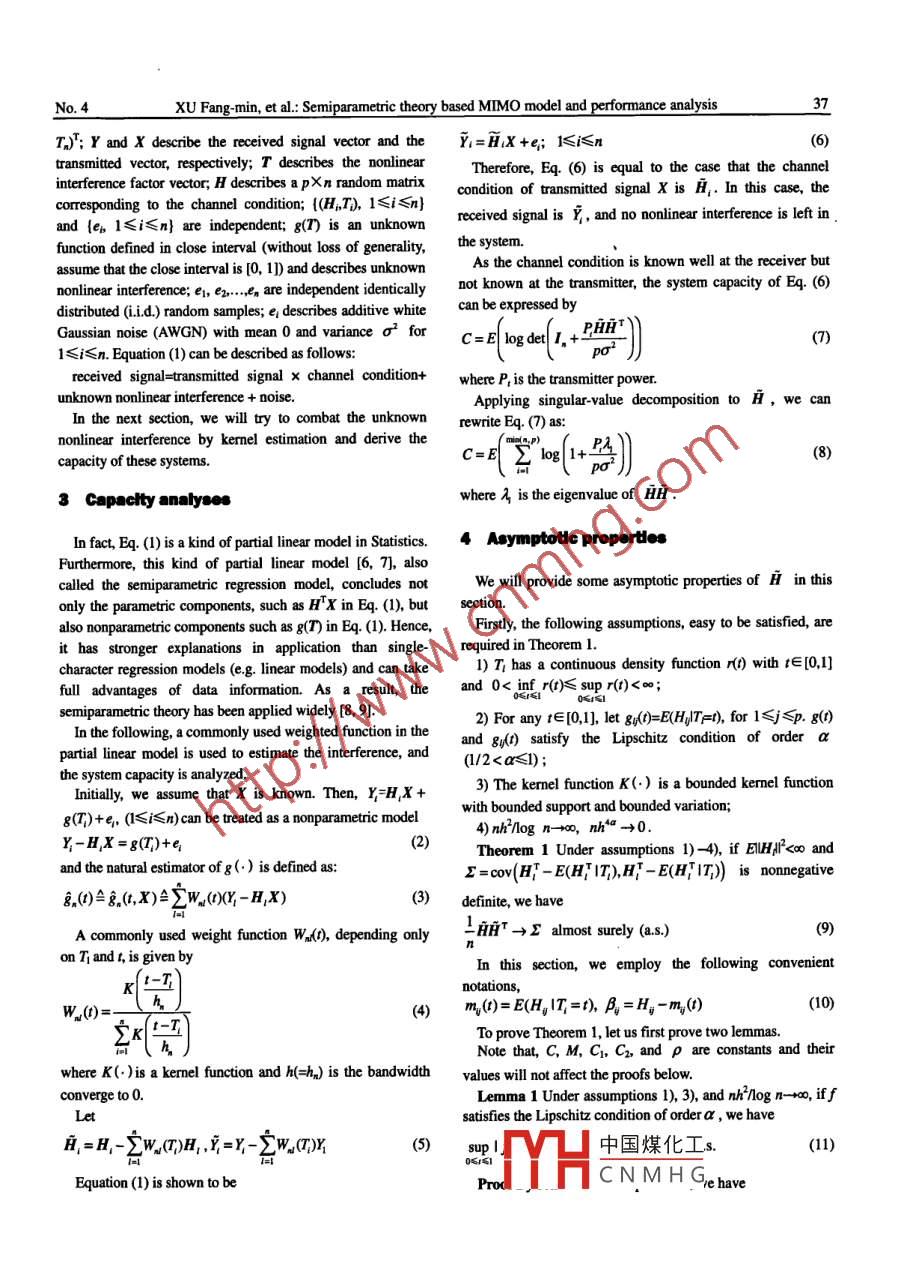 THE JOURNAL OF CHINA UNIVERSITIES OF POSTS AND TELECOMMUNICATIONSVolume 14, Issue 4, December 2007XU Fang-min, XU Xiao-dong, ZHANG PingSemiparametric theory based MIMO model and perfor-mance analysisCLC number TN929.5Document AArticle ID 105-8885 (2007) 04-0036-05Abstract In this article, a new approach for modeling multi-model will not work well. Contrarily, the linear model willinput multi-output (MIMO) systems with unknown nonlinearcause serious system errors. Such problems are common ininterference is introduced. The semiparametric theory basedMIMO systems, for example, pulse noise, interference causedMIMO model is established, and Kernel estimation is applied toby the correlation between antennas or system coexistence,combat the nonlinear interference. Furthermore, we deriveinherence errors in the systems, etc. Hence, the influenceMIMO capacity for these systems and explore the asymptoticfactor of received signal concludes both linear parts andproperties of the new channel matrix via theoretical analysis.nonlinear parts. Generally, the channel condition is consideredThe simulation results show that the semiparametric theoryto affect the received signal linearly. In the meantime, therebased modeling and kermel estimation are valid to combat thisexist nonlinear parts and random factors (e.g. noise). Sincekind of interference.relationships between the nonlinear parts and the receivedsignal are unknown and there is no reason to treat nonlinearKeywords MIMO, partial linear model, kernel estimation,parts as noise, we treat nonlinear parts as an extra part in theunknown nonlinear interferenceMIMO model.In this article, the semiparametric theory based MIMO1 Introductonmodel is established to describe MIMO systems afected bynonlinear inteference. A kernel estimated method is used toMIMO technology, as an important way to improvecombat unknown nonlinear interference, which has nearly nottransmission reliability and provide high data rates, has beenbeen resolved, and the system capacity is obtained under thean attractive candidate for the physical layer in enhanced 3rdsemiparametric theory based MIMO model.generation(B3G) and 4th generation (4G) wireless systems.The remaining sections of the article are organized asThe pioneering work of Telatar [1] and Foschini [2] has shownfollows. The system model based on semiparametirc theory isthat using multiple antennas offers remarkable spectraldescribed in Sect, 2. Section 3 analyzes the capacity based onefficiency. Since then, research activities to develop optimalthe established model. In Sect. 4, we provide the asymptoticimplementations as well as to extend MIMO systems haveproperties of the new channel matrix H and validate theexploded. Several algorithms for MIMO systems have beenproperties in Sect. 5 via numerical simulation. Anotherstudied, but most are based on the traditional linear modelsimulation result in Sect. 5 shows that Kernel estimation is[3- -5]. However, the practical wireless environment isvalid to combat this kind of interference. In Sect. 6, wecomplex and variable. It will not obey linear rules very wellconclude with a brief summary of results.and can only be treated as linear model approximately. Toimprove the transmission reliability, a precise model to2 Systom model based on the semlparamotlcdescribe MIMO systems is required for 4G wireless systems.theoryTraditionally, the linear model [1-5] is usually used todescribe MIMO systemns to study the relationship between theWe consider a single user, point-to-point communicationreceived signal and its influence factor. It is well known thatchannel interfered by nonlinear interference, with p transmittervhen nonlinear interference exists in the system, the linearantennas and n receiver antennas, and describe the systemmodel as follows:Recceived dace 207-01-11Y=H'X+ e(T)+e1)XU Fang-min (8), Xu Xiao dong, ZHANG PingKey Laboratory of Universal Wireless Communications (Bejing Univenity ofwhe,中國煤化工x):; e=e. ...Posts and Telecommunications) Ministy of Education, Wireless TechnologyInnovation Institute, Bejing 100876, China:MHCN M H ...H.);j T=(T, T.... .E-mail: fangminxu@gmail.comNo. 4XU Fang- min, et al: Semiparametric theory based MIMO model and performnance analysis37T)"; Y and X describe the received signal vector and theY=Hx+e; 1≤i≤n(6transmitted vector, respectively; T describes the nonlinearTherefore, Eq. (6) is equal to the case that the channelinterference factor vector; H describes a pXn random matrixcondition of transmitted signal X is H. In this case, thecorresponding to the channel condition; {(H,T), 1≤i≤n}received signal is Y, and no nonlinear interference is left inand {ep 1≤i≤n} are independent; 8(T) is an unknownfunction defined in close interval (without loss of generality,the system.As the channel condition is known well at the receiver butassume that the close interval is [0, 1]) and describes unknownnonlinear interference; er, ....n.. are independent identicallynot known at the transnitter, the system capacity of Eq. (6)can be expressed bydistributed (i.i.d.) random samples; en describes additive whiteGaussian noise (AWGN) with mean 0 and variance o2 forC=E| logdet|1,+-+ pT(7)po21≤i≤n. Equation (1) can be described as follows:received signal-transmitted signal x channel condition+where P, is the transmitter power.unknown nonlinear interference + noise.Applying singular-value decomposition to H,we canIn the next section, we will try to combat the unknownrewrite Eq. (7) as:nonlinear interference by kernel estimation and derive thecapacity of these systems.C=E(8)(藝"(+器))3 Capacty analysoswhere h is the eigenvalueof畝.In fact, Bq. (1) is a kind of partial linear model in Statistics.4 Asymptote proportesFurthermore, this kind of partial linear model [6, 7], alsoalleld the semiparametric regression model, concludes notWe will provide some asymptotic propertiesof F in thisonly the parametric components, such as HTx in Eq. (1), butsection.also n