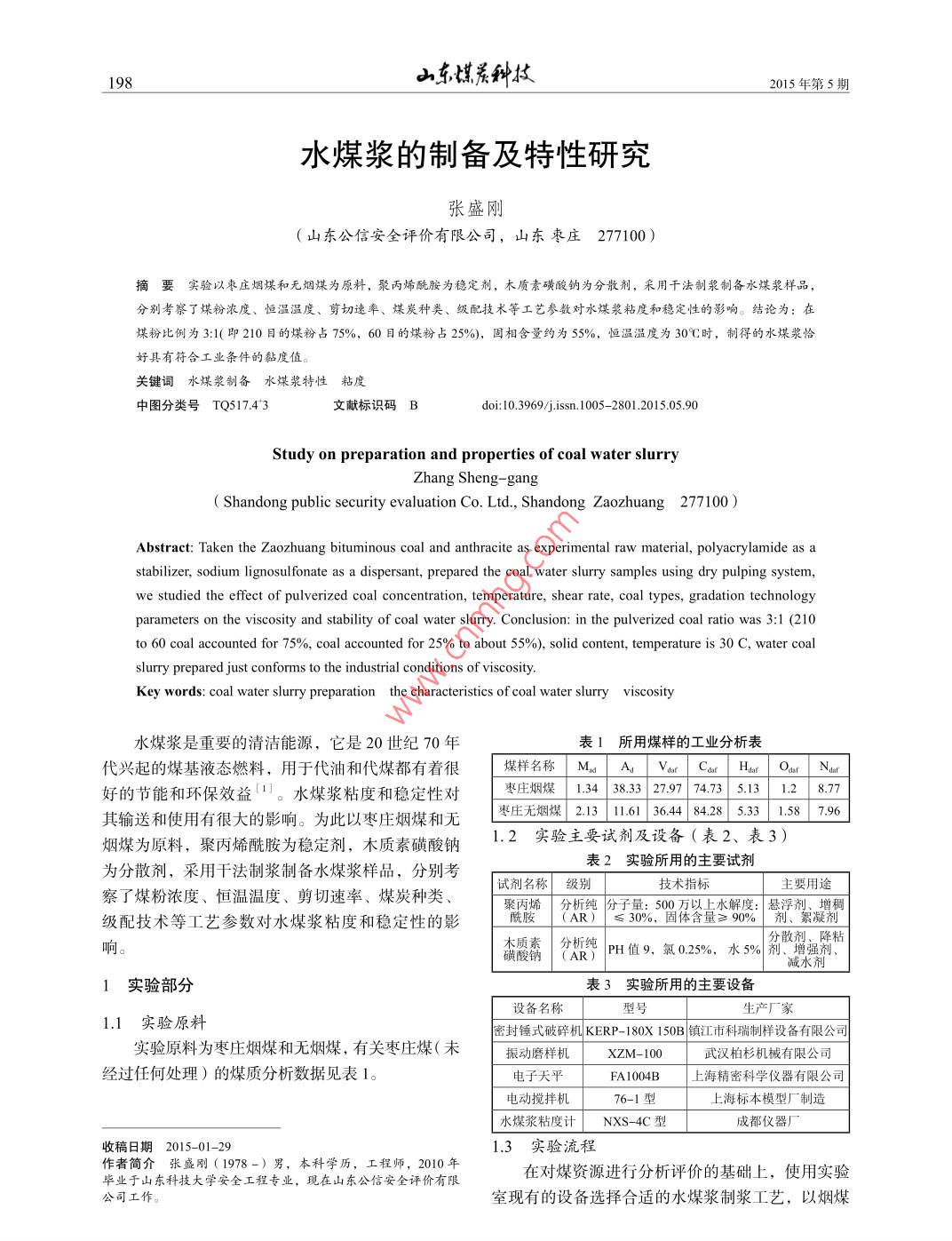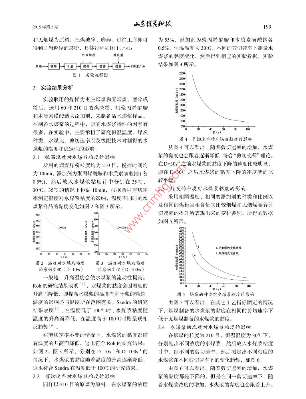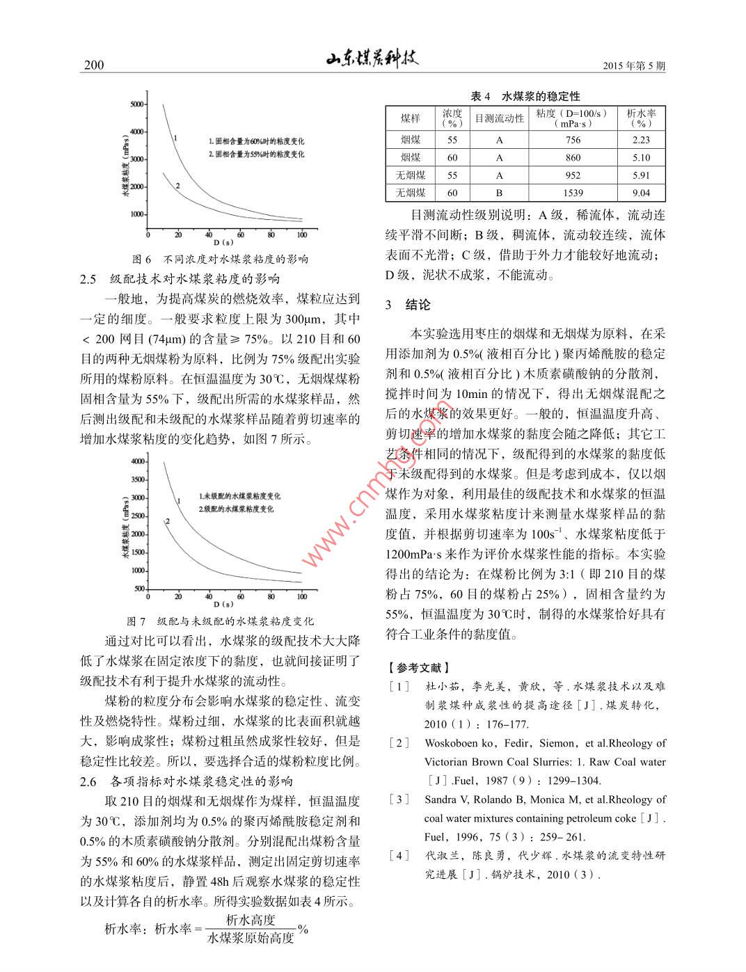 東媒系舯技015年第5期水煤漿的制備及特性研究張盛剛(山東公信安全評價有限公司,山東棗莊277100)摘要實驗以棗莊煙煤和無煙煤為原料,滎丙烯酰胺為穩(wěn)定劑,木質(zhì)素磺酸鈉為分散劑,采用干法制漿制備水煤漿樣品分別考察了煤粉濃度、恒溫溫度、剪切速率、煤炭種類、級配技術(shù)等工藝參彀對水煤漿粘度和穩(wěn)定性的影響。結(jié)論為:在煤粉比例為3:1(即210目的煤粉占75%,60目的煤粉占25%,固相含量約為55%,恒溫溫度為30℃時,制得的水煤漿恰好具有符合工業(yè)條件的黏度值。關(guān)鍵詞水煤漿制備水煤漿特性粘度中圖分類號TQ51743文獻標識碼Bdoi:10.3969/jssn.1005-2801.2015.05.90Study on preparation and properties of coal water slurryZhang shengShandong public security evaluation Co. Ltd, Shandong Zaozhuang 277100)Abstract: Taken the Zaozhuang bituminous coal and anthracite as experimental raw material, polyacrylamide as agnosulfonate as ad the coal water slurry sample studied the effect of pulverized coal concentration, temperature, shear rate, coal types, gradation technologyparameters on the viscosity and stability of coal water slurry. Conclusion: in the pulverized coal ratio was 3: 1 (210to 60 coal accounted for 75%, coal accounted for 25% to aboutsolid content, temperature is 30 C, water coalslurry prepared just conforms to the industrial conditions of viscosityKey words: coal water slurry preparation the characteristics of coal water slurry viscosity水煤漿是重要的清潔能源,它是20世紀70年表1所用煤樣的工業(yè)分析表代興起的煤基液態(tài)燃料,用于代油和代煤都有著很煤樣名稱 Md Au Darc.好的節(jié)能和環(huán)保效益1。水煤漿粘度和穩(wěn)定性對棗莊煙媒134383297315131287其輸送和使用有很大的影響。為此以棗莊煙煤和無棗莊無煙煤2.131161364484.285.331.58796煙煤為原料,聚丙烯酰胺為穩(wěn)定劑,木質(zhì)素磺酸鈉12實驗主要試劑及設(shè)備(表2、表3)為分散劑,采用干法制漿制備水煤漿樣品,分別考表2實驗所用的主要試劑試劑名稱級別技術(shù)指標主要用途察了煤粉濃度、恒溫溫度、剪切速率、煤炭種類聚丙烯分析純分子量:500萬以上水解度:懸浮劑、增稠級配技術(shù)等工藝參數(shù)對水煤漿粘度和穩(wěn)定性的影酰胺(AR)≤30%,固體含量≥90%劑、絮凝劑分散劑、降粘響酸鈉(AR)PH值9,氯025%,水5%劉、強劑實驗部分表3實驗所用的主要設(shè)備設(shè)備名稱生產(chǎn)廠家1.1實驗原料密封錘式破碎機KERP-180X150B鎮(zhèn)江市科瑞制樣設(shè)備有限公實驗原料為棗莊煙煤和無煙煤,有關(guān)棗莊煤(未振動磨樣機XZM-100武漢柏杉機械有限公司經(jīng)過任何處理)的煤質(zhì)分析數(shù)據(jù)見表1電子天平F0B上海精密科學(xué)儀器有限公司電動攪拌機76-1型上海標本模型廠制造水煤漿粘度NXS-4C型收稿日期2015-01-291.3實驗流程作者簡介張盛剛(1978-)男,本科學(xué)歷,工程師,2010年畢業(yè)于山東科技大學(xué)安全工程專業(yè),現(xiàn)在山東公信安全評價有限在對煤資源進行分析評價的基礎(chǔ)上,使用實驗公司工作。室現(xiàn)有的設(shè)備選擇合適的水煤漿制漿工藝,以煙煤015年第5期山京媒,技和無煙煤為原料,把煤破碎、磨碎、過篩工序即可為55%、添加劑為聚丙烯酰胺和木質(zhì)素磺酸鈉各得到適當(dāng)粒徑的煤粉,具體過程如圖1所示0.5%、恒溫溫度為30℃、不同的剪切速率下測量水水添加劑煤漿的黏度變化,然后得到相應(yīng)的實驗數(shù)據(jù)。實驗一]千數(shù)神樣]一故→水產(chǎn)結(jié)果如圖4所示圖1實驗流程圖2實驗結(jié)果分析實驗取用的煤樣為棗莊煙煤和無煙煤,磨碎成粉后,選用60和210目的煤渣粉,用聚丙烯酰胺和木質(zhì)素磺酸鈉為添加劑,來制備活水煤漿樣品在制備水煤漿的過程中,影響水煤漿特性的因素有很多,在實驗中,主要承擔(dān)了研究恒溫溫度、煤炭種類、水煤比、剪切速率以及級配技術(shù)對制得的水圖4剪切速率對水煤漿粘度的影響煤漿的黏度和穩(wěn)定性的影響。從圖4可以看出,隨著剪切速率的增加,水煤2.1恒溫溫度對水煤漿粘度的影響漿的黏度也會跟著逐漸降低,符合“剪切變稀”理論。所用的煙煤煤粉粒度均為210目,攪拌時間均在D=30s之前水煤漿的黏度下降的速度比較明顯,為10mim,添加劑為聚丙烯酰胺和木質(zhì)素磺酸鈉(各即在D=30s之后水煤漿的黏度下降的速度變的比0.5%,然后放入水煤漿粘度計中分別在25℃、較平緩30℃、35℃的情況下恒溫10min,根據(jù)兩種剪切速23煤炭的種類對水煤漿粘度的影響率測定溫度對水煤漿粘度的影響,溫度不同時的水采用相同溫度、相同的添加劑的種類和比例以煤漿樣品的黏度變化如圖2和圖3所示。及相同的煤粉固相含量來比較煙煤和無煙煤隨著剪切速率的提升所表現(xiàn)出來的變化差別,所得的數(shù)據(jù)如圖5所示D10D10趙架嶄1.無煙煤的變化曲線燃架長2.熠煤的變化曲線圖2溫度對水煤漿粘度圖3溫度對水煤漿粘度的影響變化(D=10s)的影響變化(D=100/s)一般地,升高溫度會使水煤漿的流動性提高。Roh的研究結(jié)果表明21,水煤漿的黏度會因溫度的升高而降低,即提高水煤漿的溫度有利于漿的輸送。圖5煤炭的種類對水煤漿粘度的影響溫度的影響還與溫度所在范圍有關(guān)。 Sandra的研究由圖5可以看出,在其它工藝指標固定的情況結(jié)果表明3,在溫度低于100℃時,水煤漿粘度隨下,煙煤制備的水煤漿的黏度在相同的剪切速率下溫度的升高而降低,在溫度高于