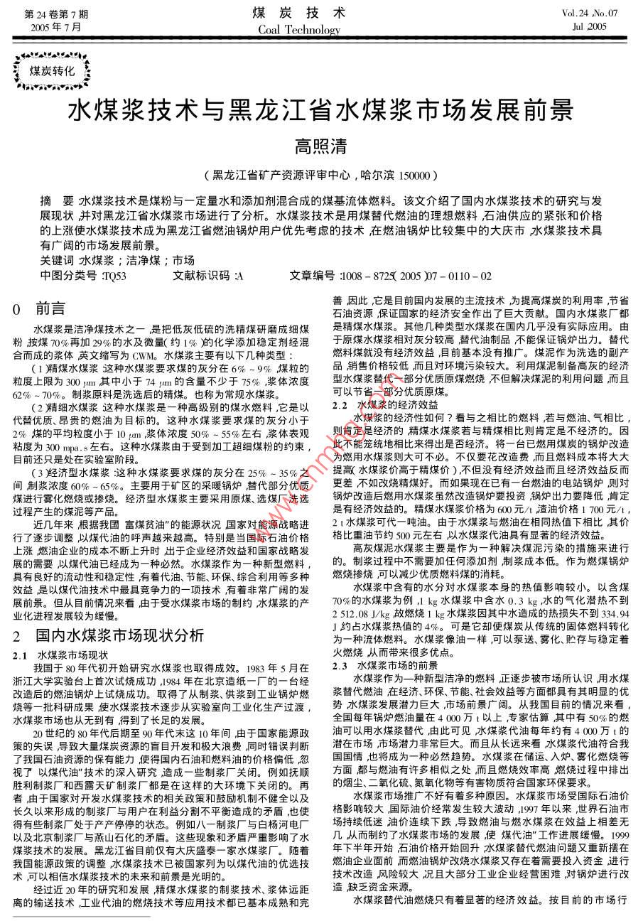 第24卷第7期煤炭技術(shù)Vo.24No.072005年7月Coal TechnologyJu2005煤炭轉(zhuǎn)化水煤漿技術(shù)與黑龍江省水煤漿市場(chǎng)發(fā)展前景高照清(黑龍江省礦產(chǎn)資源評(píng)審中心,哈爾濱1500摘要水煤漿技術(shù)是煤粉與一定量水和添加劑混合成的煤基流體燃料。該文介紹了國(guó)內(nèi)水煤漿技術(shù)的研究與發(fā)展現(xiàn)狀并對(duì)黑龍江省水煤漿市場(chǎng)進(jìn)行了分析。水煤漿技術(shù)是用煤替代燃油的理想燃料石油供應(yīng)的緊張和價(jià)格的上漲使水煤漿技術(shù)成為黑龍江省燃油鍋爐用戶優(yōu)先考慮的技術(shù)在燃油鍋爐比較集中的大慶市水煤漿技術(shù)具有廣闊的市場(chǎng)發(fā)展前景。關(guān)鍵詞水煤漿;潔凈煤;市場(chǎng)中圖分類號(hào)Q53文文章編號(hào):008-8725200507-0110-020前言善因此,它是目前國(guó)內(nèi)發(fā)展的主流技術(shù)為提高煤炭的利用率,節(jié)省石油資源保證國(guó)家的經(jīng)濟(jì)安全作出了巨大貢獻(xiàn)。國(guó)內(nèi)水煤漿廠都水煤漿是潔凈煤技術(shù)之一是把低灰低硫的洗精煤研磨成細(xì)煤是精煤水煤漿。其他幾種類型水煤漿在國(guó)內(nèi)幾乎沒有實(shí)際應(yīng)用。由粉按煤70%再加29%的水及微量(約1%)化學(xué)添加穩(wěn)定劑經(jīng)混于原煤水煤漿相對(duì)灰分較高替代油制品不能保證鍋爐出力。替代合而成的漿體英文縮寫為CWM。水煤漿主要有以下幾種類型燃料煤就沒有經(jīng)濟(jì)效益,目前基本沒有推廣。煤泥作為洗選的副產(chǎn)(1精煤水煤漿這種水煤漿要求煤的灰分在6%-9%煤粒的品銷售價(jià)格較低而且對(duì)環(huán)境污染較大。利用煤泥制備高灰的經(jīng)濟(jì)粒度上限為300m其中小于74m的含量不少于75%漿體濃度型水煤漿替代一部分優(yōu)質(zhì)原煤燃燒不但解決煤泥的利用問題而且砬%~70%。制漿原料是洗選后的精煤。也稱為常規(guī)水煤漿可以節(jié)省一部分優(yōu)質(zhì)原煤。2精細(xì)水煤漿這種水煤漿是一種高級(jí)別的煤水燃料,它是以22水煤漿的經(jīng)濟(jì)效益代替優(yōu)質(zhì)、昂貴的燃油為目標(biāo)的。這種水煤漿要求煤的灰分小于的經(jīng)濟(jì)性如何?看與之相比的燃料若與燃油、氣相比2%煤的平均粒度小于10mm漿體濃度50%-5%左右漿體表觀則肯定是經(jīng)濟(jì)的精煤水煤漿若與精煤相比則肯定是不經(jīng)濟(jì)的。因粘度為300m8左右。這種水煤漿由于受到加工超細(xì)煤粉的約束,此不能籠統(tǒng)地相比來得出是否經(jīng)濟(jì)。將一臺(tái)已燃用煤炭的鍋爐改造目前還只是處在實(shí)驗(yàn)室階段。為燃用水煤漿則大可不必。不僅要花改造費(fèi)而且燃料成本將大大3羥經(jīng)濟(jì)型水煤漿這種水煤漿要求煤的灰分在25%-35%之提高水煤漿價(jià)高于精煤價(jià))不但沒有經(jīng)濟(jì)效益而且經(jīng)濟(jì)效益反而間制漿濃度60%~65%。主要用于礦區(qū)的采暖鍋爐營(yíng)代部分優(yōu)質(zhì)更差不如改燒精煤好。而如果現(xiàn)在已有一臺(tái)燃油的電站鍋爐測(cè)則對(duì)煤進(jìn)行霧化燃燒或摻燒。經(jīng)濟(jì)型水煤漿主要采用原煤、選煤廠洗選鍋爐改造后燃用水煤漿雖然改造鍋爐要投資鍋爐出力要降低肯定過程產(chǎn)生的煤泥等產(chǎn)品是有經(jīng)濟(jì)效益的。精煤水煤漿價(jià)格為600元/渣油價(jià)格1700元/2t水煤漿可代一噸油。由于水煤漿與燃油在相同熱值下相比其價(jià)行了逐步調(diào)整以煤代油的呼聲越來越高。特別是當(dāng)國(guó)際石油價(jià)格格比重油節(jié)約500元左右以水煤漿代油具有顯著的經(jīng)濟(jì)效益。上漲燃油企業(yè)的成本不斷上升時(shí)出于企業(yè)經(jīng)濟(jì)效益和國(guó)家戰(zhàn)略發(fā)高灰煤泥水煤漿主要是作為一種解決煤泥污染的措施來進(jìn)行展的需要以煤代油已經(jīng)成為一種必然。水煤漿作為一種新型燃料,的。制漿過程中不需要加任何添加劑制漿成本低。作為燃煤鍋爐具有良好的流動(dòng)性和穩(wěn)定性有著代油、節(jié)能、環(huán)保、綜合利用等多種燃燒摻燒可以減少優(yōu)質(zhì)燃料煤的消耗。效益是以煤代油技術(shù)中最具競(jìng)爭(zhēng)力的一項(xiàng)技術(shù)有著非常廣闊的發(fā)水煤漿中含有的水分對(duì)水煤漿本身的熱值影響較小。以含展前景。但從目前情況來看由于受水煤漿市場(chǎng)的制約水煤漿的產(chǎn)70%的水煤漿為例,kg水煤漿中含水0.3kg水的氣化潛熱不到業(yè)化進(jìn)程發(fā)展較為緩慢2512.08J/kg故燃燒1kg水煤漿因其中水造成的熱損失不到334942國(guó)內(nèi)水煤漿市場(chǎng)現(xiàn)狀分析約占水煤漿熱值的4%。可是它卻使煤炭從傳統(tǒng)的固體燃料轉(zhuǎn)化為一種流體燃料。水煤漿像油一樣可以泵送、霧化、貯存與穩(wěn)定著2.1水煤漿市場(chǎng)現(xiàn)狀火燃燒從而帶來很多優(yōu)點(diǎn)。國(guó)于80年代初開始研究水煤漿也取得成效。198年5月在2.3水煤漿市場(chǎng)的前景浙江大學(xué)實(shí)驗(yàn)臺(tái)上首次試燒成功,1984年在北京造紙一廠的一臺(tái)經(jīng)水煤漿作為—種新型潔凈的燃料正逐步被市場(chǎng)所認(rèn)識(shí)用水煤改造后的燃油鍋爐上試燒成功。取得了從制漿、供漿到工業(yè)鍋爐燃漿替代燃油在經(jīng)濟(jì)、環(huán)保、節(jié)能社會(huì)效益等方面都具有其明顯的優(yōu)
