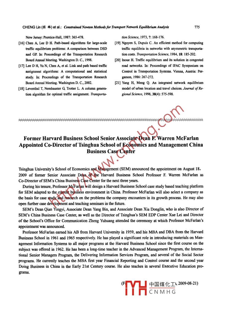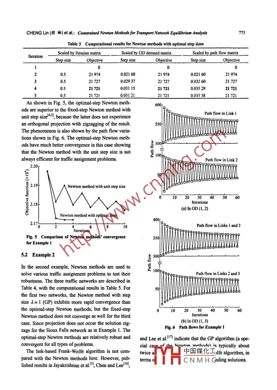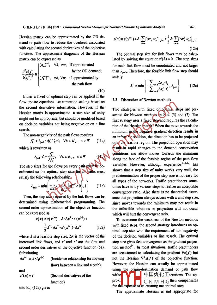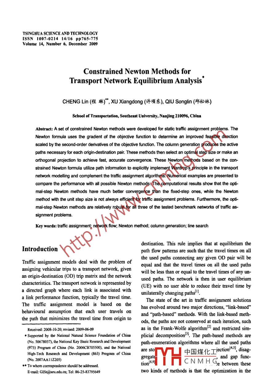 TSINGHUA SCIENCE AND TECHNOLOGYISSN 1007-0214 14/16 pp765-775Volume 14, Number 6, December 2009Constrained Newton Methods forTransport Network Equilibrium Analysis'CHENG Lin (程琳)", xU Xiangdong (許項(xiàng)東), QIU Songlin (邱松林)School of Transportation, Southeast University, Nanjing 210096, ChinaAbstract: A set of constrained Newton methods were developed for static tafflcf assignment problems. TheNewton formula uses the gradient of the objective function to determine an improved feasible directionscaled by the second-order derivatives of the objective function. The column generation produces the activepaths necessary for each origin-destination pair. These methods then select an optimal step size or make anorthogonal projection to achieve fast, accurate convergence. These Newton methods based on the con-strained Newton formula utilize path information to explicitly implement Wardrop's principle in the transportnetwork modelling and complement the traffc assignment algorithms. Numerical examples are presented tocompare the perfomance with all possible Newton methods. The computational results show that the opti-mal-step Newton methods have much better convergence than the fxed-step ones, while the Newtonmethod with the unit step size is not always eficient for trffic assignment problems. Furthermore, the opti-mal-step Newton methods are relatively robust for all three of the tested benchmark networks of traffic as-signment problems.Key words: taffic assignment; network flow; Newton method; column generation; line searchdestination. This rule implies that at equilibrium theIntroductionpath flow patterns are such that the travel times on allthe used paths connecting any given OD pair will beTraffic assignment models deal with the problem ofequal and that the travel times on all the used pathsassigning vehicular trips to a transport network, givenwill be less than or equal to the travel times of any un-an origin-destination (OD) trip matrix and the networkused paths. The network is then in user equilibriumcharacteristics. The transport network is represented by(UE) with no user able to reduce their travel time bya directed graph where each link is associated withunilaterally changing pathsl'.a link performance function, typically the travel time.The state of the art in taffic assigoment solutionsThe traffic assignment model is based on thebehavioural assumption that each user travels onhas evolved around two major directions,“l(fā)ink-based"and“patb-based" methods. With the link-based meth-the path that minimizes the travel time from origin toods, the paths are not conserved at each iteration, suchReceived: 2008-10-20; revised: 2009-06-09as in the Frank-Wolfe algorithm4 and restricted sim-* Supported by the National Naural Science Foundation of Chinaplicial decomposition5. The path-based methods are(No. 50678037), the National Key Basic Research and Developmnentpath-enumeration algorithms where all the used paths(973) Progam of China No. 206C70550), and the Nationalare sto中國煤化Tiectont, disag'High-Tech Research and Develpment (863) Program of Chinagregatoand gap func-(No. 20A112052)5** To whom correspondence should be adressed.YHcNMHGebetwentheseE-mail: GlSt@secu.edu.cn; Tel: 86 25- 83795649two kinds of methods is that the optimization in the766Tsinghua Science and Technology, December 2009, 14(6): 76-775link-based methods is performned in the link-flow do-has a given tafic demand qw The user equilibriummain, while that of the path-based methods is per-assignment problem is stated as follows.formed in the path-flow domain.min z(x)=Zj。 t。(s)ds(1a)The by-product of path-based methods is the abun-dant information on the path flow patterns at user equi-s.t.2 f"=q, Vw∈W(1b)librium. As is well known, the path flow pattern is notunique at user equilibrium'", but it is used in variousx=E 2 f".8, VaEA(1c)applications. For example, a path flow solution istypically used for real-time assignments, which is notf"≥0,Vk∈Kw, w∈W(1d)possible with the link-based Frank-Wolfe algorithm, inwhere xa is the link flow. ta is the travel time on link a.advanced traveller information systems or advancedδ%=| if link a belongs to path k; otherwise, 8k =0.traffic management systemslto. Sensitivity analysesl"f" is the flow on path k within OD pair w. Kw is the setrequire a set of reference path flows, from which a par-of paths within OD pair w. qw is the origin-destinationticular path flow patterm can be extracted. The Newtondemand between pair w.methods can be used to provide reference path sets forThe user equilibrium assignment problem is path-such flow sensitivity analyses. The path solution isformulated due to the constraints of Eqs. (lb)-(1d).related to a class of bilevel problemstas which uses theAltermatively, the same problem can be formulatedsensitivity of the link flow to the OD demand. Whenusing link variables indexed by origin or destination'!.path travel costs are nonadditive or nonlinear's, linkThis paper focuses on the formulation using path vari-flows can not be used alone to formulate and solve theables. Consistent with the necessary and sufficienttraffic assignment. Thus all of these types of problemsconditions of optimality, the equilibrium condition forneed a method to explicitly formulate and solve theeach OD pair is stated asproblem in the path flow domain.Zo.8x=i; if">0)This paper presents constrained Newton methods forVk, wsolving path-formulated static traffic assignment prob-Zt&≥i if" =0|lems. Column generation, orthogonal projectiont orine searchl4 can be incorporated into the solutionwhere r = min{t.δ%x} is the shortest path travelprocedure. With column generation, the active pathstime within OD pair w, equal to the Lagrange multi-joining each OD pair are generated only when needed.plier at this point of Eq. (lb) at the optimal point.The line search or orthogonal projection methods areThe solution of the UE assignment model can beused to avoid infeasi