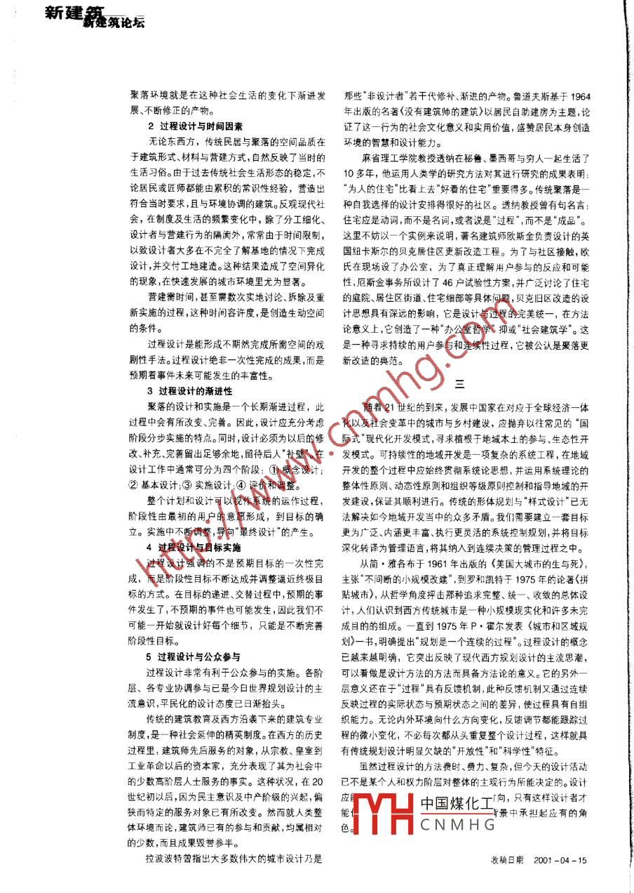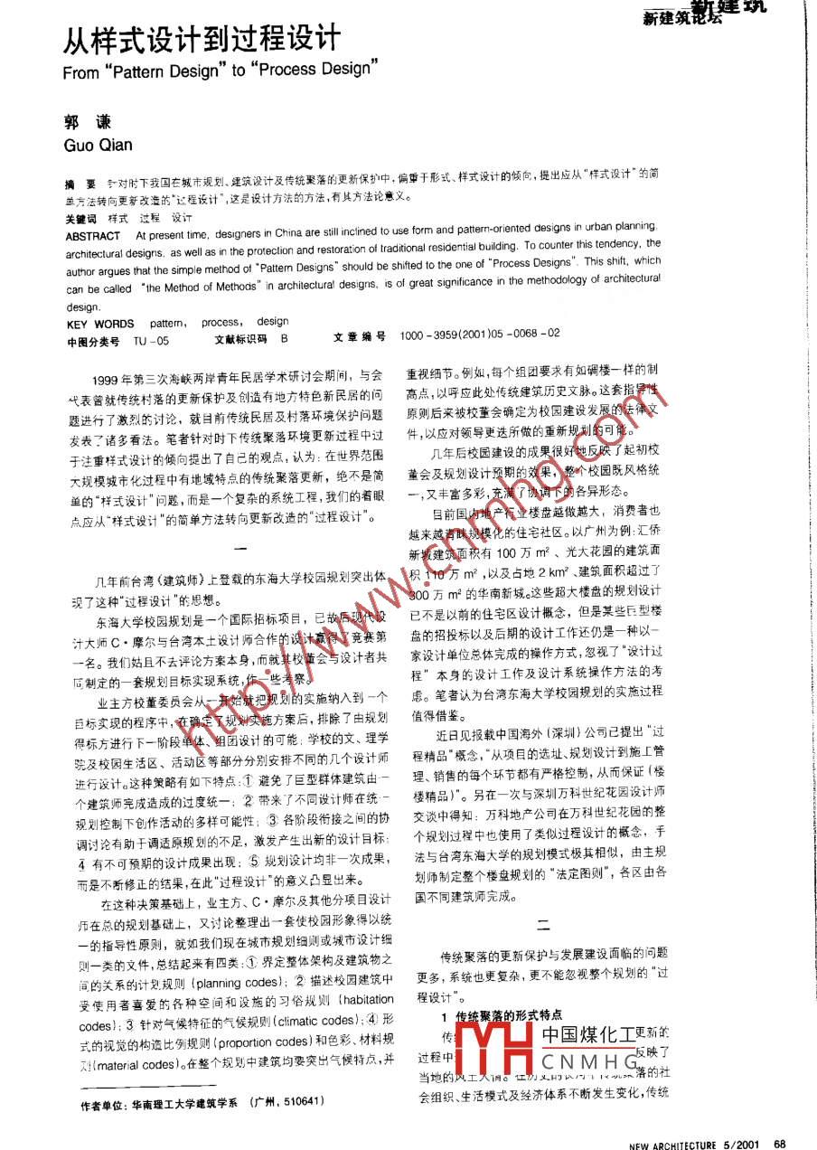 新建氖憋錘鞏從樣式設(shè)計(jì)到過程設(shè)計(jì)From "Pattern Design" to“Process Design"郭謙Guo Qian摘要考對時(shí)下我國在城市規(guī)劃.建筑設(shè)計(jì)及傳統(tǒng)聚落的更新保護(hù)中. 偏重于形式、樣式設(shè)計(jì)的傾向,提出應(yīng)從"樣式設(shè)計(jì)“的簡蓋方法轉(zhuǎn)向更新改海的“過程設(shè)計(jì)”,這是設(shè)計(jì)方法的方法,有其方法論意義。關(guān)鍵詞樣式程設(shè)計(jì)ABSTRACT At present time. designers in China are stil incined to use form and pam-orented designs in urban planing.architeclural designs. as well as in the proteclion and restoration of traditional residential building. To counter this tendency, theauthor argues that the simple method of "Pattern Designs" should be shited to the one of "Process Designs". This shit, whichcan be called‘the Method of Methods”in architectural designs. is ol great significance in the methodology of archiecturaldesign.KEY WORDS pattem, process, design中圈分類號TU-05文獻(xiàn)標(biāo)識碼e文章編號1000-3959(2001 )05 -0068 -021999年第三次海峽兩岸青年民居學(xué)術(shù)研討會(huì)期間,與會(huì)重視細(xì)節(jié)。例如,每個(gè)組團(tuán)要求有如碉樓-樣的制代表曾就傳統(tǒng)村落的更新保護(hù)及創(chuàng)造有地方特色新民居的問高點(diǎn),以呼,應(yīng)此處傳統(tǒng)建筑歷史文脈。這套指導(dǎo)性題進(jìn)行了激烈的討論,就目前傳統(tǒng)民居及村落環(huán)境保護(hù)問題原則后來被校董會(huì)確定為校園建設(shè)發(fā)展的法律文發(fā)表?諸多看法。筆者針對時(shí)下傳統(tǒng)聚落環(huán)境更新過程中過件,以應(yīng)對領(lǐng)導(dǎo)更迭所做的重新規(guī)劃的可能。于注重樣式設(shè)計(jì)的傾向提出了自己的觀點(diǎn),認(rèn)為:在世界范圍幾年后校園建設(shè)的成果很好地反映了起初校大規(guī)模城市化過程中有地域特點(diǎn)的傳統(tǒng)聚落更新,絕不是簡董會(huì)及規(guī)劃設(shè)計(jì)預(yù)期的效果,整個(gè)校園既風(fēng)格統(tǒng)單的“樣式設(shè)計(jì)"問題,而是一個(gè)復(fù)雜的系統(tǒng)工程,我們的著眼- ,又豐富多彩,充滿了協(xié)調(diào)下的各異形態(tài)。點(diǎn)應(yīng)從“樣式設(shè)計(jì)”的簡單方法轉(zhuǎn)向更新改造的“過程設(shè)計(jì)"。目前國內(nèi)地產(chǎn)行業(yè)樓盤越做越大,消費(fèi)者也越來越青睞規(guī)?;淖≌鐓^(qū)。以廣州為例:匯僑新城建筑面積有100萬m2、光大花園的建筑面幾年前臺灣<建筑師)上登載的東海大學(xué)校園規(guī)劃突出體積110萬m? ,以及占地2 km?、建筑面積超過了現(xiàn)了這種“過程設(shè)計(jì)”的思想。300萬m2的華南新城。這些超大樓盤的規(guī)劃設(shè)計(jì)東海大學(xué)校園規(guī)劃是一個(gè)國際招標(biāo)項(xiàng)目,已故后現(xiàn)代設(shè)已不是以前的住宅區(qū)設(shè)計(jì) 概念,但是某些巨型樓計(jì)大師C.摩爾與臺灣本土設(shè)計(jì)師合作的設(shè)計(jì)贏得了競賽第盤的招投標(biāo)以及后期的設(shè)計(jì)工作還仍是一種以一一名。我們姑且不去評論方案本身,而就其校董會(huì)與設(shè)計(jì)者共家設(shè)計(jì)單位總 體完成的操作方式,忽視了“設(shè)計(jì)過局制定的一套規(guī)劃目標(biāo)實(shí)現(xiàn)系統(tǒng),作-些考察。程”本身的設(shè)計(jì)工作及設(shè)計(jì)系統(tǒng)操作方法的考業(yè)主方校董委員會(huì)從-開始就把規(guī)劃的實(shí)施納入到一個(gè)慮。 筆者認(rèn)為臺灣東海大學(xué)校園規(guī)劃的實(shí)施過程目標(biāo)實(shí)現(xiàn)的程序中,在確定了規(guī)劃實(shí)施方案后,排賒了由規(guī)劃值得借鑒。得標(biāo)方進(jìn)行下一階段單體、組團(tuán)設(shè)計(jì)的可能:學(xué)校的文、理學(xué)近日見報(bào)載中國海外(深圳)公司已提出“過院及校園生活區(qū)、活動(dòng)區(qū)等部分分別安排不同的幾個(gè)設(shè)計(jì)師程精品" 概念,“從項(xiàng)目的選址、規(guī)劃設(shè)計(jì)到施工管進(jìn)行設(shè)計(jì)。這種策略有如下特點(diǎn):①避免了巨型群體建筑由一理、 銷售的每個(gè)環(huán)節(jié)都有嚴(yán)格控制,從而保證(樓個(gè)建筑師完成造成的過度統(tǒng)一: 2帶來了不同設(shè)計(jì)師在統(tǒng)一樓精品)"。 另在一一次 與深圳萬科世紀(jì)花園設(shè)計(jì)師規(guī)劃控制下創(chuàng)作活動(dòng)的多樣可能性:③各階段銜接之間的協(xié)交談中得知:萬科地產(chǎn)公司在萬科世紀(jì)花園的整調(diào)討論有助于調(diào)適原規(guī)劃的不足,激發(fā)產(chǎn)生出新的設(shè)計(jì)目標(biāo):個(gè)規(guī)劃過程中也使用了類似過程設(shè)計(jì)的概念,手④有不可預(yù)期的設(shè)計(jì)成果出現(xiàn): $規(guī)劃設(shè)計(jì)均非一次成果,法與臺灣東海大學(xué)的規(guī)劃模式極其相似,由主規(guī)而是不斷修正的結(jié)果,在此"過程設(shè)計(jì)“的意義凸顯出來。劃師制定整個(gè)樓盤規(guī)劃的“法定圖則",各區(qū)由各在這種決策基礎(chǔ)上,業(yè)主方、C.摩爾及其他分項(xiàng)目設(shè)計(jì)國不同建筑師完成。師在總的規(guī)劃基礎(chǔ)上,又討論整理出-套使校園形象得以統(tǒng)-的指導(dǎo)性原則,就如我們現(xiàn)在城市規(guī)劃細(xì)則或城市設(shè)計(jì)細(xì)則一類的文件,總結(jié)起來有四類:①界定整體架