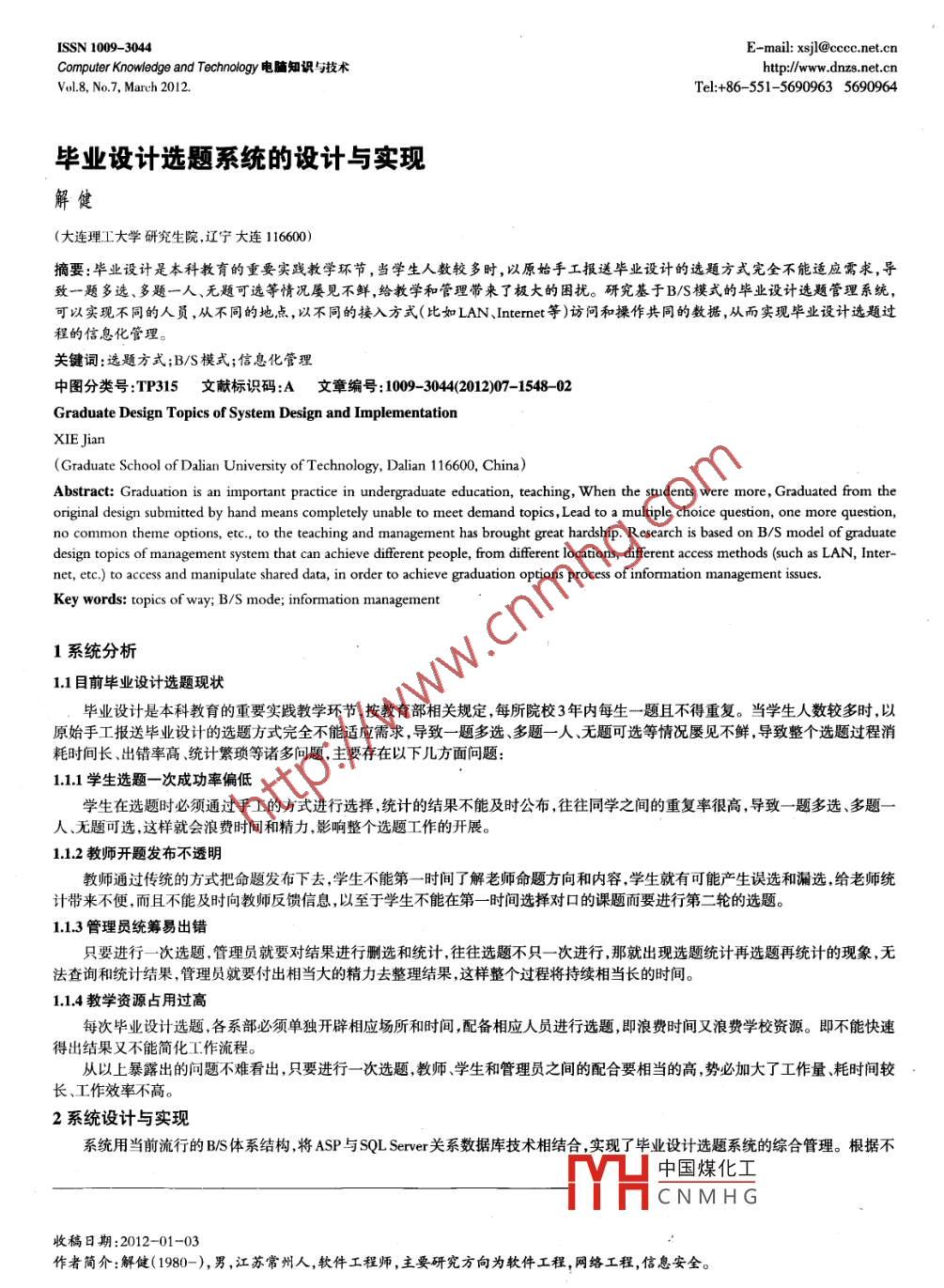 ISSN 1009- -3044E-mail: xsij@cccc.net.cnComputer Knowledge and Technology電腦知識與技術(shù)htp://ww .dnzs.net.cnVol.8, No.7, March 2012.Tel:+86 -551- -5690963 5690964畢業(yè)設(shè)計選題系統(tǒng)的設(shè)計與實現(xiàn)解健(大連理工大學(xué)研究生院,遼寧大連116600)摘要:畢業(yè)設(shè)計是本科教育的重要實踐教學(xué)環(huán)節(jié),當學(xué)生人數(shù)較多時,以原始手工報送畢業(yè)設(shè)計的選題方式完全不能適應(yīng)需求,導(dǎo)致一題多選、多題一人、無題可選等情況屢見不鮮,給教學(xué)和管理帶來了極大的困擾。研究基于B/S模式的畢業(yè)設(shè)計選題管理系統(tǒng),可以實現(xiàn)不同的人員,從不同的地點,以不同的接入方式(比如LAN、Intemnet等)訪問和操作共同的數(shù)據(jù),從而實現(xiàn)畢業(yè)設(shè)計選題過程的信息化管理。關(guān)鍵詞:選題方式;B/S模式;信息化管理中圖分類號:TP315文獻標識碼:A文章 編號: 1009- -3044(2012)07 -1548-02Graduate Design Topics of System Design and ImplementationXIE Jian(Graduate School of Dalian University of Technology, Dalian 116600, China)Abstract: Graduation is an important practice in undergraduate education, teaching, When the students were more, Graduated from theoriginal design submitted by hand means completely unable to meet demand topics, Lead to a multiple choice question, one more question,no common theme options, etc., to the teaching and management has brought great hardship. Research is based on B/S model of graduatedesign topics of management system that can achieve different people, from different locations, different access methods (such as LAN, Inter-net, etc.) to access and manipulate shared data, in order to achieve graduation options process of information management issues.Key words: topics of way; B/S mode; information management1系統(tǒng)分析1.1目前畢業(yè)設(shè)計選題現(xiàn)狀畢業(yè)設(shè)計是本科教育的重要實踐教學(xué)環(huán)節(jié),按教育部相關(guān)規(guī)定,每所院校3年內(nèi)每生一題且不得重復(fù)。當學(xué)生人數(shù)較多時,以原始手工報送畢業(yè)設(shè)計的選題方式完全不能適應(yīng)需求,導(dǎo)致- -題多選 、多題一人、無題可選等情況屢見不鮮,導(dǎo)致整個選題過程消耗時間長、出錯率高、統(tǒng)計繁瑣等諸多問題,主要存在以下幾方面問題:1.1.1學(xué)生選題一次成功率偏低學(xué)生在選題時必須通過手工的方式進行選擇,統(tǒng)計的結(jié)果不能及時公布,往往同學(xué)之間的重復(fù)率很高,導(dǎo)致-題多選、多題一人無題可選,這樣就會浪費時間和精力影響整個選題工作的開展。1.1.2教師開題發(fā)布不透明教師通過傳統(tǒng)的方式把命題發(fā)布下去,學(xué)生不能第--時間了解老師命題方向和內(nèi)容,學(xué)生就有可能產(chǎn)生誤選和漏選,給老師統(tǒng)計帶來不便,而且不能及時向教師反饋信息,以至于學(xué)生不能在第- -時間選擇對口的課題而要進行第二輪的選題。1.1.3管理員統(tǒng)籌易出錯只要進行一次選題.管理員就要對結(jié)果進行刪選和統(tǒng)計,往往選題不只-次進行,那就出現(xiàn)選題統(tǒng)計再選題再統(tǒng)計的現(xiàn)象,無法查詢和統(tǒng)計結(jié)果,管理員就要付出相當大的精力去整理結(jié)果,這樣整個過程將持續(xù)相當長的時間。1.1.4 教學(xué)資源占用過高每次畢業(yè)設(shè)計選題,各系部必須單獨開辟相應(yīng)場所和時間,配備相應(yīng)人員進行選題,即浪費時間又浪費學(xué)校資源。即不能快速得出結(jié)果又不能簡化工作流程。從以上暴露出的問題不難看出,只要進行-一次選題,教師 學(xué)生和管理員之間的配合要相當?shù)母?勢必加大了工作量、耗時間較長、工作效率不高。2系統(tǒng)設(shè)計與實現(xiàn)系統(tǒng)用當前流行的B/S體系結(jié)構(gòu),將ASP與SQL Server關(guān)系數(shù)據(jù)庫技術(shù)相結(jié)合,實現(xiàn)了畢業(yè)設(shè)計選題系統(tǒng)的綜合管理。根據(jù)不中國煤化工FYHCNMHG收稿日期:2012-01-03作者簡介:解健(1980-),男,江蘇常州人,軟件工程師,主要研究方向為軟件工程,網(wǎng)絡(luò)工程,信息安全。的務(wù)數(shù)撒件設(shè)計開發(fā).......本欄目責(zé)任編輯:謝媛媛第8卷第7期(2012年3月)Computer Knowledge and Tehnology電脯知識與技術(shù)同學(xué)科分類模型,融合各專業(yè)選題的特點把整個選題過程分成了管理員、教師、學(xué)生三大功能模塊.該系統(tǒng)功能結(jié)構(gòu)圖如圖1所示。C畢業(yè) 設(shè)計選題系統(tǒng)管理員功能模塊教師功能模塊學(xué)生功能模塊圖1系統(tǒng)功能結(jié)構(gòu)圉根據(jù)劃分不同的角色,來研究不同角色所具有的功能,以及每個模塊之間的協(xié)調(diào)工作。教師的課題在系統(tǒng)中是如何被審定的。在學(xué)生選擇幾個不同志愿的時候,系統(tǒng)是如何為學(xué)生生成志愿的。具體的功能流程如圖2所示。教師登陸系管理員.登陸上報課題上報課題庫未通過審核課題生通選題庫學(xué)生登陸.學(xué)生選題選題信息庫系管理員通過選題確定圖2系統(tǒng)功能流程圖具體的選題流程如下:1)管理員業(yè)務(wù)流程管理員控制著整個系統(tǒng)的業(yè)務(wù)流程,最開始向系統(tǒng)錄入學(xué)生用戶和老師用戶的初始信息如用戶名初始密碼等.設(shè)置系統(tǒng)的基本信息如:專業(yè)、班級名稱,課題類型等。接著向教師用戶打開提交選題功能