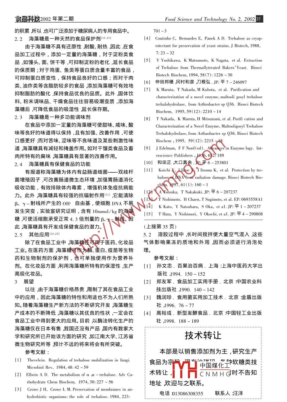36 Food Science and Technology No. 2, 20022002年第二期食品料技新型食品添加劑海藻糖的生產(chǎn)方法及其應(yīng)用王蕾鄭璞史朝暉(江蘇省微生物研究所無錫214063)摘要:綜述了新型食品添加劑海藻糖的生產(chǎn)方法,將該方法應(yīng)用于大規(guī)模的工業(yè)化生產(chǎn)(生產(chǎn)工藝如圖I海藻糖的特性及其作為甜味劑、保護(hù)劑、調(diào)味劑等在.1所示),它使海藻糖的生產(chǎn)成本大幅度地降低,其價(jià)格僅為原來的1/100 ,約500日元/kg左右,使海藻糖食品工業(yè)中的應(yīng)用。在食品工業(yè)中的廣泛應(yīng)用成為可能。目前該公司的海關(guān)鍵詞海藻糖特性生產(chǎn);應(yīng)用藻糖已獲得美國(guó)FDA的認(rèn)可,正式作為食品中的配料中圖分類號(hào):TS202.3文獻(xiàn)標(biāo)識(shí)碼:A成分,開始進(jìn)入美國(guó)市場(chǎng)。文章編號(hào):1005 - 9989(2002)02 - 0036 - 022海藻糖在食品工業(yè)中的應(yīng)用[10]Abstract: The properties and production of trehalose, a kind of淀粉懸濁液new food additive, is reviewed. It can be applied widely in food糊化耐熱性液化酶a-淀粉酶)industry as sweetener, preservative, flavoring, etc.液化←枝切酶(異淀粉酶)Key words: trehalose, property, production, applicationMTSase糖化←ITHasea-淀粉酶海藻糖是由二個(gè)葡萄糖基通過a ,0x-1→1鍵所葡萄糖淀粉酶形成的非還原性二糖,它廣泛存在于昆蟲、霉菌、酵母、海藻糖含量85%以上的糖液地衣、顯花植物、無脊椎動(dòng)物等生物體內(nèi)1.21。它是昆脫色、過濾、濃縮、結(jié)晶、分離蟲中主要存在的血糖,昆蟲飛翔時(shí),利用它作為主要含2分子結(jié)晶水的海藻糖能量;而在動(dòng)植物中,由于它的結(jié)構(gòu)類似于水分子,干燥、裝袋是不可缺少的水的替代物,所以,當(dāng)生物體遇冷凍、海藻糖成品干燥等不良環(huán)境時(shí),海藻糖起到了極為重要的保護(hù)作圖1淀粉生產(chǎn) 結(jié)晶海藻糖工藝用134。.日本Cargill公司所售的海藻糖為含有2分子結(jié)晶海藻糖的生產(chǎn)方法水的白色粉狀晶體,含量在98%以上,它具有不同于由于海藻糖在酵母中的含量最大,可達(dá)細(xì)胞干重-些通 常所用糖類的特點(diǎn)(如表1所示)91。因此在食的20%,所以,傳統(tǒng)的海藻糖的生產(chǎn)方法,以酵母提取品工業(yè)領(lǐng)域中,它有著較-般甜味劑更為廣闊的應(yīng)用為主(501。以干燥、滲透壓的改變來預(yù)處理酵母可使其前景。細(xì)胞中積累更多的海藻糖,經(jīng)過乙醇等有機(jī)溶劑的抽表1海藻糖的性質(zhì)提、精制后,可得較高純度的海藻糖晶體。雖然經(jīng)過了熔點(diǎn)97. 0C多次技術(shù)改進(jìn),但該方法仍存在著成本高、收率低的缺溶解性68. 9g/ 100gH2O(259C)603g/ 100gH2O(909C)點(diǎn)所以不適宜大規(guī)模地工業(yè)化生產(chǎn)產(chǎn)品海藻糖價(jià)格甜度相當(dāng)于蔗糖的45%昂貴,每公斤達(dá)千元以上,僅用于試劑等,未能在食品吸濕性在RH90%以下無吸濕性消化性由小腸消化、吸收工業(yè)中得到應(yīng)用。pH穩(wěn)定性> 9%( pH3. 5~ 10 ,100C 24h)近年來,日本林原研究所研制開發(fā)出了酶法轉(zhuǎn)化熱穩(wěn)定性99%( 120C 90min)生產(chǎn)海藻糖的新方法1781。該方法以淀粉為原料細(xì)菌保存性美拉德反應(yīng)與蛋 白胨無著色反應(yīng)( 120C 90min)100%( 379C ,12個(gè)月)中,如Arthrobacter sp. Q36等,提取的麥芽寡糖基海藻糖合成酶(簡(jiǎn)稱MTSase)及麥芽寡糖基海藻糖水解酶海藻糖是一種新型甜味劑(MTHase)共同催化生成海藻糖其轉(zhuǎn)化率可達(dá)80%以經(jīng)研究表明海藻糖的門“中國(guó)煤化工刁感柔和,而且=菌Streptococcus上。1995年,日本Cargill and Hayashibara Company Ltd.mutants所分司HHCNMH(文性物質(zhì),因此用收稿日期: 2001-10-02它來代替常用的甜味劑對(duì)預(yù)防齲齒起著積極的作用作者簡(jiǎn)介:王蕾(1967-),女,無錫人,助研,主要從事微生可添加于口香糖、飲料等。此外海藻糖也是一種低熱量物酶法轉(zhuǎn)化及產(chǎn)物分離提取研究工作。糖,不易被人體消化吸收,可抑制血清、肝臟中膽固醇食品科技2002年第二期Food Science and Technology No. 2, 2002 37的積累所以,也可廣泛添加于糖尿病人的專用食品中。701 ~32. 2海藻糖是一種天然的食品保護(hù)劑12314] Coutinho C, Bernardes E, Panek A D. Trehalose as cryop-由于海藻糖不具有還原性耐酸、耐熱,因此在食rotectant for preservation of yeast strains. J Biotech, 1988,品加工過程中,添加一定量的海藻糖,對(duì)于淀粉類食7:23 ~ 32品,如饅頭、面、餅干等,可抑制淀粉的老化,延長(zhǎng)食品[5] Y Yoshikawa, K Matsumoto, K Nagata, et al. Extraction的保質(zhì)期;對(duì)于雞蛋、魚類等蛋白質(zhì)含量豐富的食品,of Trehalose from Thermallytreated Bakers'Yeast. BiosciBiotech Biochem, 1994, 58(7): 1226 ~ 30可抑制蛋白質(zhì)變性,保持食品良好的口感;而對(duì)于肉[6] 仲田邦穗,岡村和彥,刀根弘.JP:平7- 246097類、油炸類等含脂肪較多的食品添加海藻糖可有效地7] K Maruta, T Nakada, M Kubota, et al. Purification and抑制脂肪的酸化,保持食品優(yōu)良的品質(zhì)。此外固體飲characterization of a novel enzyme, malooli gosyl trehalose料、粉末調(diào)味品、干燥食品往往容易吸潮變質(zhì),添加海trehalohydrolase, from Arthrobacter sp Q36. Biosci Biotech藻糖后,可降低食品的吸濕性延長(zhǎng)保存期。Biochem, 1995, 59(12):2210~ 142.3海藻糖是一種多功能調(diào)味劑8] T Nakada, K Maruta, H Mit