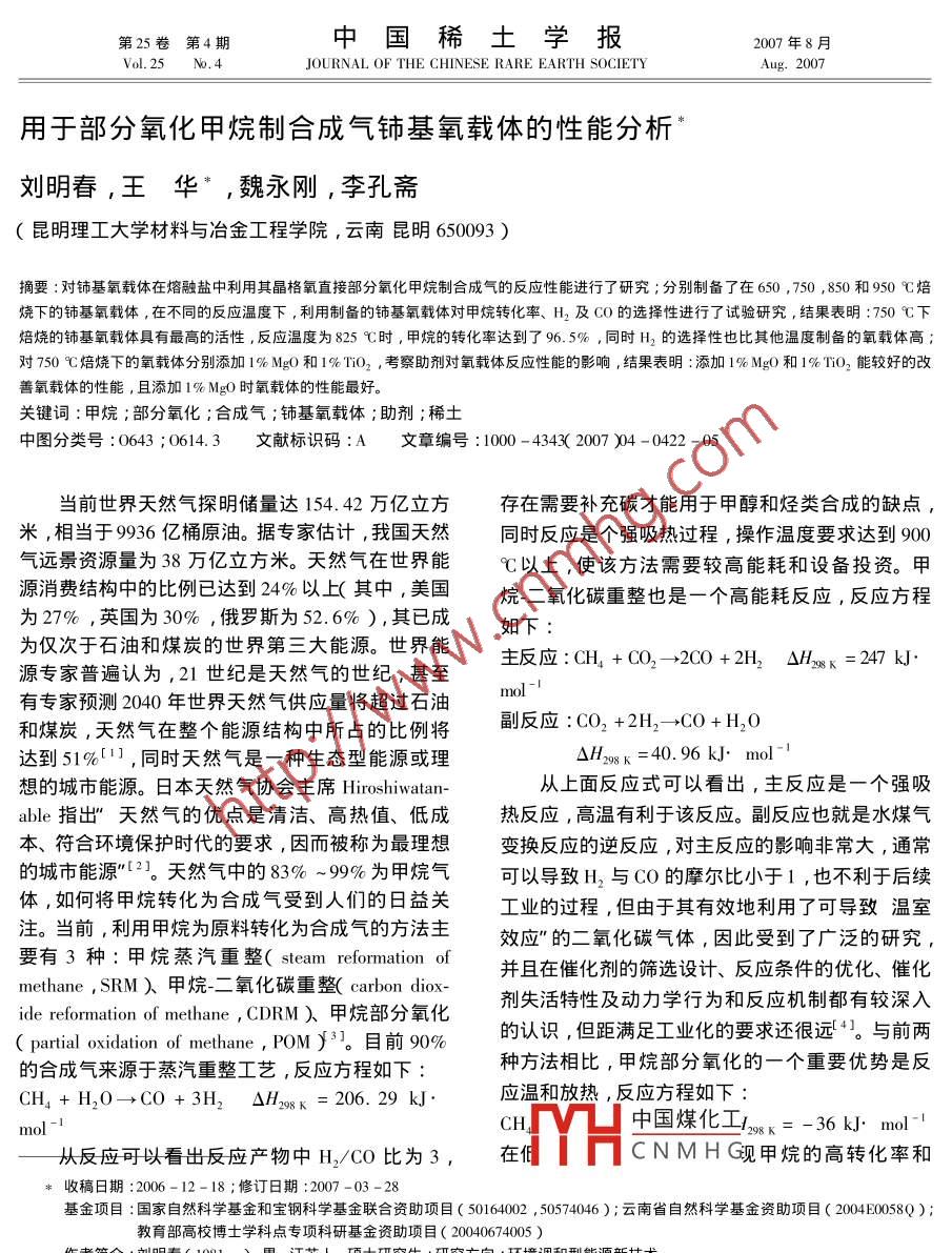 第25卷第4期中國(guó)稀土學(xué)報(bào)2007年8月Vol 25JOURNAL OF THE CHINESE RARE EARTH SOCIETY用于部分氧化甲烷制合成氣鈰基氧載體的性能分析劉明春,王華*,魏永剛,李孔齋〔昆明理工大學(xué)材料與冶金工程學(xué)院,云南昆明650093摘要:對(duì)鈰基氧載體在熔融鹽中利用其晶格氧直接部分氧化甲烷制合成氣的反應(yīng)性能進(jìn)行了研究;分別制備了在650,750,850和950℃焙燒下的鈰基氧載體,在不同的反應(yīng)溫度下,利用制備的鈰基氧載體對(duì)甲烷轉(zhuǎn)化率、H及CO的選擇性進(jìn)行了試驗(yàn)硏究,結(jié)果表明:750℃下焙燒的鈰基氧戟體具有最髙的活性,反應(yīng)溫度為825℃時(shí),甲烷的轉(zhuǎn)化率達(dá)到了96.5%,冋時(shí)H的選擇性也比其他溫度制備的氧載體高對(duì)750℃焙燒下的氧載體分別添加1%MgO和1%TO2,考察助劑對(duì)氧載體反應(yīng)性能的影響,結(jié)果表明:添加1%MgO和1%TO2能較好的改善氧載體的性能,且添加1%MφO時(shí)氧載體的性能最好。關(guān)鍵詞:甲烷;部分氧化;合成氣;鈰基氧載體;助劑;稀土中圖分類號(hào):0643;0614.3文獻(xiàn)標(biāo)識(shí)碼:A文章編號(hào):1000-4343(2007)4-0422-05當(dāng)前世界天然氣探明儲(chǔ)量達(dá)154.42萬(wàn)億立方存在需要補(bǔ)充碳才能用于甲醇和烴類合成的缺點(diǎn)米,相當(dāng)于9936億桶原油。據(jù)專家估計(jì),我國(guó)天然同時(shí)反應(yīng)是個(gè)強(qiáng)吸熱過(guò)程,操作溫度要求達(dá)到900氣遠(yuǎn)景資源量為38萬(wàn)億立方米。天然氣在世界能℃以上,使該方法需要較高能耗和設(shè)備投資。甲源消費(fèi)結(jié)構(gòu)中的比例已達(dá)到24%以上(其中,美國(guó)烷-二氧化碳重整也是一個(gè)高能耗反應(yīng),反應(yīng)方程為27%,英國(guó)為30%,俄羅斯為52.6%),其已成如下為僅次于石油和煤炭的世界第三大能源。世界能源專家普遍認(rèn)為,21世紀(jì)是天然氣的世紀(jì),甚至主反應(yīng):CH4+CO2→2CO+2H2△Hsx=247kJ有專家預(yù)測(cè)2040年世界天然氣供應(yīng)量將超過(guò)石油和煤炭,天然氣在整個(gè)能源結(jié)構(gòu)中所占的比例將副反應(yīng):CO2+2H2→CO+H2O達(dá)到51%1,同時(shí)天然氣是一種生態(tài)型能源或理△H40.96kJ·mol想的城市能源。日本天然氣協(xié)會(huì)主席 Hiroshiwatan-從上面反應(yīng)式可以看出,主反應(yīng)是一個(gè)強(qiáng)吸able指出”′天然氣的優(yōu)點(diǎn)是清潔、高熱值、低成熱反應(yīng),高溫有利于該反應(yīng)。副反應(yīng)也就是水煤氣本、符合環(huán)境保護(hù)時(shí)代的要求,因而被稱為最理想變換反應(yīng)的逆反應(yīng),對(duì)主反應(yīng)的影響非常大,通常的城市能源[2。天然氣中的83%~99%為甲烷氣可以導(dǎo)致H2與CO的摩爾比小于1,也不利于后續(xù)體,如何將甲烷轉(zhuǎn)化為合成氣受到人們的日益關(guān)工業(yè)的過(guò)程,但由于其有效地利用了可導(dǎo)致溫室注。當(dāng)前,利用甲烷為原料轉(zhuǎn)化為合成氣的方法主效應(yīng)”的二氧化碳?xì)怏w,因此受到了廣泛的研究,要有3種∶甲烷蒸汽重整( steam reformation ofmethane,SRM)甲烷-二氧化碳重整( carbon diox-并且在催化劑的篩選設(shè)計(jì)、反應(yīng)條件的優(yōu)化、催化ide reformation of methane,CDRM)甲烷部分氧化劑失活特性及動(dòng)力學(xué)行為和反應(yīng)機(jī)制都有較深入( partial oxidation of methane,POM)3。目前90%的認(rèn)識(shí),但距滿足工業(yè)化的要求還很遠(yuǎn)。與前兩的合成氣來(lái)源于蒸汽重整工藝,反應(yīng)方程如下種方法相比,甲烷部分氧化的一個(gè)重要優(yōu)勢(shì)是反CH4+H,O→CO+3H,△H28k=206.29kJ應(yīng)溫和放熱,反應(yīng)方程如下olCH中國(guó)煤化工36kJ·mol從反應(yīng)可以看出反應(yīng)產(chǎn)物中H,/CO比為3在CNMH視甲烷的高轉(zhuǎn)化率和*收稿日期:2006-12-18;修訂日期:2007-03-28基金項(xiàng)目:國(guó)家自然科學(xué)基金和寶鋼科學(xué)基金聯(lián)合資助項(xiàng)目(50164002,50574046);云南省自然科學(xué)基金資助項(xiàng)目(2004F0058Q)教育部高校博士學(xué)科點(diǎn)專項(xiàng)科研基金資助項(xiàng)目(20040674005)眾妥羈春(1981-),男,江蘇人,碩士研究生;研究方向:環(huán)境調(diào)和型能源新技術(shù)wanghuaheat@hotmail.com4期劉明春等月用于部分氧化甲烷制合成氣鈰基氧載體的性能分析H2,CO的高選擇性。由于反應(yīng)接觸時(shí)間短,可避1.2氧載體的表征免高溫非催化部分氧化法伴生的燃燒反應(yīng),生成氧載體的物相由日本理學(xué)3015L級(jí)型XRD射的合成氣中H2與CO摩爾比接近2,可直接用于甲線衍射儀進(jìn)行測(cè)定,Cu靶,電壓35kV,管電流20醇合成及烴類的FT合成等后續(xù)工業(yè)過(guò)程5。但常mA,掃描速度8(°)min1,掃描范圍20=5°規(guī)甲烷催化部分氧化制合成氣需要從空氣中分離純氧,而目前制氧裝置的投資和操作費(fèi)用都很高這無(wú)疑又抵消了這一工藝的優(yōu)點(diǎn)6。為了解決這1.3氧載體的活性評(píng)價(jià)問(wèn)題,國(guó)內(nèi)外研究者提出了晶格氧用于甲烷氧氧載體的反應(yīng)活性評(píng)價(jià)在自建的一套切換反化制合成氣的新思路。由于部分氧化甲烷制應(yīng)裝置中進(jìn)行,實(shí)驗(yàn)裝置如圖1所示。合成氣是一個(gè)放熱過(guò)程,存在能量的合理有效利本實(shí)驗(yàn)采用的熔融鹽為質(zhì)量比為1:1的用問(wèn)題,因此,筆者所在的課題組在綜