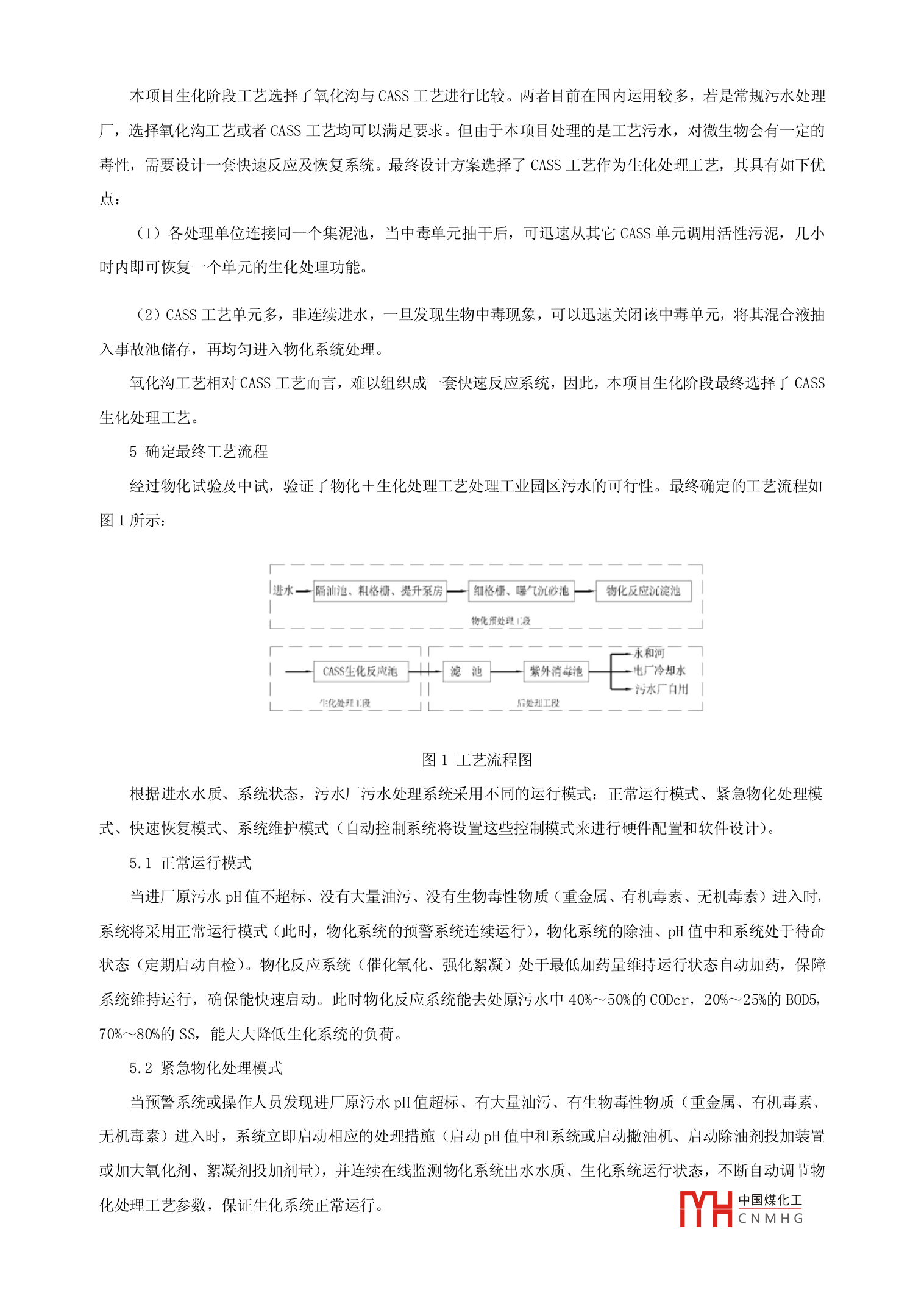 關于工業(yè)污水處理的分析研究林玉瑤廣 東省中山市528400摘要:隨著城市化進程的加快和經(jīng)濟建設的飛速發(fā)展,工業(yè)污水排放量也迅速增長,不少工廠為了經(jīng)濟利益偷排未經(jīng)處理的污水的任意排放,不僅造成城市及水環(huán)境的污染,更加危害百姓身體健康,同時額制約了城市各方面的發(fā)展速度。在城市污水處理廠建設中,工藝方案的優(yōu)化選擇除其直接影響整個工程的投資,還對后續(xù)設計工作的開展和污水處理廠建成后合理有效地運行起著決定性的影響本文以工程實例分析物化處理+生化處理系統(tǒng)在工業(yè)園區(qū)污水處理廠設計中的實際應用。關鍵詞:工業(yè)污水;污水處理; CASS 工藝Abstract: with the acceleration of urbanization and the rapid development of economy, the industrial wastewater rapidly, many factories to economicinterests to steal row of untreated sewage discharge of any, not only jin cities and water pollution, more harm people healthy body, at the same time, theforehead restricted the city all aspects of development speed. In the construction of urban sewage treatment plants, and process the optimal choice ofits direct influence the whole project in the investment, also on subsequent design work development and sewage treatment plants after the completionof the reasonable to run efectively plays a decisive impact based on the engineering example analysis physico-chemical treatment biochemicaltreatment system in土industrial park in the practical application of sewage treatment plant design.Keywords: industrial wastewater; Sewage treatment; CASS process中圖分類號: F4文獻標識碼: A文章編號:1引言在全球經(jīng)濟快速發(fā)展的今天,環(huán)保問題,特別是工業(yè)污水處理已成為各國研究的熱點。目前國內(nèi)多數(shù)工業(yè)園區(qū)污水都采用了集中處理方式進行處理。該類污水處理廠進水相當復雜,經(jīng)常含有重金屬、鉻合物等對微生物有毒害作用的污染物,常規(guī)處理工藝無法滿足處理要求,給污水處理工藝提出了新的挑戰(zhàn)。某市某經(jīng)濟區(qū)內(nèi)污水主要以工業(yè)廢水為主,導致原有水質(zhì)凈化廠A污水生化處理系統(tǒng)經(jīng)常中毒癱瘓,污水只有直排河道,對當?shù)厮h(huán)境造成了較大的影響。改造設計時,出水須滿足《城鎮(zhèn)污水處理廠污染物排放標準》(GB18918-2002)-級A標準及省標DB44/26 -2001 - -級標準(第二時段)二者之間較嚴者。進水水質(zhì)差,出水要求非常嚴格,給污水處理工藝提出了新的挑戰(zhàn)。在設計本污水處理廠的過程中,采用了物化處理+常規(guī)生化系統(tǒng)處理的新型工藝。2確定工藝流程水質(zhì)凈化廠A進水水質(zhì)十分復雜,除含有B0D5、CODer、SS、 NH3-N(TN)、P03-P(TP) 等常規(guī)污染物之外,其進水中還含有重金屬、鉻合物、油污、表面活性劑、難降解有機物等難以為常規(guī)生物方法所能處理的污染物。而且由于部分企業(yè)偷排、發(fā)生事故時直排,致使進廠污水指標經(jīng)常超標,嚴重影響污水廠“A的正常運行。-年內(nèi)受有毒物質(zhì)、強酸、強堿、高含磷污水影響很大,共計10多次,共影響污水處理30天,造成約20萬噸污水直排河涌。集中處理率只有90%,超標進水主要影響物質(zhì)為:PH偏酸或偏堿(甚至強酸性、強堿性)磷酸含量高表面活性劑含量偏高油污含量偏高中國煤化工MYHCNM HG重金屬特別是銅和鉻離子濃度偏高其它未知明確成分的毒性物質(zhì)。針對水質(zhì)凈化廠A 進水水質(zhì)的實際情況以及排水系統(tǒng)管理的現(xiàn)狀,污水廠“工藝必須采用物化預處理與常規(guī)生化處理相結合的工藝路線,即在物化預處理階段,對進水的pH值進行調(diào)整,撇除油污,同時采用化學方法去除水中的重金屬、鉻合物等對微生物有毒害作用的污染物,使后續(xù)生化處理設施能夠達正常運行,確保出水達標排放。3進行物化試驗,確保工藝的有效性和可行性為了驗證物化I藝的處理效果,本工程在設計前做了大量的實驗工作,確保工藝的有效性和可行性。試驗過程采用實際調(diào)研、理論分析研究、實驗室靜態(tài)試驗、現(xiàn)場實際模擬中試試驗、CASS 中試模型試驗等相結合的研究方法,進行研究。試驗方案:采用催化氧化絮凝沉淀技術進行物化預處理。通過催化氧化絮凝沉淀方法,將超標排放污水中的對微生物有毒有害物質(zhì)進行氧化、沉淀或者轉化去除,降低污染物對微生物的毒性,確保污水生物處理的良好運行。中試結論:中試工藝采用了將絮凝沉淀氣浮融為一體的物化處理工藝裝置- -高 效固液分離裝置,易于沉淀的污染物用沉淀的方式去除,不易沉淀的用氣浮的方式處理,工藝與裝置的適應性強。試驗過程中,利用難處理的企業(yè)生產(chǎn)廢水與水質(zhì)凈化廠A正常進水,按照模擬實際超標排放水質(zhì)情況的比例進行調(diào)配。不同時段污水廠與模型出水對比如下表所示:編號取水位置CODcr水質(zhì)凈化廠A進水8.1107. 1534模型出水8.246. 85水質(zhì)凈化廠A進水.7.9I 56.4938. 1756.3207.19316. 67349. 0767.3226. 49173. 337.447. 087.5藥劑選用結論:用不同的藥劑及藥劑組合進行1000多次試驗找到技術可行、經(jīng)濟合理的氧化還原絮凝沉淀藥劑,并取得良好的試驗效果。對氧化還原絮凝沉淀試驗后的上清液進行活性污泥曝氣試驗,檢驗反應后的上清液的生物毒性。試驗結果顯示,反應后的上清液對活性污泥活性幾乎無影響。與小