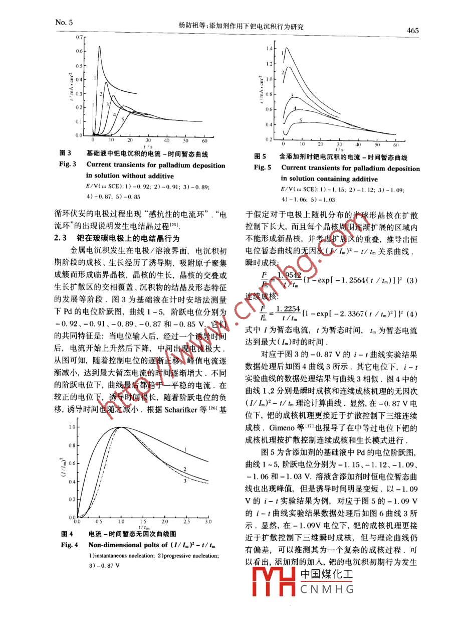 物理化學(xué)學(xué)報(bào)( Wuli Huaxue Xuebao)MayActa Phys. -Chim. Sin.. 2004 , 20(5):463 ~ 467添加劑作用下鈀電沉積行為研究●楊防祖黃令許書(shū)楷周紹民(廈門(mén)大學(xué)化學(xué)系,固體表面物理化學(xué)國(guó)家重點(diǎn)實(shí)驗(yàn)室,物理化學(xué)研究所,廈門(mén)361005)摘要在含有4gL1 Pd(NH)2Clz和104 g'L-1 NHHPO,的閃鍍鈀基礎(chǔ)電解液中,采用極化曲線、循環(huán)伏安法和計(jì)時(shí)安培法研究添加劑作用下鈀在玻璃碳電極上的電沉積和電結(jié)晶行為.結(jié)果表明,添加劑阻化鈀的電沉積;鈀在玻碳電極上的交換電流密度很低;鈀電沉積過(guò)程經(jīng)歷了晶核形成過(guò)程,其電結(jié)晶機(jī)理在不含添加劑時(shí)接近于三維連續(xù)成核,含添加劑時(shí)接近于三維瞬時(shí)成核.關(guān)鍵詞:鈀, 電沉積, 電結(jié)晶, 添加劑, 動(dòng)力學(xué)中圖分類(lèi)號(hào): 0646Pd及其合金可廣泛地應(yīng)用于裝飾行業(yè)和電子的玻碳電極(d=6mm)作研究電極,輔助電極為鉑工業(yè)等領(lǐng)域1+41,可代替鎳或鈀鎳合金作為軟金和絲,參比電極為飽和甘汞電極(SCE),文中電位都相硬金底層、防銀變色表層、超結(jié)構(gòu)膜層(51和擴(kuò)散阻對(duì)于SCE.基礎(chǔ)電解液為4g°L-' Pd(NH)2Cl,104擋層1071.鈀具有較低的氫過(guò)電位和優(yōu)良的催化性g'L-' NHH:PO,,pH 8. 0 ~ 8.5(NHs.H2O調(diào)節(jié)),能而可望作為燃料電池的電極1891.用分析純?cè)噭┖腿握麴s水配制.添加劑XP為煙鈀鎳和鈀鈷合金10.12|在電沉積過(guò)程中氫的吸收酸的有機(jī)合成產(chǎn)物。實(shí)驗(yàn)前,電解液通人氮?dú)獬康?但在純鈀電沉積過(guò)程中,由于鈀具有較低的氧,實(shí)驗(yàn)時(shí)電解液處于室溫(28 C )狀態(tài).進(jìn)行循環(huán)氫過(guò)電位和很強(qiáng)的氫吸收能力13.151,結(jié)果必然伴隨伏安(CV)實(shí)驗(yàn)時(shí),電位首先向負(fù)方向掃描,然后向著較為激烈的析氫過(guò)程,并使鍍層產(chǎn)生高內(nèi)應(yīng)力,正方向掃描.進(jìn)行計(jì)時(shí)安培測(cè)定時(shí),初始電位和最發(fā)生針孔、龜裂、a. β相變化和Pd2H、Pd,H2等各種高電位都設(shè)定為開(kāi)路電位,將電極脈沖到一個(gè)較高氫化物的夾雜,從而不僅使得鍍層性能惡化,而且的過(guò)電位,探索鈀在玻碳電極上的電結(jié)晶初期行為.鈀的電沉積過(guò)程更加復(fù)雜.為了提高實(shí)驗(yàn)結(jié)果的重現(xiàn)性,每次測(cè)定前,研究電在不同的電解液和添加劑組成中,鈀的電沉積極的工作面依次在6號(hào)金相砂紙和撒有0.05 μm和電結(jié)晶機(jī)理將發(fā)生變化124. 1620.我們也對(duì)檸檬酸的氧化鋁粉末的潮濕細(xì)絨布上拋光至鏡亮,經(jīng)過(guò)超鉀純鈀電沉積工藝和機(jī)理進(jìn)行過(guò)研究121.然而,對(duì)聲波處理,然后用去離子水和三次蒸餾水沖洗.含有添加劑的磷酸二氫銨閃鍍鈀電解液體系,未見(jiàn)關(guān)于鈀電沉積機(jī)理報(bào)導(dǎo).有關(guān)鈀電沉積的添加劑2結(jié)果與討論已有專(zhuān)利報(bào)導(dǎo)12*1.本文采用自己研制的添加劑即含2.1鈀在玻碳(GC )電極上的電極過(guò)程動(dòng)力學(xué)氮雜環(huán)有機(jī)物,采用極化曲線、循環(huán)伏安法和計(jì)時(shí)極化曲線可以用于測(cè)定鈀的電沉積機(jī)理和電安培法探討在閃鍍鈀電解液中,添加劑作用下鈀在極過(guò)程動(dòng)力學(xué).在不含(曲線1)與含20 mL.L-1添玻璃碳電極.上的電極過(guò)程動(dòng)力學(xué)和電結(jié)晶機(jī)理.加劑XP(曲線2)的閃鍍鈀基礎(chǔ)液中,鈀在玻碳電極上陰極過(guò)程的極化曲線如圖1所示,掃描速度為11實(shí)驗(yàn)方法mV.s-'.結(jié)果表明,在-0.73 V附近,玻碳電極上電化學(xué)實(shí)驗(yàn)在CH1660電化學(xué)綜合測(cè)試儀上逐漸出現(xiàn)表征鈀沉積的微小電流.不含添加劑時(shí)進(jìn)行.采用玻璃三室電解池,固定在聚四氟乙烯上電位負(fù)移約140mV,含添加劑時(shí)電位負(fù)移180mV,2003-10-06 收到初稿,2003-12-09 收到修改稿.聯(lián)系人: 楊防祖(E-mail: smzhou@ xnu. edu. cn; Tel/Fax: 0592-2181436). . 國(guó)家自然科學(xué)基金(20073037)和優(yōu)秀國(guó)家重點(diǎn)實(shí)驗(yàn)室基金(002001)資助項(xiàng)目中國(guó)煤化工MHCNMHG464Acta Phys. -Chim. Sin. 1 Wuli Huaxue Xuebao), 2004Vol. 2004[4003-3.0自.2-!I2百21.0葉10--1.0-1500E/ V(u SCE)E/ V(x SCE)圖1鈀在 GC電極上的陰極極化曲線圖2鈀在玻碳電極.上的循環(huán)伏安圄Fig. 1 Pd cathodic polarization curves onFig.2 cV curves for palladium depositionGC electrodeon GC electrode1)non adive: 2 lddtive (20 mLL")1 )non aitiv: 2 )dditive (20 mL.L-)此微小電流的增加幅度很小,說(shuō)明了鈀在玻碳電極近似作為體系的平衡電位.將圖1實(shí)驗(yàn)結(jié)果作η~上的電結(jié)晶初期電子傳遞速度慢,需要- -誘導(dǎo)活I(lǐng)gi關(guān)系曲線圖,在不含添加劑的-0.90~ -0.94 V化、吸附原子聚集成簇而形成臨界晶核的過(guò)程.和含添加劑的-0.94~ -0.97 V電位范圍內(nèi),ηGimeno等1"71實(shí)驗(yàn)結(jié)果也證明了低過(guò)電位下鈀電沉與lgi呈現(xiàn)良好的線性關(guān)系。根據(jù)該直線斜率和截積反應(yīng)的活化過(guò)程,隨著陰極電位的進(jìn)- -步 負(fù)移,距,可求得傳遞系數(shù)a和交換電流密度iP. 結(jié)果列陰極電流迅速提高.由于氫在Pd上有較低的析出于表1. i" 值很小,說(shuō)明了在本實(shí)驗(yàn)體系中鈀在玻過(guò