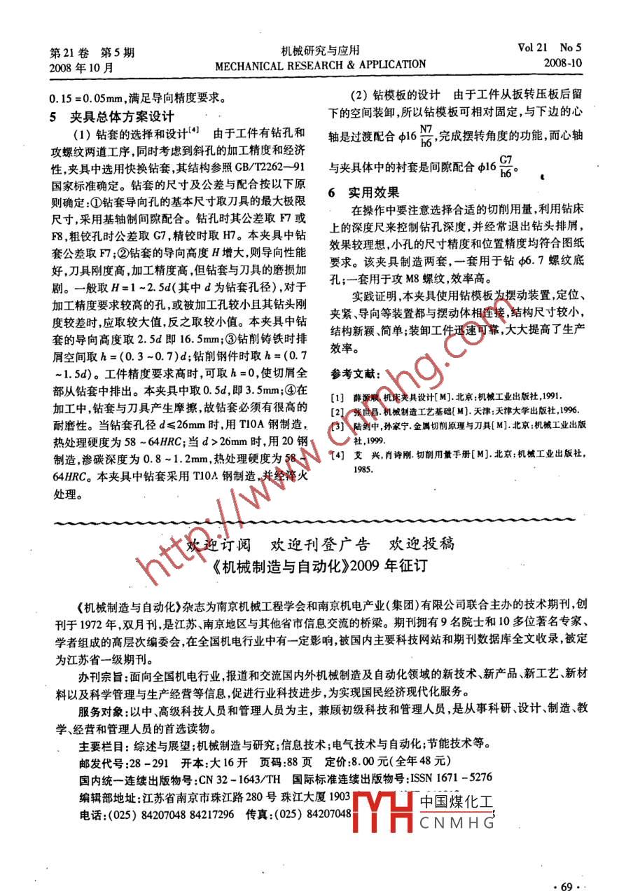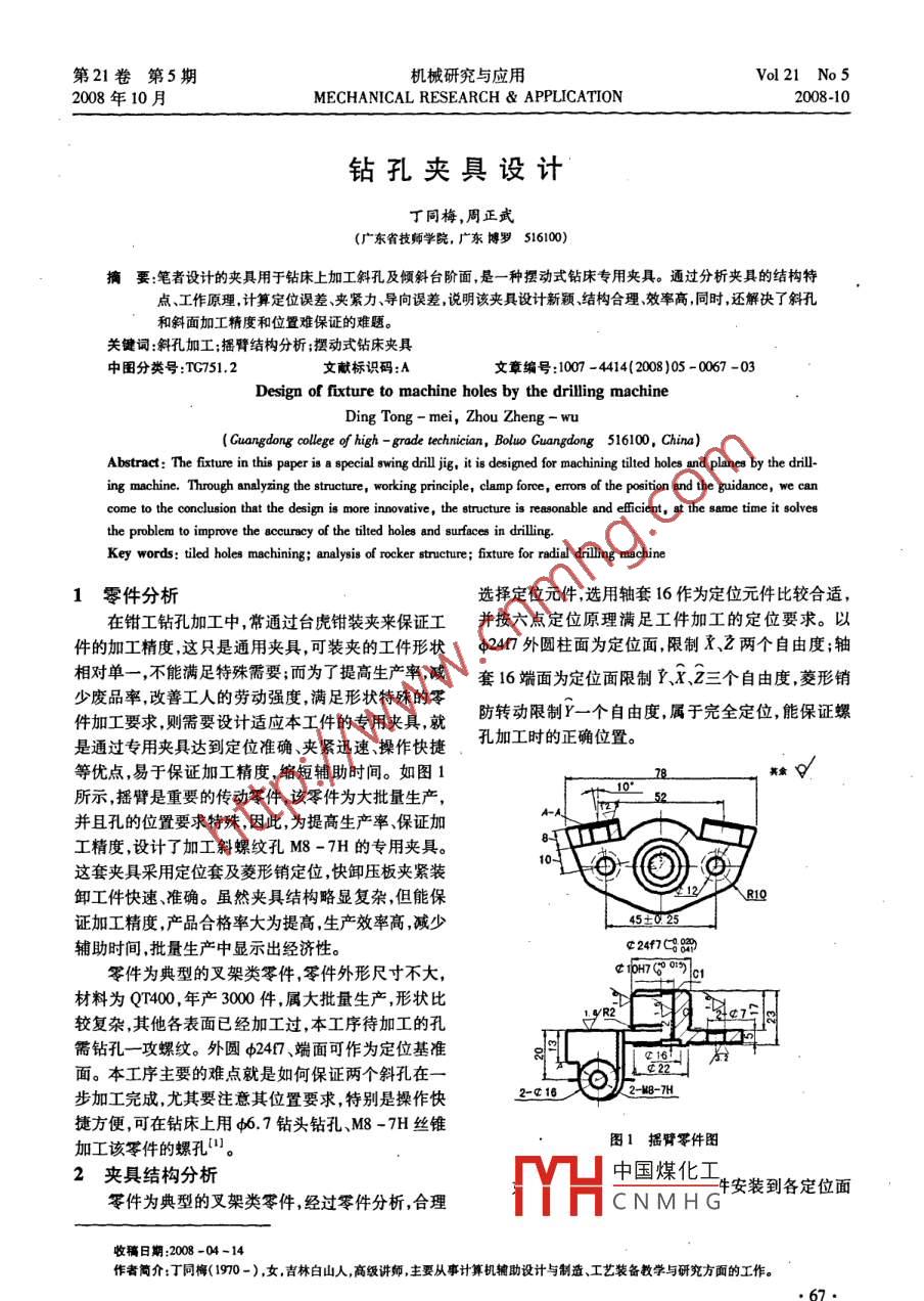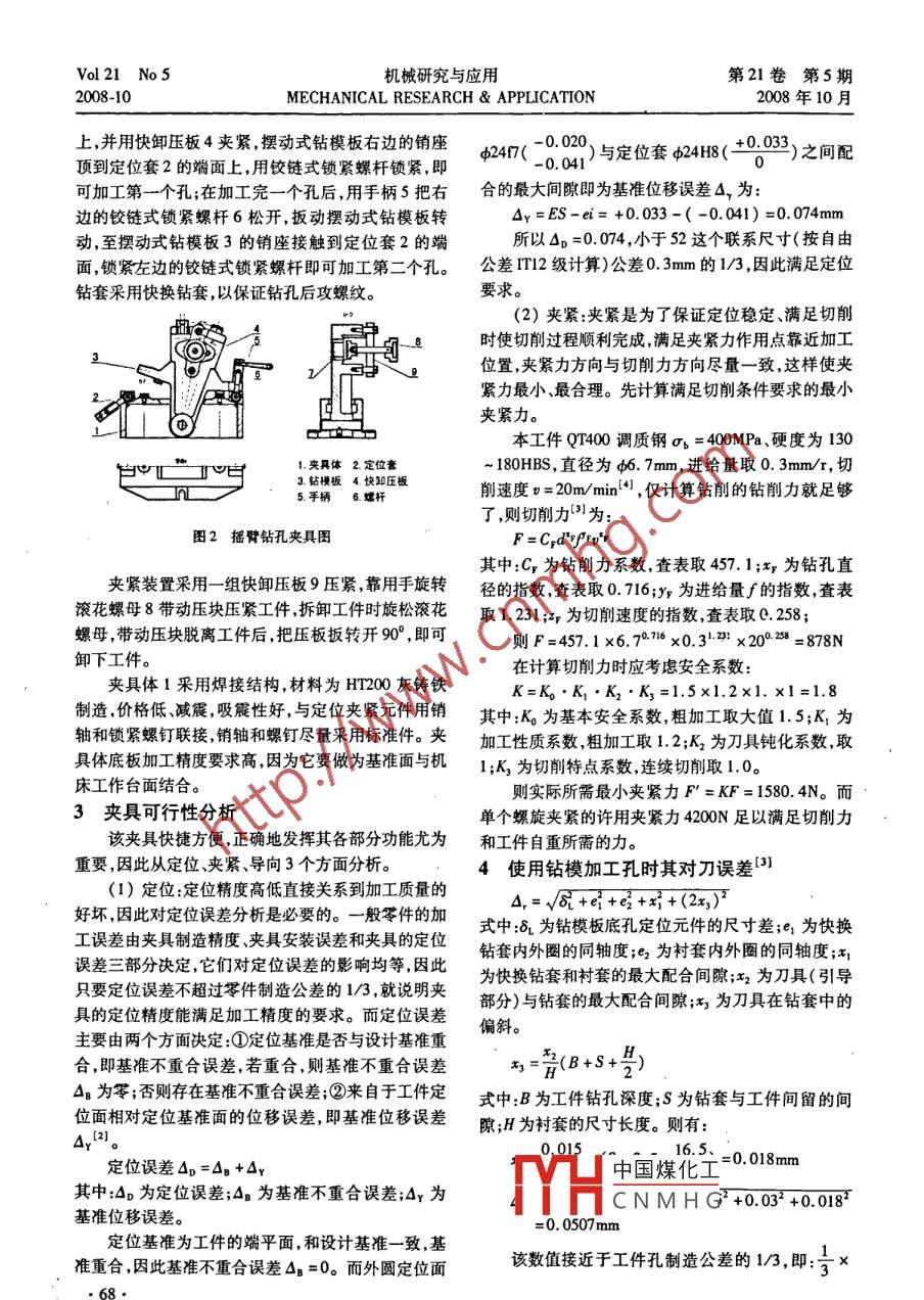 第21卷第5期機械研究與應用Vol21 No 52008年10月MECHANICAL RESEARCH & APPLICATION2008-10鉆孔夾具設計丁同梅,周正武(廣東省技師學院,廣東博羅516100)摘要:筆者設計的夾具用于鉆床 上加工斜孔及傾斜臺階面,是一種擺動式鉆床專用夾具。通過分析夾具的結(jié)構(gòu)特點、工作原理,計算定位誤差、夾緊力導向誤差,說明該夾具設計新穎、結(jié)構(gòu)合理、效率高,同時,還解決了斜孔和斜面加工精度和位置難保證的難題。關鍵詞:斜孔加工;搖臂結(jié)構(gòu)分析;攖動式鉆床夾具中圖分類號:TC751.2文獻標識碼:A文章編號:1007 -4414(2008)05 -0067 -03Design of fixture to machine holes by the driling machineDing Tong - mei, Zhou Zheng - wu(Guangdong cllge of high - grade technician, Boluo Guangdong 516100, China)Abstract: The fxture in this paper is a special swing drill jig, it is designed for machining tilted hboles and planes by the dil-ing machine. Through analyzing the structure, working principle, clamp fore, erors of the position and the guidance, we cancome to the conclusion that the design is more innovative, the structure is reasonable and efcient, t the same time it solvesthe problem to improve the accurncy of the tilted holes and sufaces in dilling.Key words: tiled holes machining; analysis of rocker structure; fxture for radial dilling machine1零件分析選擇定位元件,選用軸套16作為定位元件比較合適,在鉗工鉆孔加工中,常通過臺虎鉗裝夾來保證工并按六點定位原理滿足工件加工的定位要求。以件的加工精度,這只是通用夾具,可裝夾的工件形狀φ247外圓柱面為定位面,限制x2兩個自由度;軸相對單一,不能滿足特殊需要;而為了提高生產(chǎn)率,減套16端面為定位面限制1.X、Z三個自由度,菱形銷少廢品率,改善工人的勞動強度,滿足形狀特殊的零防轉(zhuǎn)動限制Y-一個自由度,屬于完全定位,能保證螺件加工要求,則需要設計適應本工件的專用夾具,就孔加工時的正確位置。是通過專用夾具達到定位準確、夾緊迅速、操作快捷等優(yōu)點,易于保證加工精度,縮短輔助時間。如圖110_7所示,搖臂是重要的傳動零件,該零件為大批量生產(chǎn),A-A并且孔的位置要求特殊,因此,為提高生產(chǎn)率、保證加時工精度,設計了加工斜螺紋孔M8 -7H的專用夾具。0這套夾具采用定位套及菱形銷定位,快卸壓板夾緊裝卸工件快速準確。雖然夾具結(jié)構(gòu)略顯復雜,但能保R10證加工精度,產(chǎn)品合格率大為提高,生產(chǎn)效率高,減少45+0.25輔助時間,批量生產(chǎn)中顯示出經(jīng)濟性。C24f7C D零件為典型的叉架類零件,零件外形尺寸不大,t IpHr7C 015101材料為QT400,年產(chǎn)3000件,屬大批量生產(chǎn),形狀比較復雜,其他各表面已經(jīng)加工過,本工序待加工的孔歲照需鉆孔-攻螺紋。外圓φ247、端面可作為定位基準面。本工序主要的難點就是如何保證兩個斜孔在--L 222.步加工完成,尤其要注意其位置要求,特別是操作快2-C162-MB-7H捷方便,可在鉆床上用φ6.7鉆頭鉆孔、M8 -7H絲錐圖1搖臂零件圖加工該零件的螺孔"。2夾具結(jié)構(gòu)分析中國煤化工牛安裝到各定位面零件為典型的叉架類零件,經(jīng)過零件分析,合理YHC NMH G'收稿日期:2008 -04-14作者簡介:丁同梅(1970- ) ,女,吉林白山人,高級講師,主要從事計算機輔助設計與制造、工藝裝備教學與研究方面的工作?!?7.Vol 21 No5機械研究與應用第21卷第5期2008-10MECHANICAL RESEARCH & APPLICATION2008年10月上,并用快卸壓板4夾緊,擺動式鉆模板右邊的銷座-0.020+0.033φ2417(-0:02)與定位套424H8(-02)之間配頂?shù)蕉ㄎ惶?的端面上,用鉸鏈式鎖緊螺桿鎖緊,即可加工第一個孔;在加工完-一個孔后,用手柄5把右合的最大間隙即為基準位移誤差s,為: .邊的鉸鏈式鎖緊螺桿6松開,扳動擺動式鉆模板轉(zhuǎn)Qy=ES-ei= +0.033-( -0.041) =0.074mm動,至擺動式鉆模板3的銷座接觸到定位套2的端所以Op =0.074,小于52這個聯(lián)系尺寸(按自由面,鎖緊左邊的鉸鏈式鎖緊螺桿即可加工第二個孔。公差IT12級計算)公差0.3mm的1/3 ,因此滿足定位鉆套采用快換鉆套,以保證鉆孔后攻螺紋。要求。(2)夾緊:夾緊是為了保證定位穩(wěn)定、滿足切削了青時使切削過程順利完成,滿足夾緊力作用點靠近加工旦位置,夾緊力方向與切削力方向盡量-致,這樣使夾緊力最小、最合理。先計算滿足切削條件要求的最小夾緊力。中本工件QT400調(diào)質(zhì)鋼σ。= 400MPa、硬度為1301.夾具體2.定位套~180HBS,直徑為φ6.7mm,進給量取0.3mm/r,切]RL73.鉆模板4. 快卸壓板削速度0= 20m/ minl"),僅計算鉆削的鉆削力就足夠5.手柄6.螺桿了,則切削力"為:圖2搖臂鉆孔夾具圖F = Cpd*frv*r其中:C,為鉆削力系數(shù),查表取457. 1;xp為鉆孔直夾緊裝置采用一組快卸壓板9壓緊,靠用手旋轉(zhuǎn)徑的指數(shù)查表取0. 716;Yr為進給量f的指數(shù),查表滾花螺母8帶動壓塊壓緊工件,拆卸工件時旋松滾花取1. 231 ;zp為切削速度的指數(shù),查表取0.258;螺母,帶動壓塊脫離工件后,把壓板扳轉(zhuǎn)開90° ,即可則F=457.1 x6. 70.76 x0.3.2: x209.258 =878N卸下工件。在計算切削力時應考慮安全系數(shù):夾具體1采用焊接結(jié)構(gòu),材料為HT200灰鑄鐵K=K●K●K2. Kz=1.5x1.2x1. x1=1.8制造,價格低減震,吸震性好,與定位夾緊元件用銷其中:K。為基本安全系數(shù),粗加工取大值1.5;K;為軸和鎖緊螺釘聯(lián)接,銷軸和螺釘盡量采用標準件。夾加工性質(zhì)系數(shù),粗加工取1. 2;Kz為刀具鈍化系數(shù),取具體底板加工精度要求高,因為它要做為基準面與機1;K,為切削特點