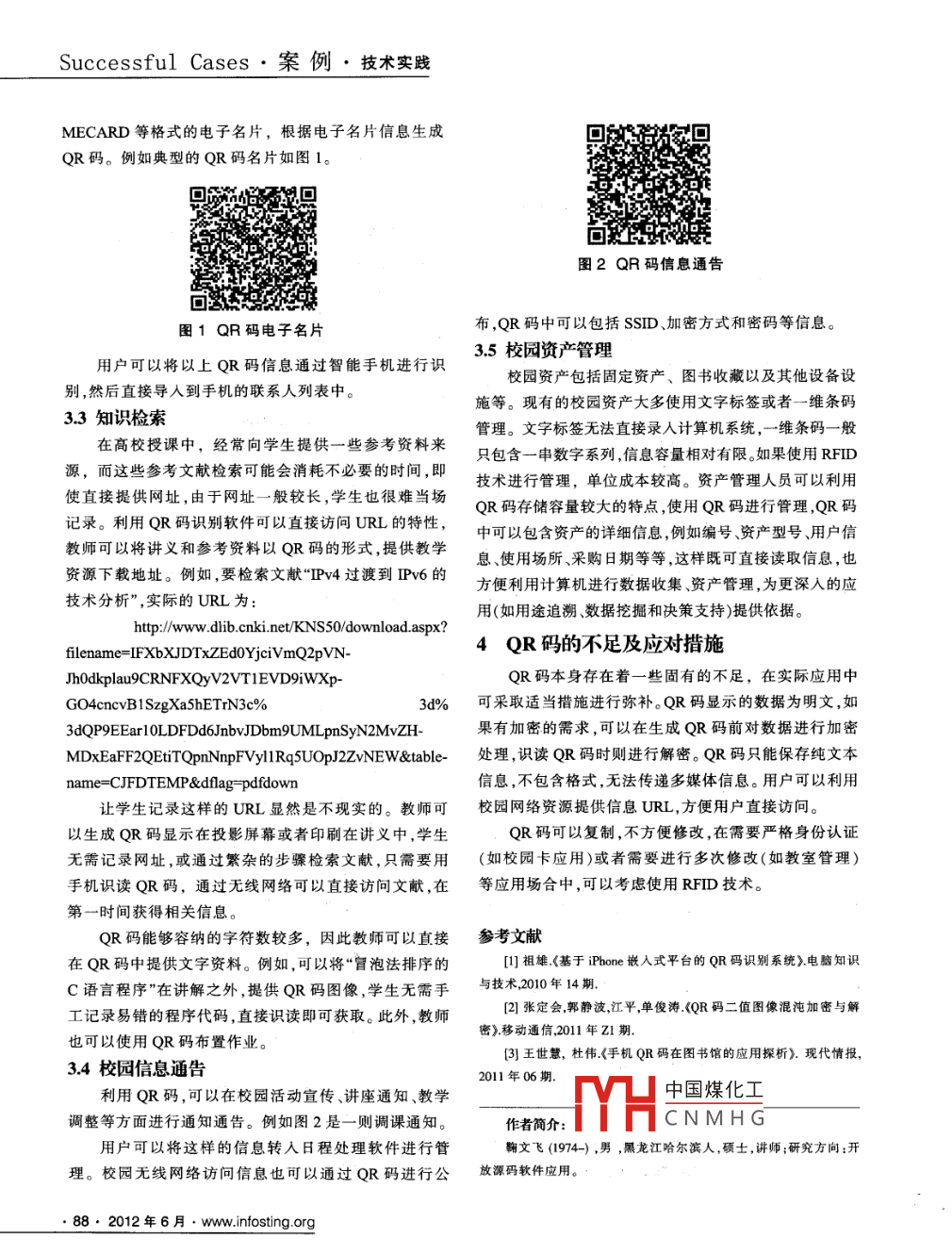Successful cases·案例·技術(shù)實踐QR碼的校園應(yīng)用鞠文飛中國青年政治學(xué)院計算機教學(xué)與應(yīng)用中心北京100089)【摘要】文章介紹了QR碼的特點,介紹了利用 PHP QR Code等技術(shù)生成和識別QR碼的方法,并針對校園環(huán)境中QR碼的典型應(yīng)用場景進行了描述?!娟P(guān)鍵詞】二維碼;QR碼;校園應(yīng)用Application of QR Code in University EnvironmentJu Wen-fei( China youth University for Political Sciences Beijing 100089)Abstract This article introduces the characteristics of the QR Code describes the use of technologies such as PHP QR Code generation andrecognition of QR Code, and describes in typical application scenarios for the QR Code in the campus environmentKeywords ] QR code; matrix code campus application1背景QR碼可以對任意文本內(nèi)容進行編碼,一般常用來QR碼是二維條碼的一種類型,在物聯(lián)網(wǎng)領(lǐng)域和商與移動設(shè)備或PC端的應(yīng)用程序相配合,轉(zhuǎn)換聯(lián)系信息、業(yè)宣傳領(lǐng)域的應(yīng)用較為廣泛。QR碼是日本 Denso wave日程安排、電子郵件和網(wǎng)址、電話號碼、短信、Wi-Fi網(wǎng)絡(luò)公司發(fā)明的二維編碼,與其他二維碼相比,QR碼的優(yōu)勢信息以及其他文本等。包括數(shù)據(jù)存儲容量大、印刷尺寸較小、識讀速度快、不限2.2生成QR碼制識讀角度、具備極強的糾錯能力等普通用戶可以使用 Internet上的QR碼生成程序和在校園環(huán)境中,QR碼的應(yīng)用具備較大的潛力。隨著網(wǎng)頁輸入文本信息生成QR碼圖像。對于程序設(shè)計人智能手機、移動設(shè)備和無線網(wǎng)絡(luò)的普及,將QR碼技術(shù)員,可以使用一些開放源碼的軟件庫AP編程生成QR引人到校園環(huán)境中,可以為學(xué)生的學(xué)習(xí)生活,教職員工碼圖像文件。的教學(xué)和管理工作提供更大的便利。221使用 Google Chart生成QR碼Google提供了功能豐富的 Google Chart工具,使用2QR碼應(yīng)用技術(shù)它可以使用 URL GET請求生成QR碼。其格式為根1QR碼簡介URL后面加參數(shù)。根URL為https://chartgoogleapisQR碼是一種二維矩陣編碼,呈正方形,由黑白兩色 com/chart?的方塊構(gòu)成。在三個角中設(shè)置了用于進行軟件定位的圖參數(shù)說明如下:案。QR碼最多可以存儲7089個數(shù)字,4296個英文字母*cht=qr:必需參數(shù),指定生成圖表類型為QR碼;或者1817個漢字字符。QR碼支持錯誤校正,錯誤校正分*chs=<寬>x<高>:必需參數(shù),指定圖像大小(單位為四個級別,分別是 Level L(最大7%)、 Level M(最大為像素中國煤化工15%) Level Q(最大25%)和 Level h(最大30%)。QR碼數(shù)CNMHG戶要生成QR圖像大小被稱作版本,版本號從1到40,版本1為21X碼的文本;21矩陣,版本40為177x177矩陣,版本越高,容量越大。*choe:可選參數(shù),輸出編碼類型,默認(rèn)為UIF-8;2年6月infesting. org技術(shù)實踐·案例· Successful cases*chld:可選參數(shù),指定糾錯級別,可以設(shè)置為L、M、訪問權(quán)限。后者為合并版本,如果服務(wù)器沒有緩存,性能QH默認(rèn)為L較低。包含庫文件的代碼有兩種形式: require once生成QR碼的URL實例如下所示:(Slibdir /qrcode/qrlib php );https://chart.googleapis.com/chart?cht=qr&chs-include"glib. php"200x 200&chI- China YouthUniversityforpolitical創(chuàng)建圖像文件并以指定文件名保存,代碼為Sciences&choe=UTF-8QRcode:png( QR Code的校園應(yīng)用,文件名png)222使用 ZXing AP*創(chuàng)建圖像直接在瀏覽器中顯示,代碼為: QRcodeZXing是一種用Java實現(xiàn)的開放源碼多格式一維/ png( QR Code的校園應(yīng)用)二維條碼圖像處理庫可以遷移到其他語言。在二維碼2.3QR碼的識讀方面支持 QR Code、 Data matrix Aztec和PDF417等格R碼的識讀硬件和軟件較為豐富,使用簡易。可以式。軟件庫分為若干主要組件,支持2SE和 android應(yīng)識讀QR碼的硬件設(shè)備包括可拍照智能手機、平板電腦用,同時也對C++、C#、juby、 iPhone應(yīng)用提供額外支持。和個人電腦,移動操作系統(tǒng)包括jos、 Android、 WindowsZXing( Zebra Crossing)項目地址為ht/ode. Phone和 Symbian等,桌面操作系統(tǒng)則包括 Windowsgoogle.com/p/zxing/。最終用戶也可以訪問ZXing的實例MacOSX等桌面操作系統(tǒng),此外還可以通過wb應(yīng)用地址htp/ zxing. appspot. com/generator在線生成QR碼。識讀QR碼。223使用 PHP OR Code生成QR碼最常見的識讀方式是使用可拍照的智能手機。用戶PHP QR Code是一種遵循LGPL授權(quán)的用于生成可以在軟件市場(例如Aple的 App Store、 android的QR二維碼圖像的開放源碼庫,它提供了創(chuàng)建QR碼圖 Google Market等)搜索“二維碼”、“QR"等關(guān)鍵字查找相像的AP,支持PNG和PEG圖像格式。 PHP QR Code關(guān)的識別應(yīng)用。部分應(yīng)用中內(nèi)置了QR碼識別功能,如完全由PHP實現(xiàn),除了GD2圖形庫之外,不需要其他外微信等。部支持。要使用 PHP QR Code庫生成二維碼,用戶下載要成功識讀QR碼,需要保證攝像頭分辨率滿足需源碼庫文件,并置入支持PHP的網(wǎng)站內(nèi)。項目地址為求,具備充足的光線選擇合適的拍照距離拍攝時應(yīng)精http://phpqrcode.sourceforge.neto確對焦編輯 qrconfig. php配置文件可以修改參數(shù),例如:3校園環(huán)境中QR碼的典型應(yīng)用define(QR_ CACHEABLE,tmue);∥使用緩存;define (QR CACHE DIR, dimame( FILE31電子簽到DIRECTORY SEPARATOR, 'cache在校園環(huán)境中經(jīng)常遇到簽到的情景,例如新生人學(xué)DIRECTORY SEPARATOR;∥在使用緩存時配置緩存報到、課