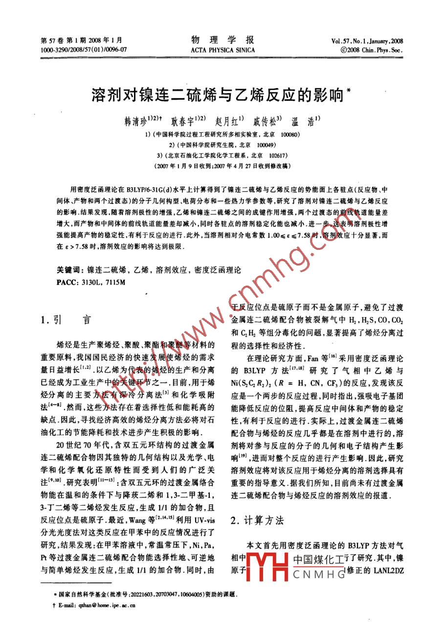 第57卷第1期2008年1月物理學(xué)報Vol .57 ,No.1 ,January ,20081000-3290/2008/57(01 )/0096-07ACTA PHYSICA SINICA回2008 Chin. Phys .Soe,溶劑對鎳連二硫烯與乙烯反應(yīng)的影響*韓清珍))2)t耿舂字1)2)趙月紅)戚傳松3)溫浩"1) (中國科學(xué)院過程工程研究所多相實驗室,北京10080)2) (中國科學(xué)院研究生院,北京100)3) (北京石油化工學(xué)院化學(xué)工程系,北京102617)(2007年1月9日收到:2007年4月27日收到修改稿)用密度泛函理論在B3LYP/6-31G(d)水平上計算得到了鎳連二硫烯與乙烯反應(yīng)的勢能面上各駐點(反應(yīng)物、中間體、產(chǎn)物和兩個過渡態(tài))的分子幾何構(gòu)型、電荷分布和一-些熱力學(xué)參數(shù)等,研究了溶劑對鎳連二硫烯與乙烯反應(yīng)的影響.結(jié)果發(fā)現(xiàn).隨著熔劑極性的增強,乙烯和鎳連二碗烯之間的成鍵作用增強,兩個過渡態(tài)的前線軌道能量差增大,而產(chǎn)物和中間體的前線軌道能量差卻減小,同時各駐點的溶劑穩(wěn)定化能也減小.進-步,這表明溶劑極性增強能提高產(chǎn)物的穩(wěn)定性,有利于反應(yīng)的進行.此外,當(dāng)溶劑相對介電常數(shù)1.00≤e≤7.58時,溶劑效應(yīng)十分顯著,而在e>7.58時,落劑效應(yīng)的影響將達到極限.關(guān)鍵詞:鎳連二硫烯,乙烯,溶劑效應(yīng),密度泛函理論PACC: 3130L, 7115M于反應(yīng)位點是硫原子而不是金屬原子,避免了過渡1.引 言金屬連二硫烯配合物被裂解氣中H, H2S, CO, CO2和C2H2等組分毒化的問題,顯著提高了烯烴分離過烯烴是生產(chǎn)聚烯烴、聚酸、聚酯和聚醚等材料的程的選擇性和經(jīng)濟性.重要原料,我國國民經(jīng)濟的快速發(fā)展使烯烴的需求在理論研究方面,Fan等[61采用密度泛函理論量日益增長1,21.以乙烯為代表的烯烴的生產(chǎn)和分離的B3LYP方法07,.8]研究了氣相中乙烯與已經(jīng)成為工業(yè)生產(chǎn)中的關(guān)鍵環(huán)節(jié)之一.目前,用于烯Ni(S,CR2)2(R = H, CN, CF,)的反應(yīng),發(fā)現(xiàn)該反烴分離的主要方法有深冷分離法和化學(xué)吸附應(yīng)是一個兩步的反應(yīng)過程,同時指出,強吸電子基團法[4-8].然而,這些方法存在著選擇性低和能耗高的能降低反應(yīng)的位阻,提高反應(yīng)中間體和產(chǎn)物的穩(wěn)定缺點.因此,尋找經(jīng)濟高效的烯烴分離方法必將對石性,有利于反應(yīng)的進行.實際上,過渡金屬連二硫烯油化工的節(jié)能降耗和技術(shù)進步產(chǎn)生積極的影響.配合物與烯烴的反應(yīng)幾乎都是在溶劑中進行的,溶20世紀(jì)70年代,含雙五元環(huán)結(jié)構(gòu)的過渡金屬劑將對參與反應(yīng)的分子的幾何和電子結(jié)構(gòu)產(chǎn)生影連二硫烯配合物因其獨特的幾何結(jié)構(gòu)以及光學(xué)、電響|),進而對整個反應(yīng)的進行產(chǎn)生影響.因此,研究學(xué)和化學(xué)氧化還原特性而受到人們的廣泛關(guān)溶劑效應(yīng)將對該反應(yīng)用于烯烴分離的溶劑選擇具有注{9,01 .研究表明11-1)1:含雙五元環(huán)的過渡金屬絡(luò)合重要的指導(dǎo)意義.據(jù)我們所知,目前尚未有過渡金屬物能在溫和的條件下與降莰二烯和1,3-二甲基-1,連二硫烯配合物與烯烴反應(yīng)的溶劑效應(yīng)的報道.3-丁二烯等二烯烴發(fā)生反應(yīng),生成1/1的加合物,且反應(yīng)位點是硫原子.最近, Wang等[.14151利用UV-vis2.計算方法分光光度法對這類反應(yīng)在甲苯中的反應(yīng)情況進行了研究,結(jié)果發(fā)現(xiàn):在甲苯溶液中,常溫常壓下,Ni, Pa,本文首先用密度泛函理論的B3LYP方法對氣Pt等過渡金屬連二硫烯配合物能選擇性地、可逆地相中中國煤化工了研究.其中,鎳與簡單烯烴發(fā)生反應(yīng),生成1/1的加合物.同時,由原子MYHCNMHG]修正的LANL2DZ.國家自然科學(xué)基金(批準(zhǔn)號:20221603.20703047, 10604005)資助的課題.↑E-mail: qphan@ home.ipe. se.cn1期韓清珍等:溶劑對鎳連二硫烯與乙烯反應(yīng)的影響97(341/341/41)基組,碳、硫、氫等其他原子則采用6-頻率分析確認(rèn)各駐點的結(jié)構(gòu).通過分析不同溶劑中31C(d)基組'0- 21.利用Gaussian03 程序中的線性內(nèi)分子的幾何構(gòu)型、電荷分布.前線軌道能級差和溶劑坐標(biāo)(QST3)法搜索到兩個過渡態(tài)[切] ,并對過渡態(tài)進穩(wěn)定化能,研究了溶劑對鎳連二硫烯與乙烯反應(yīng)的行了振動頻率分析和內(nèi)稟反應(yīng)坐標(biāo)|]8-301計算的驗影響.證.同時通過內(nèi)稟反應(yīng)坐標(biāo)計算得到了反應(yīng)物、中間體和產(chǎn)物的穩(wěn)定構(gòu)型,通過頻率計算的振動分析確3.結(jié)果與討論認(rèn)均為勢能面上的極小點.進一步,用自治反應(yīng)場"理論中的Onseger溶3.1.反應(yīng)途徑與幾何構(gòu)型劑模型(3-在反應(yīng)溫度T = 298.15K和壓力P =101.3 kPa時,分別在苯(e =2.247)、甲苯(2.279)、四圖1給出了計算得到的鎳連二硫烯與乙烯反應(yīng)氫呋喃(7.58)、二氯甲烷(8.93).1,2二氯乙烷的反應(yīng)途徑以及5個反應(yīng)駐點的幾何構(gòu)型.鎳連二(10.36)、丙酮(20.7).乙醇(24.55)、甲醇(32.63)、硫烯與乙烯的反應(yīng)是分兩步進行的.反應(yīng)的第一步1,2,3-丙三醇(42.50)、二甲亞砜(46.7)和水(78.39)是一個加成反應(yīng),乙烯中的碳原子配位到鎳連二硫共11種非極性和極性溶劑中(351,重新優(yōu)化鎳連二烯的硫原子上.在此過程中,作為電子受體的硫原子硫烯與乙烯反應(yīng)勢能面上的所有駐點.溶劑效應(yīng)的
