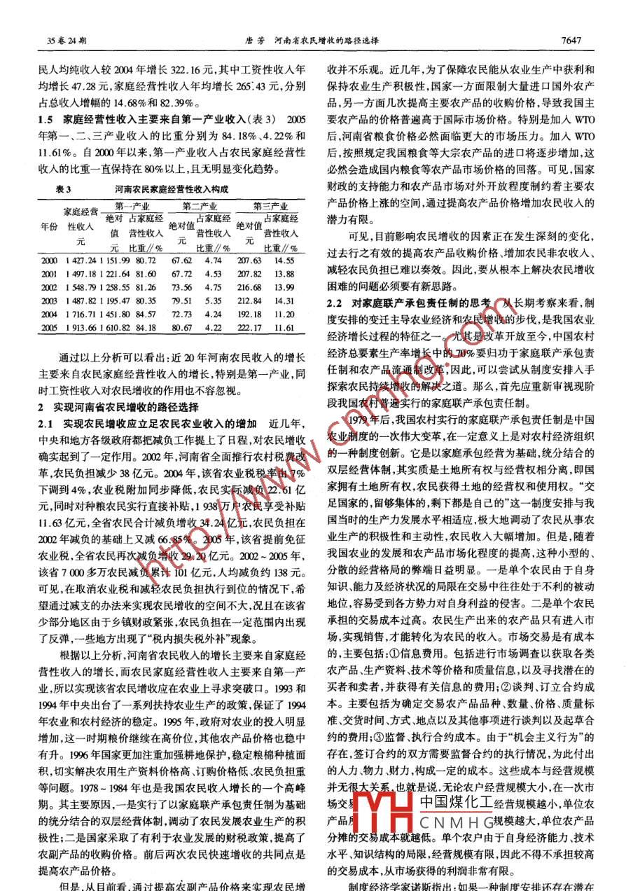 安徽農(nóng)業(yè)科學(xué),Joumal of Arbui Agi. Sai. 2007 ,35(24):7646- 7648責(zé)任編輯羅蕓責(zé)任校對李菲菲河南省農(nóng)民增收的路徑選擇.唐芳(信陽農(nóng)業(yè)高等??茖W(xué)校經(jīng)濟(jì)管理系,河南信陽4000摘要在分析河南省農(nóng)民收入現(xiàn)狀的基礎(chǔ)上 ,探討了實(shí)現(xiàn)農(nóng)民增收的路徑 ,提出新型農(nóng)業(yè)合作經(jīng)濟(jì)組織是實(shí)現(xiàn)農(nóng)民增收的現(xiàn)實(shí)選擇。關(guān)鍵詞農(nóng)業(yè)合 作經(jīng)濟(jì)組織;農(nóng)民增收;“三農(nóng)";河南中圖分類號F323.8 文獻(xiàn)標(biāo)識碼 A文章編號 0517 - 6120)24 - 07646- 031河南省農(nóng)民收入分析超過6.02%( 1994年值)。說明在河南農(nóng)民收人對家庭經(jīng)營1.1 人均純收入有了很大提高,但仍屬低收入省份 從表1的依賴性很大,收入結(jié)構(gòu)相對單-一。可以看出, 1985 ~ 2005年河南省農(nóng)村人均純收人由328.78元表1 1985- 2005年河南省農(nóng)民人均純收入與全國人均純收入比較增加到2 870.58元,增長了近8倍,年均增長121.00元。但河南省全國是,河南省農(nóng)民收人絕對值一直低 于全國平均水平,且差額年份人均純收人//元增長事//%人均純收人/元 增長率//%從68.82元擴(kuò)大到384.42元。1985328.78397.60198633.641.48424.056.651.2 收入持續(xù)增長,但自1996起增速明顯減緩 由表1可1987377.7213.21490.2115.601988401.326.25544.9011.10見,1993 ~ 1996年為河南農(nóng)村人均純收入高速增長期,農(nóng)民1989457.0613.89602.0010.48純收人從695.85元增加到1579. 19元,增長1.27倍,平均增1990526.9515.29686.3114.001991539.29708.503.23速28. 15% ,1995年增速更是達(dá)近20年最高值35.41%。19971992588.489.12784.00 .10.70695.8518.2517.60~ 20030年河南農(nóng)村人均純收入增速減緩,2003年下降至近2030.751223.6032.80年最低值, 2004~ 2005年雖有反彈,但仍低于1993 ~ 1996年35.411577.7428.9028.181926.0722.08水平。2 090.138.521864.05 .7.512161.983.441.3從收入結(jié)構(gòu). 上看,家庭經(jīng)營性收入是河南省農(nóng)民收入1948.362210.342.24的最主要來源(表2) 1990~ 2005年河南農(nóng)民家庭經(jīng)營收入20011985.821.922253.421.952097 .865.642366.425.01占總收入的比重始終保持在66%以上,平均75. 19% , 1995年2215.742475.63 .4.61 .達(dá)歷史最高值81. 51%。同期,工資性收入占總收入的比重2002235.68 .0.902 622.205.92 .20042553. 1514.202 936.2011.99 .平均值為19.76% ,是農(nóng)民的第二大收入來源。而非生產(chǎn)性2 870.5810.90收人(即財產(chǎn)性收人和轉(zhuǎn)移性收人)占純收人的比重較低,未注:資料來源于<中國農(nóng)業(yè)年鑒》、《河南統(tǒng)計年鑒》。表21985 ~ 2005年河南農(nóng)民人均純收入構(gòu)成工資性收入家庭經(jīng)營性收入財產(chǎn)性收入轉(zhuǎn)移性收入絕對值占總收入元比重//%元___44.4713.53263.1780.042.350.7118.795.7279.2115.03423.2180.312.730.5221.804.1475.5213.04437.4075.512.800.4823.574.0790.975.46462.1378.533.750.6431.635.371993100.4914.44565.1881.223.070.4427.113.901994116.2312.78738.7781.2021.5533.263.66)95163.513.271004.2081.5128.442.3135.822.911996220.333.79I 288.0380.6424.091.5146.742.931997294.9217.011 369.0478.9620.2549.682.871998344.3418.471 439.1877.2122.6257.913.111999408.3320.961 448.2274.3327.181.4064.623.322000473.6823.81 427.2471.8755.752.8129.151.47517.6324.61 497.1871.3757.99 .2.7625.061.192002567 .0725.51 548.7969.9032.451.4667.433.042003635.5928.41 487.8266.55 .38.581.7373.693.30753.9929.5! 716.7167.2428.221.1154.232.12853.9529.751 913.6666.6635.851.2567.132.34注:資料來源于(河南統(tǒng)計年鑒》。下表同。1.4 工資性收入占純收入的比重呈明顯上升趨勢 由表2: 6%。說明河南省農(nóng)民可見,1994~2005年河南農(nóng)民工資性收人的比重逐年遞增,收中國煤化工對農(nóng)民增收的作用逐漸從12.78%上升到29.75% ,年均增長8. 17%。同期,農(nóng)民家加強(qiáng)YHC N M H G增收的重要來源。1990~ 2005年,河南農(nóng)民人均純收入從526. 95元增加到2870.58基金項(xiàng)目河南省社科聯(lián)調(diào)研課題(SKL-2006 44)。作者簡介唐芳(1979- ),女,河南信陽人,講師,從事農(nóng)業(yè)經(jīng)濟(jì)管理元,年均增長146.48元,其中工資性收入年均增長48.42元,研究。家庭經(jīng)營性收入年均增長93. 16元,分別占總收入增幅的收稿號鄂數(shù)7據(jù)40933.06%和63.60%。特別在農(nóng)民收人增長最快的1995 年,農(nóng)35卷24期唐芳河南省農(nóng)民增收的路徑選擇民人均純收人較2004年增長322. 16元,其中工資性收入年收并不樂觀。近幾年,為了保障農(nóng)民能從農(nóng)業(yè)生產(chǎn)中獲利和均增長47.28元,家庭經(jīng)營性收入年均增長265.43元,分別保持農(nóng)業(yè)生產(chǎn)積極性,國家一方面限制大量進(jìn)口國外農(nóng)產(chǎn)占總收入增幅的14.68%和82.39%。品,另一方面幾次提高主要農(nóng)產(chǎn)品的收購價格,導(dǎo)致我國主1.5 家庭經(jīng)營性收入主要來自第一產(chǎn)業(yè)收入(表3) 2005要農(nóng)產(chǎn)品的價格普遍高于國際市場價格。特別是加入WTO年第一、二、三產(chǎn)業(yè)收入的比重分別為84. 18%、4.22%和后 ,河南省糧食價格必然面臨更大的市場壓力。加入wTO11.61%。自2000年以來,第-產(chǎn)業(yè)收入占農(nóng)民家庭經(jīng)營性后,按照規(guī)定我國糧食等大宗農(nóng)產(chǎn)品的進(jìn)口將逐步增加,這收入的比重- - 直保持在80%以上,且無明顯變化趨勢。必然會造成國內(nèi)糧食等農(nóng)產(chǎn)品市場價格的回落??梢?國家表3河南農(nón