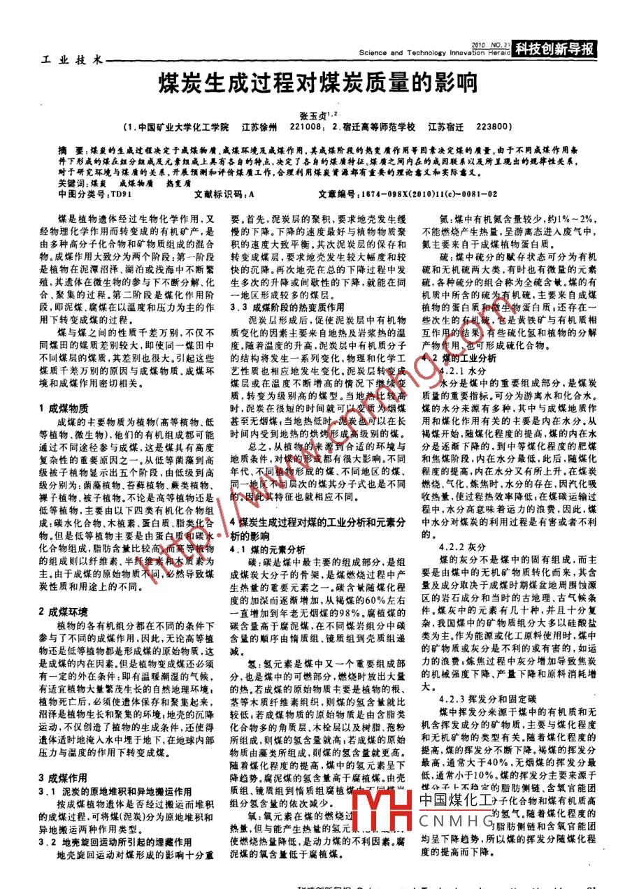 Science and T echnology InnovatR. O科技創(chuàng)新導(dǎo)報|工業(yè)技術(shù)煤炭生成過程對煤炭質(zhì)量的影響張玉貞1.2(1.中國礦業(yè)大學化工學院江蘇徐州 221008; 2.宿遷高等師范學校江蘇宿遷 223800)摘要:煤炭的生成過程決定于成煤物質(zhì).咸堞環(huán)境及威煤作用。其威煤階段的熱變質(zhì)作用等因素決定煤的質(zhì)量。由于不同成煤作用條件下形成的煤在組分朗威及元案組成上具有各自的特點,決定了各自的煤質(zhì)特征。堞質(zhì)之間內(nèi)在的成因聯(lián)系以及所呈現(xiàn)出的規(guī)律性關(guān)系,對于研究環(huán)境與堞質(zhì)的關(guān)系,開展預(yù)測和評價煤質(zhì)工作,合理利用煤炭資源都有重要的理論意義和實際需義。關(guān)鍵詞;煤炭威煤物贗中圖分類號:TD91來物質(zhì)文獻標識碼:A文章編號:1674-098%(2010)11(e)-0081-02煤是植物遺體經(jīng)過生物化學作用,又要.首先, 泥炭層的聚積,要求地殼發(fā)生緩氮:煤中有機氮含量較少,約1%~ 2%,經(jīng)物理化學作用而轉(zhuǎn)變成的有機礦產(chǎn),是慢的下降。 下降的速度最好與植物物質(zhì)聚不能燃燒產(chǎn)生熱量.呈游離態(tài)進入廢氣中,由多種高分子化合物和礦物質(zhì)組成的混合積的速 度大致平衡。其次泥炭層的保存和氮主要來自于成煤植物蛋白質(zhì)。物。成煤作用大致分為兩個階段:第一階段轉(zhuǎn)變成媒層,要求地殼發(fā)生 較大幅度和較硫:煤中硫分的賦存狀態(tài)可分為有機是植物在泥潭沼澤、湖泊或找海中不斷繁快的沉降。 再次地殼在總的下降過程中發(fā)硫和無機硫兩 大類,有時也有微量的元素殖,其遺體在微生物的參與下不斷分解、化生 多次的升降或間歇性的下降,就能在同硫, 各種硫分的組合稱為全硫含敏。煤的有合、聚集的過程.第二階段是煤化作用階- 地區(qū)形成較多的煤層。機質(zhì)中所含的硫為有機碗,主要來自成煤段,即泥煤.腐煤在以溫度和壓力為主的作3.3成煤階段的熱變質(zhì)作用植物的蛋白質(zhì)和微生物蛋白質(zhì);還存在一用下轉(zhuǎn)變成煤的過程。泥炭層形成后,促使泥炭層中有機物些次生的有機硫, 它是黃鐵礦與有機質(zhì)相.煤與煤之間的性質(zhì)千差萬別,不僅不質(zhì)變化的因素主要來 自地熱及巖漿熱的溫互作 用的結(jié)果,有些硫化氫和植物的分解同煤田的媒質(zhì)差別較大,即使同一煤田中度.隨 若溫度的升高.泥炭層中有機質(zhì)分子產(chǎn)物作用,也可形成硫化合物。不同煤層的煤質(zhì),其差別也很大.引起這些的結(jié)構(gòu)將發(fā)生 - -系列變化,物理和化學工4.2煤的工業(yè)分析煤質(zhì)千差萬別的原因與成煤物質(zhì)、成煤環(huán)藝性 質(zhì)也相應(yīng)地發(fā)生變化。泥炭層轉(zhuǎn)變成4.2.1水分境和成煤作用密切相關(guān)。煤層或在溫度不斷增高的情況下繼續(xù)變水分是煤中的重要組成部分,是煤炭質(zhì),轉(zhuǎn)變?yōu)榧墑e高的煤型。當?shù)責岜容^高質(zhì)量的重要指標??煞譃橛坞x水和化合水。1成煤物質(zhì)時,泥炭在很短的時間就可以變質(zhì)為煙煤煤的水分來源有多種,其中與成煤地質(zhì)作成煤的主要物質(zhì)為植物(高等植物、低甚 至無煙煤,當?shù)責岬蜁r,泥炭也可以在長用和煤化作用有關(guān)的主要是內(nèi)在水分。從等植物.微生物),他們的有機組成都可能時 間內(nèi)受到地熱的烘烤形成高級別的煤。褐媒開始 ,隨煤化程度的提高,煤的內(nèi)在水通過不同途徑參與成煤,這是煤具有高度總之,從植物的來源到合適的環(huán)境與分是逐漸 下降的,到中等煤化程度的肥煤復(fù)雜性的重要原因之一.從低等蘭藻到高地 質(zhì)條件,對煤的形成都有很大影響。不同和焦煤階段,內(nèi)在水分最低,此后,隨煤化級被子植物顯示出五個階段,由低級到高年 代、不同植物形成的煤.不同地區(qū)的煤、程度的提高,內(nèi)在水分又有所上升。在煤炭級分別為:菌藻植物、苔蘚植物、蕨類植物、同一地區(qū)不同 層次的煤其分子式也是不同燃燒 .氣化、煉焦時,水分的存在,因汽化吸裸子植物、被子植物。不論是高等植物還是的。 因此其特征也就相應(yīng)不同。收熱量,使過程熱效率降低I在煤碳運輸過低等植物,主要由以下四類有機化合物組程中,水分高意味著運力的浪費,因此,煤成:碳水化合物、木植素.蛋白質(zhì).脂類化合4 煤炭生成過程對煤的工業(yè)分析和元素分中水分對煤炭的利用過程是有軎或者不利物。但是低等植物主要是由蛋白質(zhì)和碳水析的影響化合物組成,脂肪含量比較高,而高等植物4.1 煤的元素分析:4.2.2灰分的組成則以纖維素、半纖維索和木質(zhì)素為碳:碳是煤中最去要的組成部分,是組煤的灰分不是煤中的固有組成,而主主。由于成煤的原始物質(zhì)不同,必然導(dǎo)致煤成煤炭大分子的骨架, 是煤燃燒過程中產(chǎn)要是由煤中的無機礦物質(zhì)轉(zhuǎn)化而來,其含炭性質(zhì)和用途上的不同。生熱量的重要元素之一。碳含斌隨煤化程量及成分取決于成煤時期煤盆地周圍蝕源度的加深而逐漸增加,從褐煤的60%左右區(qū)的巖石成分 和當時的古地理、古氣候條2成煤環(huán)境一直增加到年老無煙煤的98%。腐植煤的件。煤灰中的元素有幾十種,并且十分復(fù)植物的各有機組分都在不同的條件下碳含量高于腐泥煤 .在不同煤巖組分中碳雜,我國煤中的礦物質(zhì)