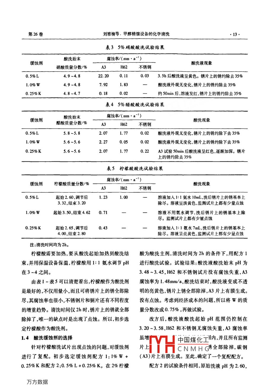 實(shí)周技求清洗世界第26卷第2期Cleaning World2010年2月文章編號(hào):1671-8909(2010)02-011-06甲醇精餾設(shè)備的化學(xué)清洗劉雅楠,張巍,陳麗杰(大化集團(tuán)有限責(zé)任公司研究院,遼寧大連116032)摘要:分析了某化工廠甲醇精餾設(shè)備垢組成,研制了相應(yīng)的復(fù)合型緩蝕劑,并設(shè)計(jì)了一種復(fù)配清洗劑和清洗工藝,其碳鋼A3的腐蝕率低于2.65mm/a。將復(fù)配的清洗劑和相應(yīng)的復(fù)合緩蝕劑應(yīng)用于該設(shè)備的清洗,取得了很好的效果。關(guān)鍵詞:甲醇;精餾設(shè)備;酸洗;緩蝕劑;復(fù)合清洗劑;碳鋼中圖分類號(hào):TK172文獻(xiàn)標(biāo)識(shí)碼BChemical cleaning for rectification equipment of methanoluU Yanan, ZHANG Wei, CHEN liieResearch Institute of Dahua Group Co, Ltd, Dalian, Liaoning, 116032, China)Abstract: The composition of scale on recitification equipment of methanol on chemical plant was ana-lysed. Cleaning agent, corrosion inhibitor and technical process were designed. The corrosion rate ofthe carbon steel A3 in the cleaning agent with the corrosion inhibitor was less than 2. 65mm/a Goodeffectiveness was obtained in application to the equipmentKey words: methanol; rectification equipment pickling; corrosion inhibitor; composite cleaning agentcarbon ste在甲醇精餾過程中,溫度控制對(duì)甲醇的品質(zhì)和等,在加工制造、保存運(yùn)輸和安裝過程中,其內(nèi)表面收率起著非常重要的作用,每個(gè)塔的換熱設(shè)備工作上均沾有不少污物。這些污物如不及時(shí)清除,會(huì)污狀態(tài)決定了各自處在是否適宜的操作溫度下工作。染半成品和成品。輕則影響產(chǎn)品的色澤和濁度;重由于換熱器在加工制造保存、運(yùn)輸和安裝過程中則雜質(zhì)中的某些組分同產(chǎn)品發(fā)生化學(xué)反應(yīng),生成其不可避免地在傳熱面上粘有污物,特別是油污和灰它物質(zhì)。如將該成品作為其他產(chǎn)品的原料,將會(huì)進(jìn)塵,大大降低了設(shè)備的傳熱效率。因此,必須對(duì)換熱步出現(xiàn)很多工藝上的問題。因此,上述設(shè)備和管器換熱面進(jìn)行化學(xué)清洗,使設(shè)備處在良好的狀態(tài)下線一定要進(jìn)行化學(xué)清洗。運(yùn)行,以保證將分餾塔的溫度控制在最佳范圍內(nèi),從而確保產(chǎn)品的品質(zhì)和收率。1酸洗緩蝕劑的選擇甲醇精餾系統(tǒng)的分離器、閃蒸罐、塔與塔之間的由于接受清洗的設(shè)備在空氣中暴露時(shí)間過長(zhǎng),聯(lián)接管線換熱器的殼程、回流槽、儲(chǔ)罐及外送管線同時(shí)YH中國(guó)煤化工面上形成了比較致CNMHG收稿日期:200-06-11作者簡(jiǎn)介:劉雅楠(1980-),男,遼寧大連人,工程師,主要從事水處理研究工作。清洗世界第2期密的銹蝕層。為了更好完成清洗任務(wù),保證設(shè)備的式中W—酸洗前腐蝕試片質(zhì)量良好狀態(tài),在清洗前的準(zhǔn)備工作中做了酸洗緩蝕劑W1——酸洗后腐蝕試片質(zhì)量,g;漂洗過程中所用緩釋劑的選擇試驗(yàn)。采用化學(xué)清洗T—酸洗總時(shí)間,h;常用無(wú)機(jī)酸和有機(jī)酸作為清洗主劑。無(wú)機(jī)酸有硫酸試片總面積(H2SO4)、鹽酸(HCl)、硝酸(HNO3)等。有機(jī)酸有需要注意的是,根據(jù)HGT2387-2007,碳鋼的氨基磺酸(NH2SOH)、乙酸(CHCO0H)、檸檬酸腐蝕率不能大于6g(m2·h),腐蝕量小于72g/m2。(H2C6H3O1·H2O)等。1.3酸洗主劑選擇1.1試驗(yàn)設(shè)備由于在清洗的設(shè)備中,主要的設(shè)備材質(zhì)有碳鋼試驗(yàn)設(shè)備由電池?cái)嚢杵?檢測(cè)掛片,溫度計(jì),燒銅和不銹鋼而且以碳鋼為主同時(shí)由于在清洗系統(tǒng)杯及pH計(jì)組成,見圖1。中有少量閥門的閥芯為銅材質(zhì)因此選擇了銹片(事前經(jīng)過處理過的碳鋼試片,在潮濕環(huán)境中長(zhǎng)時(shí)間自然銹蝕)、A3(標(biāo)準(zhǔn)碳鋼試片)、不銹鋼、H62(銅標(biāo)準(zhǔn)試片)四種試片為試驗(yàn)用片進(jìn)行同步試驗(yàn),使選擇的酸洗緩蝕劑在酸洗過程中對(duì)這些設(shè)備加以保護(hù)。1—電池?cái)嚢杵?2一檢測(cè)掛片;3一溫度計(jì);4-燒杯;5-pH計(jì)配制質(zhì)量分?jǐn)?shù)為5%的鹽酸、硫酸、硝酸、氨基磺圖1清洗劑選擇試驗(yàn)設(shè)備示意酸和2%的檸檬酸清洗劑,在室溫下分別放入銹片、1.2腐蝕率計(jì)算A3試片、H62和不銹鋼試片進(jìn)行酸洗溶垢及腐蝕對(duì)金屬腐蝕率K計(jì)算公式如下比試驗(yàn)。每個(gè)溶液取10mL試樣,用1mo/ NAoH溶液滴定酸度。試驗(yàn)結(jié)果見表1-5。表中L,W,K為K經(jīng)過分析后選擇的三種緩蝕劑的代號(hào)。表15%鹽酸酸洗試驗(yàn)結(jié)果腐蝕率/(mma-1)緩蝕劑酸洗始末鹽酸質(zhì)量分?jǐn)?shù)%酸洗現(xiàn)象不銹鋼0.5%L5.2-4.91.351.81溶液中有黑色小顆粒。銹片上的銹約除去90%1.0%W4.4-4.20.991.48溶液呈淡草綠色,銹片上的銹約除去90%0.25%K4.9-4.873.35099基本上無(wú)變化,銹片上的銹約除去90%注清洗時(shí)間均為4h,表2-表4均相同。表25%硫酸酸洗試驗(yàn)結(jié)果腐蝕率/(mm·a-)緩蝕劑酸洗始末硫酸質(zhì)量分?jǐn)?shù)%酸洗現(xiàn)象不銹鋼0.5%L5.3-4.82.363.03凵中國(guó)煤化工的銹除去8%1.0%W4.0~3.70.11CNMHG和H2試片上有氣0.25%K5.2-4.9106溶液變成紅色。結(jié)束時(shí)不銹鋼試片有油污。片上的銹約除去85%第26卷劉雅楠等.甲醇精餾設(shè)備的化學(xué)清洗13表35%硝酸酸洗試驗(yàn)結(jié)果緩蝕劑腐蝕率/(mm·a-)酸洗液現(xiàn)象硝酸質(zhì)量分?jǐn)?shù)/%H62