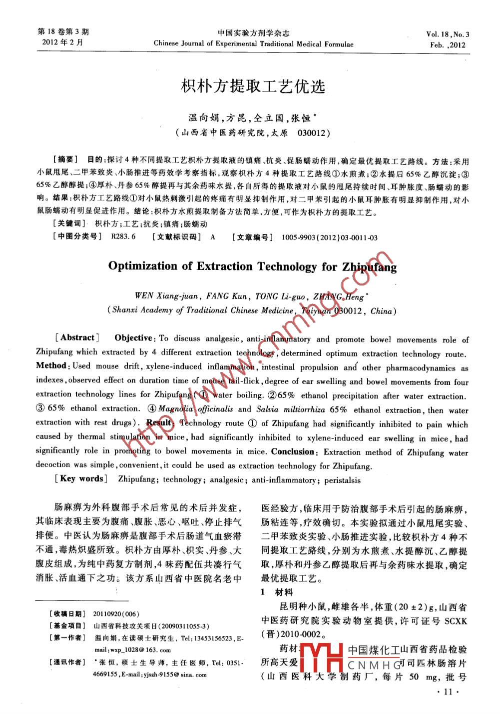 第18卷第3期中國實驗方劑學(xué)雜志Vol. 18. No. 32012年2月Chinese Journal of Experimental Traditional Medical Formulae枳樸方提取工藝優(yōu)選溫向娟,方昆,仝立國,張恒(山西省中醫(yī)藥研究院,太原030012)[摘要]目的:探討4種不同提取工藝枳樸方提取液的鎮(zhèn)痛、抗炎、促腸蠕動作用,確定最優(yōu)提取工藝路線。方法:采用小鼠甩尾、二甲苯致炎小腸推進等藥效學(xué)考察指標,觀察枳樸方4種提取工藝路線①水煎煮;②水提后65%乙醇沉淀;③65%乙醇醇提;④厚樸、丹參65%醇提再與其余藥味水提,各自所得的提取液對小鼠的甩尾持續(xù)時間、耳腫脹度、腸蠕動的影響。結(jié)果:枳樸方工藝路線①對小鼠熱刺激引起的疼痛有明顯抑制作用,對二甲苯引起的小鼠耳腫脹有明顯抑制作用,對小鼠腸蠕動有明顯促進作用。結(jié)論:權(quán)樸方水煎提取制備方法簡單,方便,可作為枳樸方的提取工藝[關(guān)鍵詞]·枳樸方;工藝;抗炎;鎮(zhèn)痛;腸蠕動[中圖分類號]R2836[文獻標識碼]A[文章編號]1005-9903(2012)03001103Optimization of Extraction Technology for ZhipufangWEN Xiang-juan, FANG Kun, TONG Li-guo, ZHANG HengShanxi Academy of Traditional Chinese Medicine, Taiyuan 030012, China)Abstract] Objective: To discuss analgesic, anti-inflammatory and promote bowel movements role ofZhipufang which extracted by 4 different extraction technology, determined optimum extraction technology routeMethod: Used mouse drift, xylene-induced inflammation, intestinal propulsion and other phaarmacodynamIcs asindexes, observed effect on duration time of mouse tail-flick, degree of ear swelling and bowel movements from fourextraction technology lines for Zhipufang(O water boiling. @% ethanol precipitation after water extraction65% ethanol extraction. Magnolia officinalis and Salvia miltiorrhiza 65% ethanol extraction, then waterextraction with rest drugs ) Result: Technology route of Zhipufang had significantly inhibited to pain whichcaused by thermal stimulation in mice, had significantly inhibited to xylene-induced ear swelling in mice, hadsignificantly role in promoting to bowel movements in mice. Conclusion: Extraction method of Zhipufang waterdecoction was simple, convenient, it could be used as extraction technology for ZhipufangKey words] Zhipufang; technology; analgesic; anti-inflammatory; peristalsis腸麻痹為外科腹部手術(shù)后常見的術(shù)后并發(fā)癥,醫(yī)經(jīng)驗方,臨床用于防治腹部手術(shù)后引起的腸麻痹其臨床表現(xiàn)主要為腹痛、腹脹、惡心、嘔吐、停止排氣腸粘連等,療效確切。本實驗擬通過小鼠甩尾實驗、排便。中醫(yī)認為腸麻痹是腹部手術(shù)后腸道氣血瘀滯二甲苯致炎實驗、小腸推進實驗,比較枳樸方4種不不通,毒熱熾盛所致。枳樸方由厚樸、枳實、丹參、大同提取工藝路線,分別為水煎煮、水提醇沉、乙醇提腹皮組成,為純中藥復(fù)方制劑4味藥配伍共湊行氣取厚樸和丹參乙醇提取后再與余藥味水提取,確定消脹、活血通下之功。該方系山西省中醫(yī)院名老中最優(yōu)提取工藝。1材料昆明種小鼠,雌雄各半,體重(20±2)g,山西省[收稿日期]2011090(006基金項目】山西省科技攻關(guān)項目(200903110553中醫(yī)藥研究院實驗動物室提供,許可證號SCXK第一作者]溫向娟在讀碩土研究生,Tel:13453156523,E.(晉)20100002。mail:wxp_1028@163.com藥材V凵中國煤化工山西省藥品檢驗通訊作者]‘張恒,碩土生導(dǎo)師,主任醫(yī)師,Tel:0351.所高天愛CNMH可司匹林腸溶片4669155,E-mailyjszh-9155@sina.com(山西醫(yī)科大學(xué)制藥廠,每片50mg,批號第18卷第3期中國實驗方劑學(xué)雜志ol.18,No.32012年2月Chinese Journal of Experimental Traditional Medical FormulaeFeb.201220090605),西沙比利片(黑龍江省地納制藥有限公左耳為對照,給藥4h后處死。沿耳廓基線剪下兩司,每片10mg,批號100701)。耳,用9mm打孔器將同部位等面積切下耳片,稱左二甲苯(武漢有機合成化工廠)、卡紅溶液(吳右耳片質(zhì)量(g)。右耳減去左耳的質(zhì)量即為腫脹度三居委會化學(xué)加工廠)、無水乙醇(北京華騰化工有(g),求出腫脹度,計算抑制率。結(jié)果見表2。限公司)均為分析純。抑制率=餾水組平均腫脹度二用藥組平均腫脹度×100%SW-2000型光熱甩尾儀(成都泰盟科技有限公司)。表2枳樸方對二甲苯致耳腫脹的影響(xs,n=10)2方法與結(jié)果劑量組別腫脹度/g抑制率/%2.1枳樸方提取液制備工藝路線①4藥10倍燕餾水空白0.0120±0.0030量水浸泡30min,煎煮3次,每次60min,過濾,合并阿司匹林0.0063±0.00621)47.5煎液,即得。工藝路線①工藝路線②4藥10倍量水浸泡30min,煎煮工藝路線②0.0098±0.00213次,每次60min,過濾,合并濾液,濃縮至稠膏,加工藝路線③0.0090±0.0042乙醇至醇體積分數(shù)65%靜置24h,過濾,取上清液工藝路線④180.0093±0.0031回收乙醇,濃縮至相對密度1.10的清膏(60℃)。工藝路線③·4藥8倍量65%乙醇,加熱回流2.4枳樸方對小鼠腸蠕動的影響昆明種小鼠次,每次100min,過濾,回收乙醇,合并濾液,濃縮60只,雌雄各半,隨機分為6組,蒸餾水空白組、西至相同濃度清膏沙比利組、工藝路線①~④組。灌腸給藥,每只0.2工藝路線④厚樸,丹參8倍量65%乙醇提取mL,每天1次,共4d。末次給藥前禁食24h,末次次,每次100min,過濾,回收乙醇,藥渣再與其余給藥后25min灌1/2藥量0.1%卡紅溶液,20min藥味水煎3次,每次60min,合并所得提取液,濃縮后頸椎脫臼處死,沿小鼠幽門至肛門剪下。量取幽至相同濃度清膏門到肛門的距離,腸管總長和幽門到卡紅的距離,計22枳樸方對小鼠熱刺激甩尾反應(yīng)的影響以算推進率,結(j