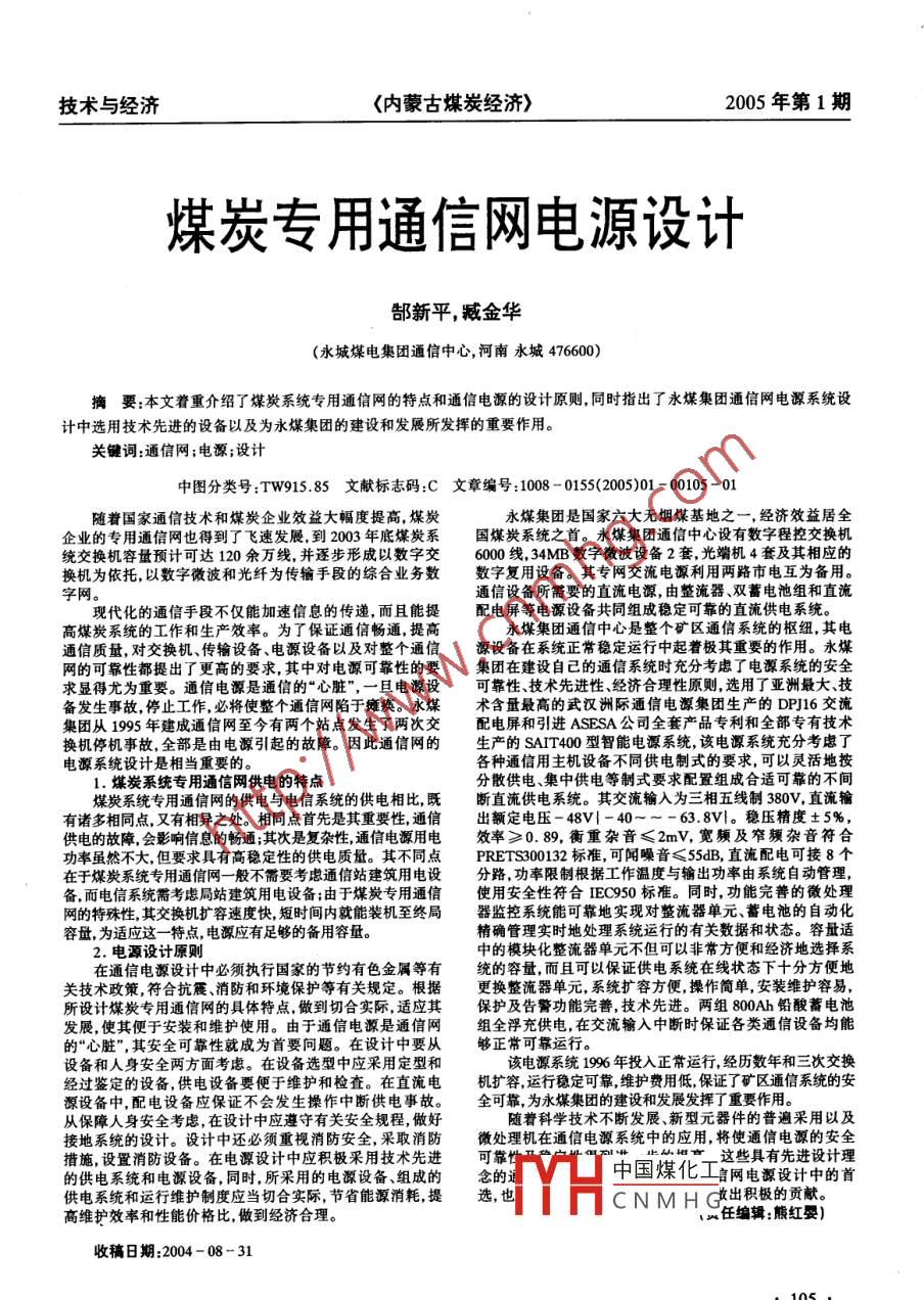 技術(shù)與經(jīng)濟(jì)<內(nèi)蒙古煤炭經(jīng)濟(jì)>2005年第1期煤炭專用通信網(wǎng)電源設(shè)計(jì)郜新平,臧金華(永城煤電集團(tuán)通信中心,河南永城476600)摘要:本文著重介紹了煤炭系統(tǒng)專用通信網(wǎng)的特點(diǎn)和通信電源的設(shè)計(jì)原則,同時(shí)指出了永煤集團(tuán)通信網(wǎng)電源系統(tǒng)設(shè)計(jì)中選用技術(shù)先進(jìn)的設(shè)備以及為永煤集團(tuán)的建設(shè)和發(fā)展所發(fā)揮的重要作用。關(guān)鍵詞:通信網(wǎng);電源;設(shè)計(jì)中圖分類號(hào): :TW915.85文獻(xiàn)標(biāo)志碼:C 文章編號(hào):1008 - 0155(2005)01 - 00105 -01隨著國(guó)家通信技術(shù)和煤炭企業(yè)效益大幅度提高,煤炭永煤集團(tuán)是國(guó)家六大無煙煤基地之- ,經(jīng)濟(jì)效益居全企業(yè)的專用通信網(wǎng)也得到了飛速發(fā)展,到2003年底煤炭系國(guó)煤炭系統(tǒng)之首。永煤集團(tuán)通信中心設(shè)有數(shù)字程控交換機(jī)統(tǒng)交換機(jī)容量預(yù)計(jì)可達(dá)120余萬線,并逐步形成以數(shù)字交6000線, 34MB數(shù)字微波設(shè)備2套,光端機(jī)4套及其相應(yīng)的換機(jī)為依托,以數(shù)字微波和光纖為傳輸手段的綜合業(yè)務(wù)數(shù)數(shù)字復(fù)用設(shè)備。其專網(wǎng)交流電源利用兩路市電互為備用。字網(wǎng)。通信設(shè)備所需要的直流電源,由整流器、雙蓄電池組和直流現(xiàn)代化的通信手段不僅能加速信息的傳遞,而且能提配電屏等電源設(shè)備共同組成穩(wěn)定可靠的直流供電系統(tǒng)。高煤炭系統(tǒng)的工作和生產(chǎn)效率。為了保證通信暢通,提高永煤集團(tuán)通信中心是整個(gè)礦區(qū)通信系統(tǒng)的樞紐,其電通信質(zhì)量,對(duì)交換機(jī)、傳輸設(shè)備、電源設(shè)備以及對(duì)整個(gè)通信源設(shè)備在系統(tǒng)正常穩(wěn)定運(yùn)行中起著極其重要的作用。永煤網(wǎng)的可靠性都提出了更高的要求,其中對(duì)電源可靠性的要集團(tuán)在建設(shè)自己的通信系統(tǒng)時(shí)充分考慮了電源系統(tǒng)的安全求顯得尤為重要。通信電源是通信的“心臟",: -旦電源設(shè)可靠性技術(shù)先進(jìn)性、經(jīng)濟(jì)合理性原則,選用了亞洲最大、技備發(fā)生事故,停止工作,必將使整個(gè)通信網(wǎng)陷于癱瘓。永煤術(shù)含量最高的武漢洲際通信電源集團(tuán)生產(chǎn)的DP]16交流集團(tuán)從1995年建成通信網(wǎng)至今有兩個(gè)站點(diǎn)發(fā)生了兩次交配電屏和引進(jìn)ASESA公司全套產(chǎn)品專利和全部專有技術(shù)換機(jī)停機(jī)事故,全部是由電源引起的故障。因此通信網(wǎng)的生產(chǎn)的SAIT400型智能電源系統(tǒng),該電源系統(tǒng)充分考慮了電源系統(tǒng)設(shè)計(jì)是相當(dāng)重要的。各種通信用主機(jī)設(shè)備不同供電制式的要求,可以靈活地按1.煤炭系統(tǒng)專用通信網(wǎng)供電的特點(diǎn)分散供電.集中供電等制式要求配置組成合適可靠的不間煤炭系統(tǒng)專用通信網(wǎng)的供電與電信系統(tǒng)的供電相比,既斷直流供電系統(tǒng)。其交流輸入為三相五線制380V,直流輸有諸多相同點(diǎn),又有相異之處。相同點(diǎn)首先是其重要性,通信出額定電壓- 48V{ - 40--63.8V|。 穩(wěn)壓精度+5%,供電的故障,會(huì)影響信息的暢通;其次是復(fù)雜性,通信電源用電效率≥0.89,衡重雜音≤2mV,寬頻及窄頻雜音符合功率雖然不大,但要求具有高穩(wěn)定性的供電質(zhì)量。其不同點(diǎn)PRETS300132標(biāo)準(zhǔn),可聞噪音≤55dB,直流配電可接8個(gè)在于煤炭系統(tǒng)專用通信網(wǎng)一般不需要考慮通信站建筑用電設(shè)分路,功率限制根據(jù)工作溫度與輸出功率由系統(tǒng)自動(dòng)管理,備,而電信系統(tǒng)需考慮局站建筑用電設(shè)備;由于煤炭專用通信使用安全性符合IEC950 標(biāo)準(zhǔn)。同時(shí),功能完善的微處理網(wǎng)的特殊性,其交換機(jī)擴(kuò)容速度快,短時(shí)間內(nèi)就能裝機(jī)至終局器監(jiān)控系統(tǒng)能可靠地實(shí)現(xiàn)對(duì)整流器單元、蓄電池的自動(dòng)化容量,為適應(yīng)這一-特 點(diǎn),電源應(yīng)有足夠的備用容量。精確管理實(shí)時(shí)地處理系統(tǒng)運(yùn)行的有關(guān)數(shù)據(jù)和狀態(tài)。容量適2.電源設(shè)計(jì)原則中的模塊化整流器單元不但可以非常方便和經(jīng)濟(jì)地選擇系在通信電源設(shè)計(jì)中必須執(zhí)行國(guó)家的節(jié)約有色金屬等有統(tǒng)的容量,而且可以保證供電系統(tǒng)在線狀態(tài)下十分方便地關(guān)技術(shù)政策,符合抗震、消防和環(huán)境保護(hù)等有關(guān)規(guī)定。根據(jù)更換整流器單元,系統(tǒng)擴(kuò)容方便,操作簡(jiǎn)單,安裝維護(hù)容易,.所設(shè)計(jì)煤炭專用通信網(wǎng)的具體特點(diǎn),做到切合實(shí)際,適應(yīng)其保護(hù)及告警功能完善,技術(shù)先進(jìn)。兩組800Ah鉛酸蓄電池發(fā)展,使其便于安裝和維護(hù)使用。由于通信電源是通信網(wǎng)組全浮充供電,在交流輸入中斷時(shí)保證各類通信設(shè)備均能的“心臟",其安全可靠性就成為首要問題。在設(shè)計(jì)中要從夠正常可靠運(yùn)行。設(shè)備和人身安全兩方面考慮。在設(shè)備選型中應(yīng)采用定型和該電源系統(tǒng)1996年投入正常運(yùn)行,經(jīng)歷