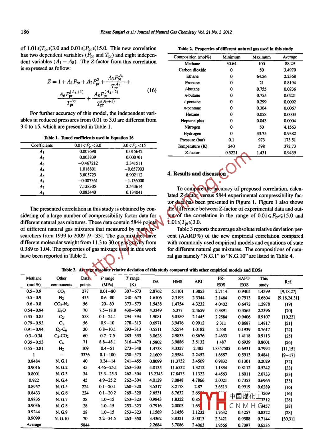 Availableonlineatwww.sciencedirect.coe Science Direct峽8ELSEVIERournal of Natural Gas Chemistry 21(2012)184-188www.elsevier.com/locate/jngcAn accurate empirical correlation for predictingnatural gas compressibility factorsEhsan Sanjari, Ebrahim Nemati LayDepartment of Chemical Engineering, Faculry of Engineering, University of Kashan, Ravand Street, Kashan, P. O. Box 87317-51167, IranI Manuscript received July 15, 2011: revised November 10, 2011 IAbstractThe compressibility factor of natural gas is an important parameter in many gas and petroleum engineering calculations. This study presentsa new empirical model for quick calculation of natural gas compressibility factors. The model was derived from 5844 experimental data ofcompressibility factors for a range of pseudo reduced pressures from 0.01 to 15 and pseudo reduced temperatures from 1 to 3. The accuracy ofhe new empirical correlation has been compared with commonly used existing methods. The comparison indicates the superiority of the newempirical model over the other methods used to calculate compressibility factor of natural gas with average absolute relative deviation percent(AARD%)of0.6535Key wordsnatural gas; compressibility factor; correlation; empirical model; equation of state1. Introductiondata and the accuracy of the model has been compared withcommonly used empirical correlations as well as classical andNatural gas is a subcategory of petroleum that is a natstatistical equations of stateurally occurring, complex mixture of hydrocarbons, with asmall amount of inorganic compounds [1 ]. Knowledge of the 2. Natural gas compressibility factorpressure-volume-temperature (PVT)behavior of natural gasesis necessary to solve many petroleum engineering problems,In the real gas equation, Z-factor can be obtained as fol-design and analyze natural gas production and processing low:PV= ZnRTIn most petroleum and natural gas engineering calcula-tions, the compressibility factor and density of fluids are nec- where, P is pressure in kPa, V is the volume in L, n is theessary to gas metering, gas compression, design of pipelines number of gas mol, R is universal gas constant, T isand surface facilities [2]. Petroleum engineers need to predict ture in K, and Z is the compressibility factor of g tempera-pressure-volume temperature(PVT) properties of petroleumThe theory of corresponding states dictates that thefluids under given conditions of temperature and pressure. Z-factor can be uniquely defined as a function of reduced pres-This can be determined through PVT analysis of fluid sample sure and reduced temperature. The pseudo reduced pressuretests or can be calculated by Equations of State(EOS)based and temperature are defined by Equations 2 and 3, respec.on computer codes if the fluid composition is known. This tively.information is often unavailable particularly at the early stageof field development or needs to be verified, supported andTpr=T/Tsupplemented during the course of field development. Then itis the task of empirical correlations to estimate the petroleumPpr=P/Ppcfluid properties as a function of the reservoir's readily avail- where, Ppr and Tpr are pseudo reduced pressure and tempera-able characteristics [3]. In this study, a simple, quick and ac- ture, Tpc is pseudo critical temperature and Ppe is pseudo crit-curate empirical model has been derived from experimental ical pressure th中國(guó)煤化工Corresponding author. Tel: +98-361-5555333: Fax: +98-361-5559930: E-mail: enema @kashiThis work was supported by the University of Kashan( Grant No. 65460)HCNMHGCopyrighto201, Dalian Institute of Chemical Physics, Chinese Academy of Sciences. All rights reserved.doi:l0.o16s1003-9953(11)603526Joumal of Natural Gas Chemistry Vol 21 No. 2 2012pirical models to predict compressibility factorof com-F=∑Pv(4) monly used empirical correlations and equationstate forcalculating of Z-factor are presented as followTk=∑Tv(5) 2.1. Dranchuk and Abu-Kassem correlation and Heidaryani=1Salarabadi-Moghadasi (HMs)correlationwhere, Pci is critical pressure, Tci is critical temperature, andyi is the mole fraction of componentIn 1975, Dranchuk and Abu -Kassem(DA) proposedBy knowing the composition of natural gas, pseudo pres- Equation 6 with eleven-constant for calculating the gas comsure and temperature of gas can be obtained and used in em- pressibility factors [4]A2A3.A4,A5A7 Asz=A1+rPr+[A6+Tpr r lp2[+第]Ao(1+A1)p+A1n的]+1where, P is reduced density of gas.on Standing and Katz chart for rapid estimation of natural gasIn 2010, Heidaryan et al. presented a correlation based Z-factor as Equation 7[5]:A1+A2In(Ppr)+A3(npP)2+A4(In Ppr)3As A6,,八,AA1+4h(p)+4(mP+m+衛(wèi)2.2. Azizi-Behbahani-Isazadeh(ABlcorrelationmedium to high pressures. Good results have been obtainedby this method for demethanizer, de-ethanizers, depropaniz-Azizi, Behbahani and Isazadeh in 2010 presented a new ers, debutanizer and wellhead processes. The compressibilitycorrelation for calculating compressibility factor of natural factors for both vapor and liquid phases can be calculated bygases based on 3038 points from Standing and Katz Z-factor the PR equation of state. The PR EOS has been presented byEquation14[小z=A⊥B+CRTPV-b V(V+b-b(V-b(14)+e2.4. Statistical association fluid theory(SAFT) equation ofA=am216+bP108+cP13-21+dln(T)05(9)sfateThe SAFT equation of state is similar to perturbed hardB=e+fr+gPl.56+hPo.124r3033 (10) chain equations, but provides competitive accuracy with UNI-QUAC, NRTL, or Wilsons equation for hydrogen bondingC=iln(T)-1.28+jIn(T-).37+kIn(P)+lIn(P)2+mIn(P)In(T)(11) mixtures. Unlike the interpolation methods, the SAFT equation is based on treating the hydrogen bonding interactionsas chemical reactions. The compressibility factor can be ob-D=1+nr5+oP0680(12) tained from SAFT EOS as Equation 15[8]E=pIn(Tr)8qIn(T)2+rIn(P)+ (13)RI1+zsg+Z+Z25soc(15)8In(P)+tIn( P)In(Tr)3. New proposed compressibility factor correlationThe tuned coefficients in equatio